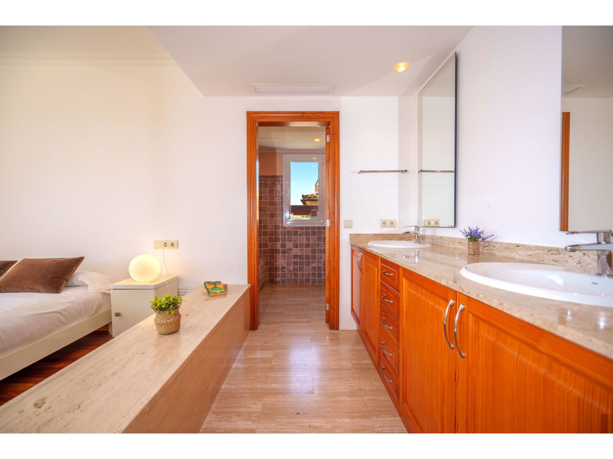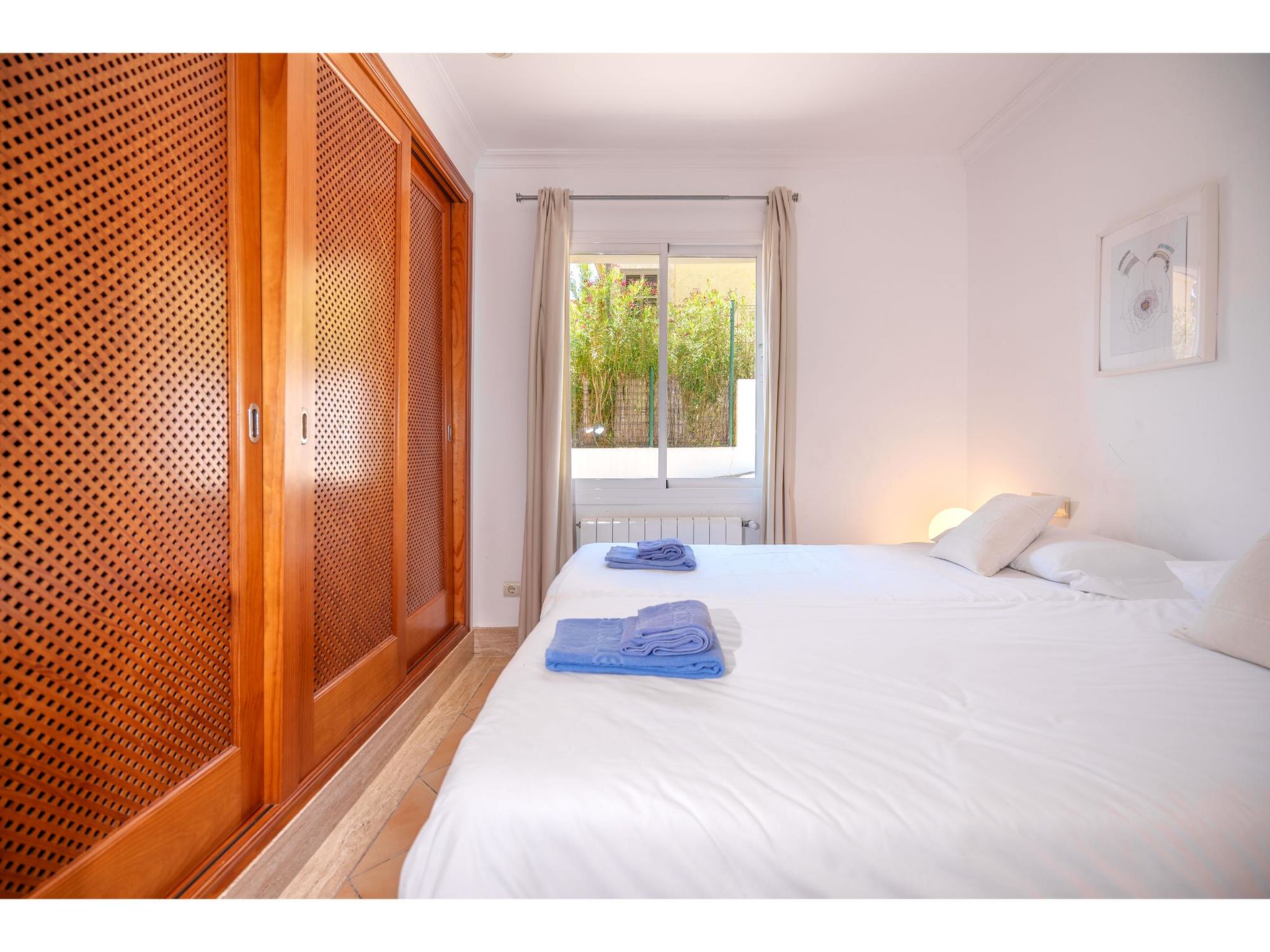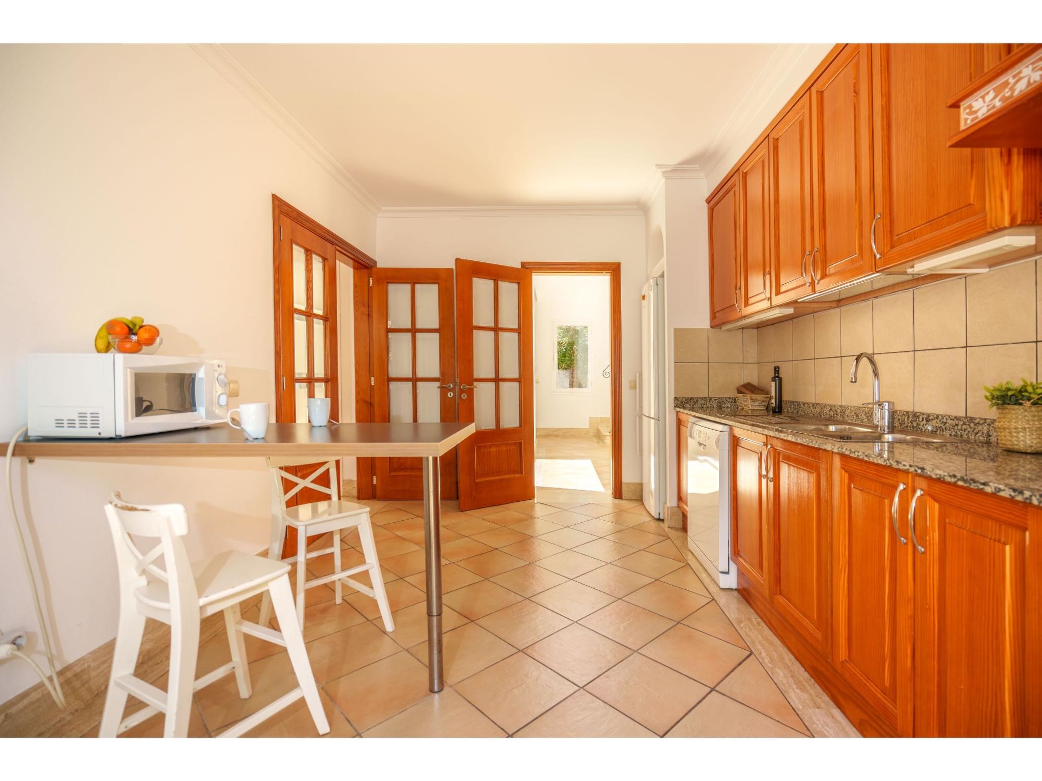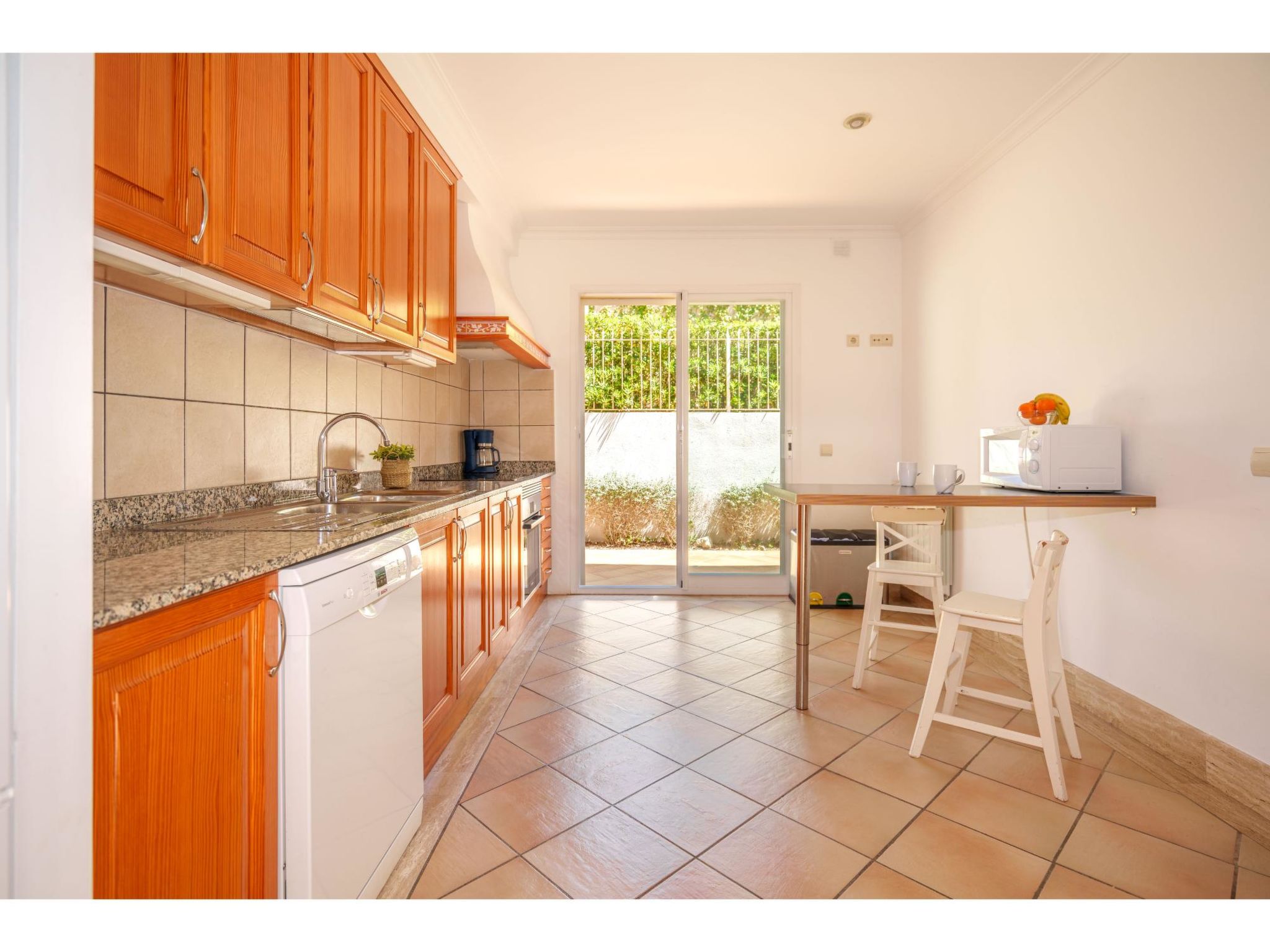 5-Zimmer-Haus, 2 Etagen, ca. 160 m². Zugang zum Haus über Treppe oder Zufahrt und Garage. Erdgeschoss: Wohnraum mit Sitzgruppe, Kamin (nur Dekoration), Terrassenausgang, über 4 Stufen zum Essplatz. Küche (3 Ceranfelder, Backofen, Mikrowelle, Geschirrspüler, Kühlschrank, kleiner Gefrierschrank, Kaffeemaschine, Toaster) mit Gartenausgang. Zweibettzimmer. Dusche/WC. 1. Etage: Zweibettzimmer mit Sessel, Doppelwaschbecken und Zugang zu Bad/WC. 2 Schlafzimmer jeweils mit franz. Bett (1,40 m breit). Dusche/Doppelwaschbecken/WC. VT/104073