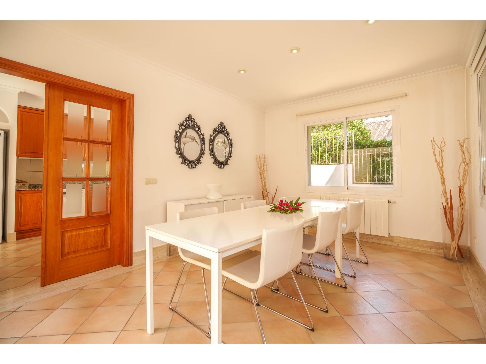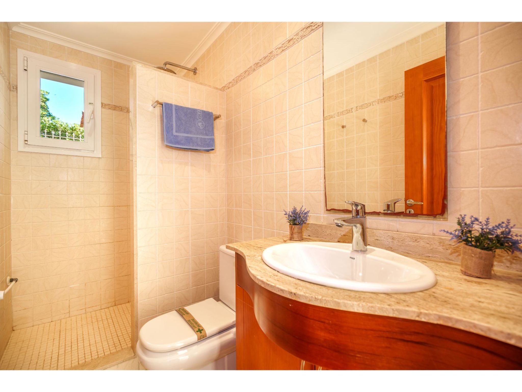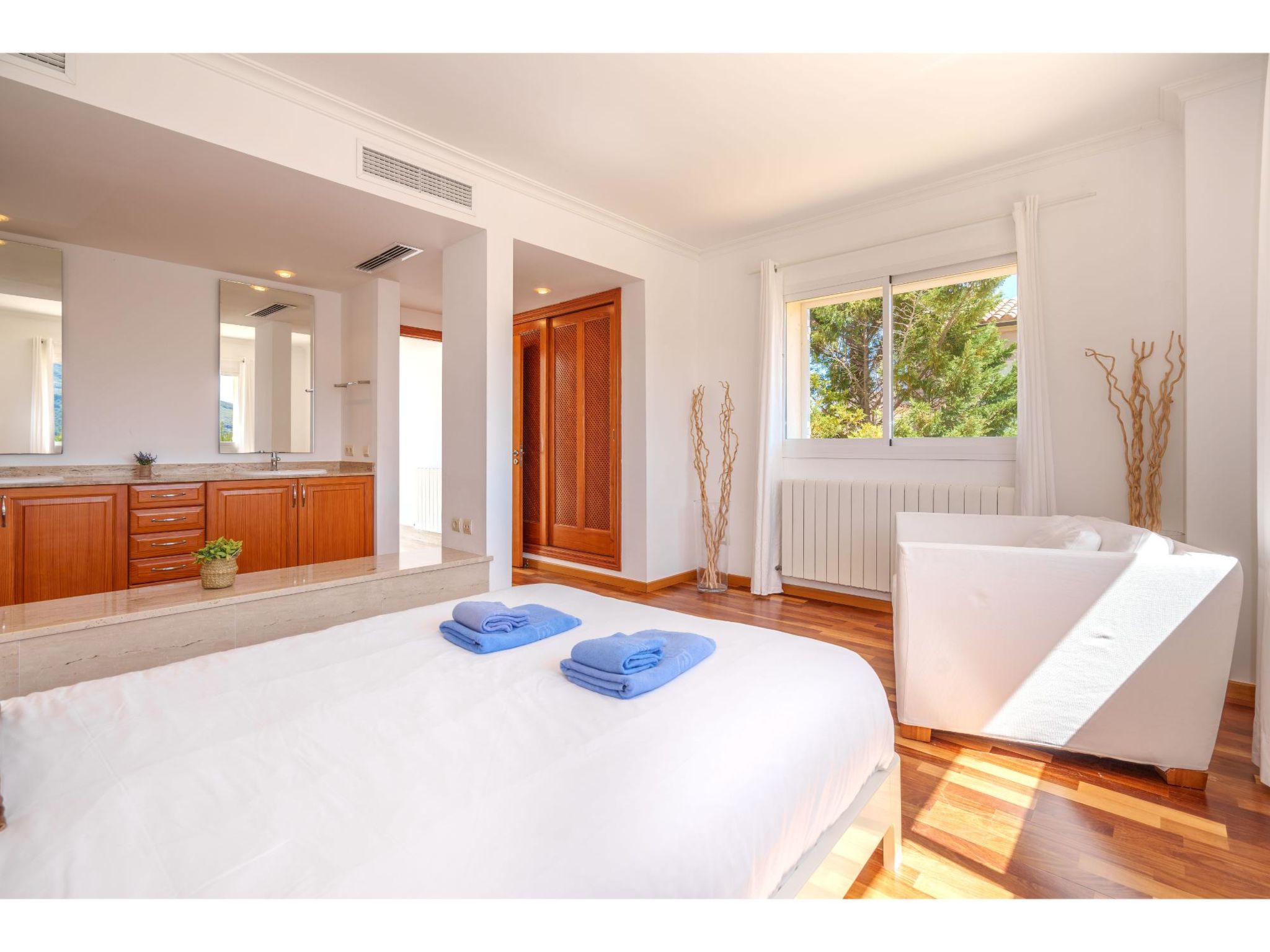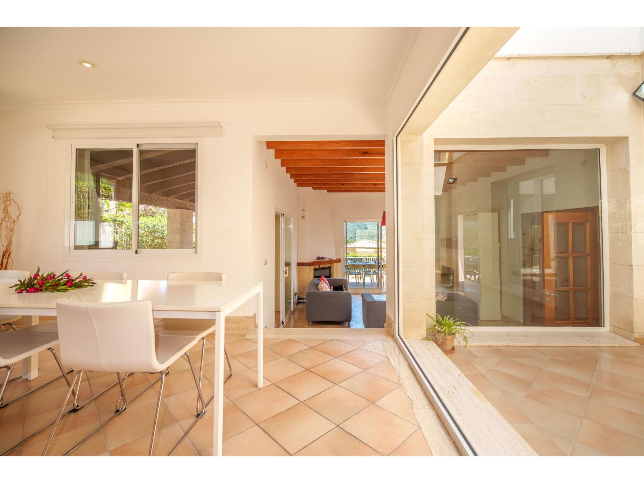 5-Zimmer-Haus, 2 Etagen, ca. 160 m². Zugang zum Haus über Treppe oder Zufahrt und Garage. Erdgeschoss: Wohnraum mit Sitzgruppe, Kamin (nur Dekoration), Terrassenausgang, über 4 Stufen zum Essplatz. Küche (3 Ceranfelder, Backofen, Mikrowelle, Geschirrspüler, Kühlschrank, kleiner Gefrierschrank, Kaffeemaschine, Toaster) mit Gartenausgang. Zweibettzimmer. Dusche/WC. 1. Etage: Zweibettzimmer mit Sessel, Doppelwaschbecken und Zugang zu Bad/WC. 2 Schlafzimmer jeweils mit franz. Bett (1,40 m breit). Dusche/Doppelwaschbecken/WC. VT/104073