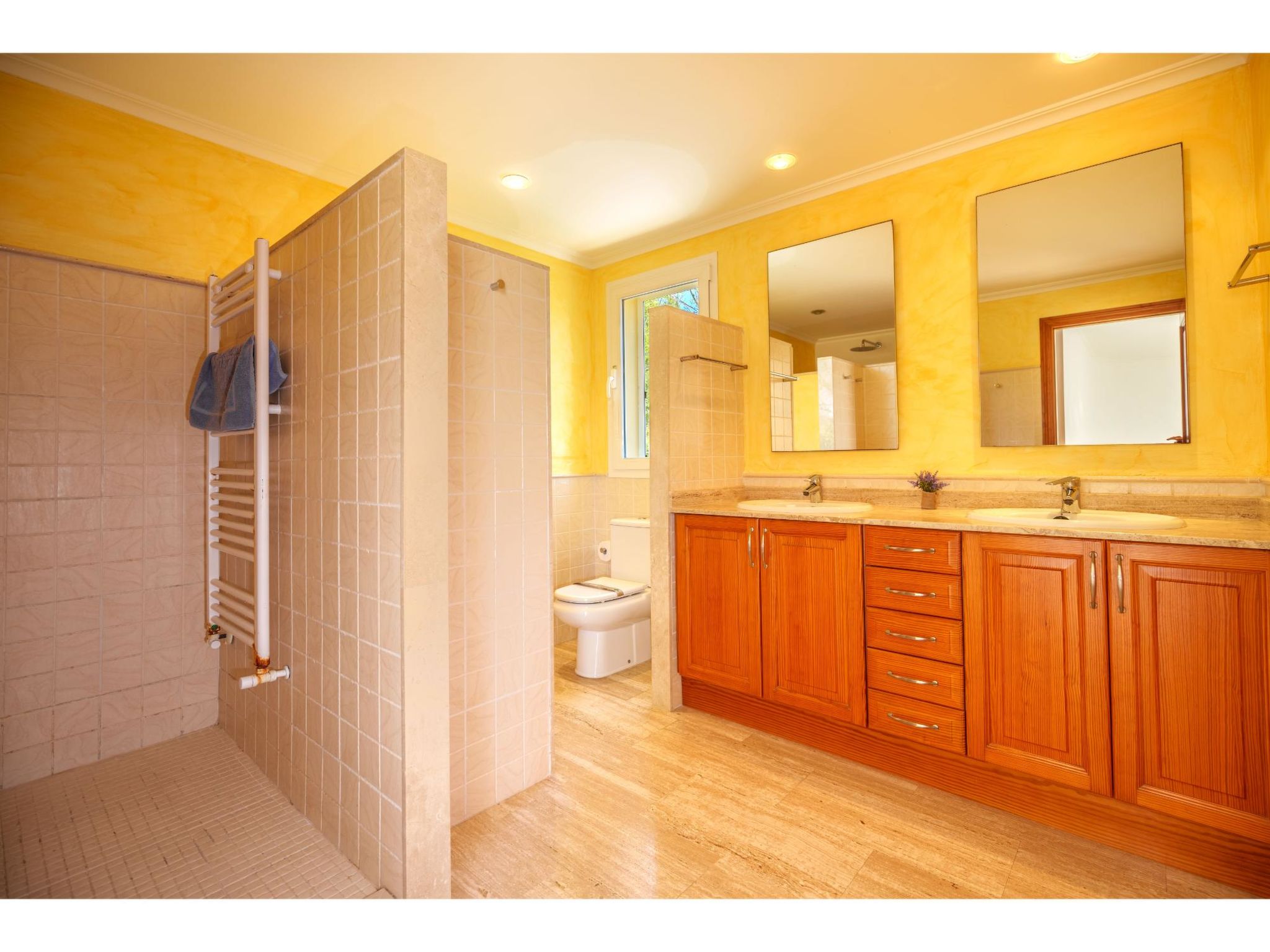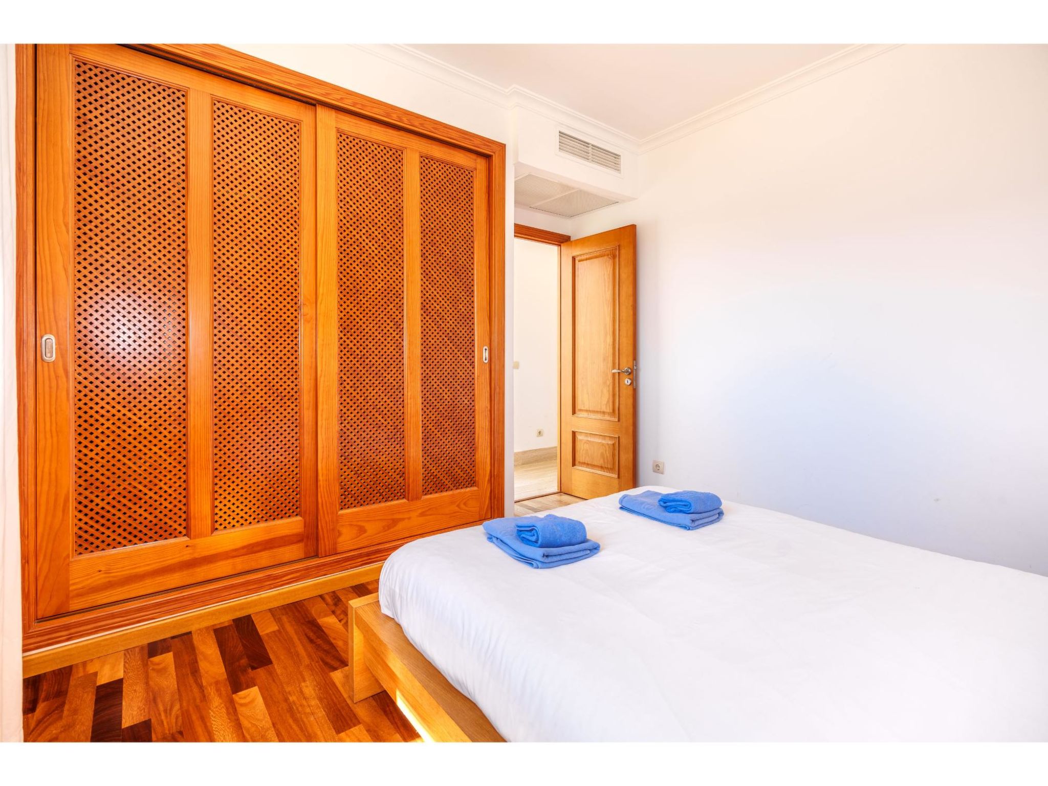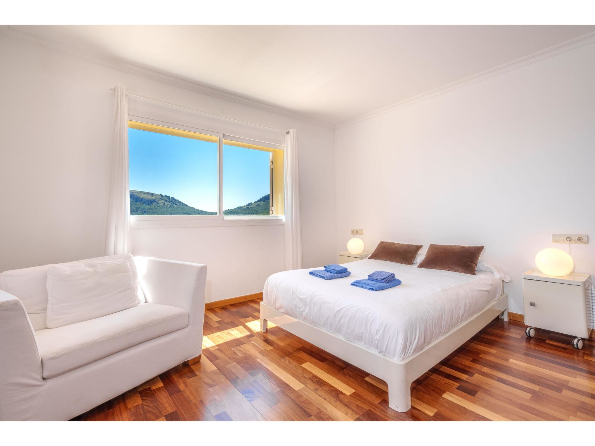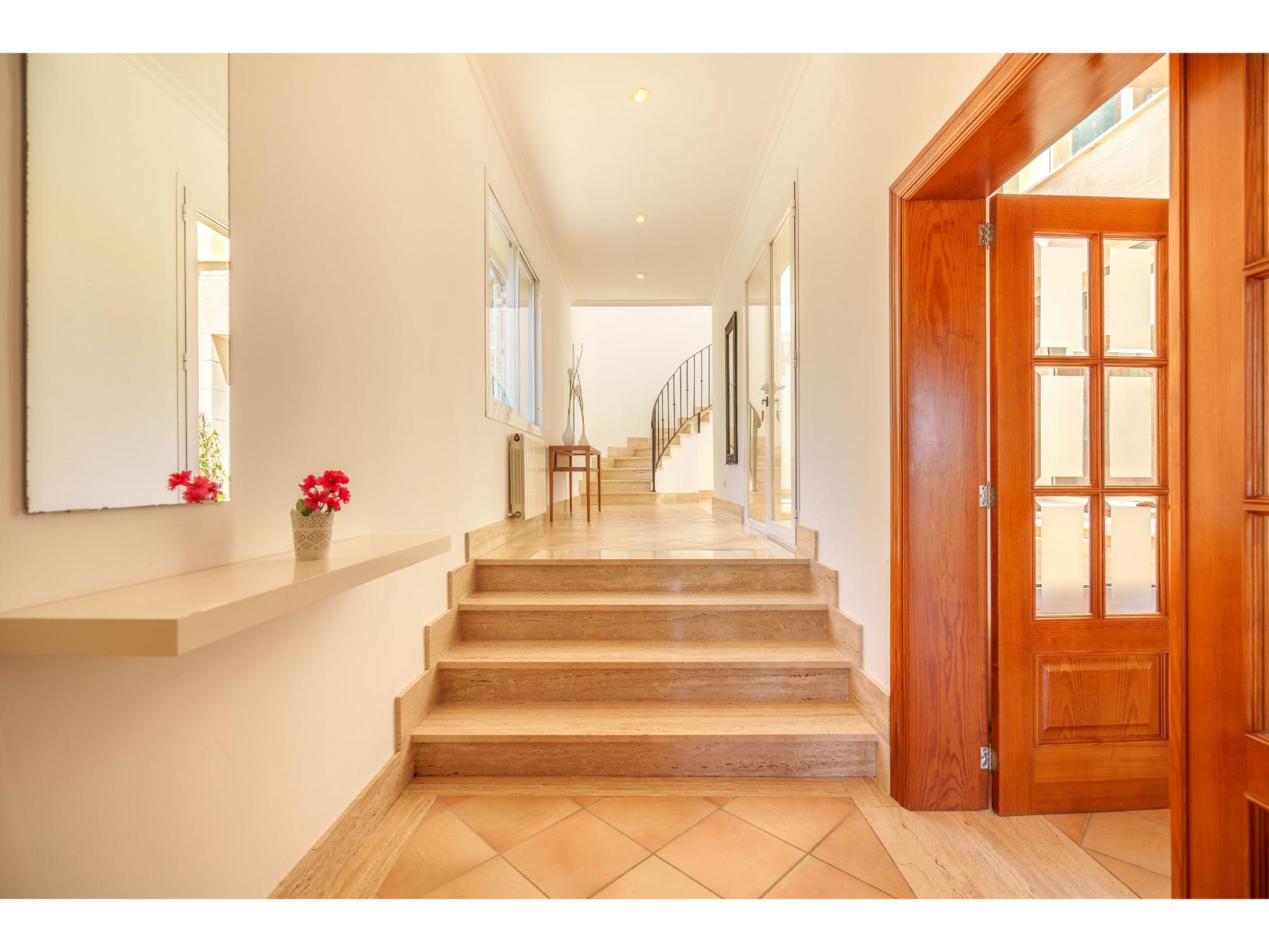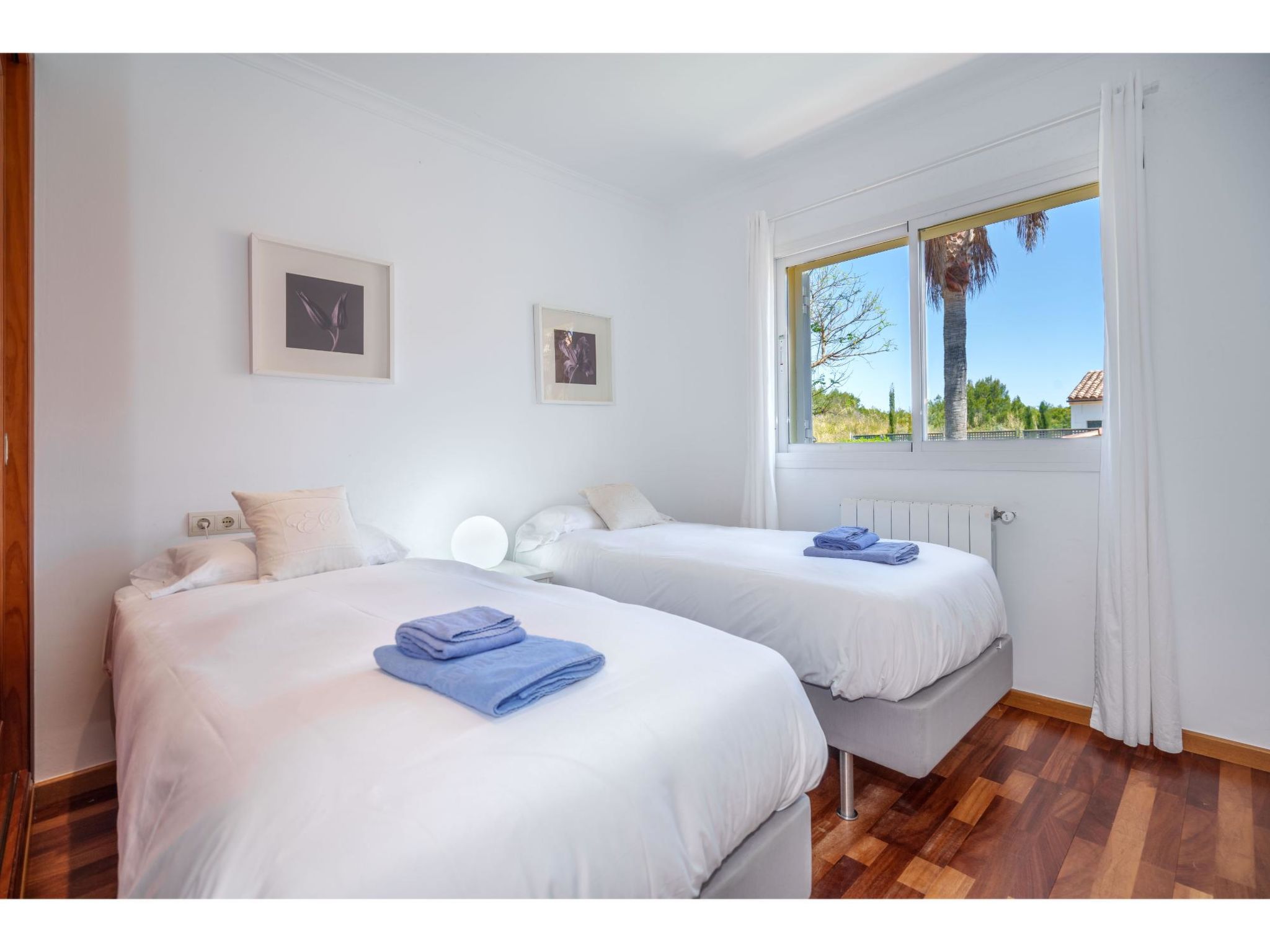 5-Zimmer-Haus, 2 Etagen, ca. 160 m². Zugang zum Haus über Treppe oder Zufahrt und Garage. Erdgeschoss: Wohnraum mit Sitzgruppe, Kamin (nur Dekoration), Terrassenausgang, über 4 Stufen zum Essplatz. Küche (3 Ceranfelder, Backofen, Mikrowelle, Geschirrspüler, Kühlschrank, kleiner Gefrierschrank, Kaffeemaschine, Toaster) mit Gartenausgang. Zweibettzimmer. Dusche/WC. 1. Etage: Zweibettzimmer mit Sessel, Doppelwaschbecken und Zugang zu Bad/WC. 2 Schlafzimmer jeweils mit franz. Bett (1,40 m breit). Dusche/Doppelwaschbecken/WC. VT/104073