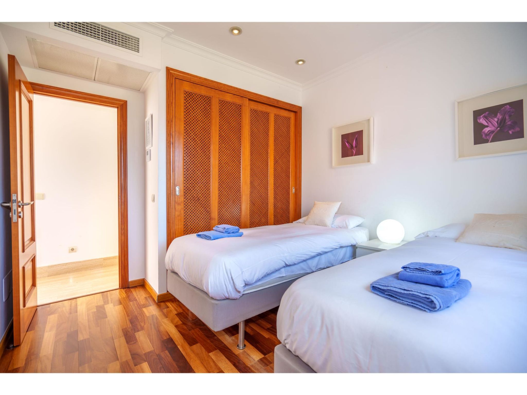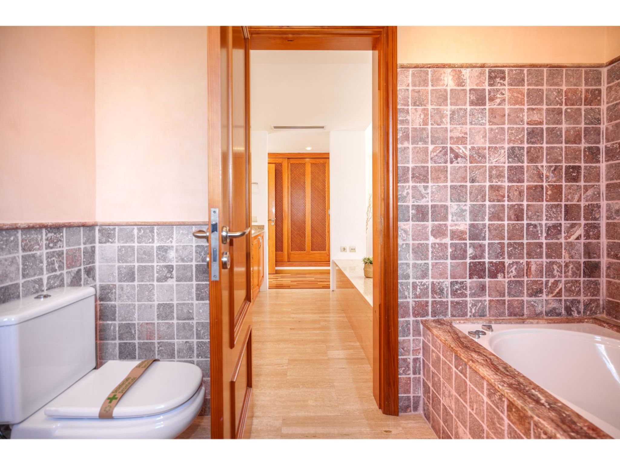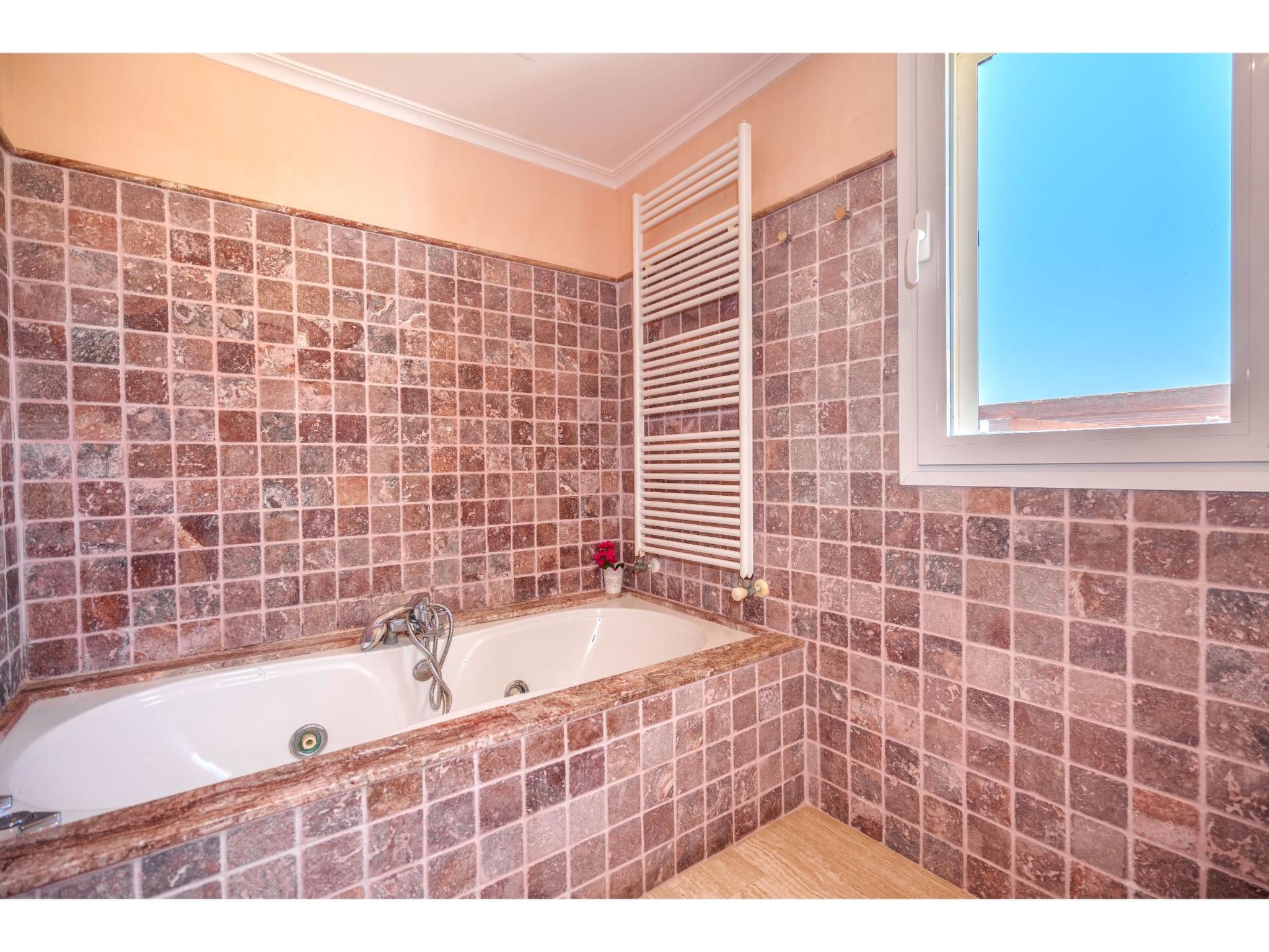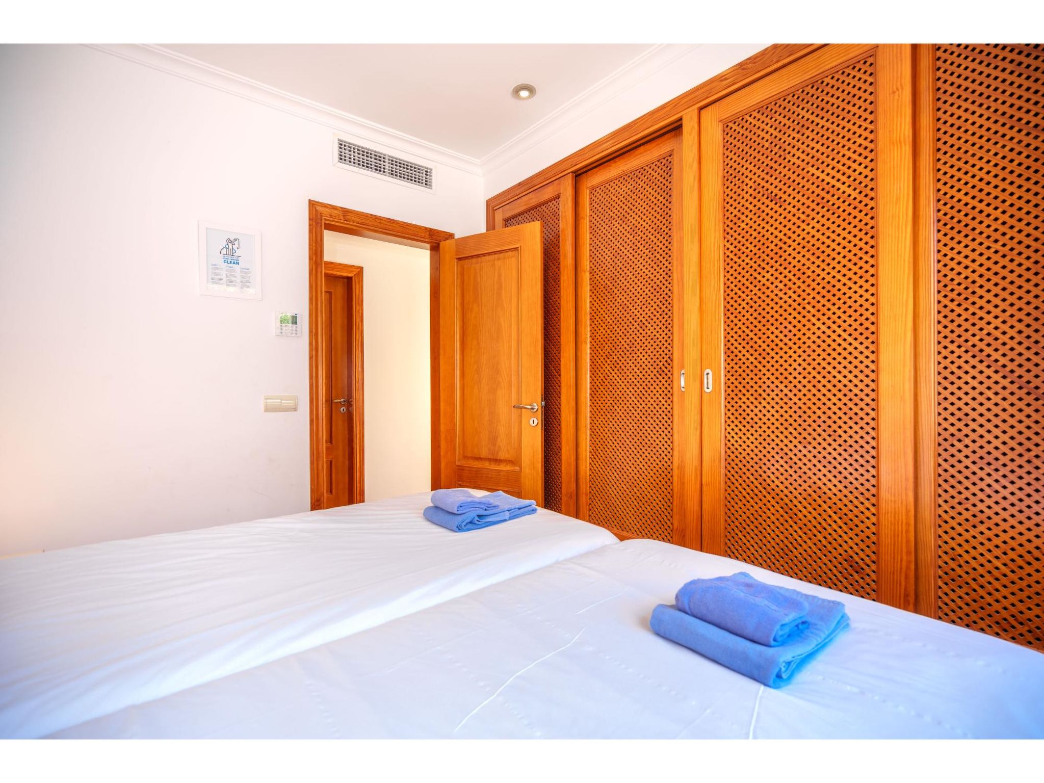 5-Zimmer-Haus, 2 Etagen, ca. 160 m². Zugang zum Haus über Treppe oder Zufahrt und Garage. Erdgeschoss: Wohnraum mit Sitzgruppe, Kamin (nur Dekoration), Terrassenausgang, über 4 Stufen zum Essplatz. Küche (3 Ceranfelder, Backofen, Mikrowelle, Geschirrspüler, Kühlschrank, kleiner Gefrierschrank, Kaffeemaschine, Toaster) mit Gartenausgang. Zweibettzimmer. Dusche/WC. 1. Etage: Zweibettzimmer mit Sessel, Doppelwaschbecken und Zugang zu Bad/WC. 2 Schlafzimmer jeweils mit franz. Bett (1,40 m breit). Dusche/Doppelwaschbecken/WC. VT/104073