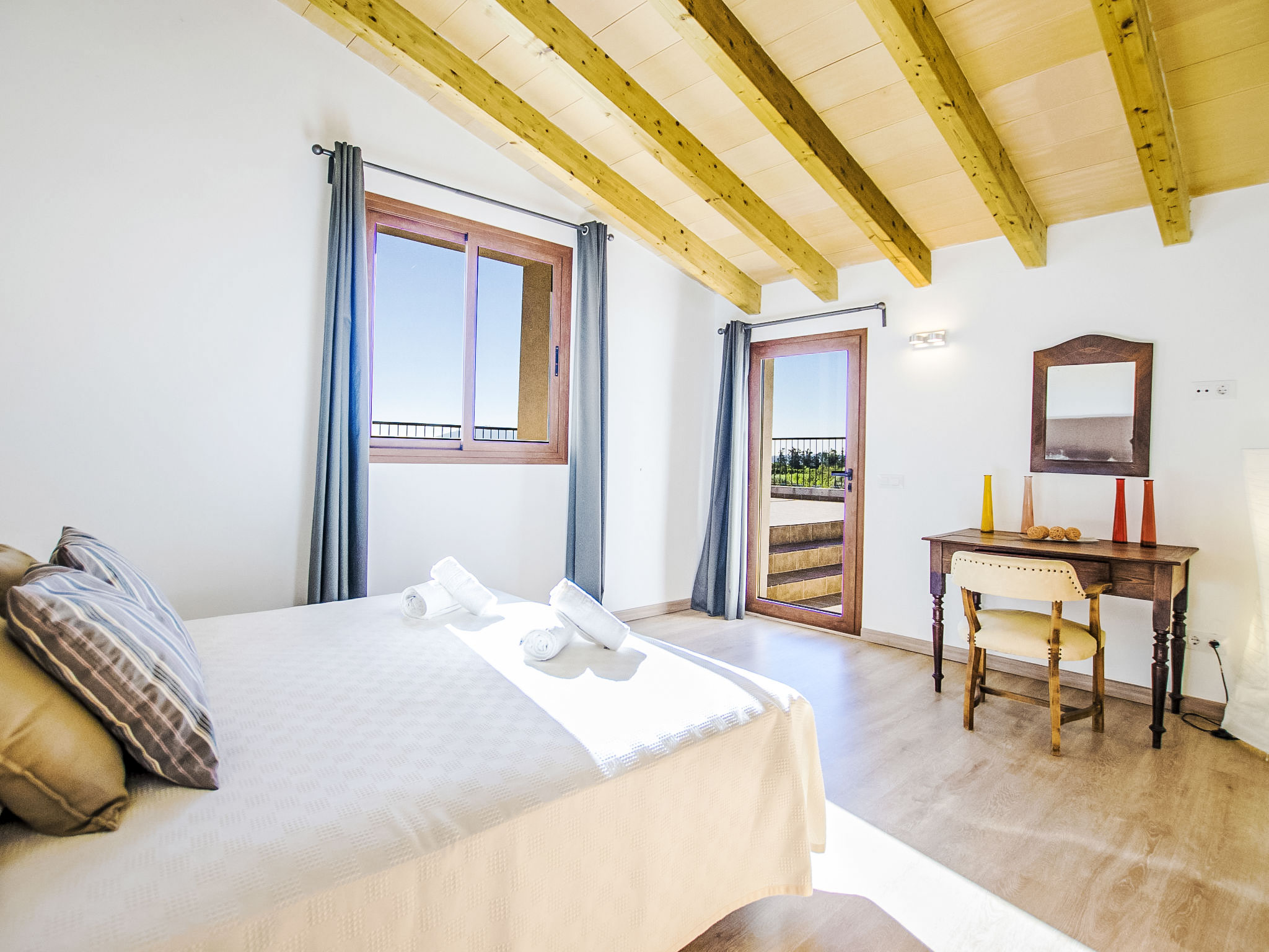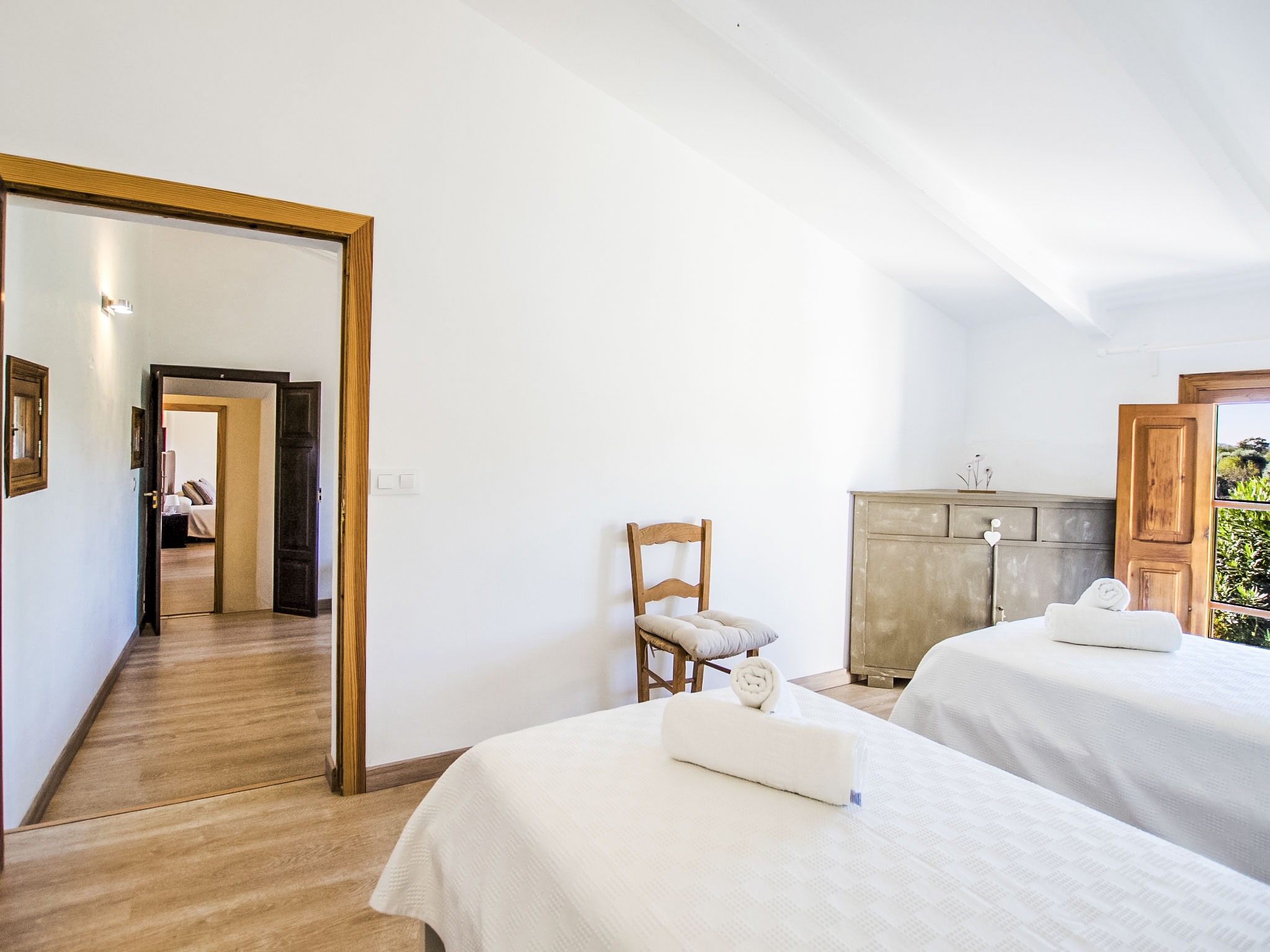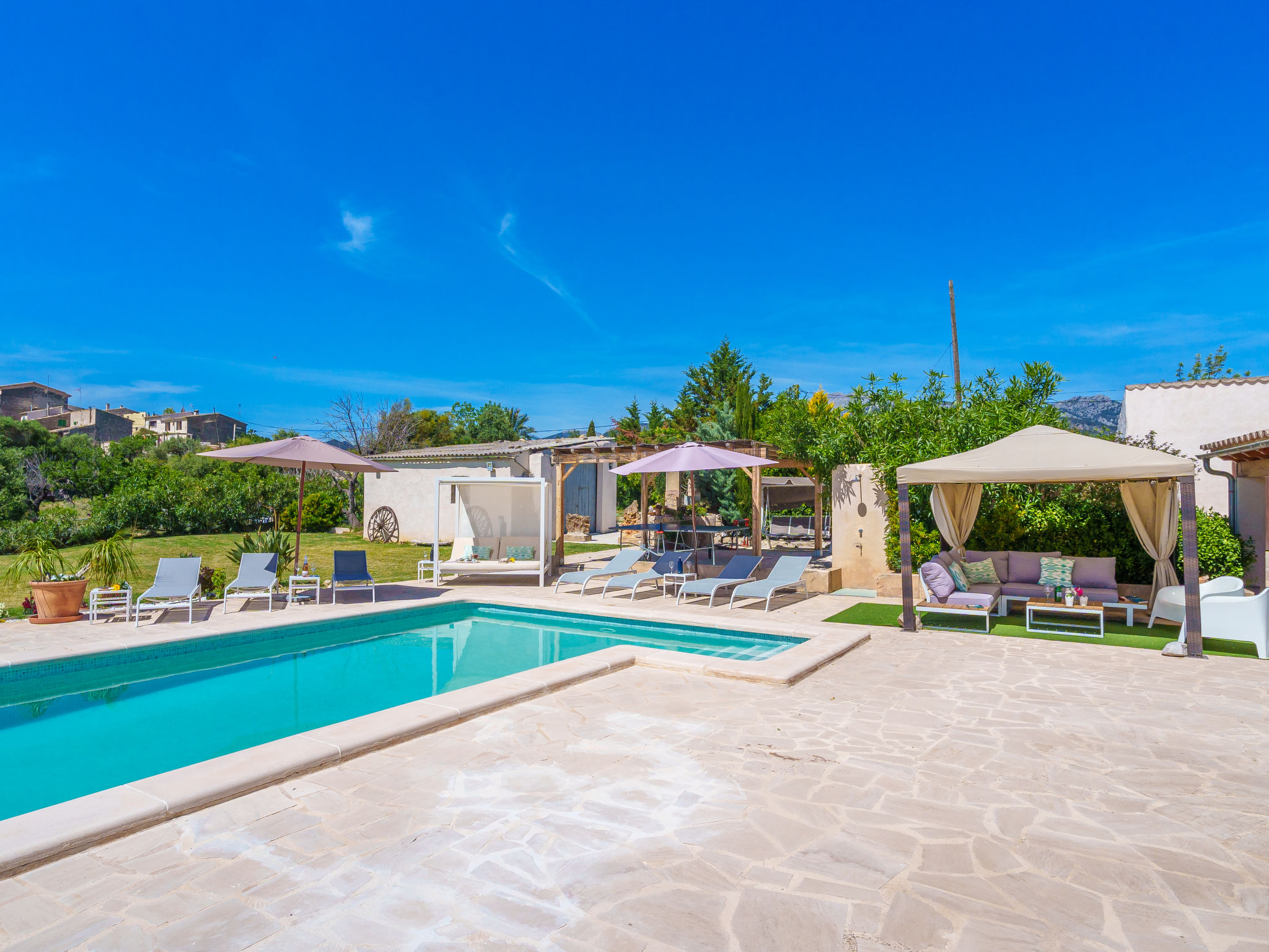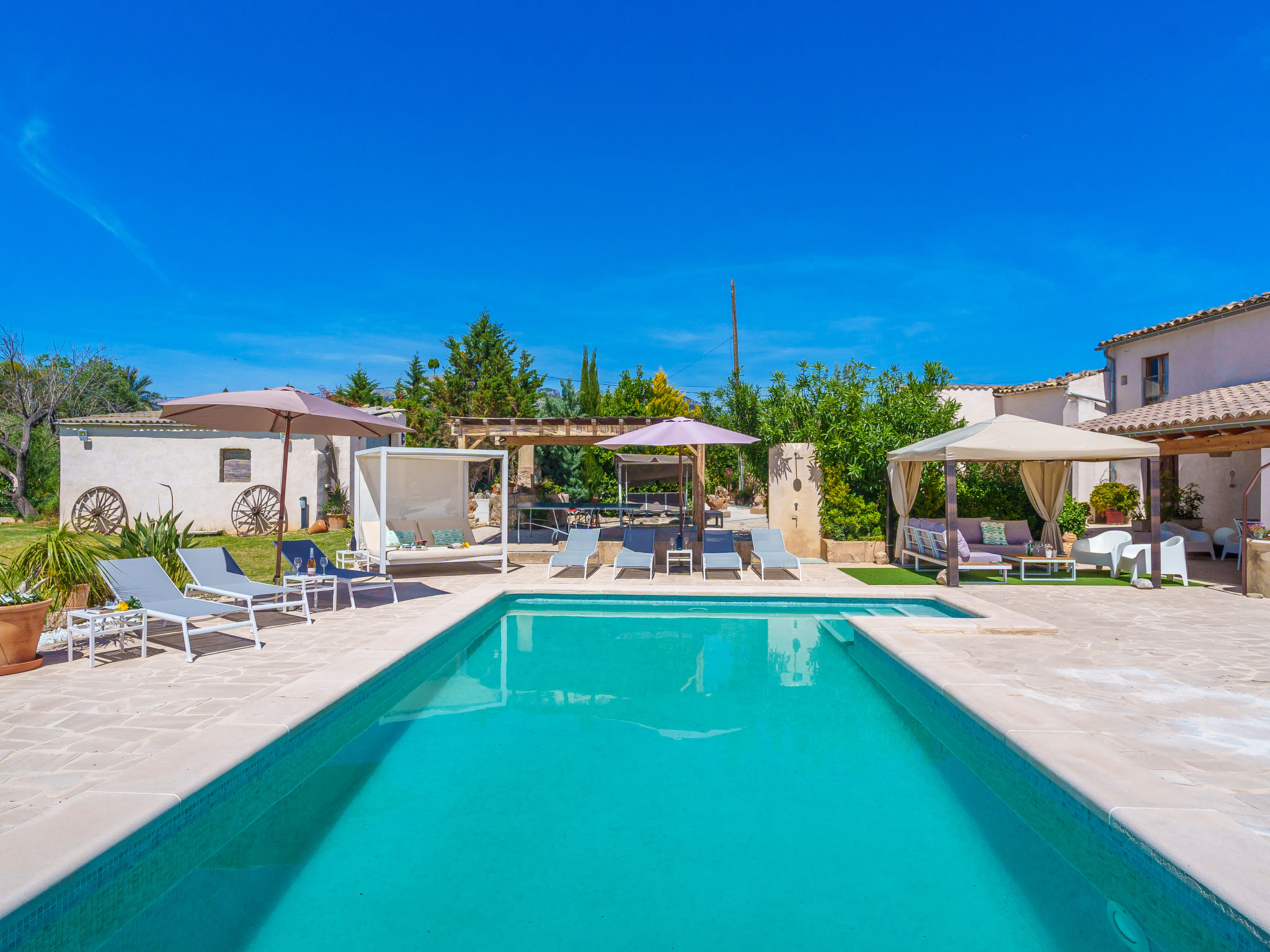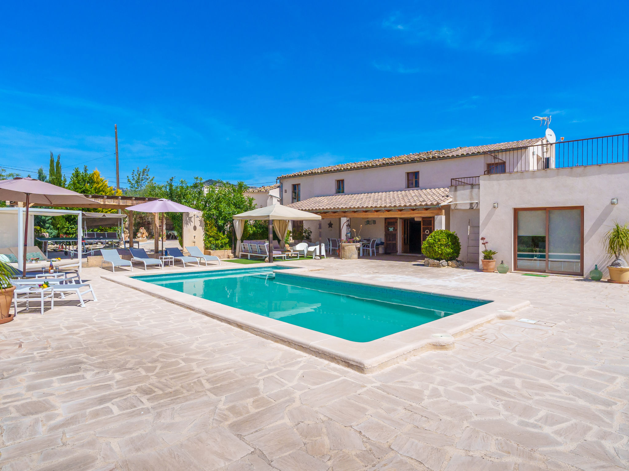 "Es Cos", 5-Zimmer-Villa 200 m2 auf 2 Stockwerken. Objekt geeignet für 8 Erwachsene. Geräumig, vollständig renoviert, sehr schön und geschmackvoll eingerichtet: grosses Wohnzimmer mit TV, Sat-TV, Flachbildschirm, Klimaanlage und Warmluftheizung. Ausgang zum Gartensitzplatz, zum Schwimmbad. 1 grosses Doppelzimmer mit Panoramafenster mit 1 franz. Bett, Klimaanlage und Warmluftheizung. Ausgang zum Gartensitzplatz, zum Schwimmbad. Wohnküche (Backofen, Geschirrspüler, 3 Glaskeramikherd Platten, Mikrowelle, Tiefkühler, elektrische Kaffeemaschine, Kochinsel) mit Esstisch, Klimaanlage und Warmluftheizung. Ausgang zum Gartensitzplatz, zum Schwimmbad. Bad/Dusche/WC. Obergeschoss: (Leiter) 1 grosses Doppelzimmer mit Panoramafenster mit 1 franz. Bett, Klimaanlage und Warmluftheizung. Ausgang zum Balkon, zur Terrasse. (Leiter) 1 Doppelzimmer mit Panoramafenster mit 1 franz. Bett. (Leiter) Durchgangszimmer grosses mit Panoramafenster mit 2 Betten (90 cm), Klimaanlage und Warmluftheizung. Bad/Dusche/WC. Natursteinböden. Komfortable Einrichtung im Landhausstil. Grosser Gartensitzplatz, Rasen. Terrassenmöbel, Balkonmöbel, Gartengrill, Liegestühle (8), Loggia. Sehr schöne Sicht auf die Berge und die Landschaft. Zur Verfügung: Waschmaschine, Bügeleisen, Kinderhochstuhl, Babybett, Haartrockner. Internet (Wireless LAN, gratis). Parkplatz beim Haus. Geeignet für Familien. ETV7057