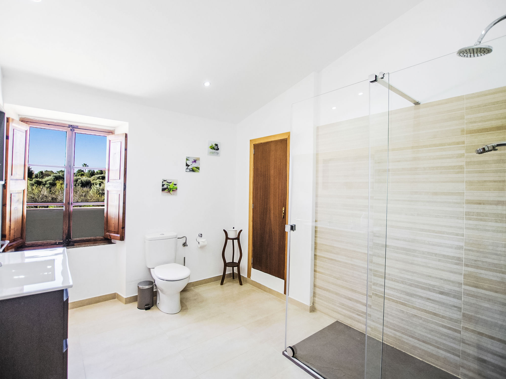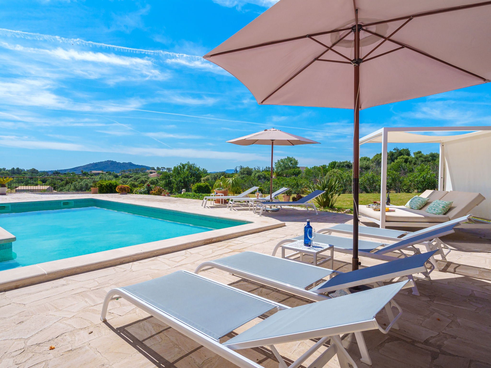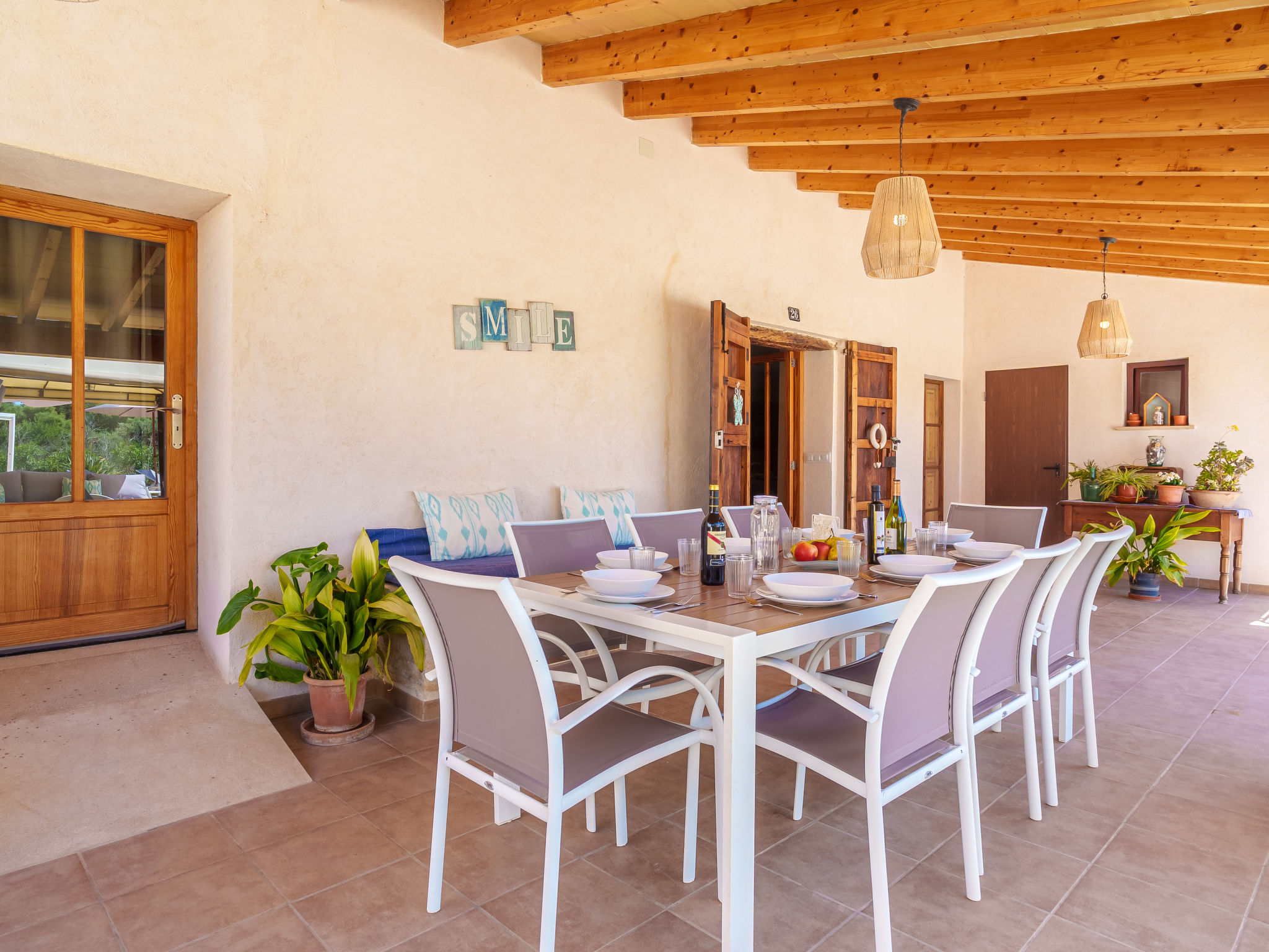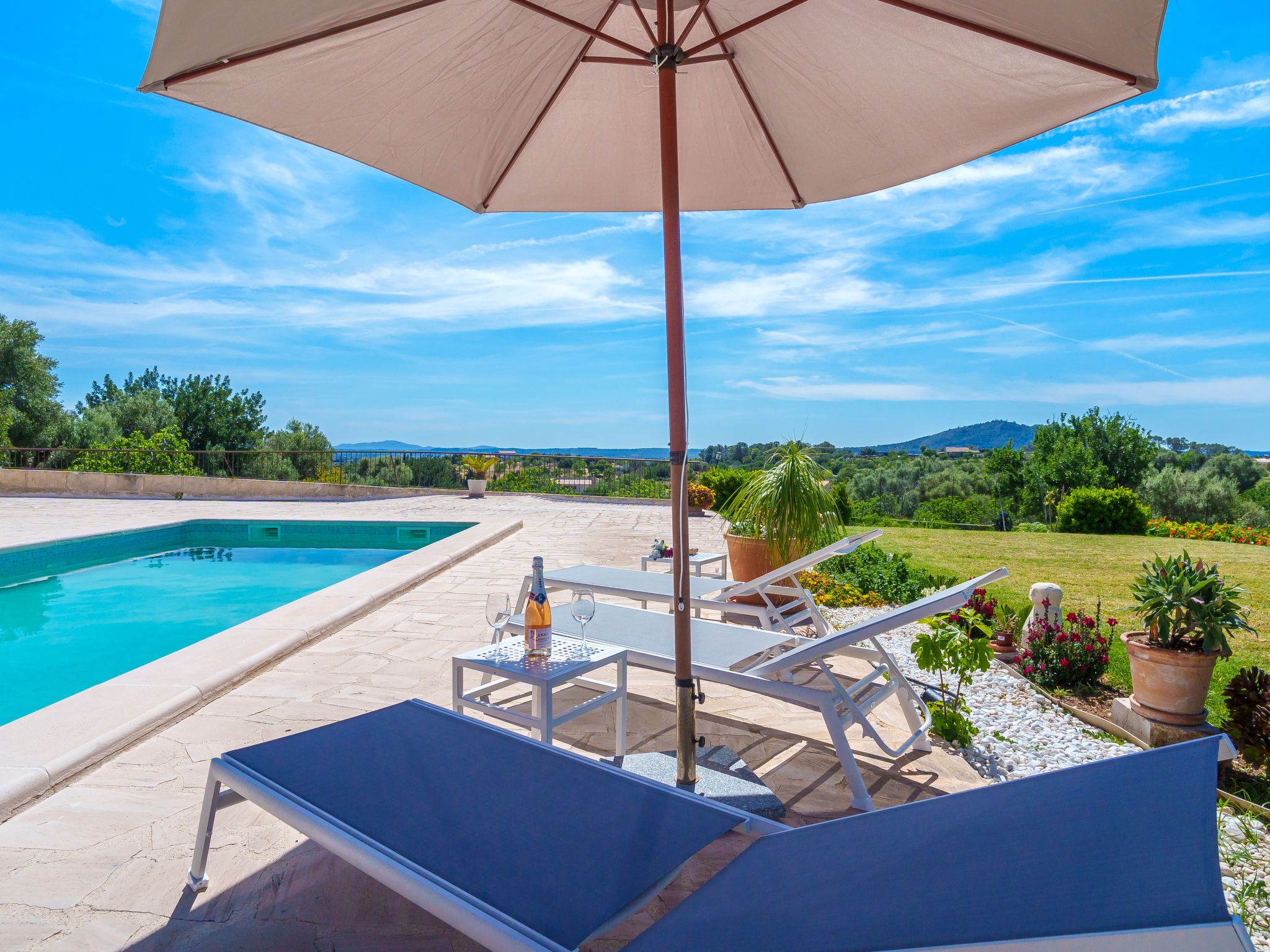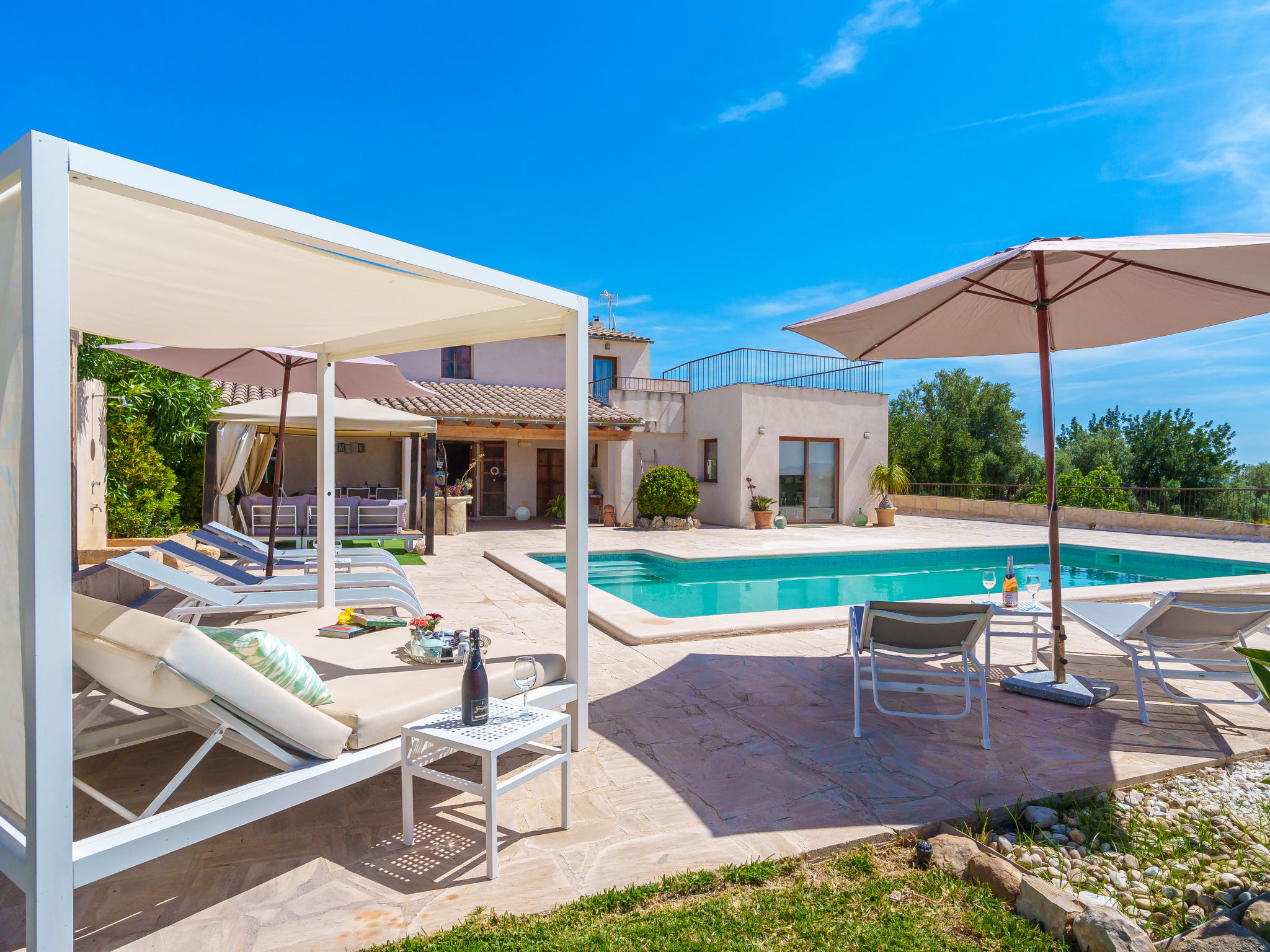 "Es Cos", 5-Zimmer-Villa 200 m2 auf 2 Stockwerken. Objekt geeignet für 8 Erwachsene. Geräumig, vollständig renoviert, sehr schön und geschmackvoll eingerichtet: grosses Wohnzimmer mit TV, Sat-TV, Flachbildschirm, Klimaanlage und Warmluftheizung. Ausgang zum Gartensitzplatz, zum Schwimmbad. 1 grosses Doppelzimmer mit Panoramafenster mit 1 franz. Bett, Klimaanlage und Warmluftheizung. Ausgang zum Gartensitzplatz, zum Schwimmbad. Wohnküche (Backofen, Geschirrspüler, 3 Glaskeramikherd Platten, Mikrowelle, Tiefkühler, elektrische Kaffeemaschine, Kochinsel) mit Esstisch, Klimaanlage und Warmluftheizung. Ausgang zum Gartensitzplatz, zum Schwimmbad. Bad/Dusche/WC. Obergeschoss: (Leiter) 1 grosses Doppelzimmer mit Panoramafenster mit 1 franz. Bett, Klimaanlage und Warmluftheizung. Ausgang zum Balkon, zur Terrasse. (Leiter) 1 Doppelzimmer mit Panoramafenster mit 1 franz. Bett. (Leiter) Durchgangszimmer grosses mit Panoramafenster mit 2 Betten (90 cm), Klimaanlage und Warmluftheizung. Bad/Dusche/WC. Natursteinböden. Komfortable Einrichtung im Landhausstil. Grosser Gartensitzplatz, Rasen. Terrassenmöbel, Balkonmöbel, Gartengrill, Liegestühle (8), Loggia. Sehr schöne Sicht auf die Berge und die Landschaft. Zur Verfügung: Waschmaschine, Bügeleisen, Kinderhochstuhl, Babybett, Haartrockner. Internet (Wireless LAN, gratis). Parkplatz beim Haus. Geeignet für Familien. ETV7057