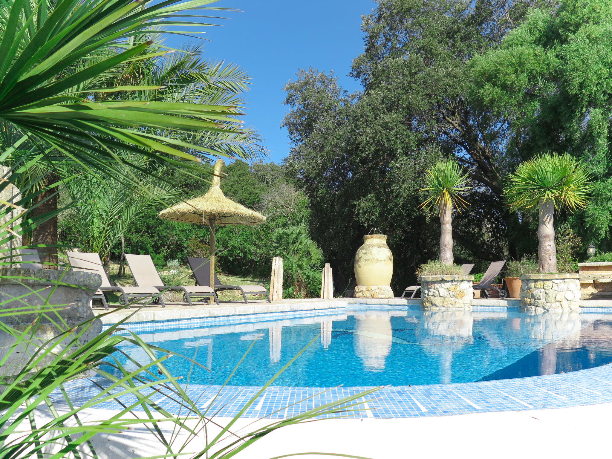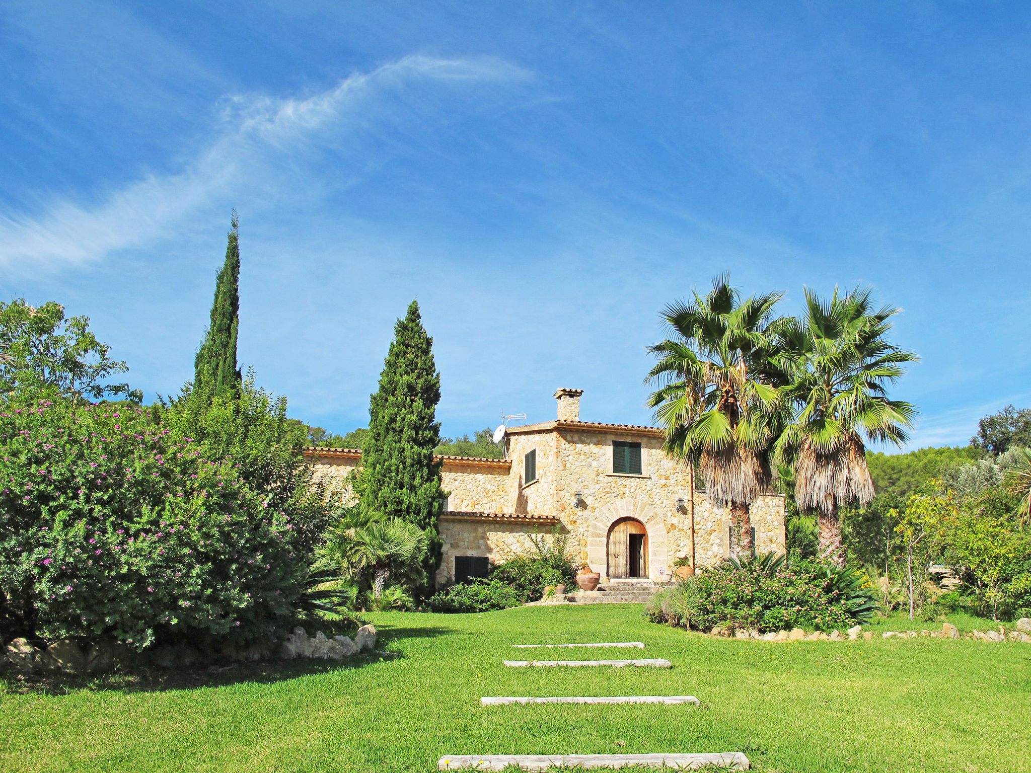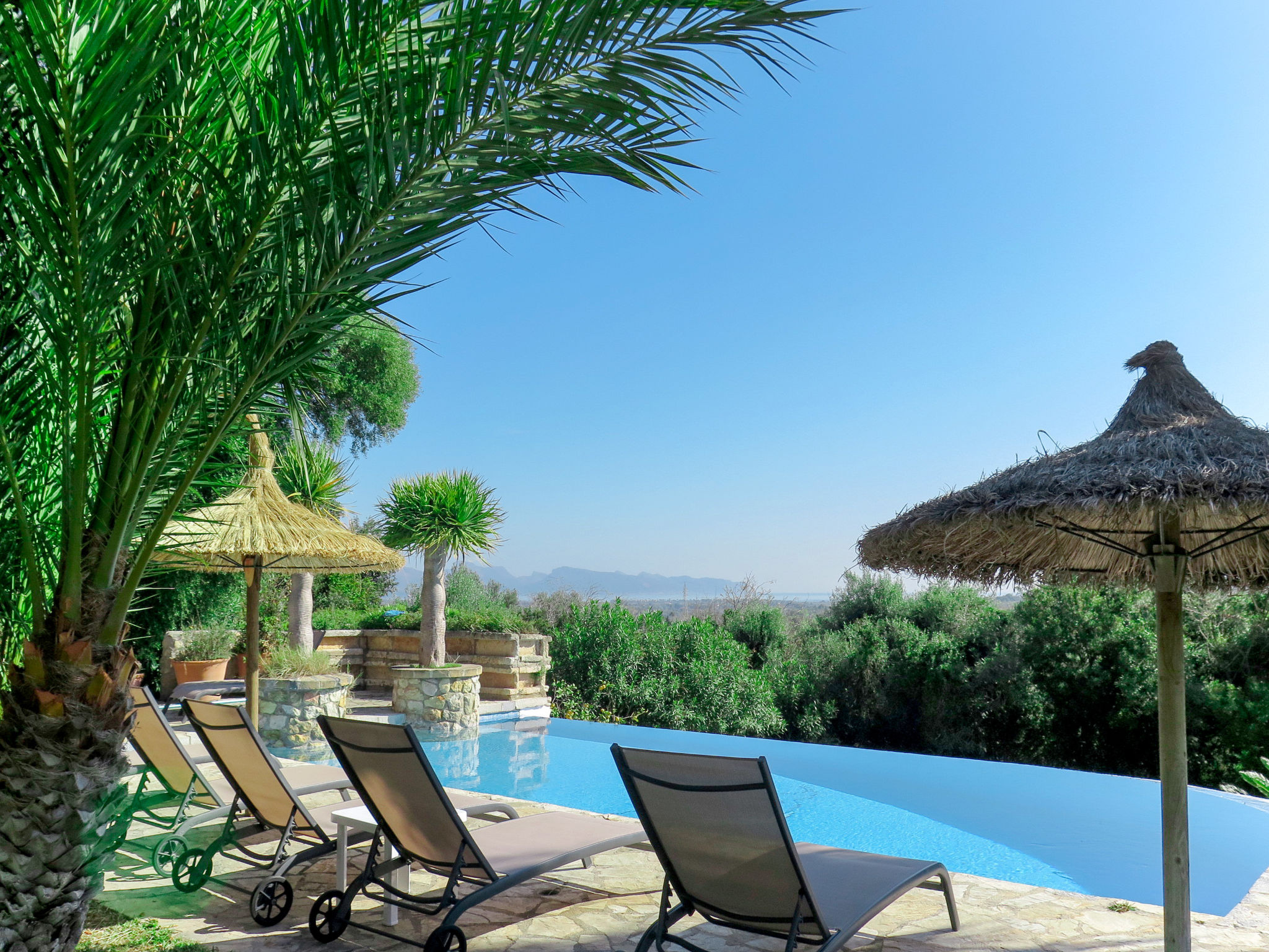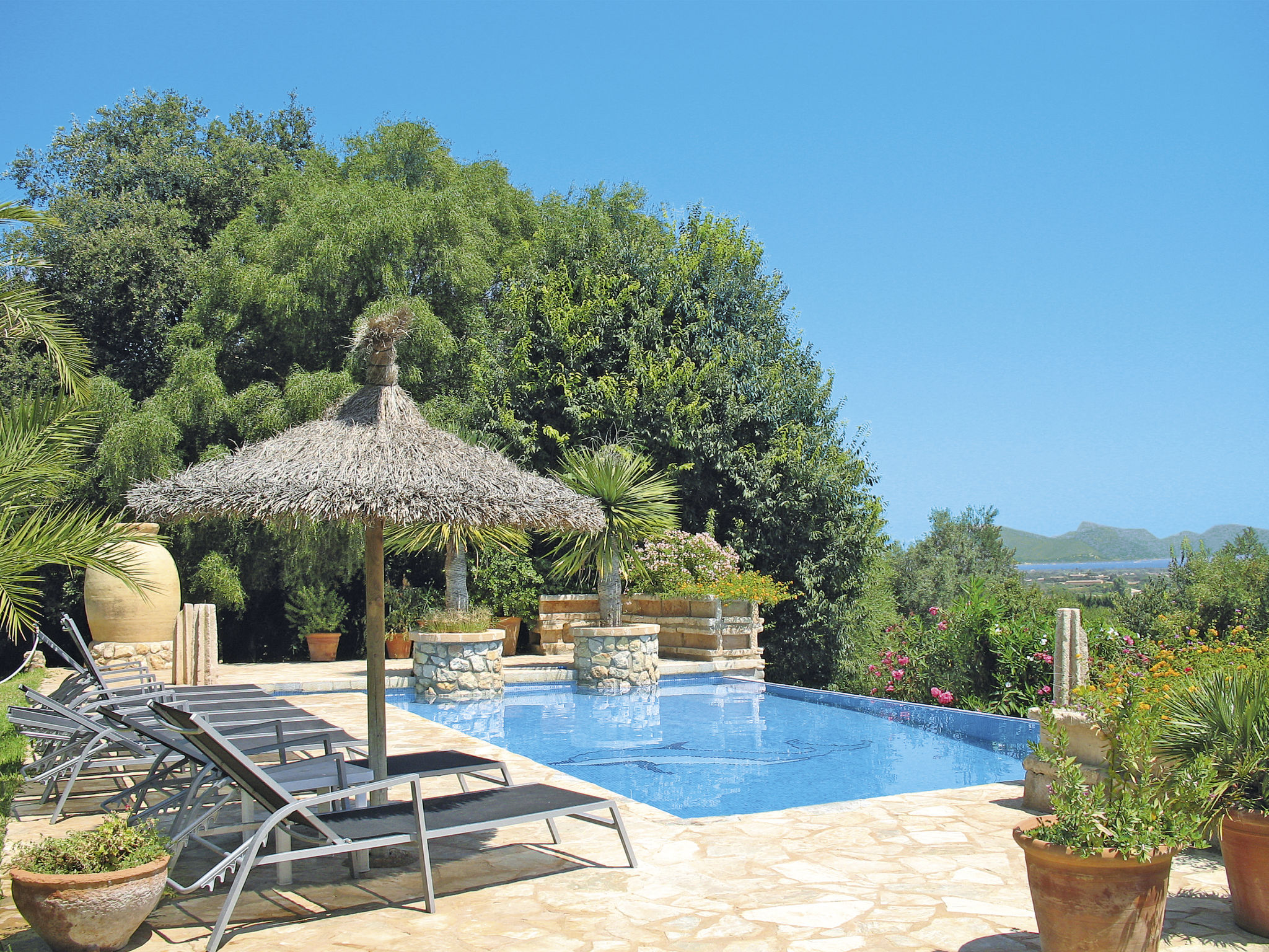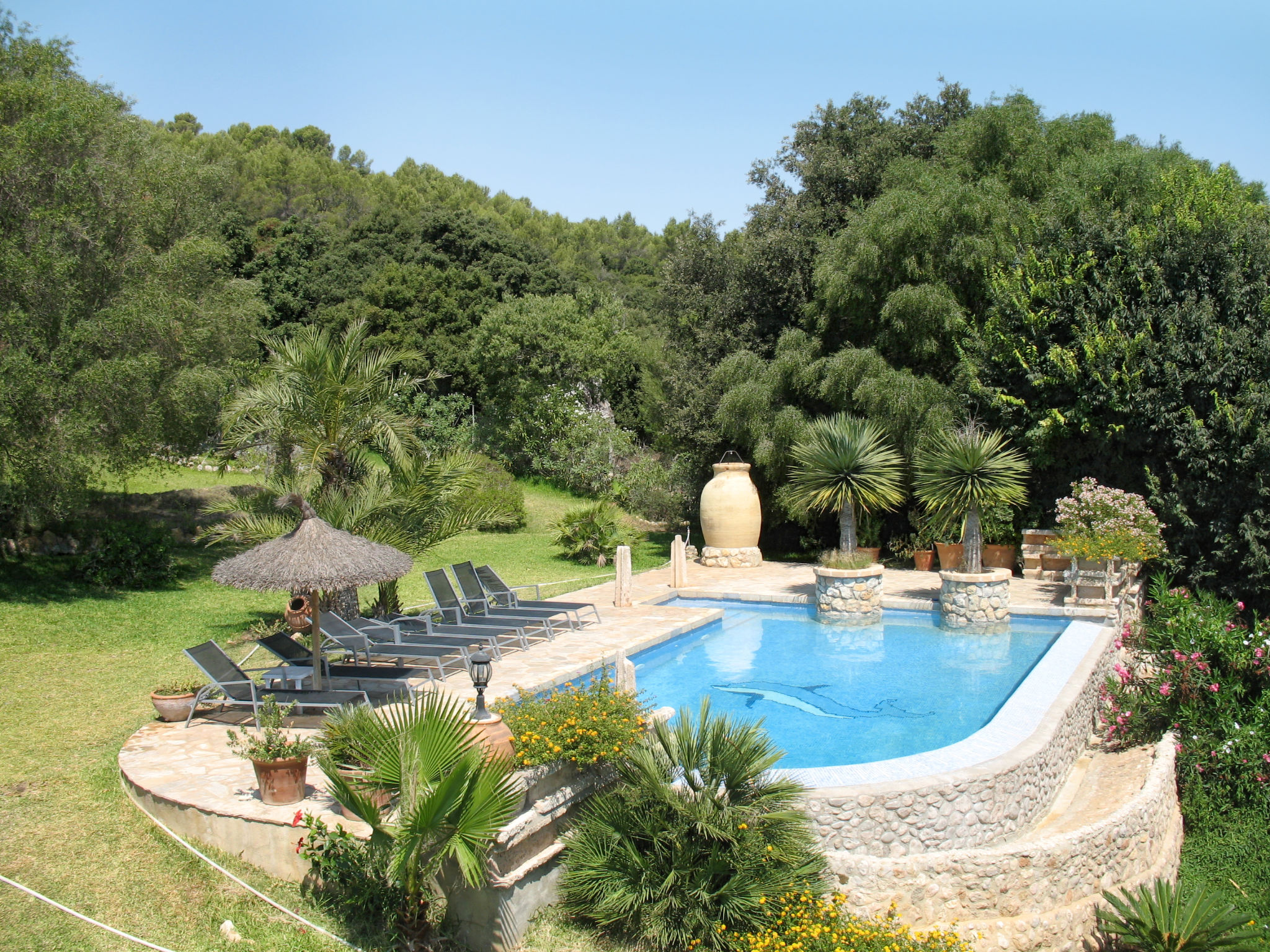 Das attraktive Landhaus, eine Naturstein-Finca, liegt eingebettet in die sanfte Hügellandschaft, umgeben von Steineichenwald, Garriga und Sträuchern, mit freiem Blick bis zur Bucht von Pollença. Pollença 7 km, Alcúdia 6 km. Zu den Stränden zwischen Alcúdia und Puerto Pollença 8 km. Golfplatz Pollença 10 km. Ca. 4000 m² großes, abgeschlossenes Grundstück in leichter Hanglage mit überzeugender gartenarchitektonischer Gestaltung: Oleanderbüsche begrenzen die terrassierten Rasenflächen, die durch kleine Gruppen unterschiedlicher Palmenarten aufgelockert werden. Die Terrasse des Überlaufpools (9 x 5 m, gesamte Saison geöffnet) ist mit einigen Amphoren dekoriert. Eine davon wurde zur Außendusche umgewandelt. Sonnenliegen und Sonnenschirm vorhanden. Aufgrund der leichten Hanglage ist das Haus auf verschiedenen Ebenen angelegt. Zwei Terrassen (insgesamt ca. 90 m², Mobiliar und gemauerte Grillstelle) laden zum Verweilen ein. Parkmöglichkeiten auf dem Grundstück. Ansprechende Einrichtung. Großzügiges Wohnambiente mit teils rustikalen Möbeln und einzelnen Antiquitäten. Holzbalkendecken. Fliesenböden. Sat-TV (deutsche Programme). Internetzugang (WLAN, inklusive). Waschmaschine, Bügeleisen/-brett, Fön. Safe. Öl-Zentralheizung (bis 15.05.), in den Schlafzimmern Ventilator. Hinweis: Rauchen ist im Haus nicht gestattet.