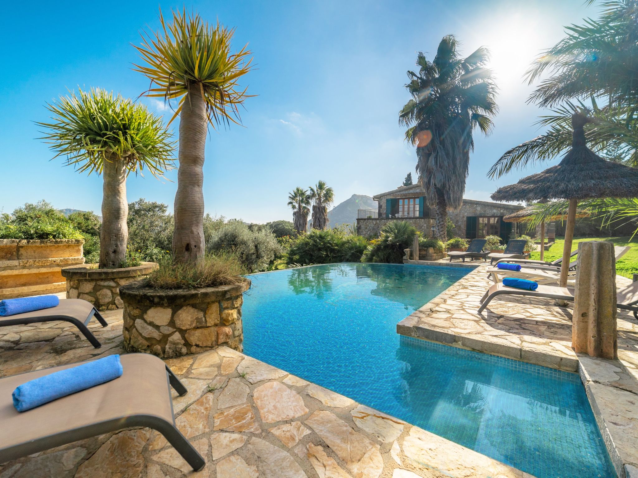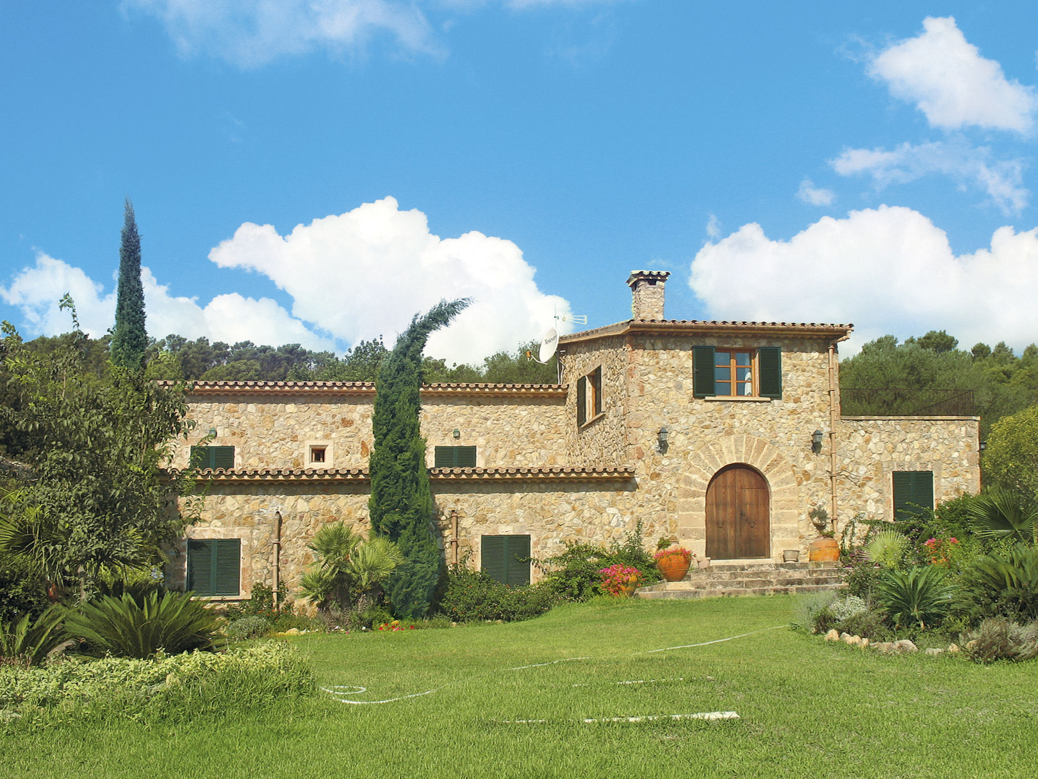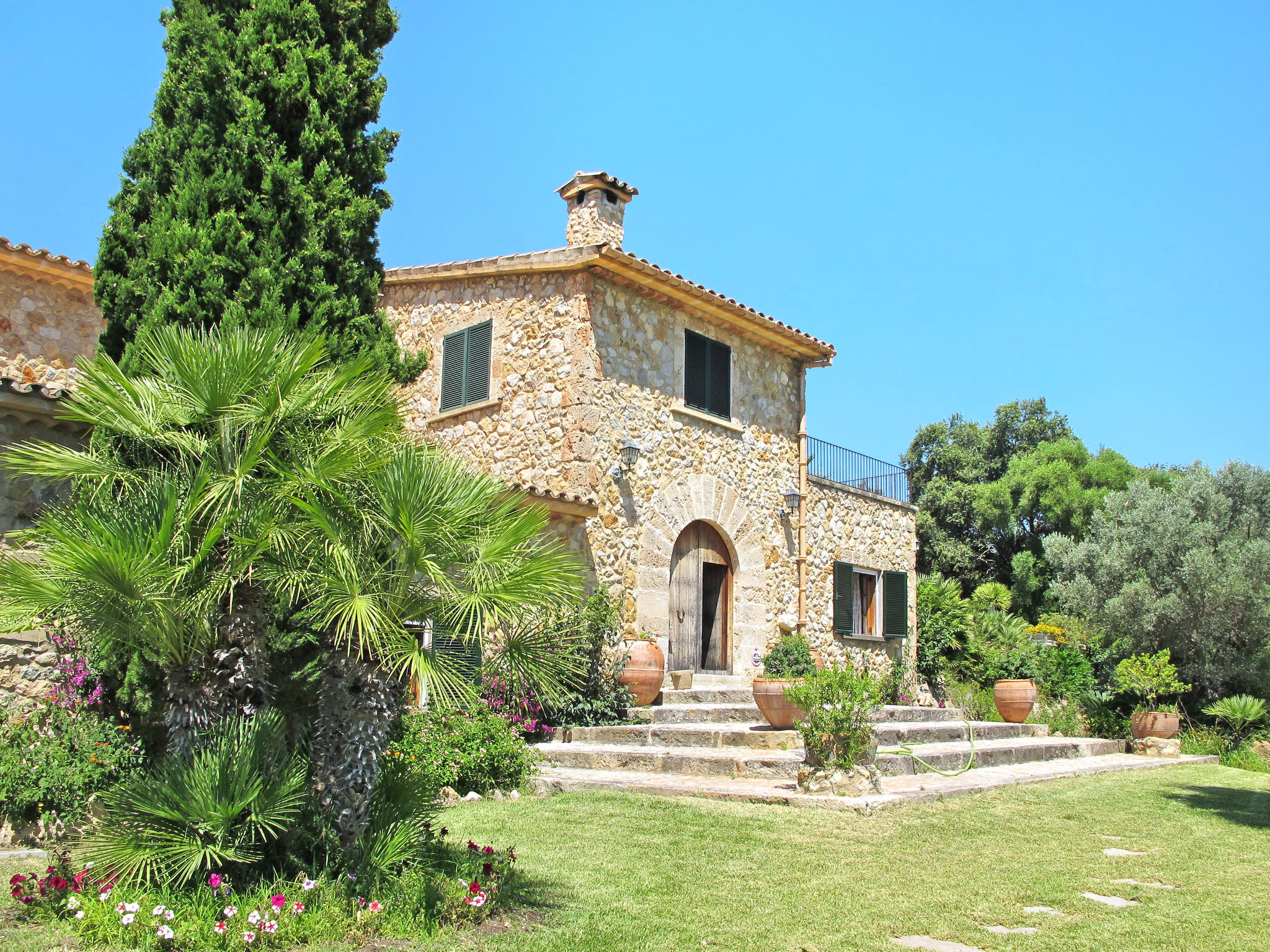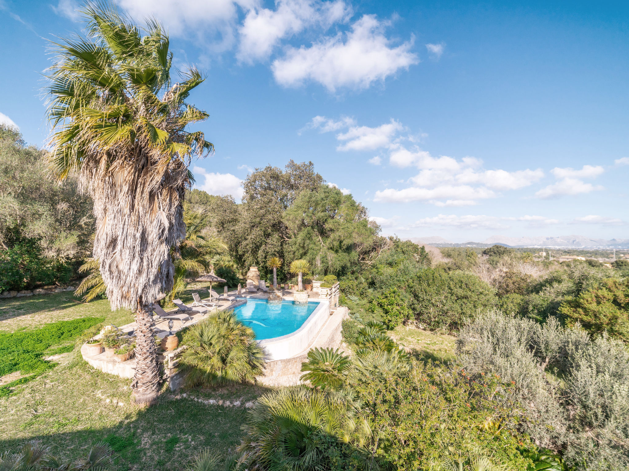 Das attraktive Landhaus, eine Naturstein-Finca, liegt eingebettet in die sanfte Hügellandschaft, umgeben von Steineichenwald, Garriga und Sträuchern, mit freiem Blick bis zur Bucht von Pollença. Pollença 7 km, Alcúdia 6 km. Zu den Stränden zwischen Alcúdia und Puerto Pollença 8 km. Golfplatz Pollença 10 km. Ca. 4000 m² großes, abgeschlossenes Grundstück in leichter Hanglage mit überzeugender gartenarchitektonischer Gestaltung: Oleanderbüsche begrenzen die terrassierten Rasenflächen, die durch kleine Gruppen unterschiedlicher Palmenarten aufgelockert werden. Die Terrasse des Überlaufpools (9 x 5 m, gesamte Saison geöffnet) ist mit einigen Amphoren dekoriert. Eine davon wurde zur Außendusche umgewandelt. Sonnenliegen und Sonnenschirm vorhanden. Aufgrund der leichten Hanglage ist das Haus auf verschiedenen Ebenen angelegt. Zwei Terrassen (insgesamt ca. 90 m², Mobiliar und gemauerte Grillstelle) laden zum Verweilen ein. Parkmöglichkeiten auf dem Grundstück. Ansprechende Einrichtung. Großzügiges Wohnambiente mit teils rustikalen Möbeln und einzelnen Antiquitäten. Holzbalkendecken. Fliesenböden. Sat-TV (deutsche Programme). Internetzugang (WLAN, inklusive). Waschmaschine, Bügeleisen/-brett, Fön. Safe. Öl-Zentralheizung (bis 15.05.), in den Schlafzimmern Ventilator. Hinweis: Rauchen ist im Haus nicht gestattet.