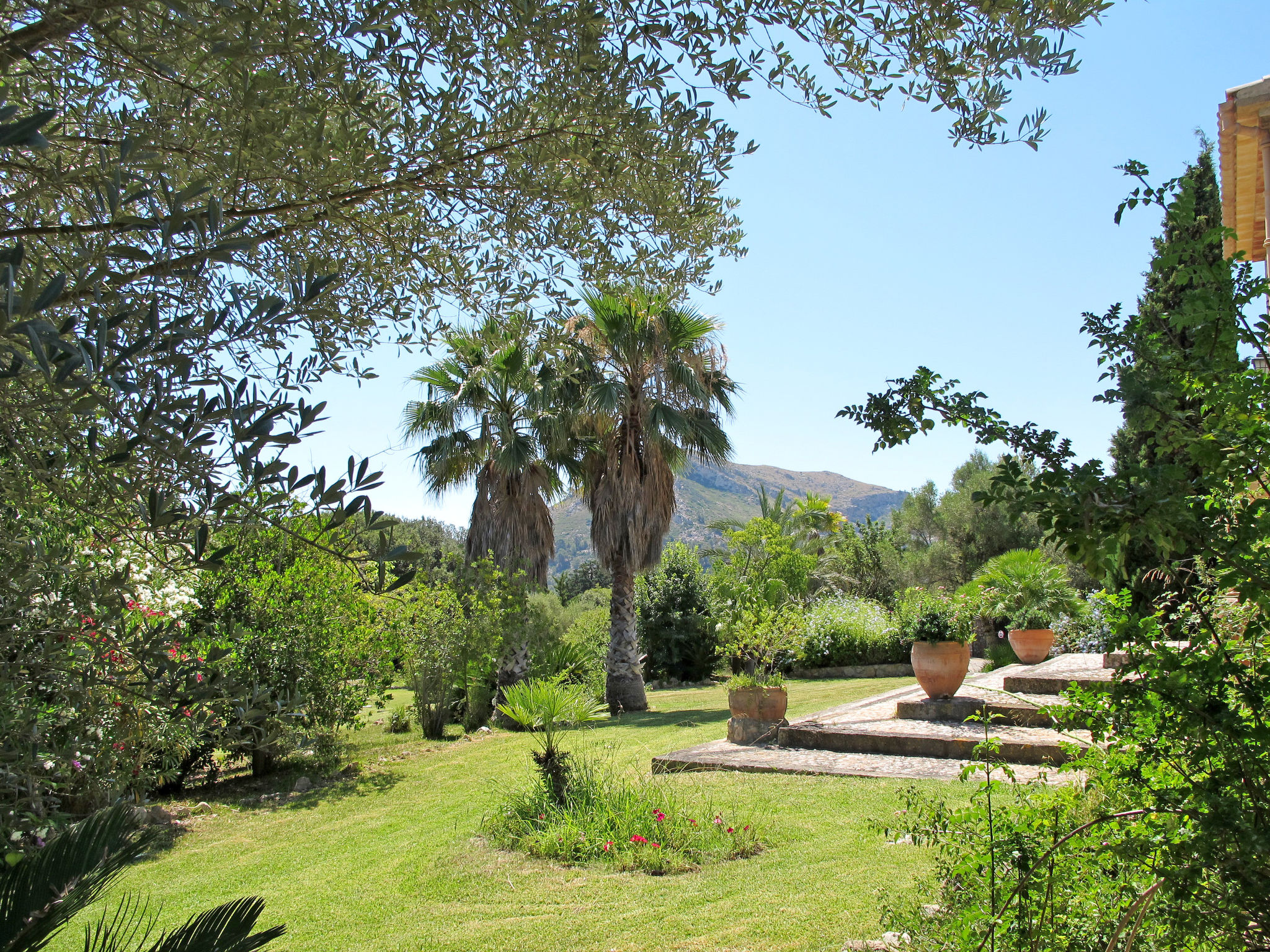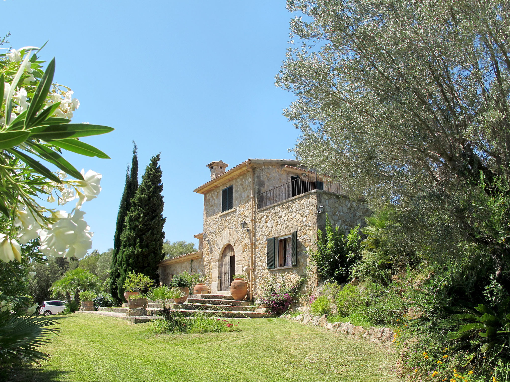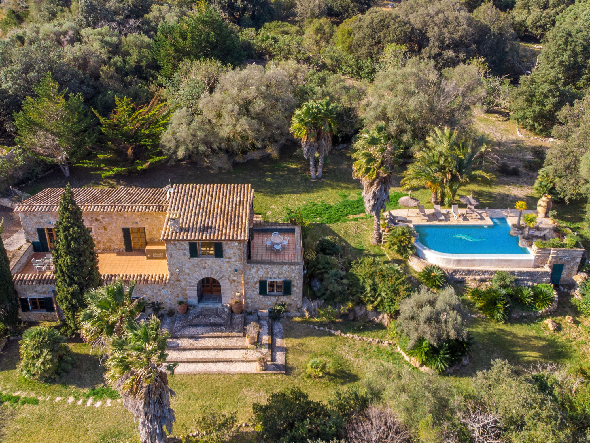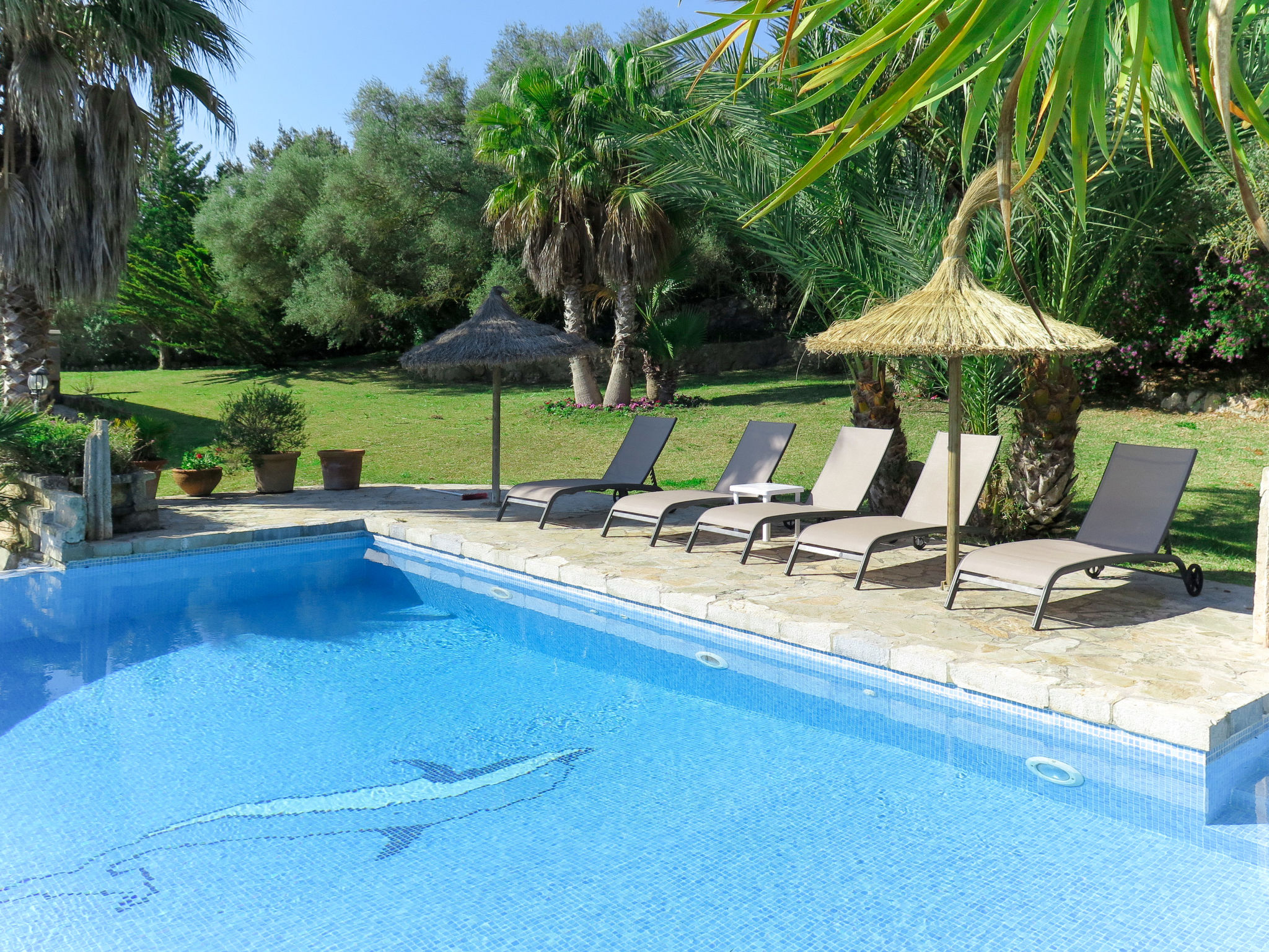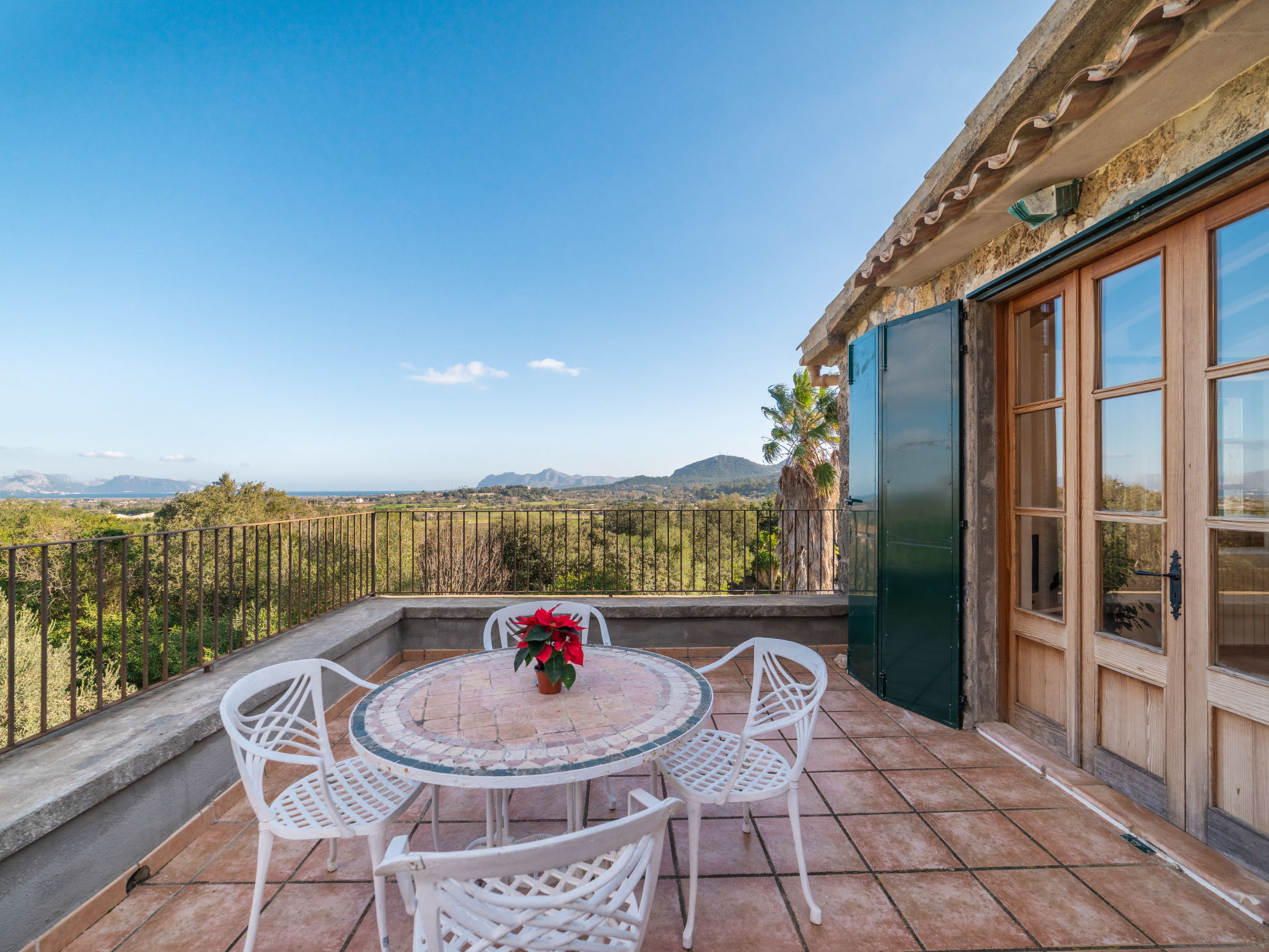 Das attraktive Landhaus, eine Naturstein-Finca, liegt eingebettet in die sanfte Hügellandschaft, umgeben von Steineichenwald, Garriga und Sträuchern, mit freiem Blick bis zur Bucht von Pollença. Pollença 7 km, Alcúdia 6 km. Zu den Stränden zwischen Alcúdia und Puerto Pollença 8 km. Golfplatz Pollença 10 km. Ca. 4000 m² großes, abgeschlossenes Grundstück in leichter Hanglage mit überzeugender gartenarchitektonischer Gestaltung: Oleanderbüsche begrenzen die terrassierten Rasenflächen, die durch kleine Gruppen unterschiedlicher Palmenarten aufgelockert werden. Die Terrasse des Überlaufpools (9 x 5 m, gesamte Saison geöffnet) ist mit einigen Amphoren dekoriert. Eine davon wurde zur Außendusche umgewandelt. Sonnenliegen und Sonnenschirm vorhanden. Aufgrund der leichten Hanglage ist das Haus auf verschiedenen Ebenen angelegt. Zwei Terrassen (insgesamt ca. 90 m², Mobiliar und gemauerte Grillstelle) laden zum Verweilen ein. Parkmöglichkeiten auf dem Grundstück. Ansprechende Einrichtung. Großzügiges Wohnambiente mit teils rustikalen Möbeln und einzelnen Antiquitäten. Holzbalkendecken. Fliesenböden. Sat-TV (deutsche Programme). Internetzugang (WLAN, inklusive). Waschmaschine, Bügeleisen/-brett, Fön. Safe. Öl-Zentralheizung (bis 15.05.), in den Schlafzimmern Ventilator. Hinweis: Rauchen ist im Haus nicht gestattet.