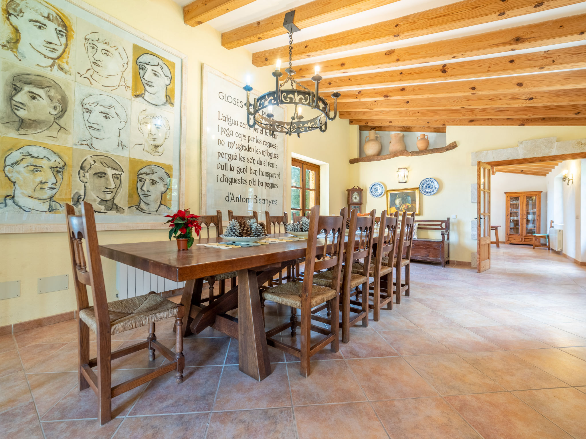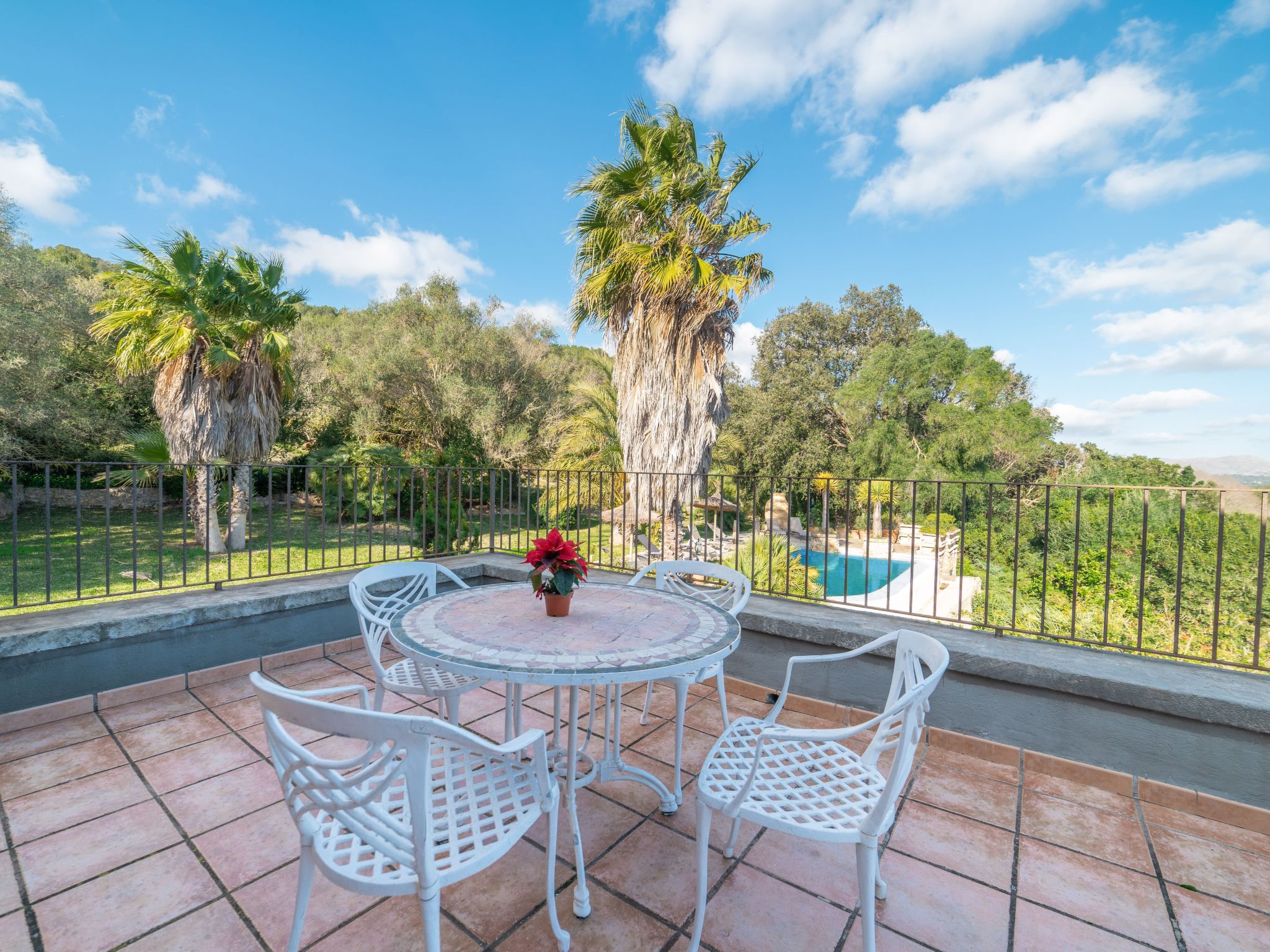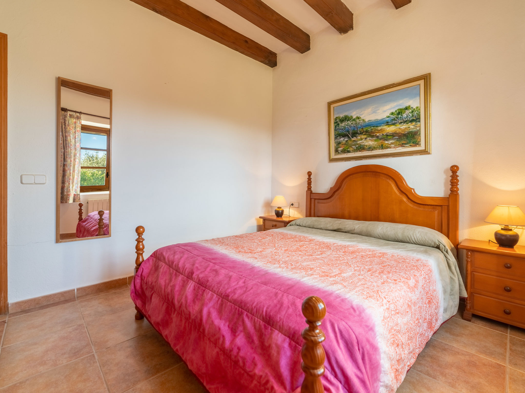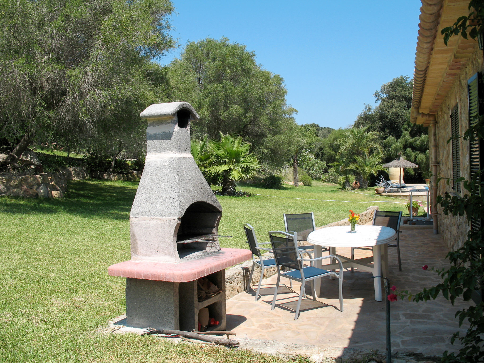 Das attraktive Landhaus, eine Naturstein-Finca, liegt eingebettet in die sanfte Hügellandschaft, umgeben von Steineichenwald, Garriga und Sträuchern, mit freiem Blick bis zur Bucht von Pollença. Pollença 7 km, Alcúdia 6 km. Zu den Stränden zwischen Alcúdia und Puerto Pollença 8 km. Golfplatz Pollença 10 km. Ca. 4000 m² großes, abgeschlossenes Grundstück in leichter Hanglage mit überzeugender gartenarchitektonischer Gestaltung: Oleanderbüsche begrenzen die terrassierten Rasenflächen, die durch kleine Gruppen unterschiedlicher Palmenarten aufgelockert werden. Die Terrasse des Überlaufpools (9 x 5 m, gesamte Saison geöffnet) ist mit einigen Amphoren dekoriert. Eine davon wurde zur Außendusche umgewandelt. Sonnenliegen und Sonnenschirm vorhanden. Aufgrund der leichten Hanglage ist das Haus auf verschiedenen Ebenen angelegt. Zwei Terrassen (insgesamt ca. 90 m², Mobiliar und gemauerte Grillstelle) laden zum Verweilen ein. Parkmöglichkeiten auf dem Grundstück. Ansprechende Einrichtung. Großzügiges Wohnambiente mit teils rustikalen Möbeln und einzelnen Antiquitäten. Holzbalkendecken. Fliesenböden. Sat-TV (deutsche Programme). Internetzugang (WLAN, inklusive). Waschmaschine, Bügeleisen/-brett, Fön. Safe. Öl-Zentralheizung (bis 15.05.), in den Schlafzimmern Ventilator. Hinweis: Rauchen ist im Haus nicht gestattet.