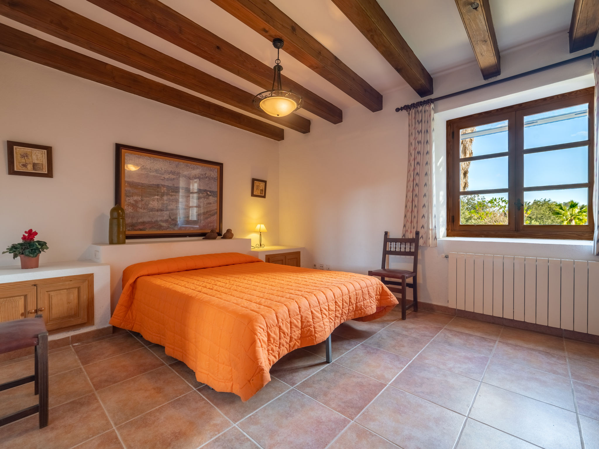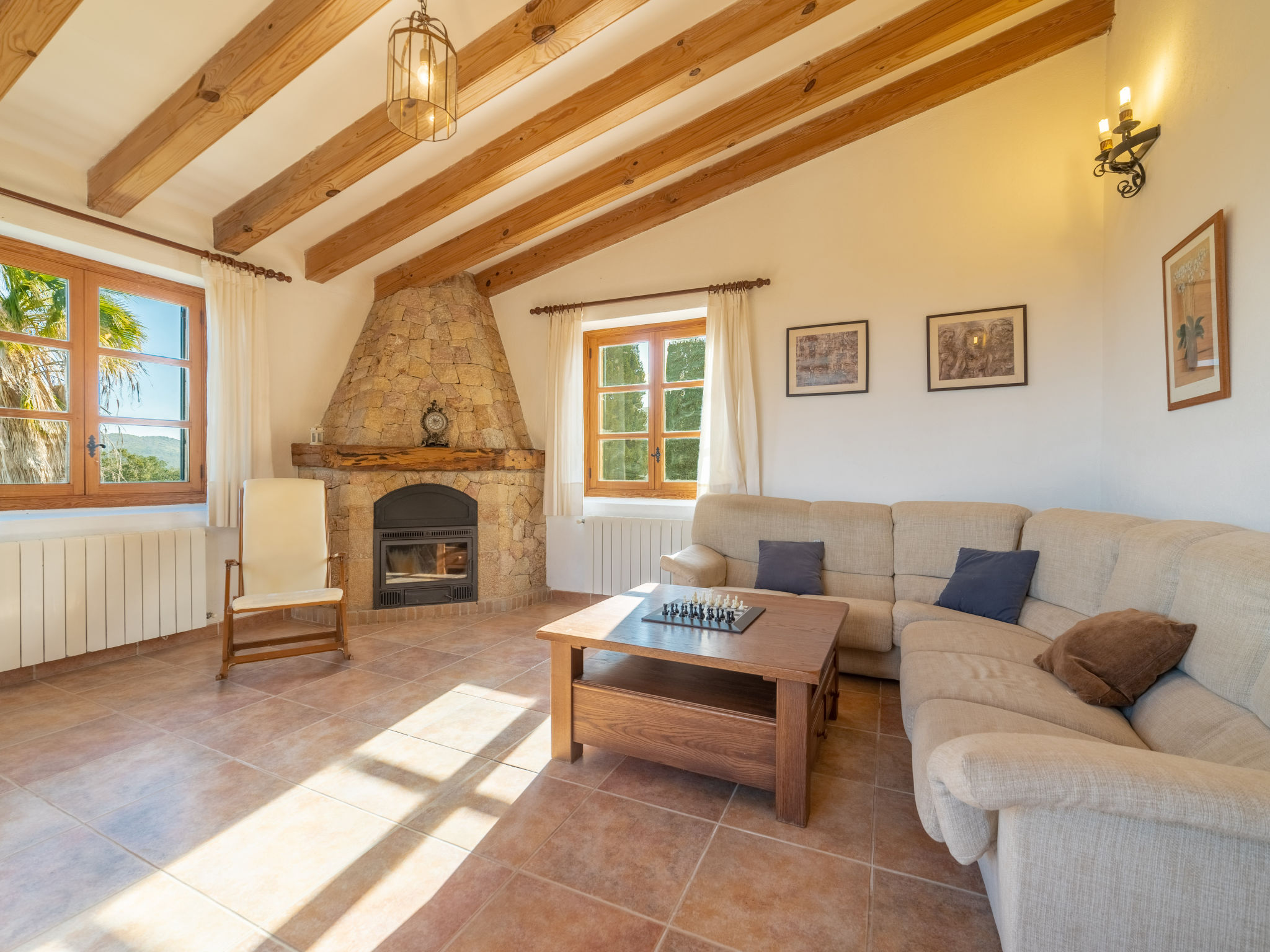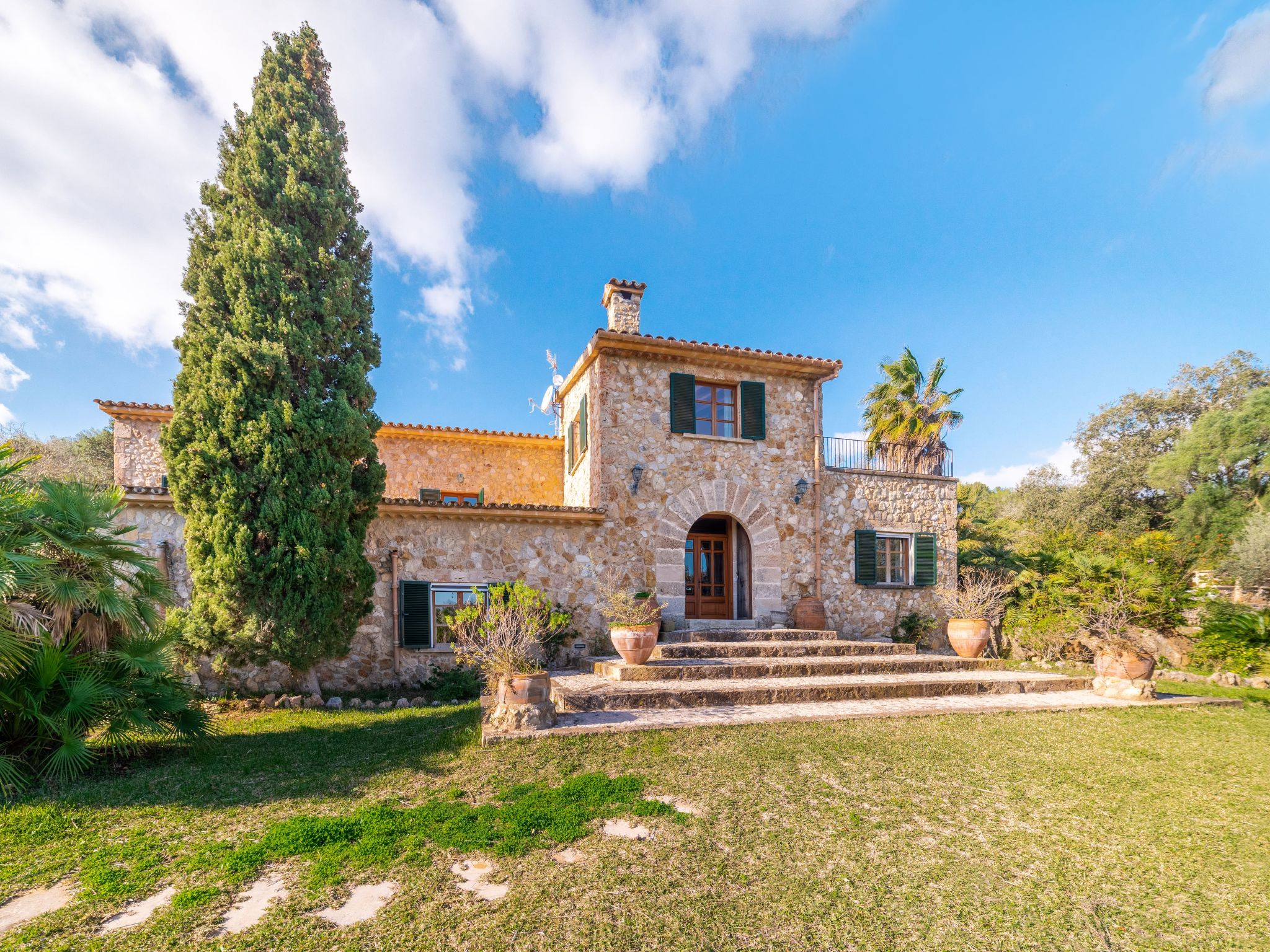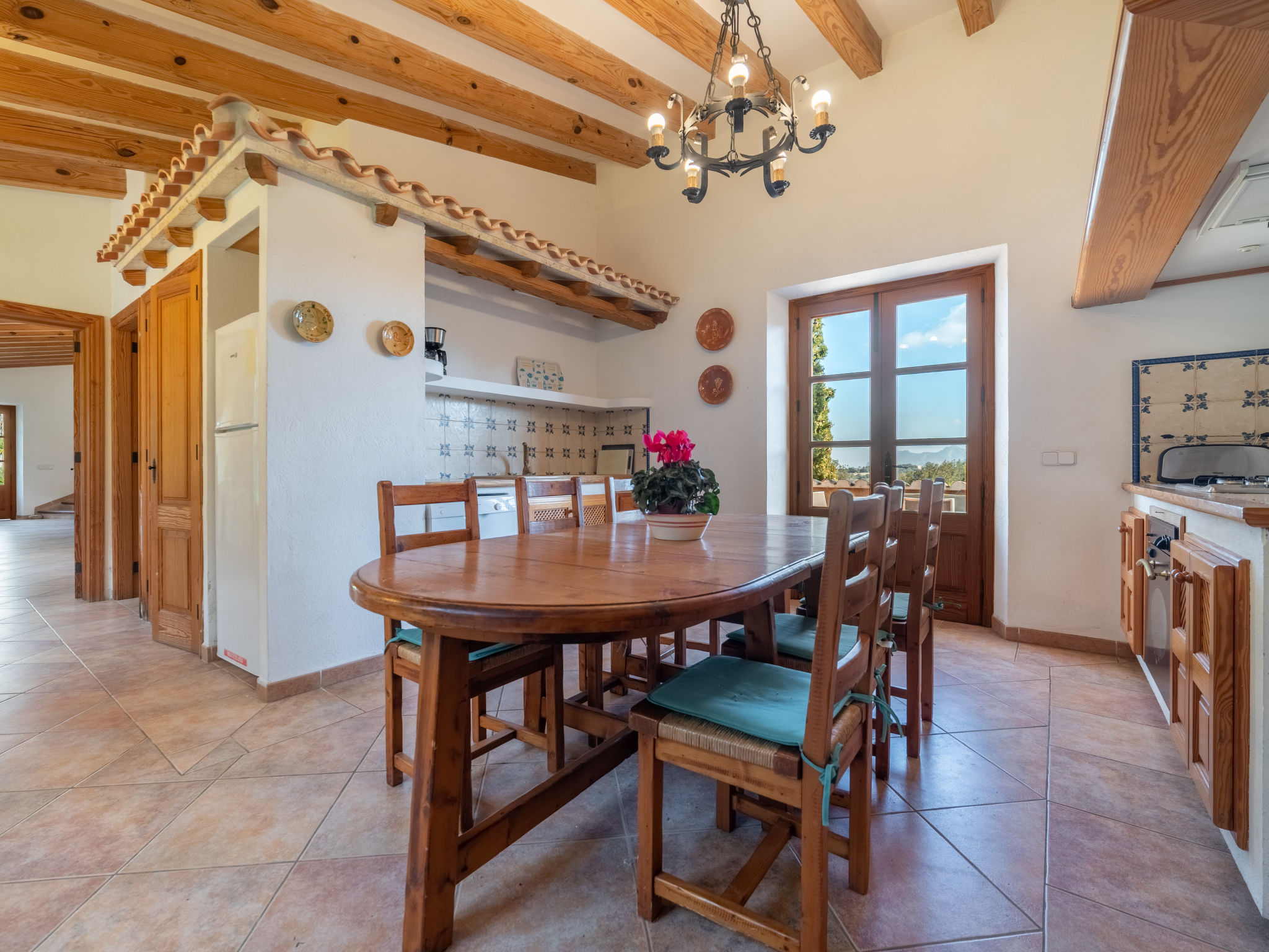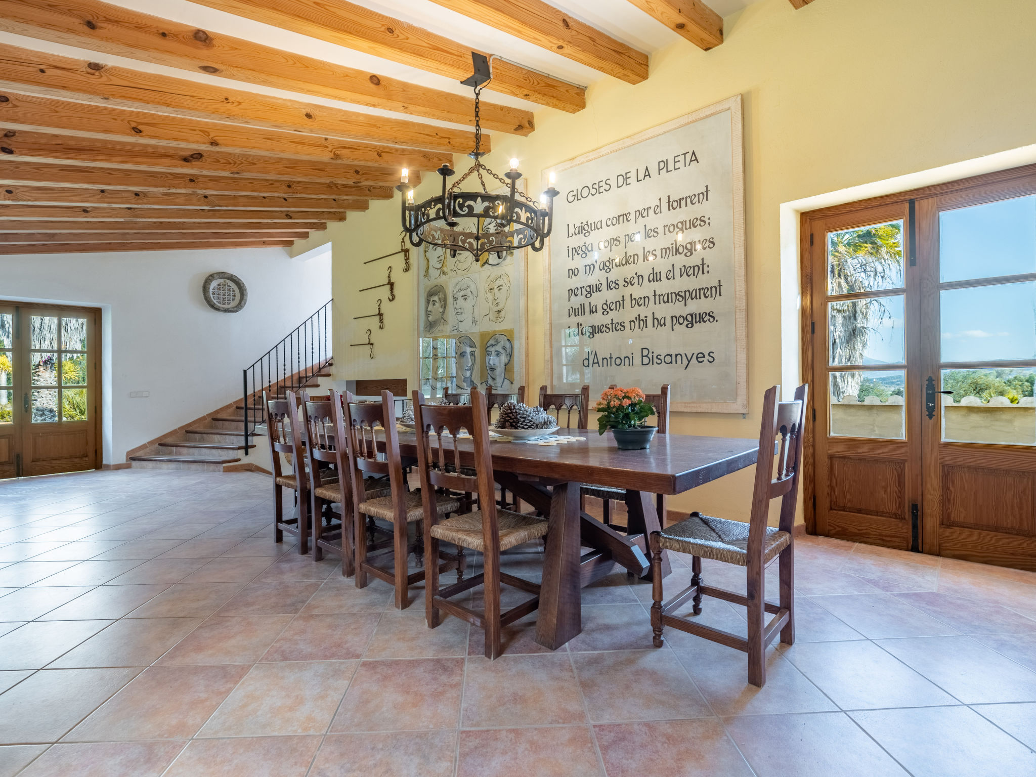 Das attraktive Landhaus, eine Naturstein-Finca, liegt eingebettet in die sanfte Hügellandschaft, umgeben von Steineichenwald, Garriga und Sträuchern, mit freiem Blick bis zur Bucht von Pollença. Pollença 7 km, Alcúdia 6 km. Zu den Stränden zwischen Alcúdia und Puerto Pollença 8 km. Golfplatz Pollença 10 km. Ca. 4000 m² großes, abgeschlossenes Grundstück in leichter Hanglage mit überzeugender gartenarchitektonischer Gestaltung: Oleanderbüsche begrenzen die terrassierten Rasenflächen, die durch kleine Gruppen unterschiedlicher Palmenarten aufgelockert werden. Die Terrasse des Überlaufpools (9 x 5 m, gesamte Saison geöffnet) ist mit einigen Amphoren dekoriert. Eine davon wurde zur Außendusche umgewandelt. Sonnenliegen und Sonnenschirm vorhanden. Aufgrund der leichten Hanglage ist das Haus auf verschiedenen Ebenen angelegt. Zwei Terrassen (insgesamt ca. 90 m², Mobiliar und gemauerte Grillstelle) laden zum Verweilen ein. Parkmöglichkeiten auf dem Grundstück. Ansprechende Einrichtung. Großzügiges Wohnambiente mit teils rustikalen Möbeln und einzelnen Antiquitäten. Holzbalkendecken. Fliesenböden. Sat-TV (deutsche Programme). Internetzugang (WLAN, inklusive). Waschmaschine, Bügeleisen/-brett, Fön. Safe. Öl-Zentralheizung (bis 15.05.), in den Schlafzimmern Ventilator. Hinweis: Rauchen ist im Haus nicht gestattet.