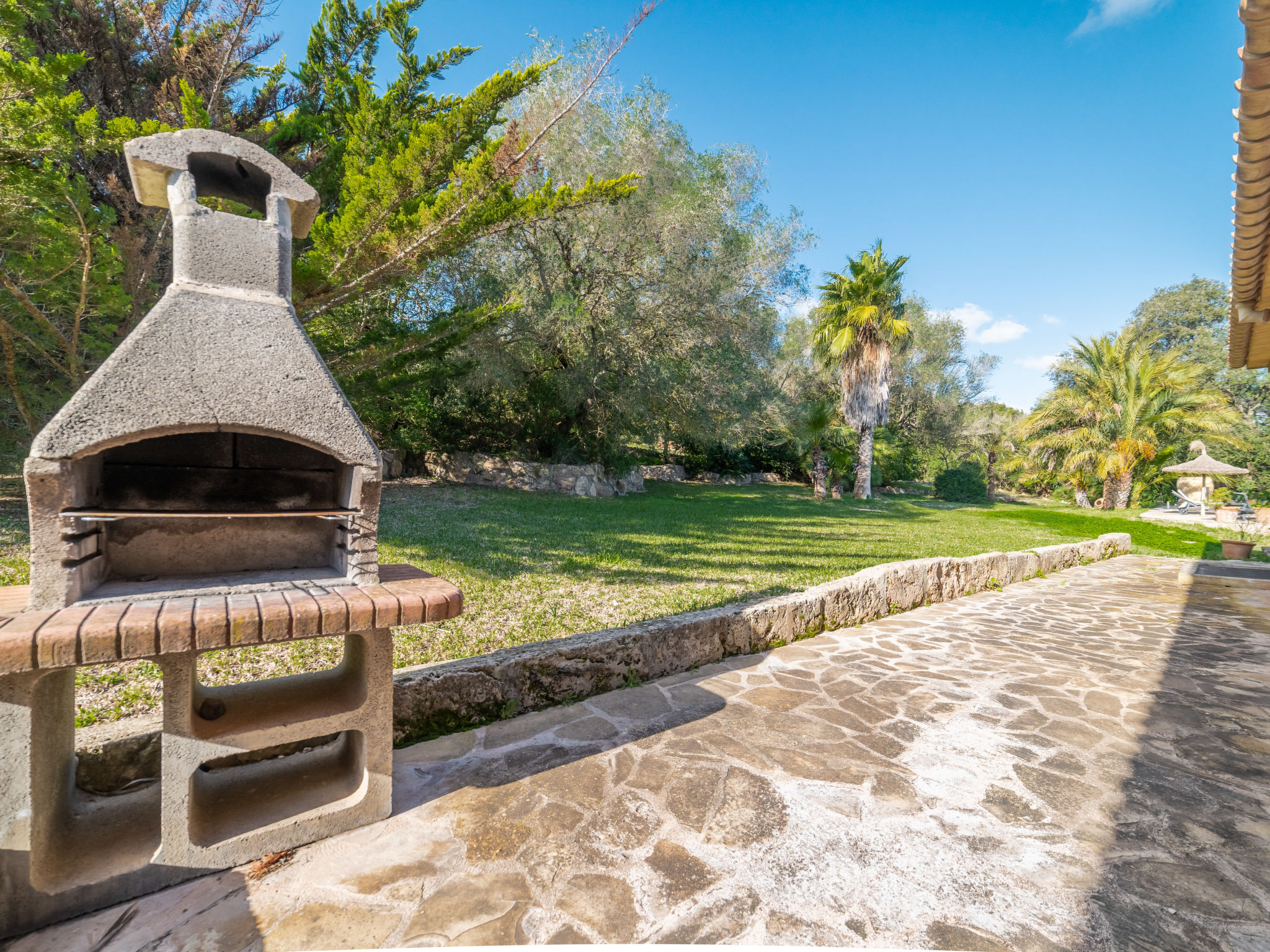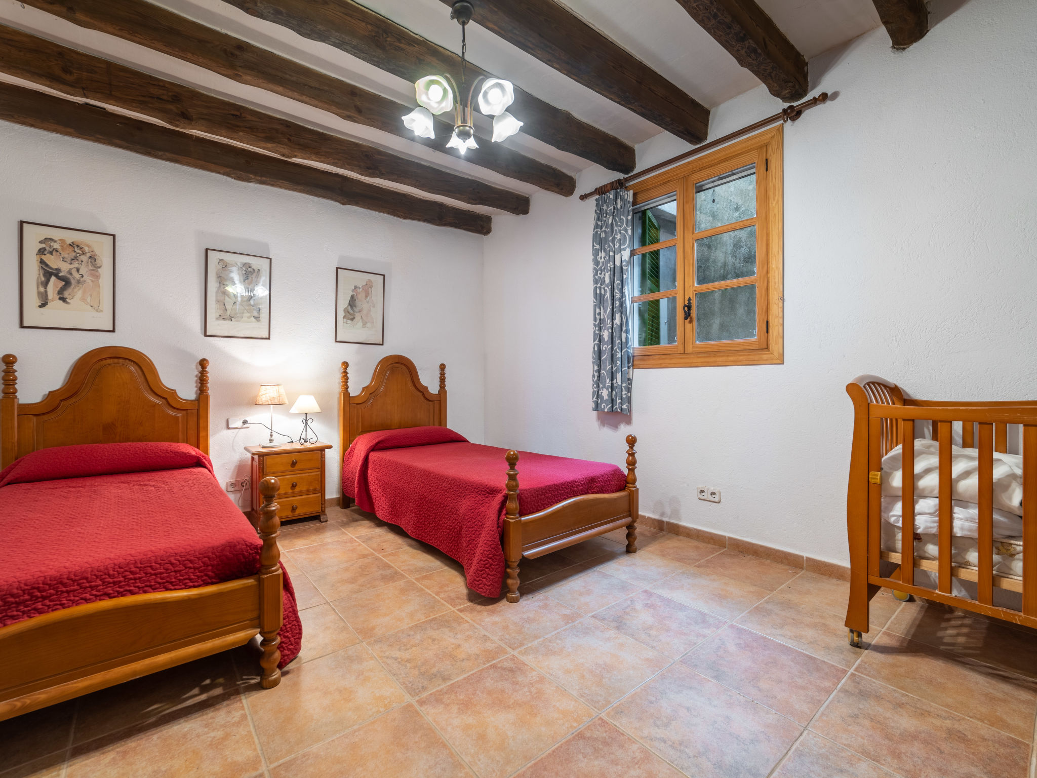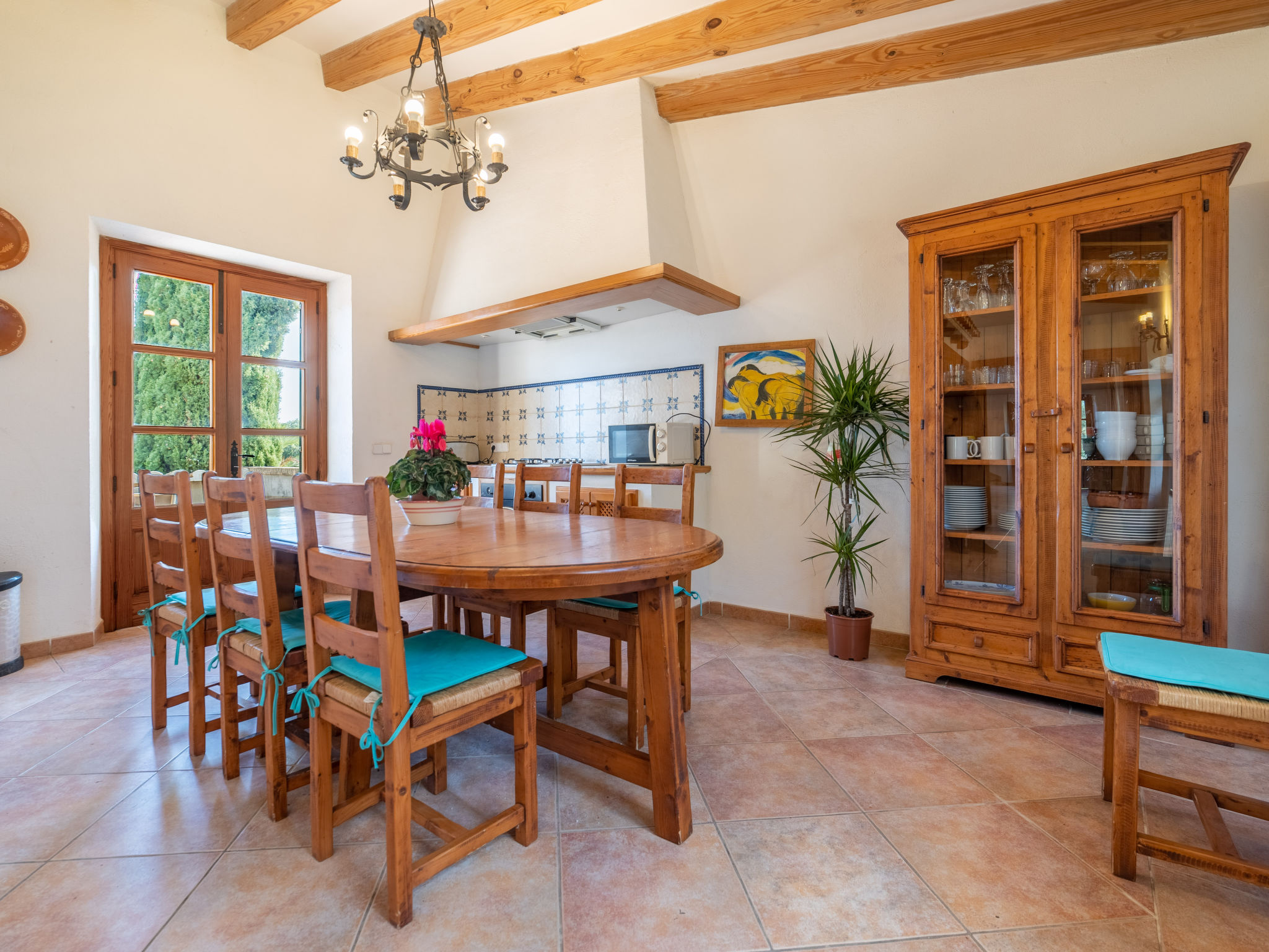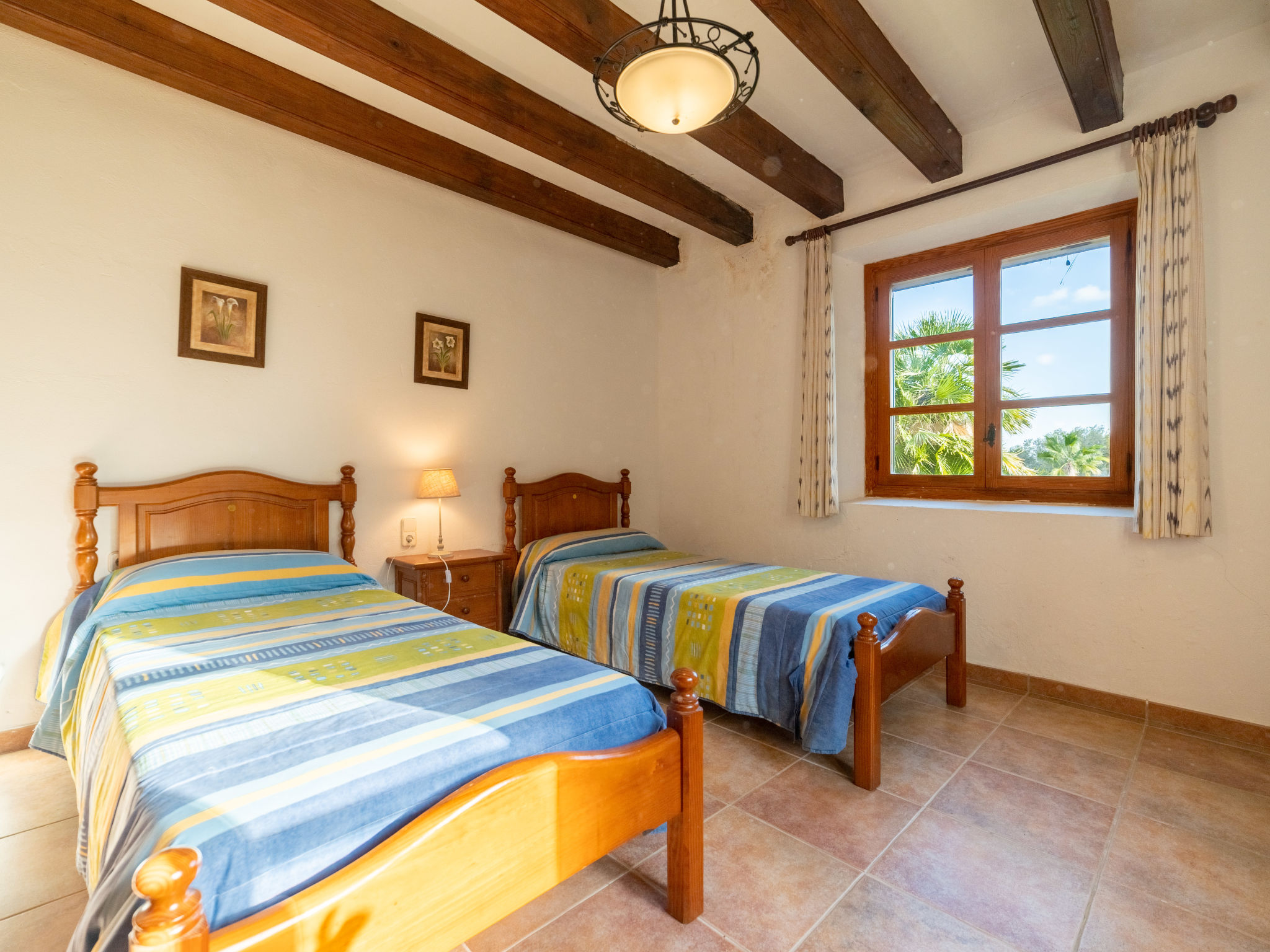 Das attraktive Landhaus, eine Naturstein-Finca, liegt eingebettet in die sanfte Hügellandschaft, umgeben von Steineichenwald, Garriga und Sträuchern, mit freiem Blick bis zur Bucht von Pollença. Pollença 7 km, Alcúdia 6 km. Zu den Stränden zwischen Alcúdia und Puerto Pollença 8 km. Golfplatz Pollença 10 km. Ca. 4000 m² großes, abgeschlossenes Grundstück in leichter Hanglage mit überzeugender gartenarchitektonischer Gestaltung: Oleanderbüsche begrenzen die terrassierten Rasenflächen, die durch kleine Gruppen unterschiedlicher Palmenarten aufgelockert werden. Die Terrasse des Überlaufpools (9 x 5 m, gesamte Saison geöffnet) ist mit einigen Amphoren dekoriert. Eine davon wurde zur Außendusche umgewandelt. Sonnenliegen und Sonnenschirm vorhanden. Aufgrund der leichten Hanglage ist das Haus auf verschiedenen Ebenen angelegt. Zwei Terrassen (insgesamt ca. 90 m², Mobiliar und gemauerte Grillstelle) laden zum Verweilen ein. Parkmöglichkeiten auf dem Grundstück. Ansprechende Einrichtung. Großzügiges Wohnambiente mit teils rustikalen Möbeln und einzelnen Antiquitäten. Holzbalkendecken. Fliesenböden. Sat-TV (deutsche Programme). Internetzugang (WLAN, inklusive). Waschmaschine, Bügeleisen/-brett, Fön. Safe. Öl-Zentralheizung (bis 15.05.), in den Schlafzimmern Ventilator. Hinweis: Rauchen ist im Haus nicht gestattet.