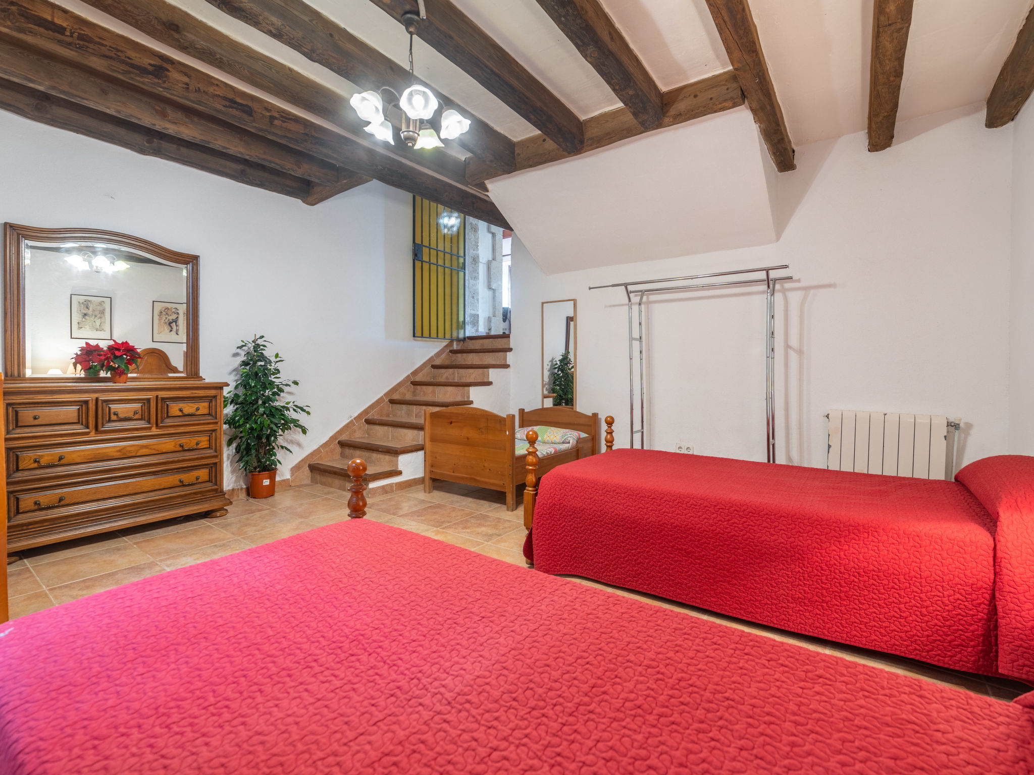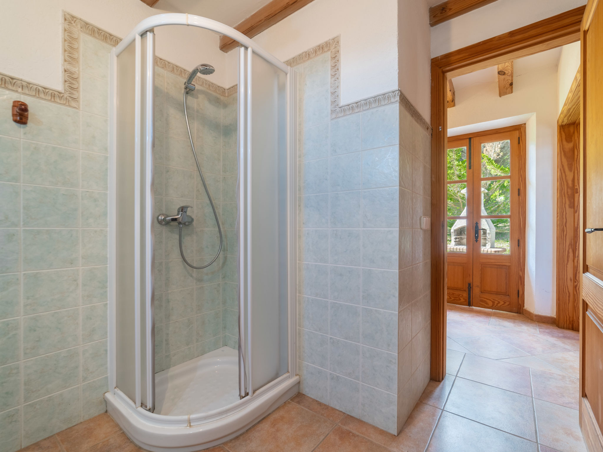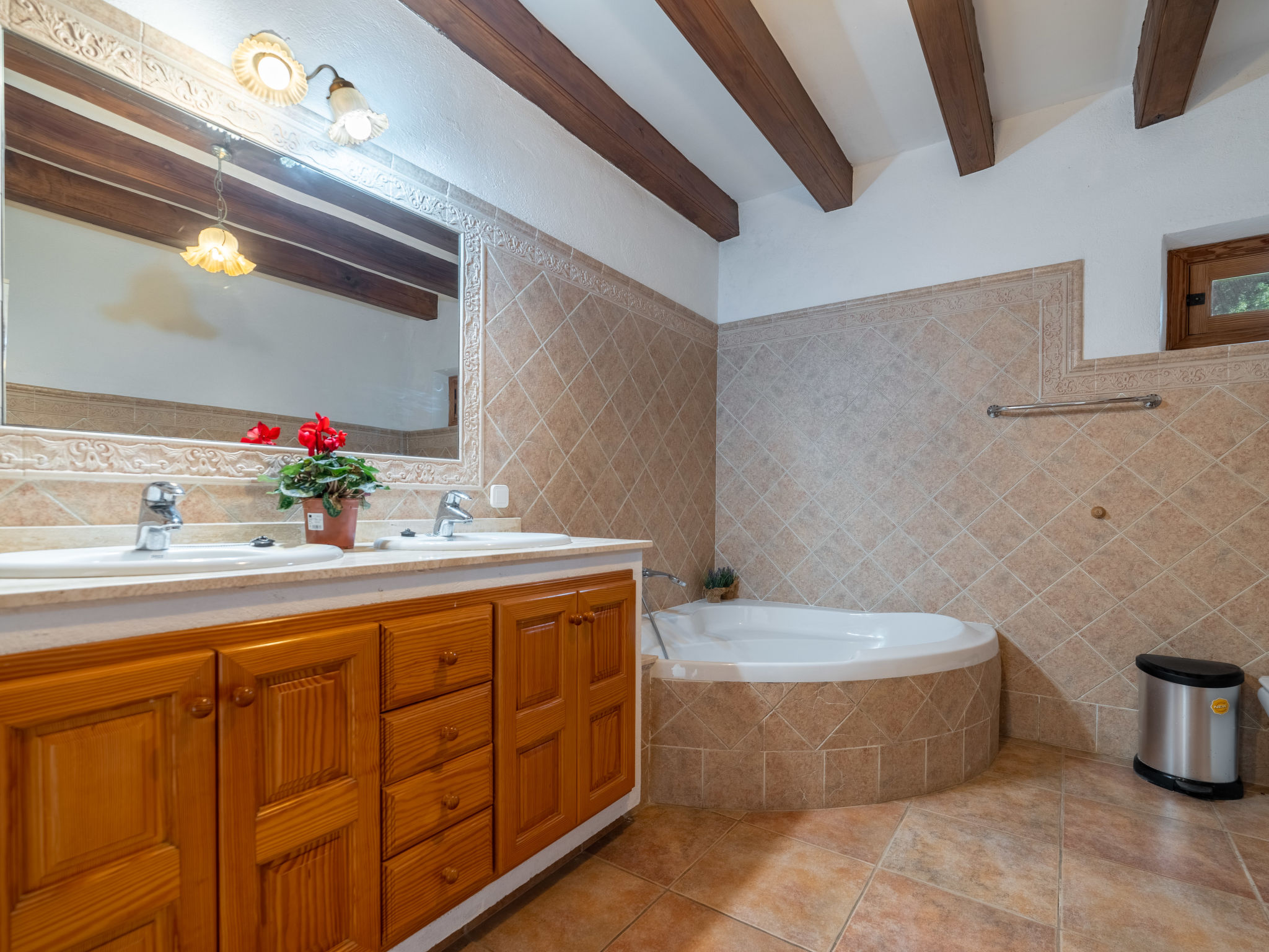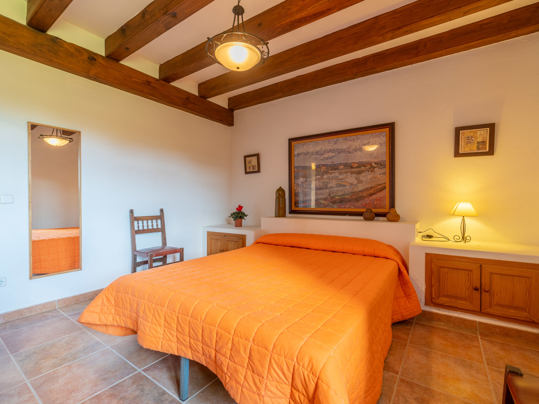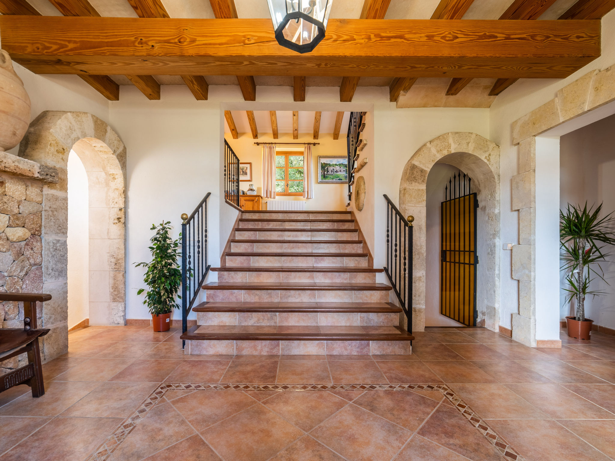 Das attraktive Landhaus, eine Naturstein-Finca, liegt eingebettet in die sanfte Hügellandschaft, umgeben von Steineichenwald, Garriga und Sträuchern, mit freiem Blick bis zur Bucht von Pollença. Pollença 7 km, Alcúdia 6 km. Zu den Stränden zwischen Alcúdia und Puerto Pollença 8 km. Golfplatz Pollença 10 km. Ca. 4000 m² großes, abgeschlossenes Grundstück in leichter Hanglage mit überzeugender gartenarchitektonischer Gestaltung: Oleanderbüsche begrenzen die terrassierten Rasenflächen, die durch kleine Gruppen unterschiedlicher Palmenarten aufgelockert werden. Die Terrasse des Überlaufpools (9 x 5 m, gesamte Saison geöffnet) ist mit einigen Amphoren dekoriert. Eine davon wurde zur Außendusche umgewandelt. Sonnenliegen und Sonnenschirm vorhanden. Aufgrund der leichten Hanglage ist das Haus auf verschiedenen Ebenen angelegt. Zwei Terrassen (insgesamt ca. 90 m², Mobiliar und gemauerte Grillstelle) laden zum Verweilen ein. Parkmöglichkeiten auf dem Grundstück. Ansprechende Einrichtung. Großzügiges Wohnambiente mit teils rustikalen Möbeln und einzelnen Antiquitäten. Holzbalkendecken. Fliesenböden. Sat-TV (deutsche Programme). Internetzugang (WLAN, inklusive). Waschmaschine, Bügeleisen/-brett, Fön. Safe. Öl-Zentralheizung (bis 15.05.), in den Schlafzimmern Ventilator. Hinweis: Rauchen ist im Haus nicht gestattet.