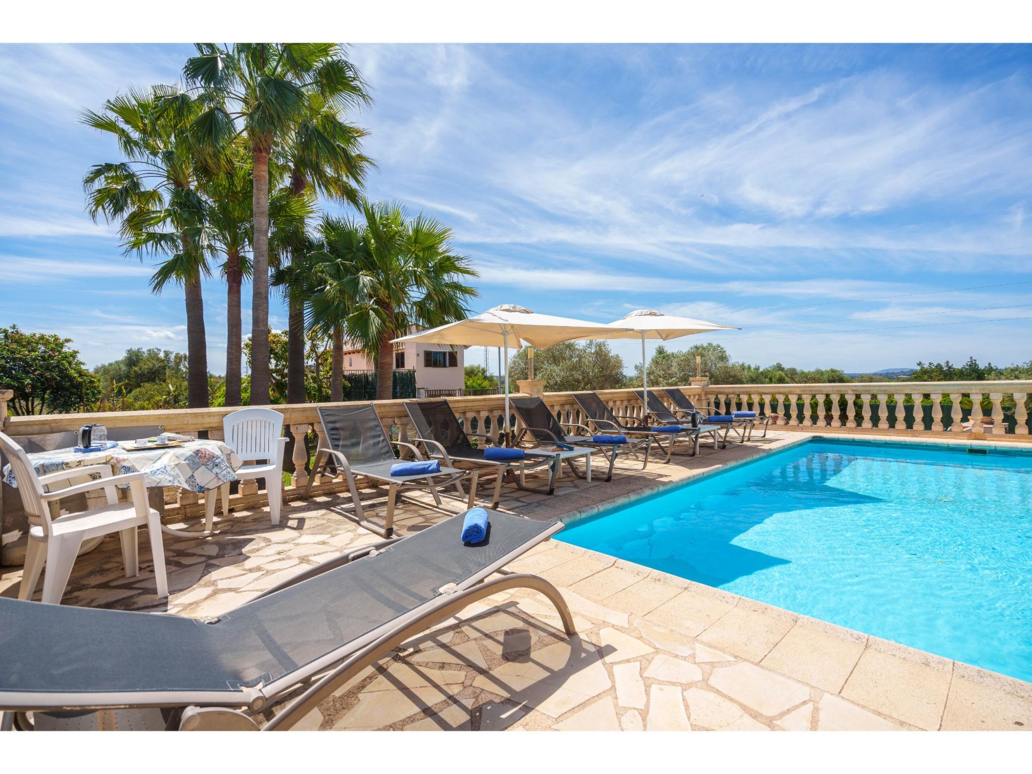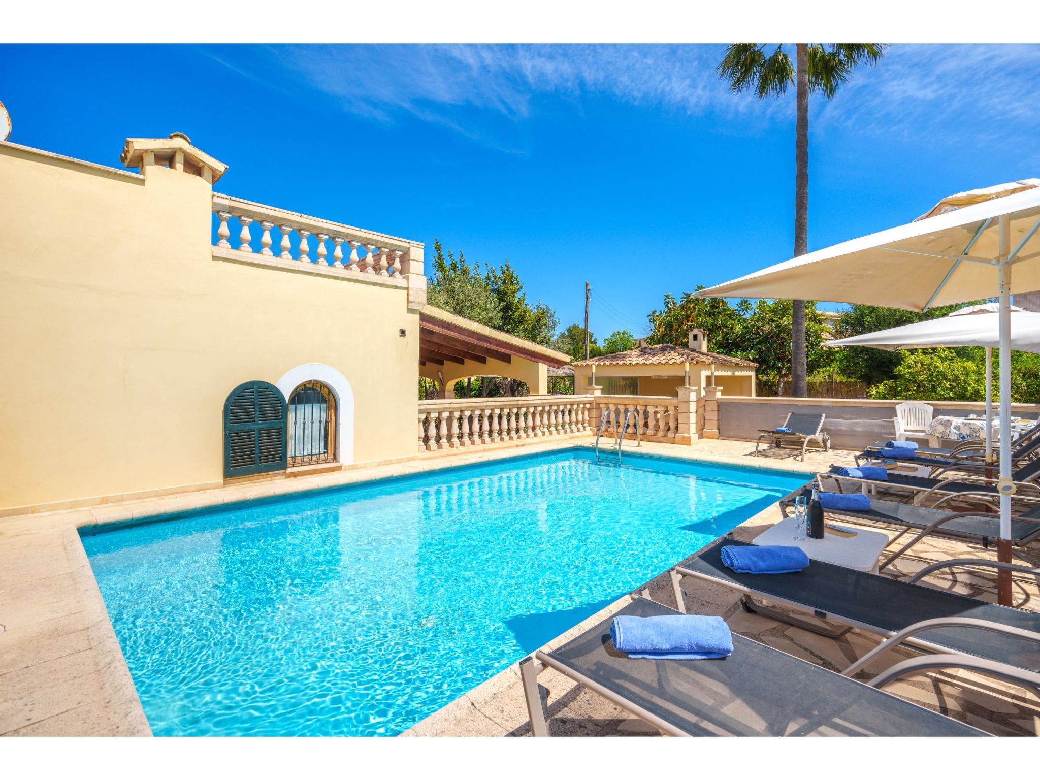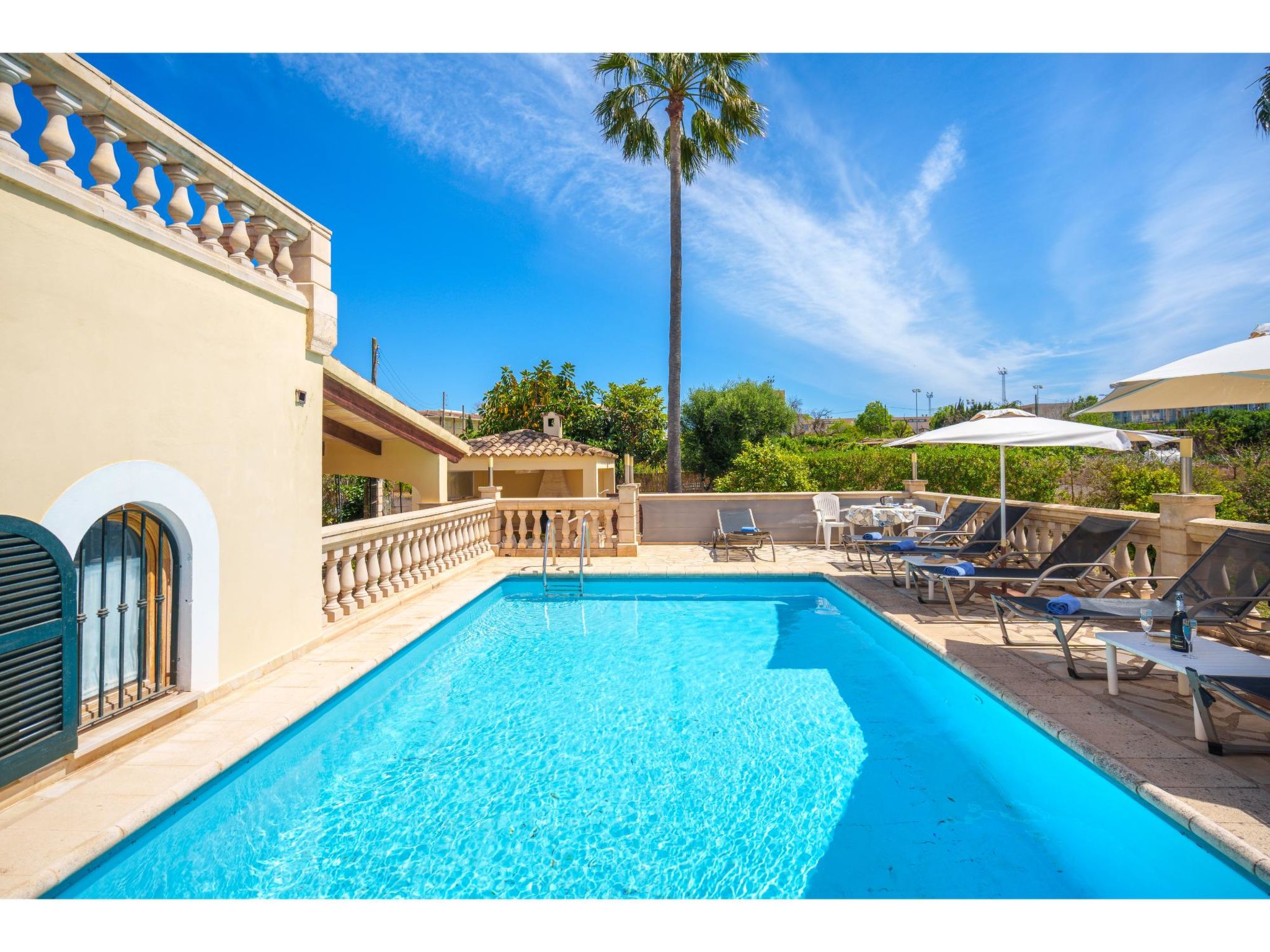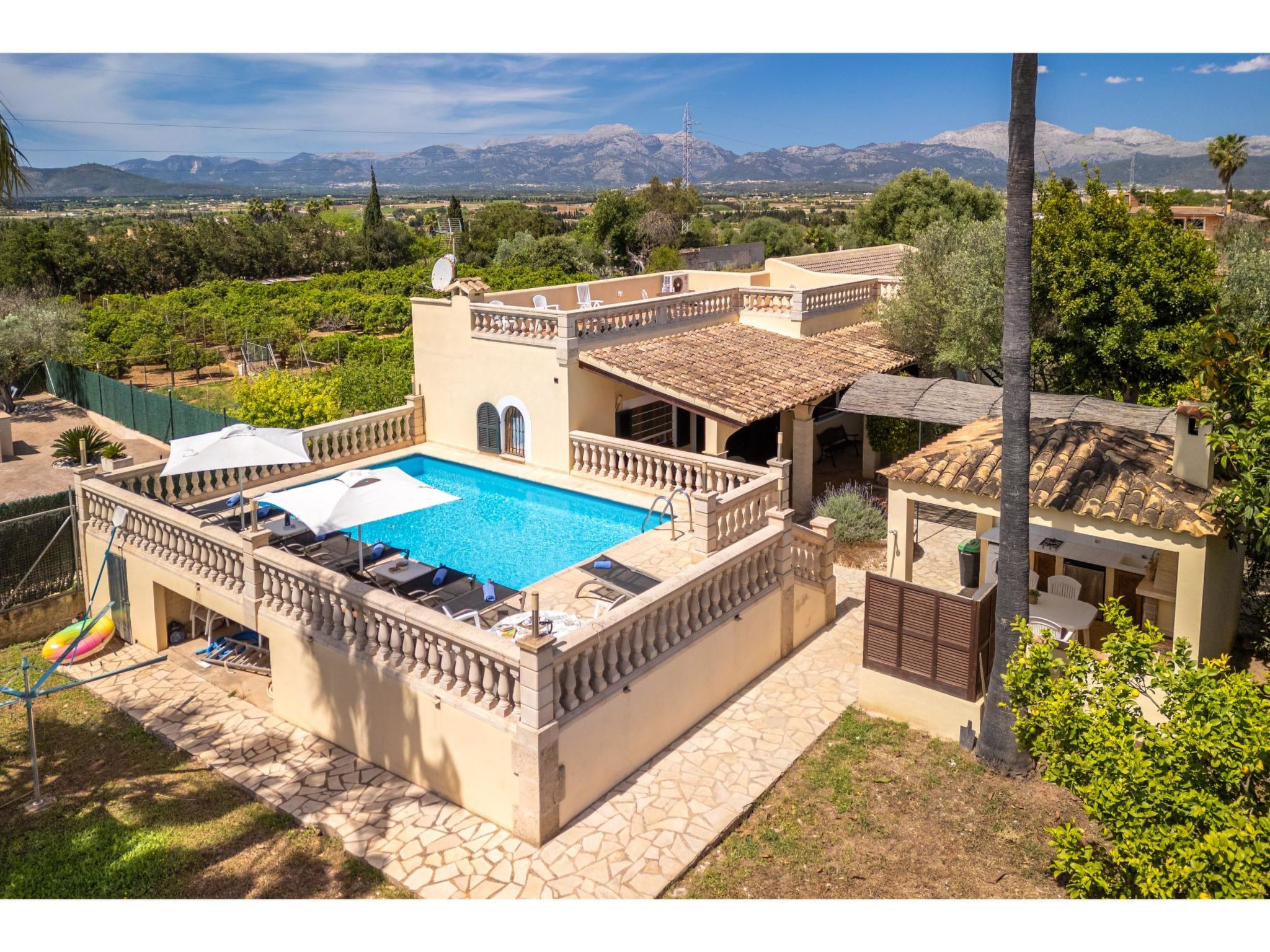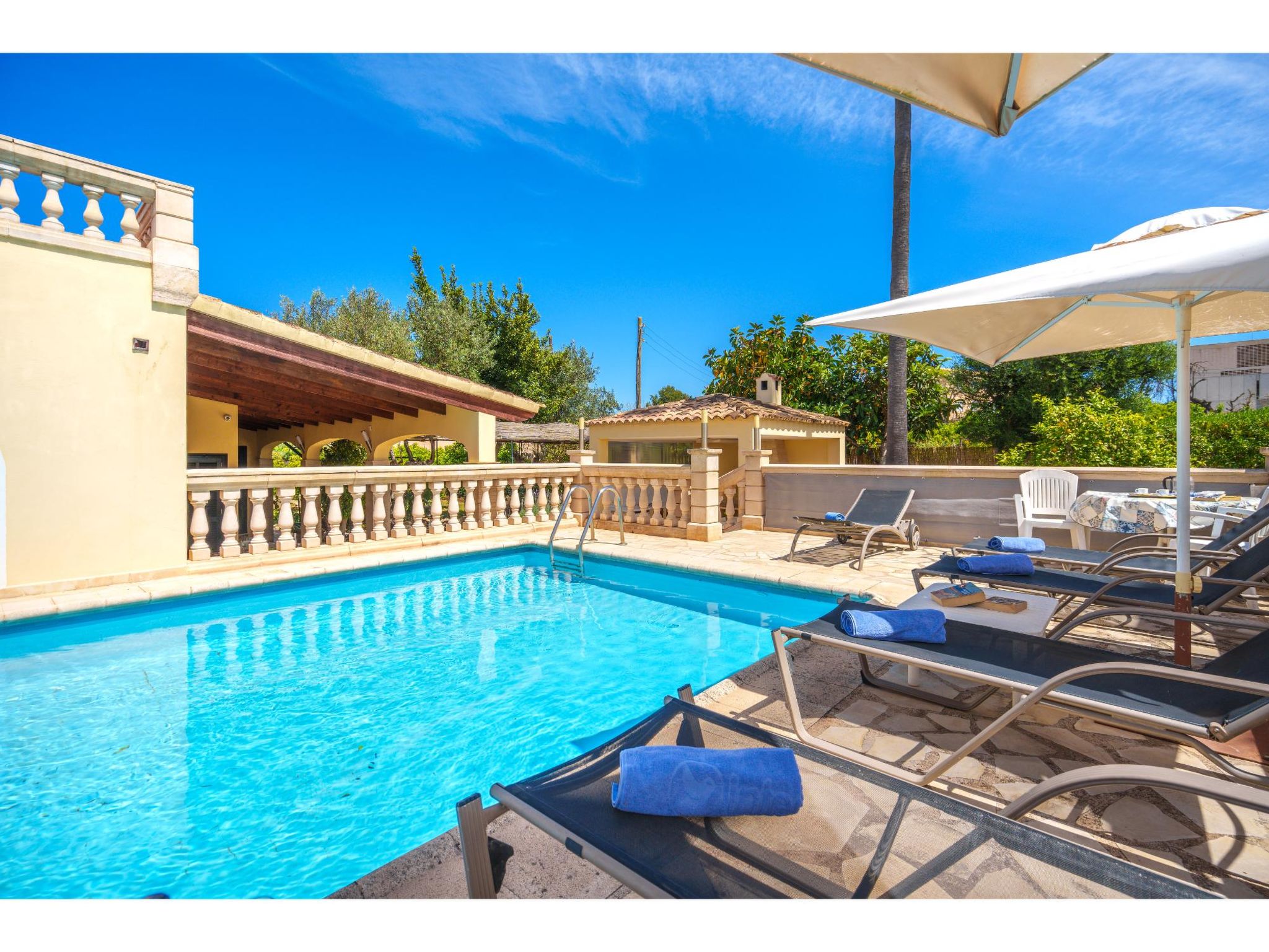 Das sympathische, gepflegte Haus steht am westlichen Ortsrand von Muro, ca. 900 m von der Ortsmitte entfernt. Zum Sandstrand 'Playa de Muro' 10 km. Durch einen schönen rebenüberrankten Eingang gelangt man auf das ca. 1800 m² große, geschlossene Grundstück, auf dem der Besitzer und Hobbygärtner viele Bananenstauden und Orangenbäume angepflanzt hat. Leicht erhöht liegt der Pool (7 x 4 m, gesamte Saison geöffnet) mit Außendusche, Sonnenterrasse und Liegen. Von hier herrliche Sicht auf die Bergkette der Sierra Tramuntana. Gleich daneben Sommerküche (2 Flammen, Kühlschrank, Wasseranschluss), gemauerte Grillstelle und überdachter Essplatz. Am Haus überdachte Terrasse (Mobiliar), zusätzlich Dachterrasse. Parkmöglichkeit an der Straße. Das Haus ist geschmackvoll in warmen Farbtönen eingerichtet. Fliesenböden. Sat-TV (deutsche Programme), DVD, Radio/CD. Internetzugang (WLAN, inklusive). Waschmaschine, Bügeleisen/-brett, 3x Fön. Klimaanlage mit Kühl-/Heizfunktion. Hinweis: Rauchen ist im Haus nicht gestattet.