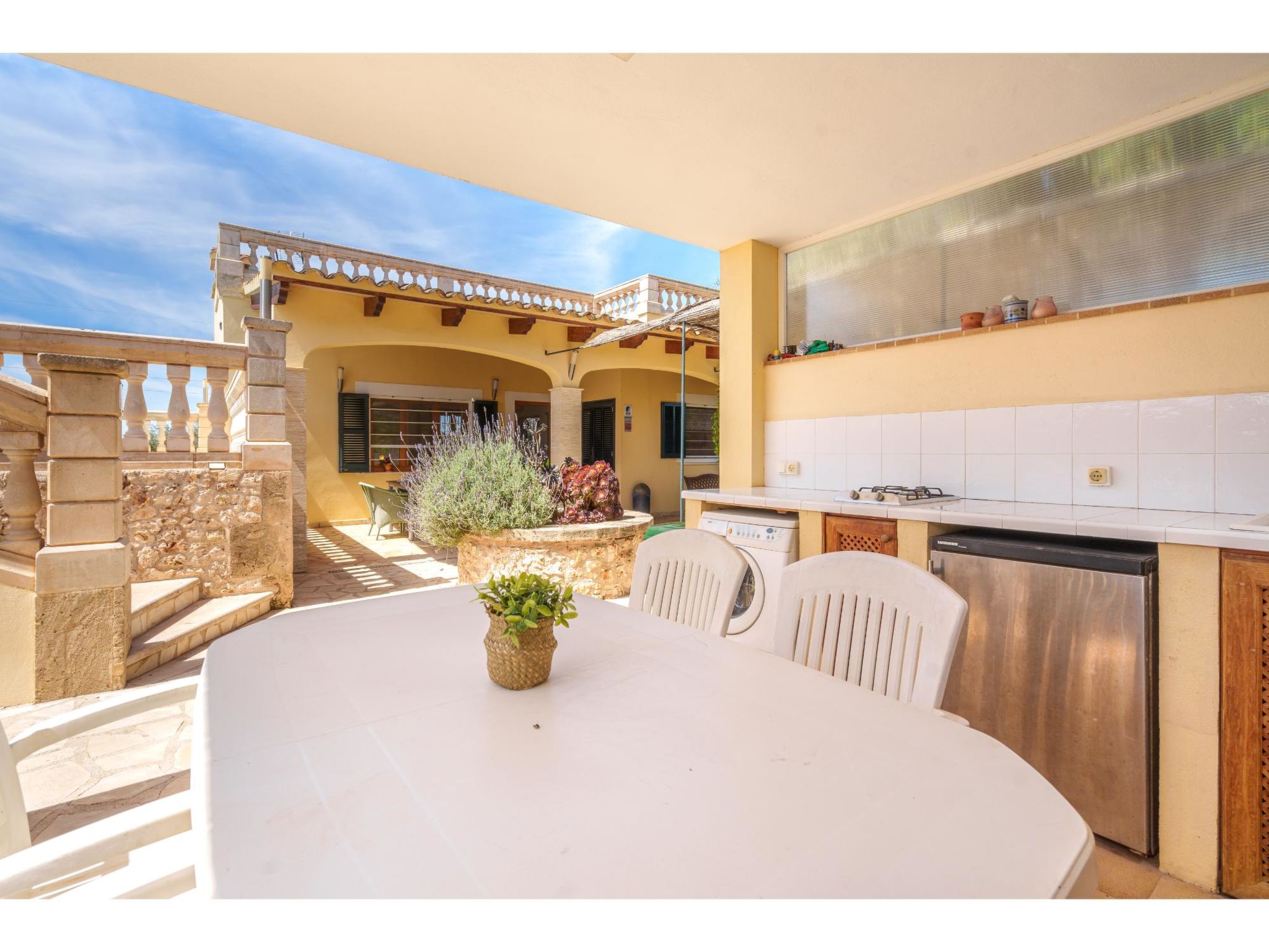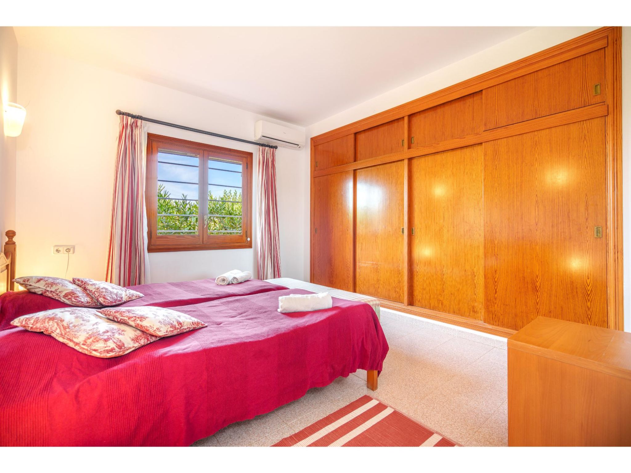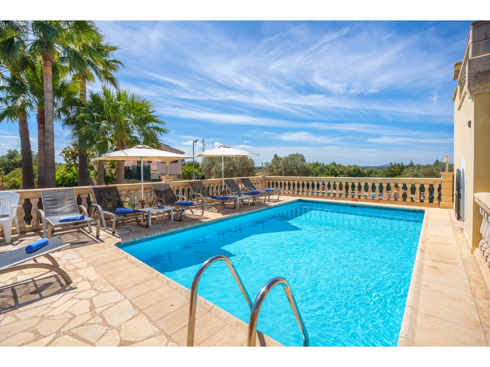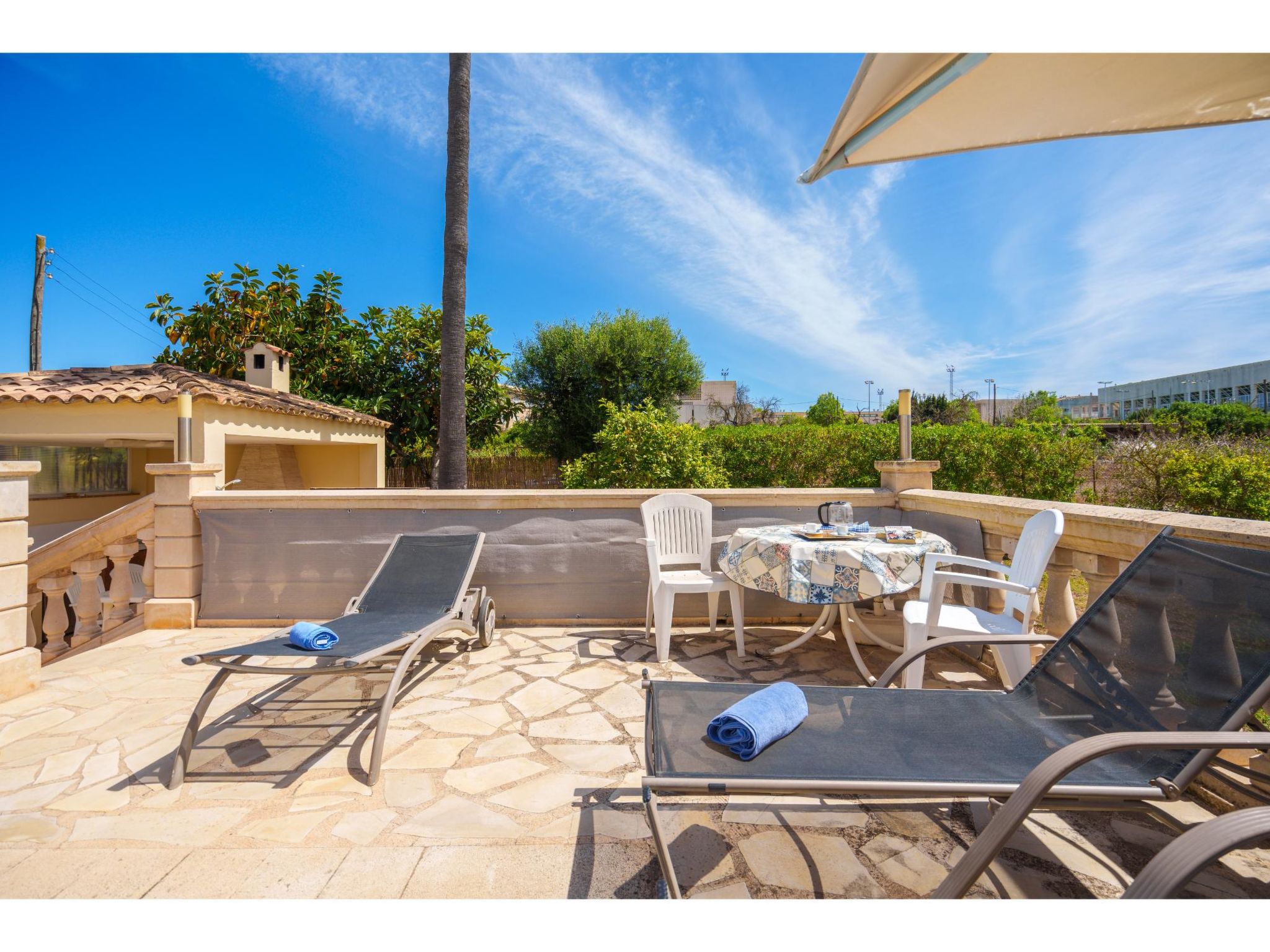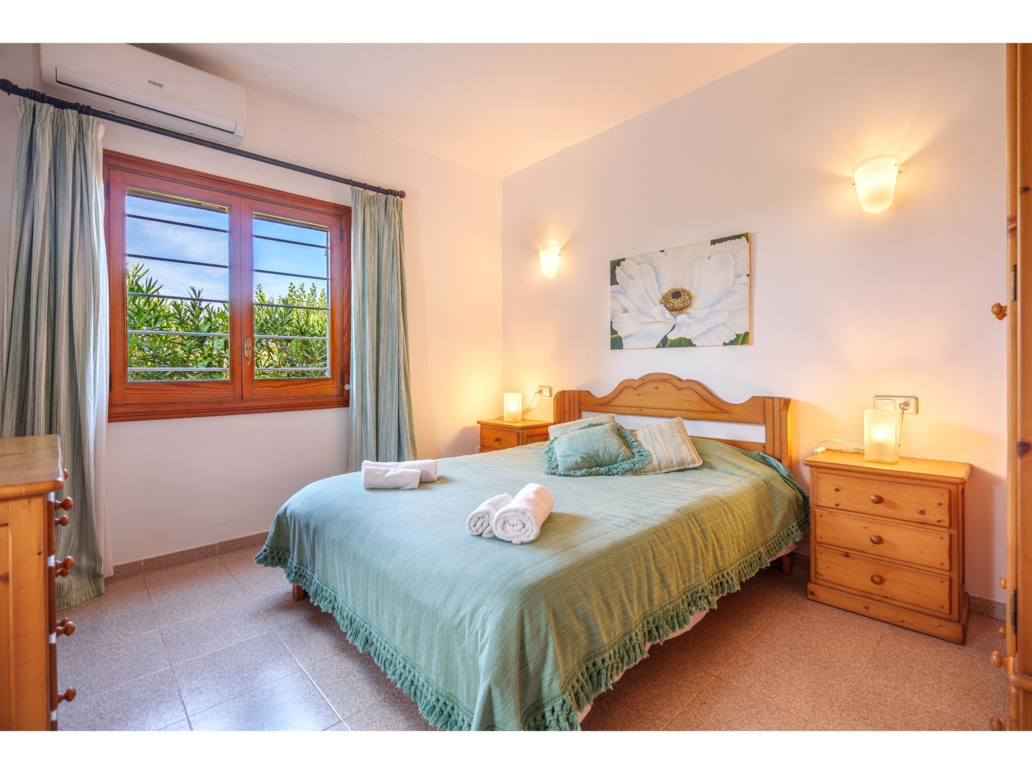 Das sympathische, gepflegte Haus steht am westlichen Ortsrand von Muro, ca. 900 m von der Ortsmitte entfernt. Zum Sandstrand 'Playa de Muro' 10 km. Durch einen schönen rebenüberrankten Eingang gelangt man auf das ca. 1800 m² große, geschlossene Grundstück, auf dem der Besitzer und Hobbygärtner viele Bananenstauden und Orangenbäume angepflanzt hat. Leicht erhöht liegt der Pool (7 x 4 m, gesamte Saison geöffnet) mit Außendusche, Sonnenterrasse und Liegen. Von hier herrliche Sicht auf die Bergkette der Sierra Tramuntana. Gleich daneben Sommerküche (2 Flammen, Kühlschrank, Wasseranschluss), gemauerte Grillstelle und überdachter Essplatz. Am Haus überdachte Terrasse (Mobiliar), zusätzlich Dachterrasse. Parkmöglichkeit an der Straße. Das Haus ist geschmackvoll in warmen Farbtönen eingerichtet. Fliesenböden. Sat-TV (deutsche Programme), DVD, Radio/CD. Internetzugang (WLAN, inklusive). Waschmaschine, Bügeleisen/-brett, 3x Fön. Klimaanlage mit Kühl-/Heizfunktion. Hinweis: Rauchen ist im Haus nicht gestattet.
