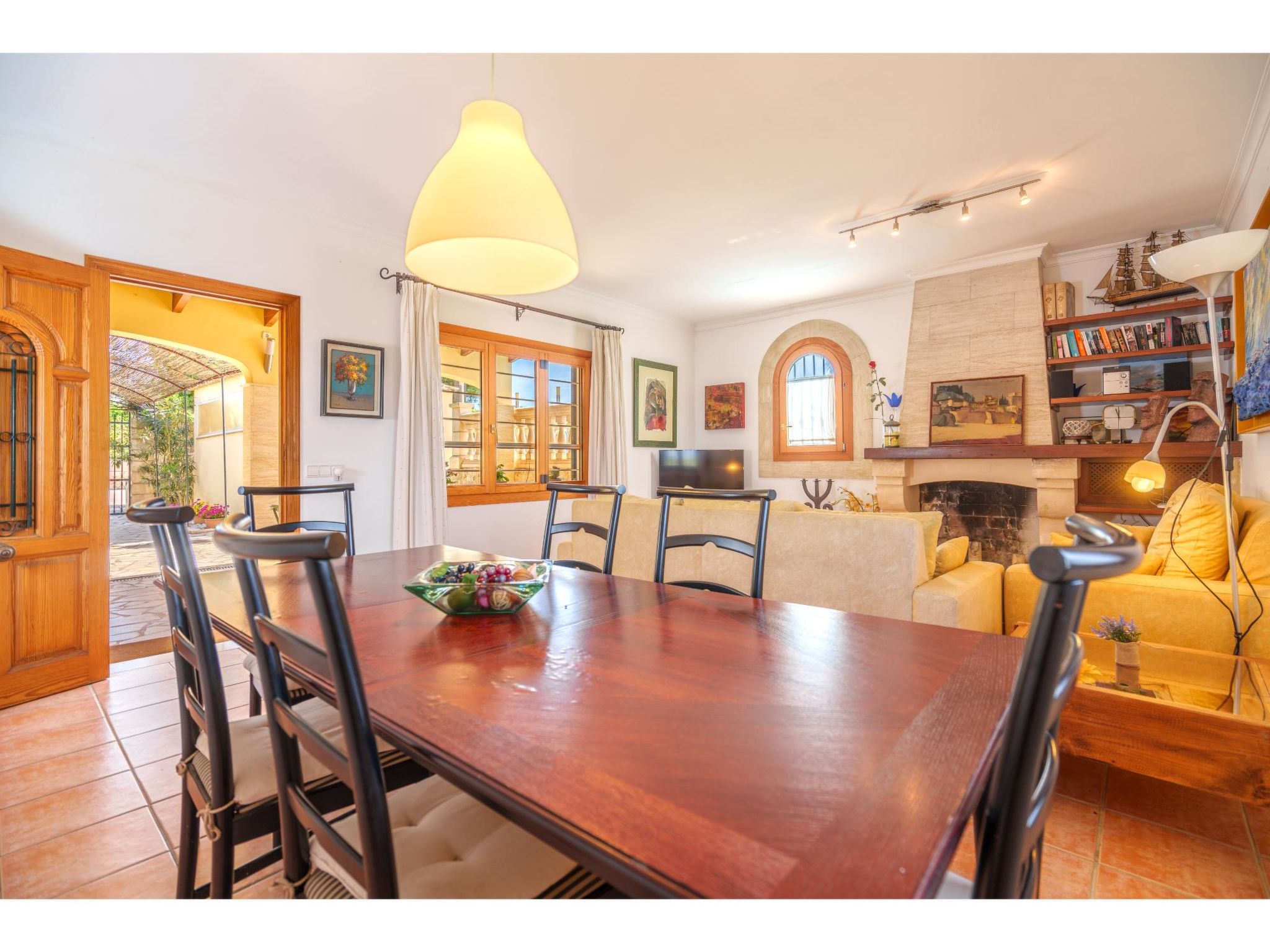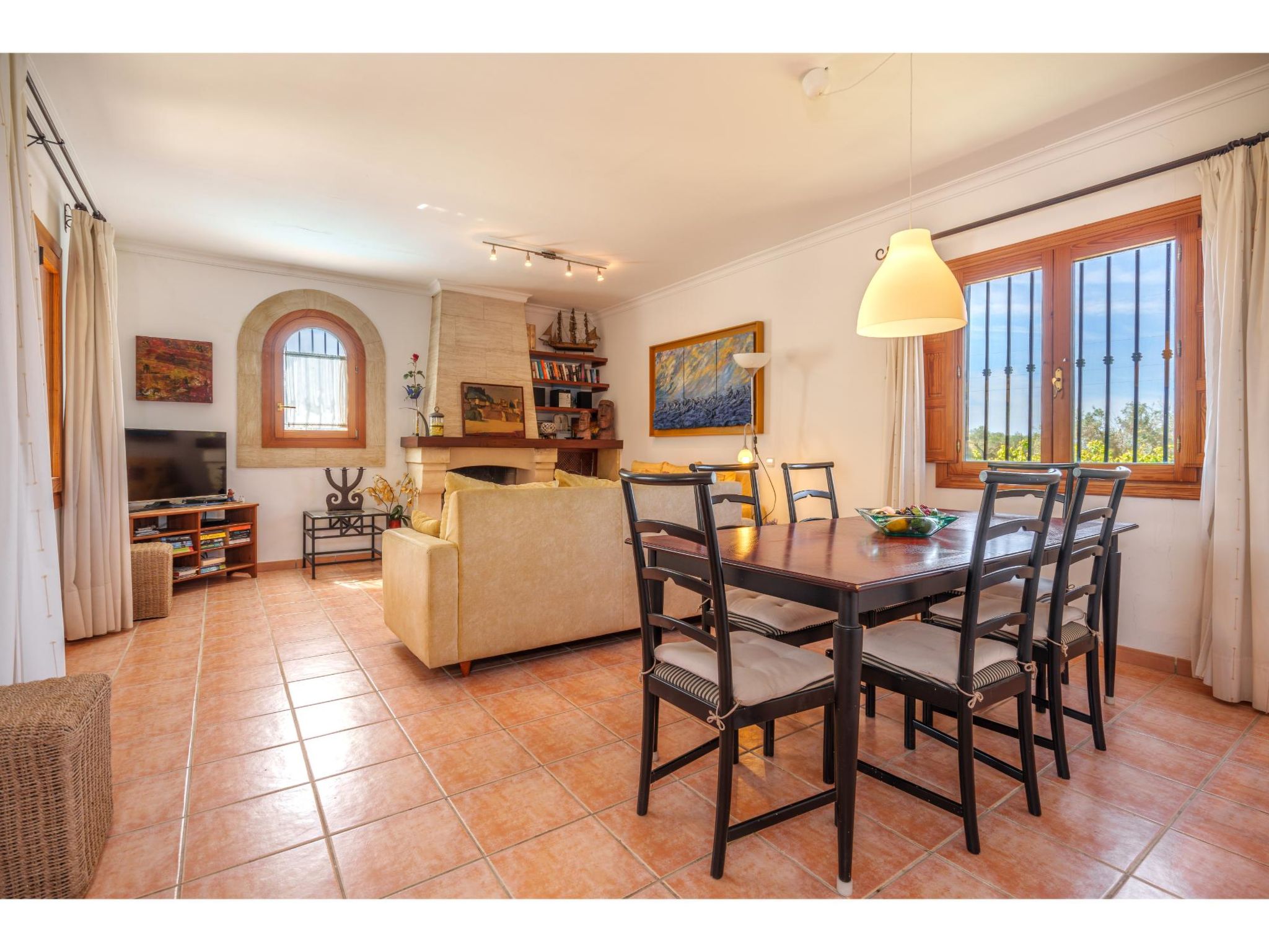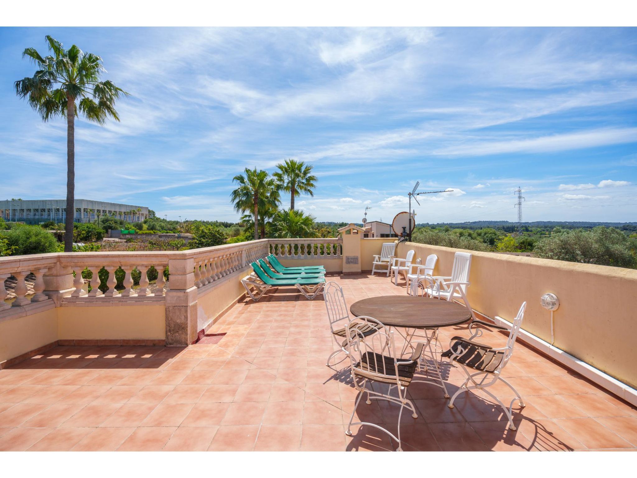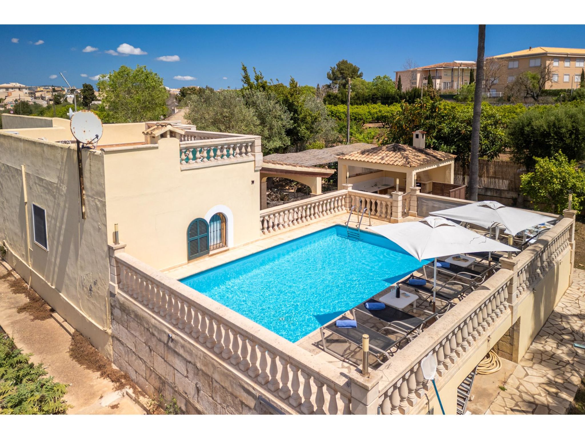 Das sympathische, gepflegte Haus steht am westlichen Ortsrand von Muro, ca. 900 m von der Ortsmitte entfernt. Zum Sandstrand 'Playa de Muro' 10 km. Durch einen schönen rebenüberrankten Eingang gelangt man auf das ca. 1800 m² große, geschlossene Grundstück, auf dem der Besitzer und Hobbygärtner viele Bananenstauden und Orangenbäume angepflanzt hat. Leicht erhöht liegt der Pool (7 x 4 m, gesamte Saison geöffnet) mit Außendusche, Sonnenterrasse und Liegen. Von hier herrliche Sicht auf die Bergkette der Sierra Tramuntana. Gleich daneben Sommerküche (2 Flammen, Kühlschrank, Wasseranschluss), gemauerte Grillstelle und überdachter Essplatz. Am Haus überdachte Terrasse (Mobiliar), zusätzlich Dachterrasse. Parkmöglichkeit an der Straße. Das Haus ist geschmackvoll in warmen Farbtönen eingerichtet. Fliesenböden. Sat-TV (deutsche Programme), DVD, Radio/CD. Internetzugang (WLAN, inklusive). Waschmaschine, Bügeleisen/-brett, 3x Fön. Klimaanlage mit Kühl-/Heizfunktion. Hinweis: Rauchen ist im Haus nicht gestattet.