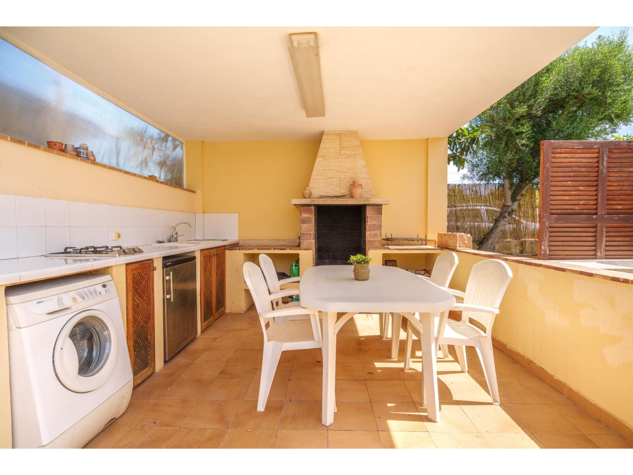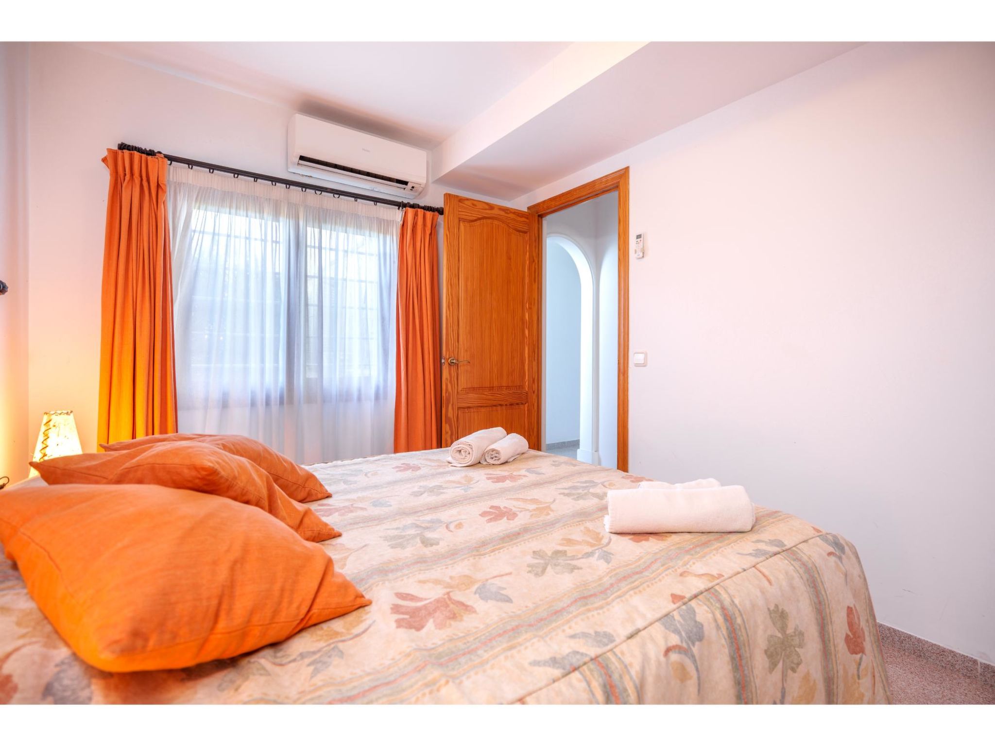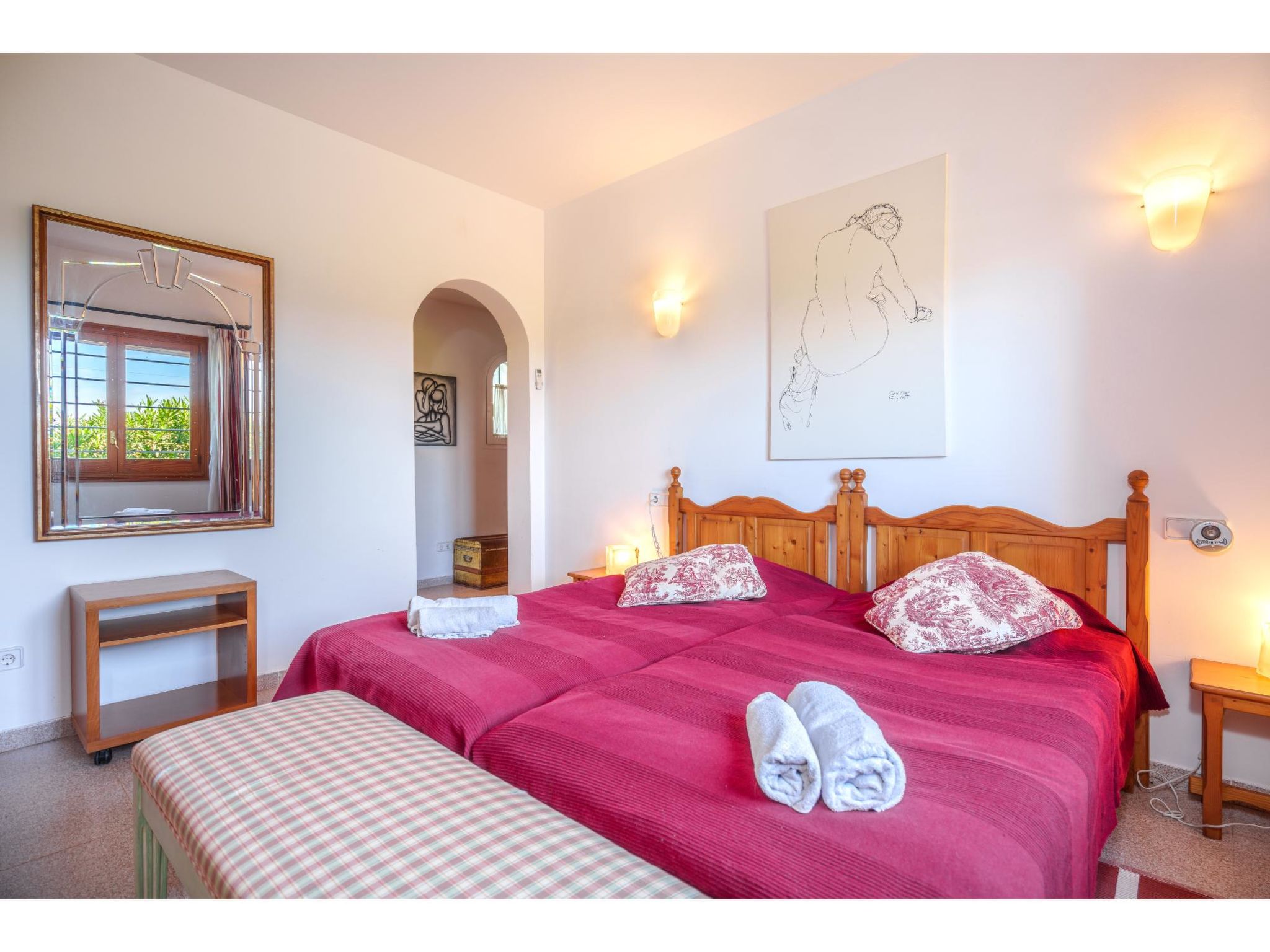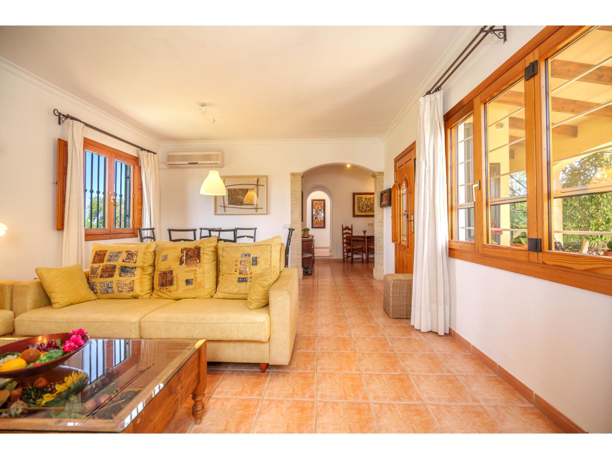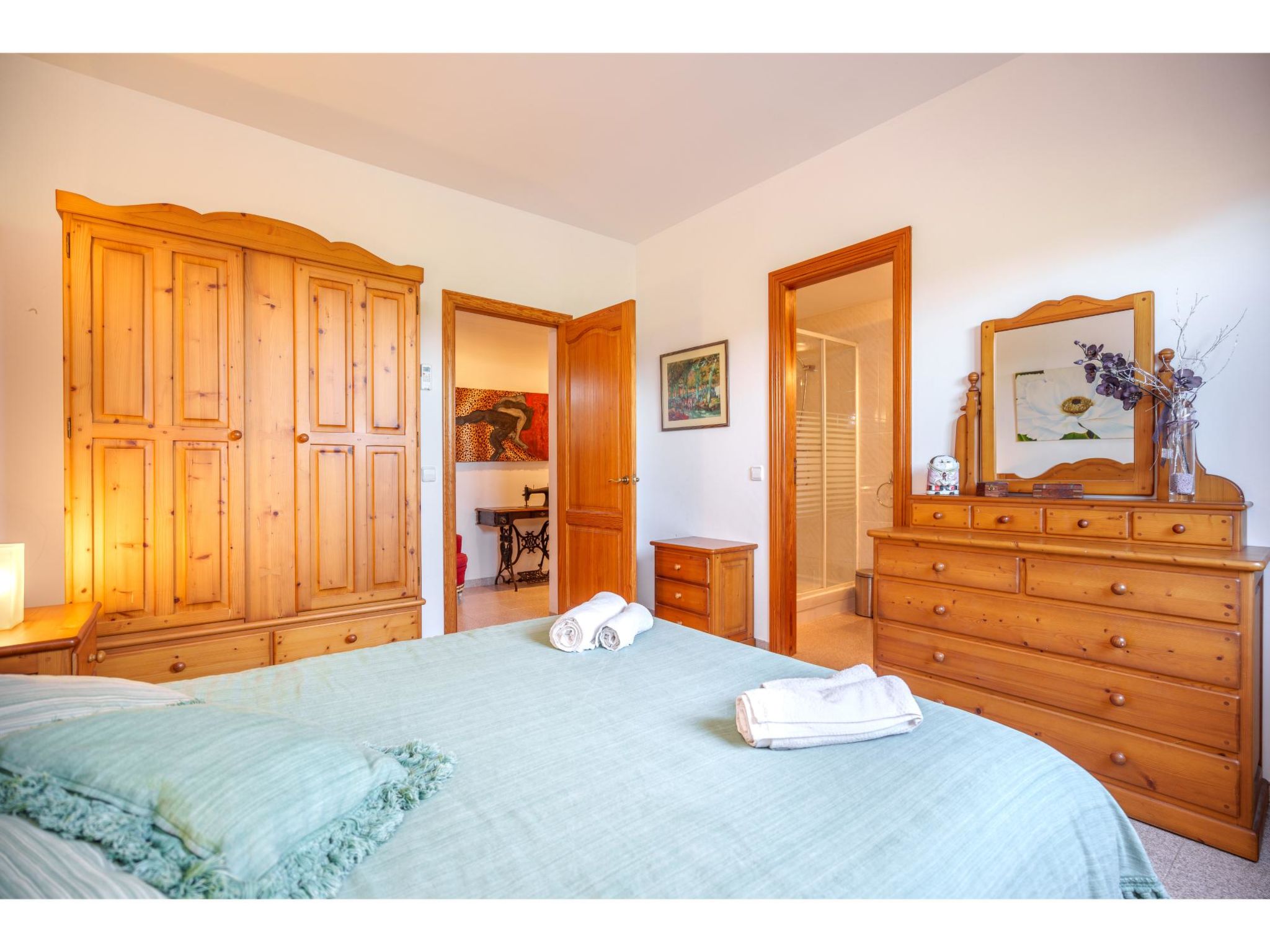 Das sympathische, gepflegte Haus steht am westlichen Ortsrand von Muro, ca. 900 m von der Ortsmitte entfernt. Zum Sandstrand 'Playa de Muro' 10 km. Durch einen schönen rebenüberrankten Eingang gelangt man auf das ca. 1800 m² große, geschlossene Grundstück, auf dem der Besitzer und Hobbygärtner viele Bananenstauden und Orangenbäume angepflanzt hat. Leicht erhöht liegt der Pool (7 x 4 m, gesamte Saison geöffnet) mit Außendusche, Sonnenterrasse und Liegen. Von hier herrliche Sicht auf die Bergkette der Sierra Tramuntana. Gleich daneben Sommerküche (2 Flammen, Kühlschrank, Wasseranschluss), gemauerte Grillstelle und überdachter Essplatz. Am Haus überdachte Terrasse (Mobiliar), zusätzlich Dachterrasse. Parkmöglichkeit an der Straße. Das Haus ist geschmackvoll in warmen Farbtönen eingerichtet. Fliesenböden. Sat-TV (deutsche Programme), DVD, Radio/CD. Internetzugang (WLAN, inklusive). Waschmaschine, Bügeleisen/-brett, 3x Fön. Klimaanlage mit Kühl-/Heizfunktion. Hinweis: Rauchen ist im Haus nicht gestattet.