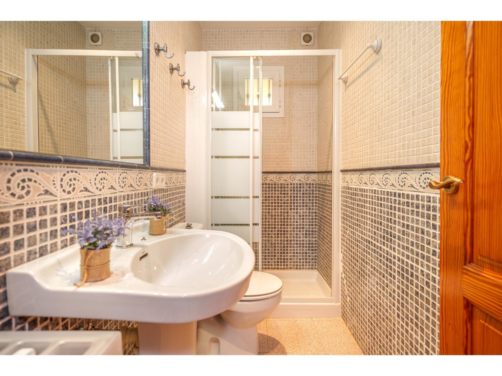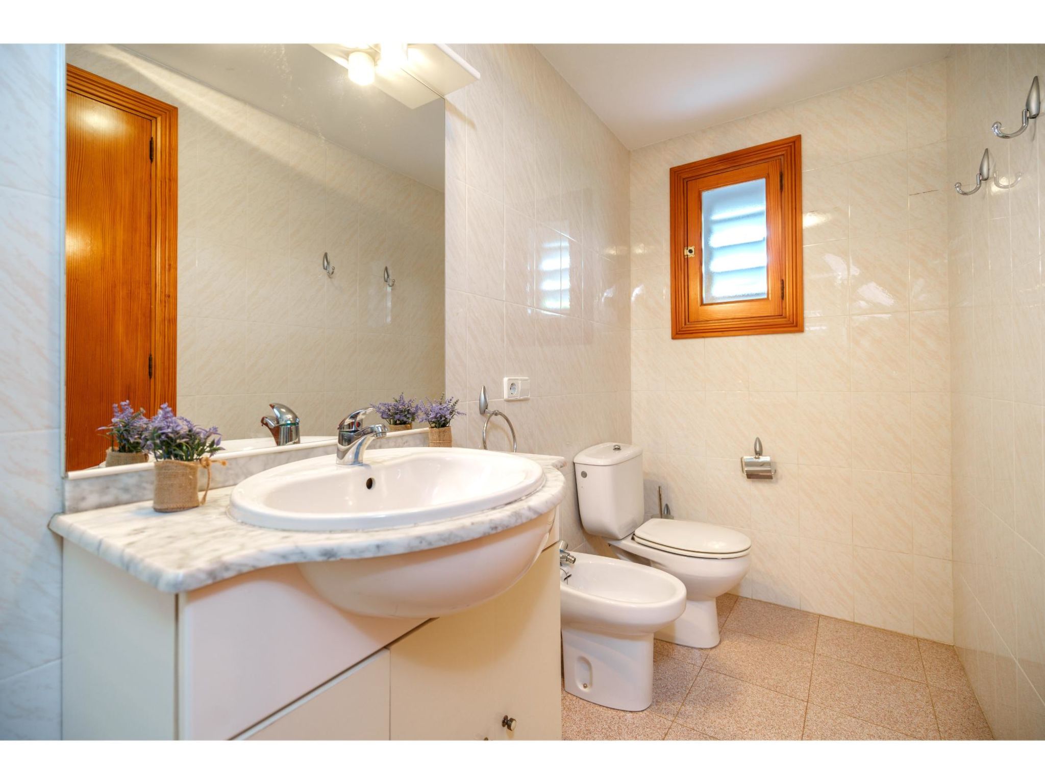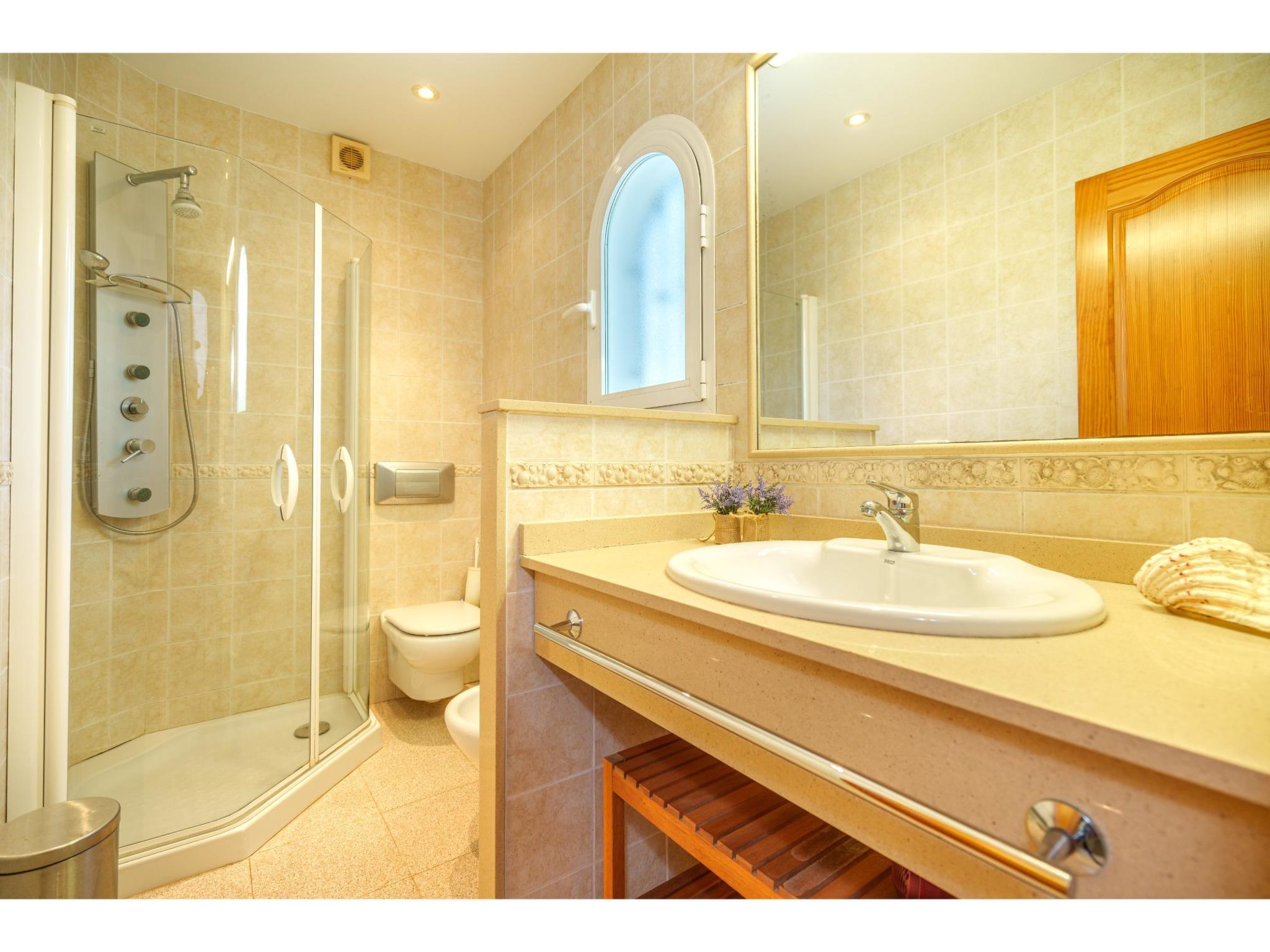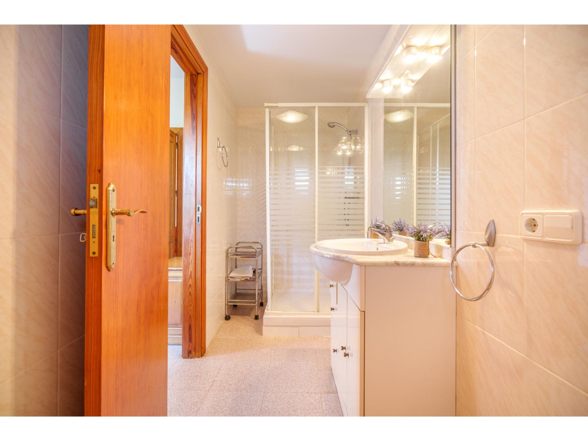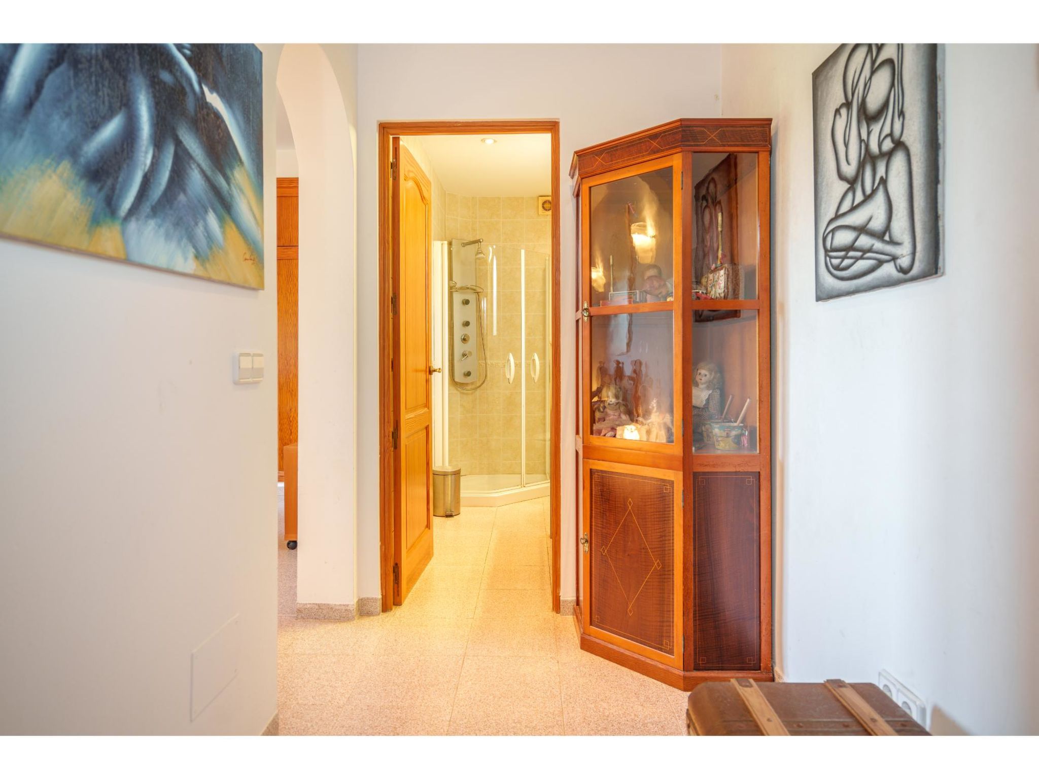Das sympathische, gepflegte Haus steht am westlichen Ortsrand von Muro, ca. 900 m von der Ortsmitte entfernt. Zum Sandstrand 'Playa de Muro' 10 km. Durch einen schönen rebenüberrankten Eingang gelangt man auf das ca. 1800 m² große, geschlossene Grundstück, auf dem der Besitzer und Hobbygärtner viele Bananenstauden und Orangenbäume angepflanzt hat. Leicht erhöht liegt der Pool (7 x 4 m, gesamte Saison geöffnet) mit Außendusche, Sonnenterrasse und Liegen. Von hier herrliche Sicht auf die Bergkette der Sierra Tramuntana. Gleich daneben Sommerküche (2 Flammen, Kühlschrank, Wasseranschluss), gemauerte Grillstelle und überdachter Essplatz. Am Haus überdachte Terrasse (Mobiliar), zusätzlich Dachterrasse. Parkmöglichkeit an der Straße. Das Haus ist geschmackvoll in warmen Farbtönen eingerichtet. Fliesenböden. Sat-TV (deutsche Programme), DVD, Radio/CD. Internetzugang (WLAN, inklusive). Waschmaschine, Bügeleisen/-brett, 3x Fön. Klimaanlage mit Kühl-/Heizfunktion. Hinweis: Rauchen ist im Haus nicht gestattet.