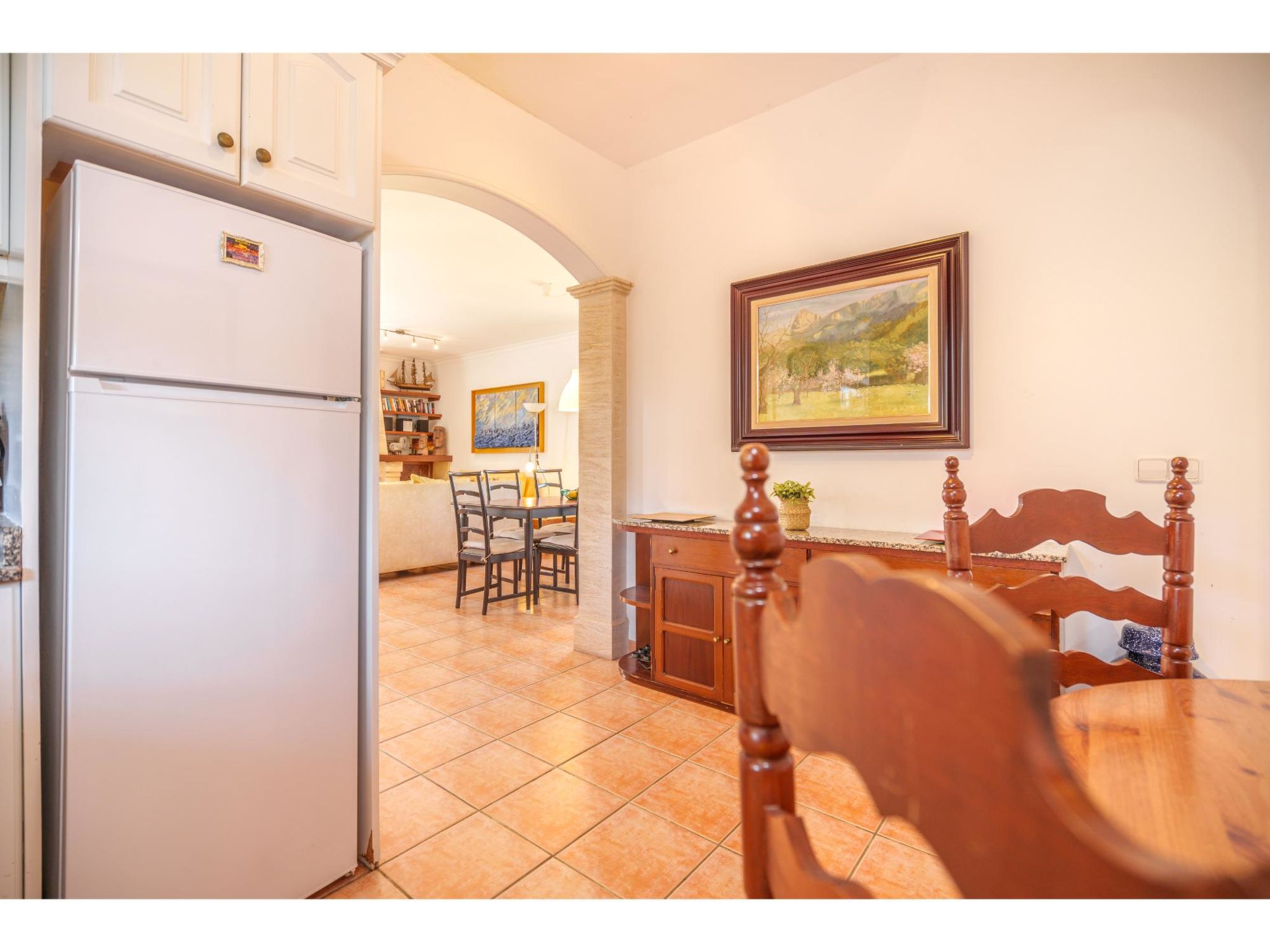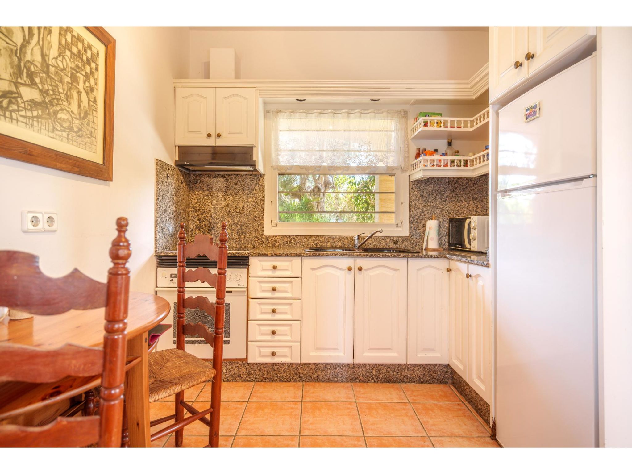 4-Zimmer-Haus, ca. 90 m². Wohnraum mit Sitzgruppe, Kamin (nur Dekoration) und Essplatz, durch offenen Bogen zu Küche (4 Flammen, Backofen, Mikrowelle, Kühl-/Gefrierkombination, Kaffeemaschine, Wasserkocher). Zweibettzimmer, Dusche/WC. Schlafzimmer mit franz. Bett (1,50 m breit), Dusche/WC. Über Stufe zu Schlafzimmer mit franz. Bett. Dusche/WC. ETV01661