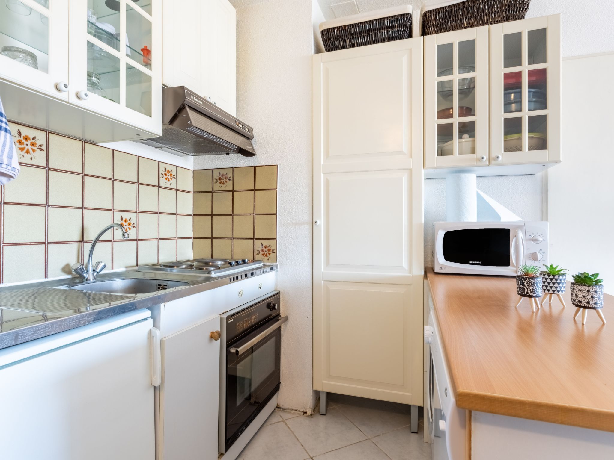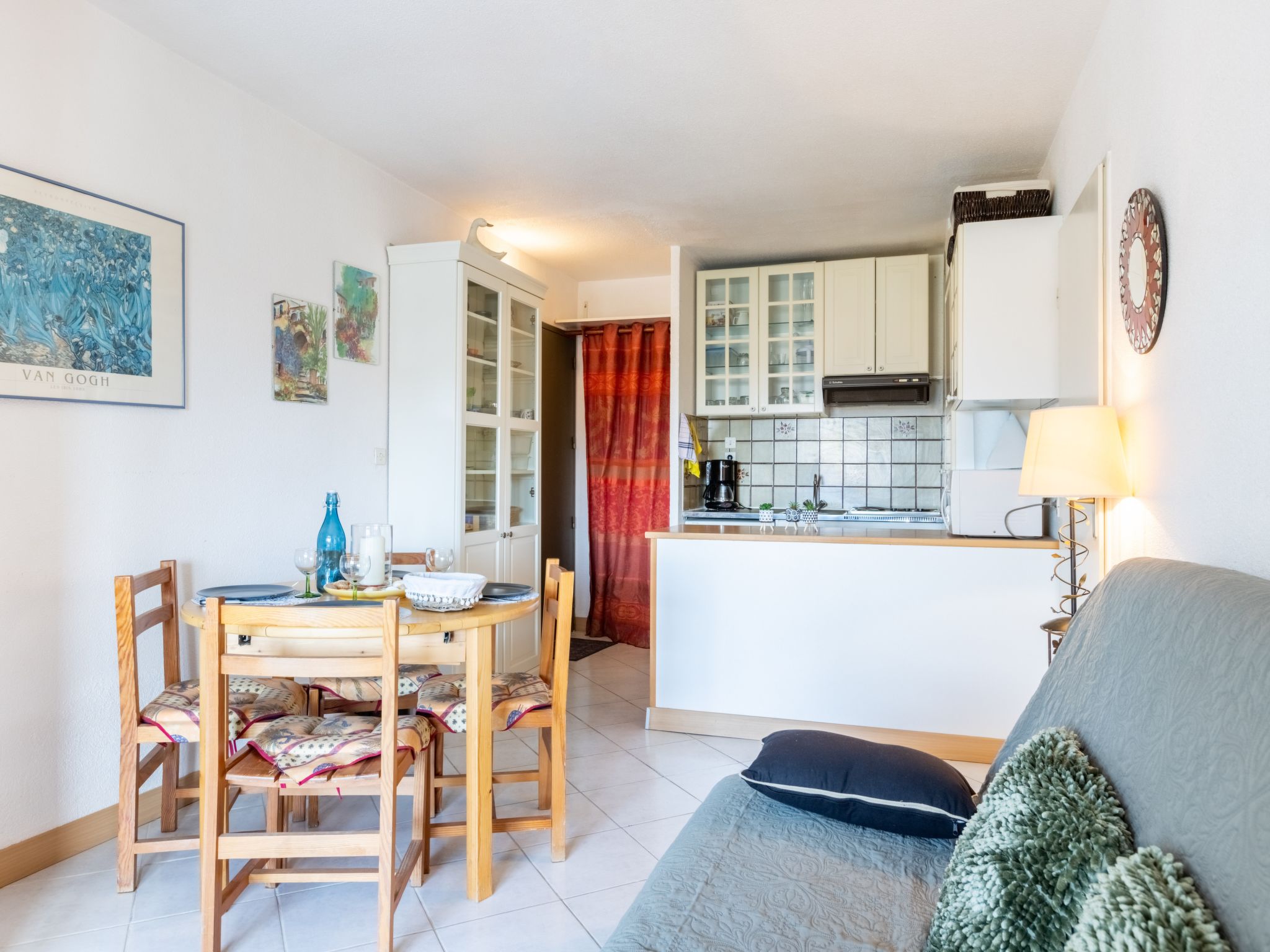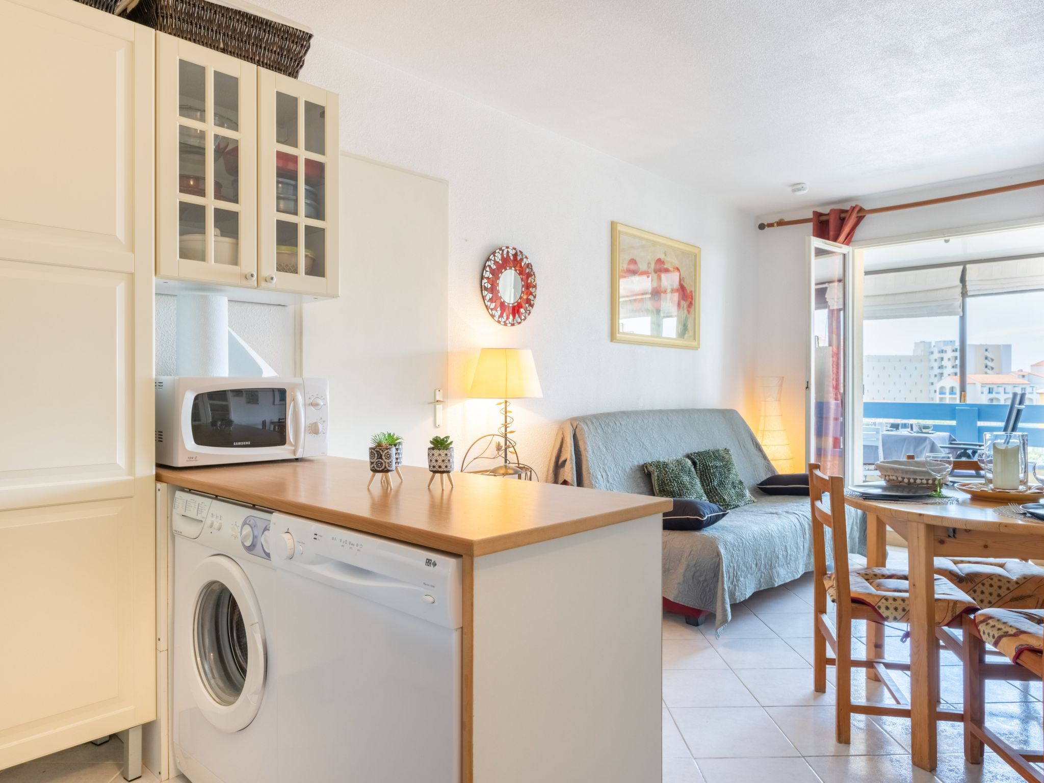 2-Zimmer-Wohnung 28 m2 im 3. Stock. Wohn-/Esszimmer mit 1 Doppeldiwanbett (1 x 140 cm, Länge 190 cm), TV (Flachbildschirm). Ausgang zur Loggia. Kabine mit 1 x 2 Etagenbetten (90 cm, Länge 190 cm). 1 Zimmer mit 1 franz. Bett (1 x 140 cm, Länge 190 cm). Kochnische (3 Kochplatten, Backofen, Geschirrspüler, Toaster, Wasserkocher, Mikrowelle, elektrische Kaffeemaschine). Bad/WC. E-Heizung. Seitliche Sicht auf das Meer und den See. Zur Verfügung: Waschmaschine, Wäschetrockner. Internet (Wireless LAN, extra). Parkplatz. Bitte beachten: Rauchmelder. Anstelle eines abgeschlossenen Schlafzimmers befinden sich manche Schlafplätze in einem offenen Bereich (Galerie, Nische etc.). Inserat einer Privatperson nach Artikel 155, IV, CGI.