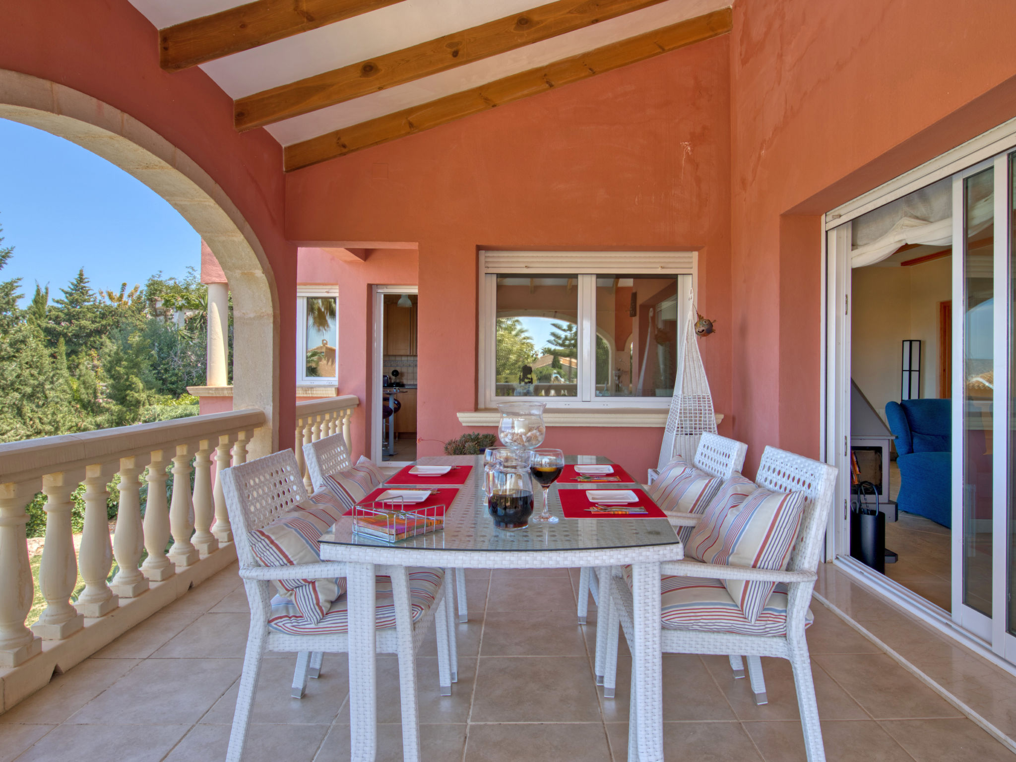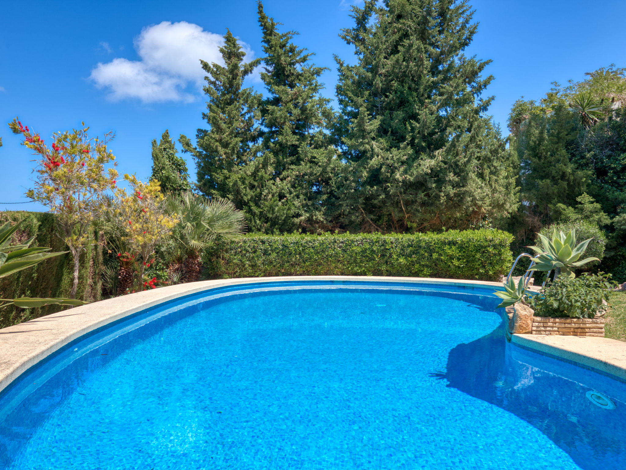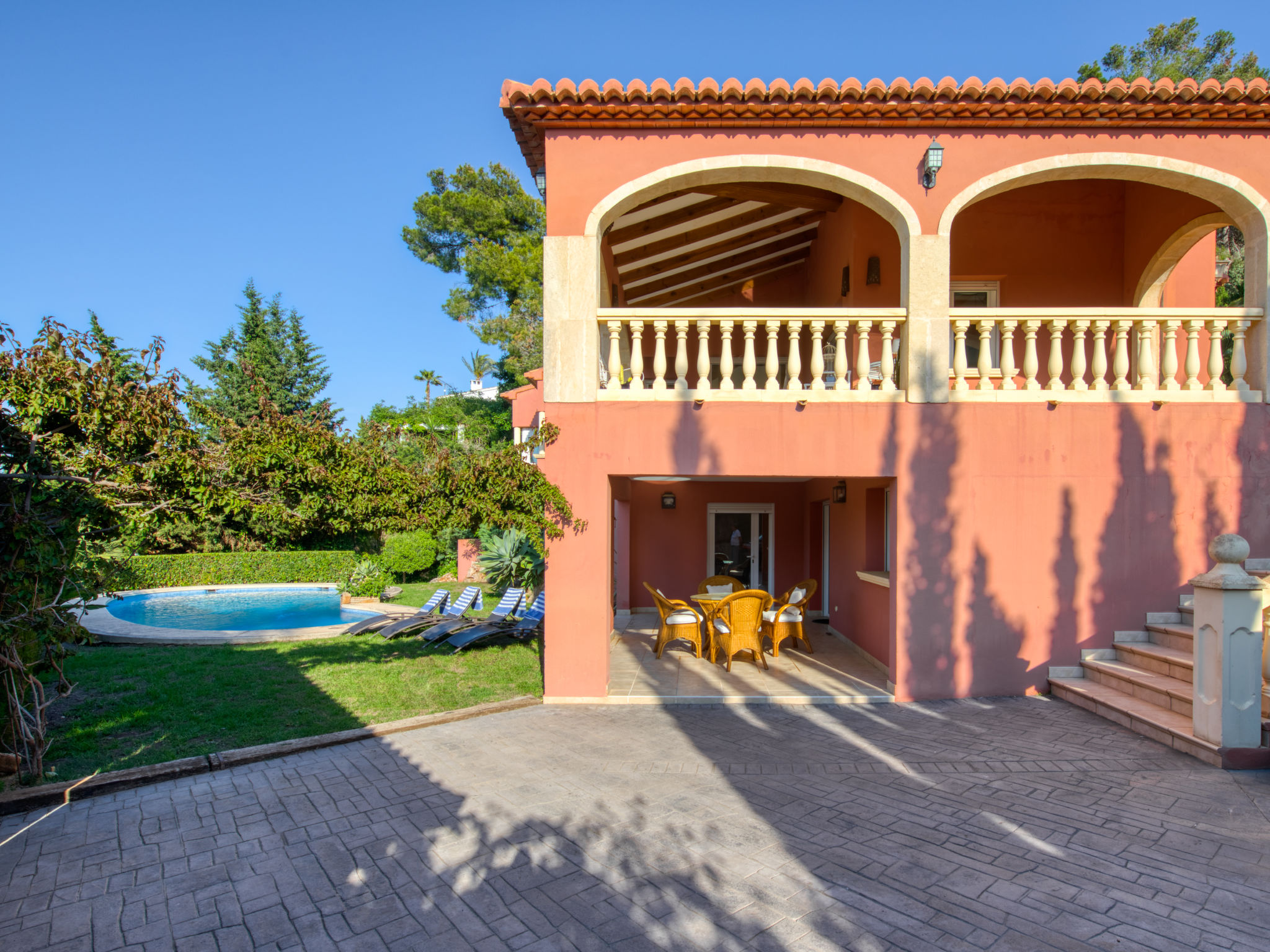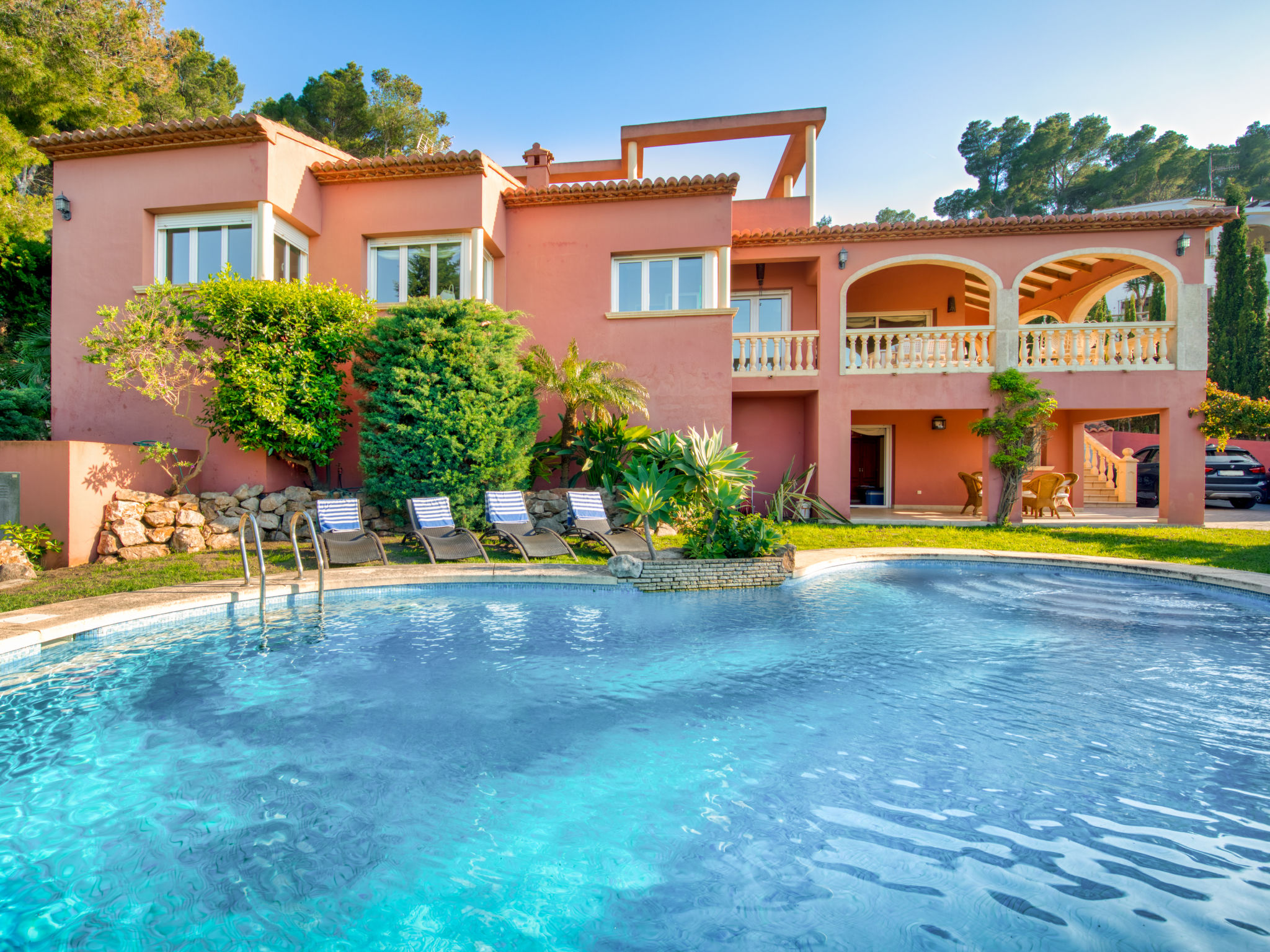 Grosses, sehr schönes Haus "Mirlos". Im Ortsteil Cap Marti, im Ort Jéavea, ruhige, sonnige Lage, 2 km vom Meer, 4.2 km vom Strand. Zur Alleinbenutzung: Garten 1'000 m2 (eingezäunt) mit Rasen und Bäumen, Schwimmbad (11 x 5 m, 120 - 180 cm tief, 01.01.-31.12.). Aussendusche, Gartenmöbel. Im Hause: Waschmaschine. Parkplatz (für 2 Autos) auf dem Grundstück. Supermarkt 1800 km, Restaurant 1.5 km, Bäckerei 1.5 km, Café 1.4 km, Sandstrand "El Arenal" 2 km. Sporthafen 3.5 km, Jacht-Hafen 2 km, Golfplatz 5 km, Segelschule 2 km, Tennis 2.1 km. Bitte beachten: Fahrzeug empfohlen. Jugendgruppen nur auf Anfrage.