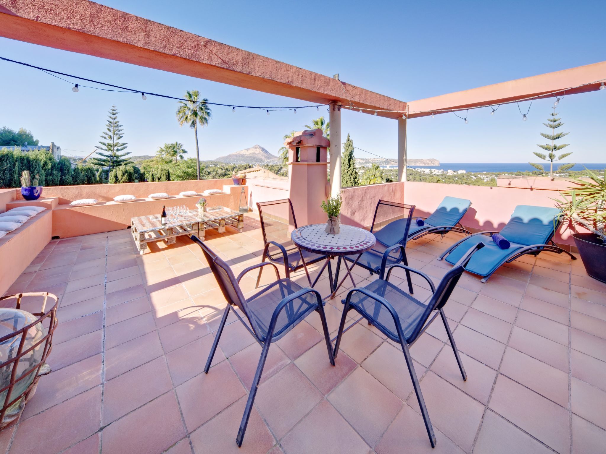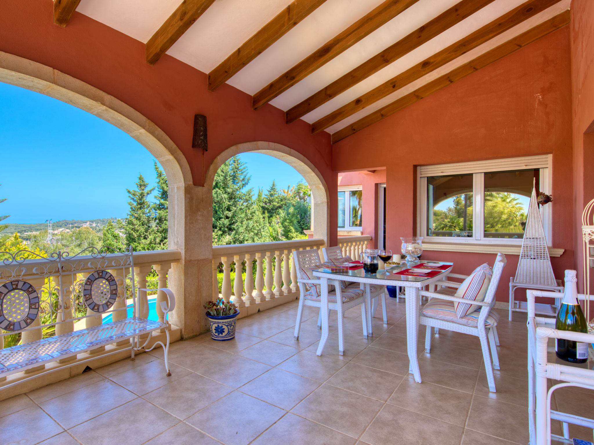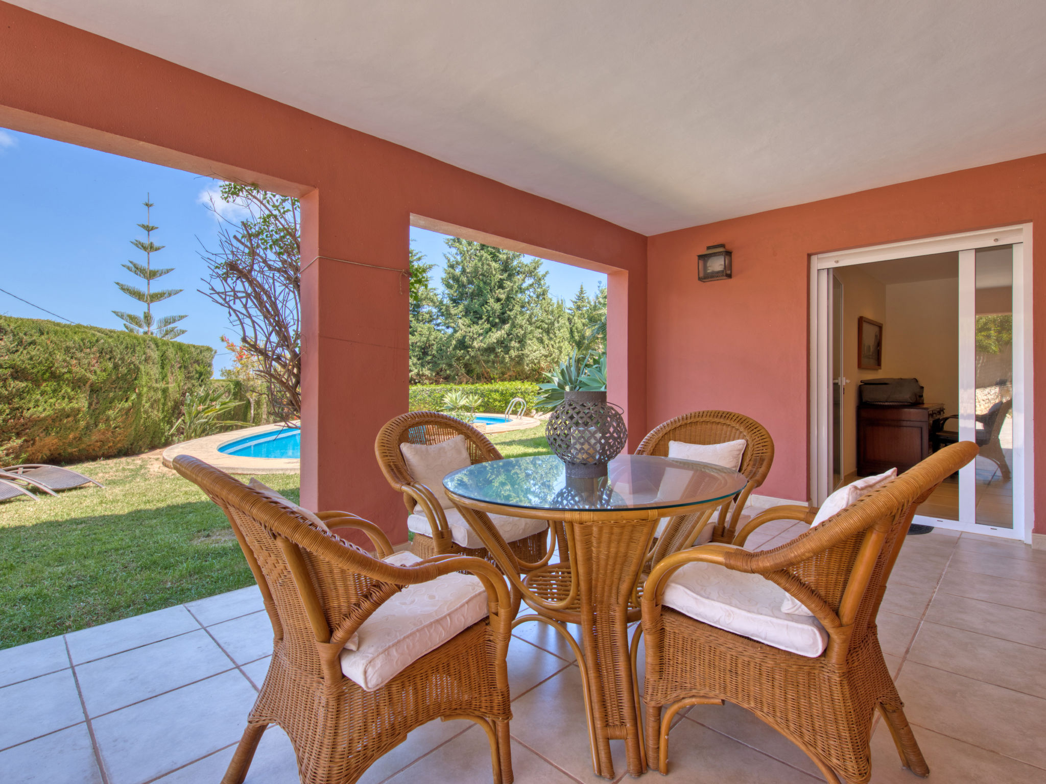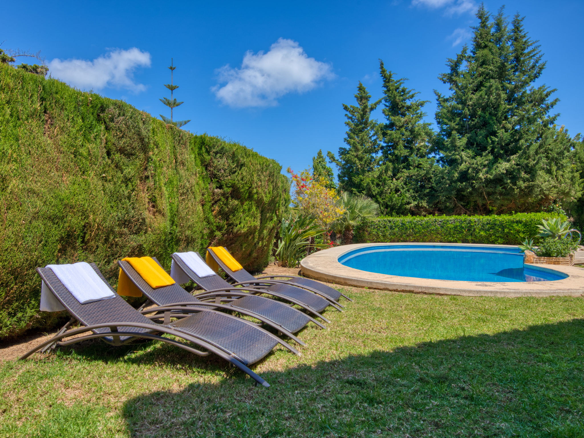 Grosses, sehr schönes Haus "Mirlos". Im Ortsteil Cap Marti, im Ort Jéavea, ruhige, sonnige Lage, 2 km vom Meer, 4.2 km vom Strand. Zur Alleinbenutzung: Garten 1'000 m2 (eingezäunt) mit Rasen und Bäumen, Schwimmbad (11 x 5 m, 120 - 180 cm tief, 01.01.-31.12.). Aussendusche, Gartenmöbel. Im Hause: Waschmaschine. Parkplatz (für 2 Autos) auf dem Grundstück. Supermarkt 1800 km, Restaurant 1.5 km, Bäckerei 1.5 km, Café 1.4 km, Sandstrand "El Arenal" 2 km. Sporthafen 3.5 km, Jacht-Hafen 2 km, Golfplatz 5 km, Segelschule 2 km, Tennis 2.1 km. Bitte beachten: Fahrzeug empfohlen. Jugendgruppen nur auf Anfrage.
