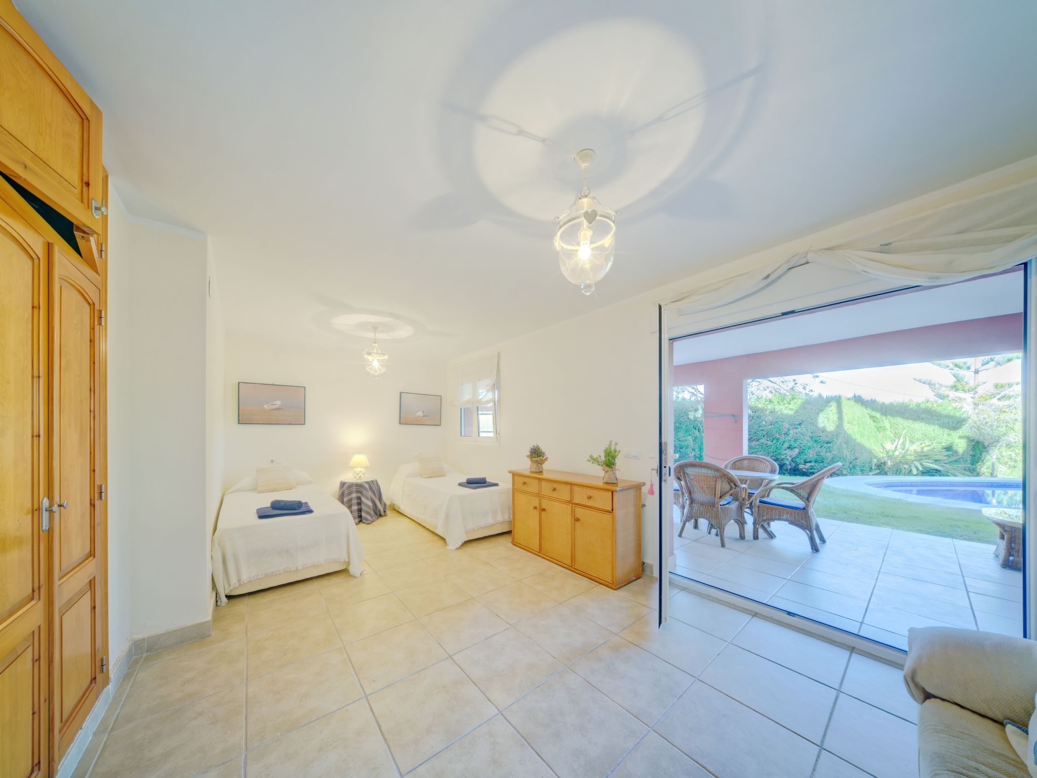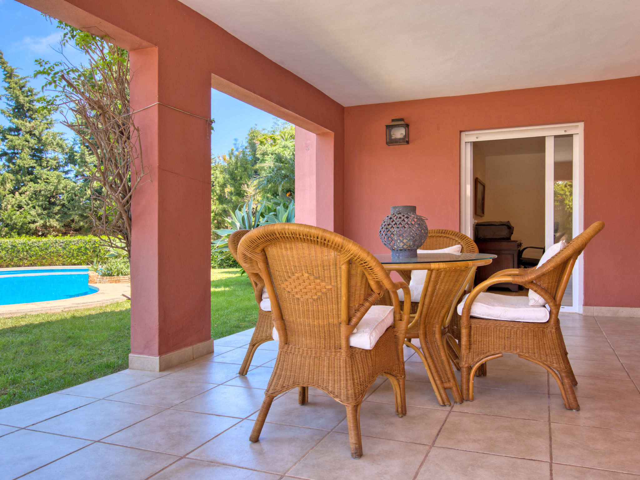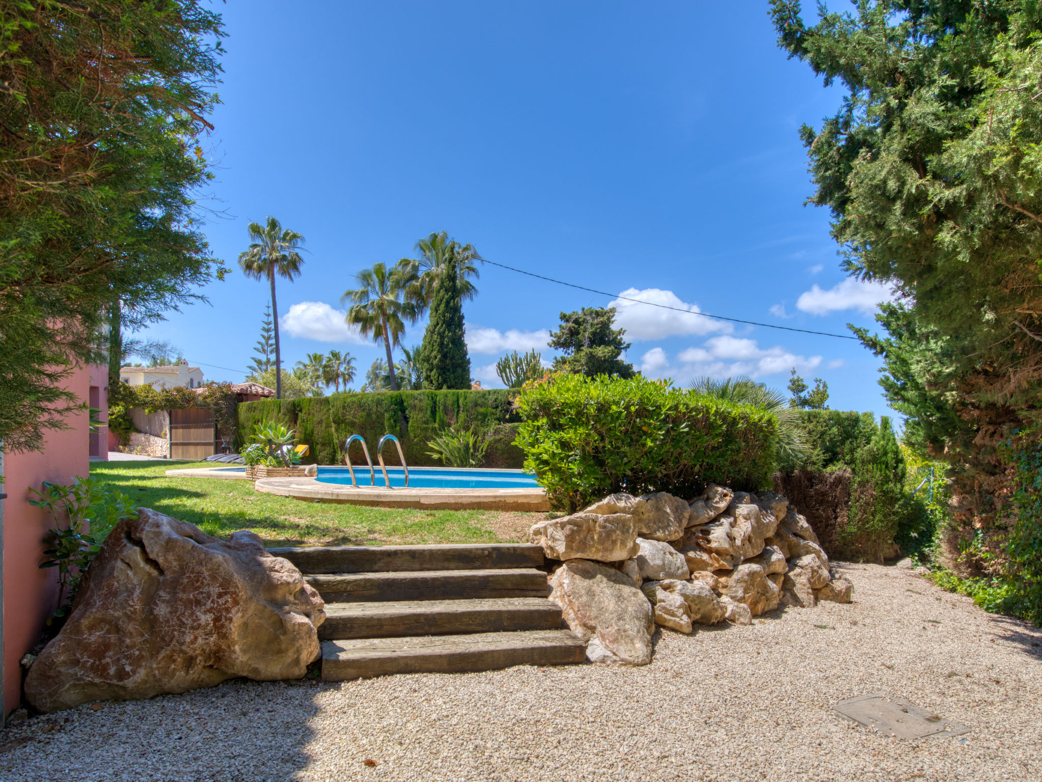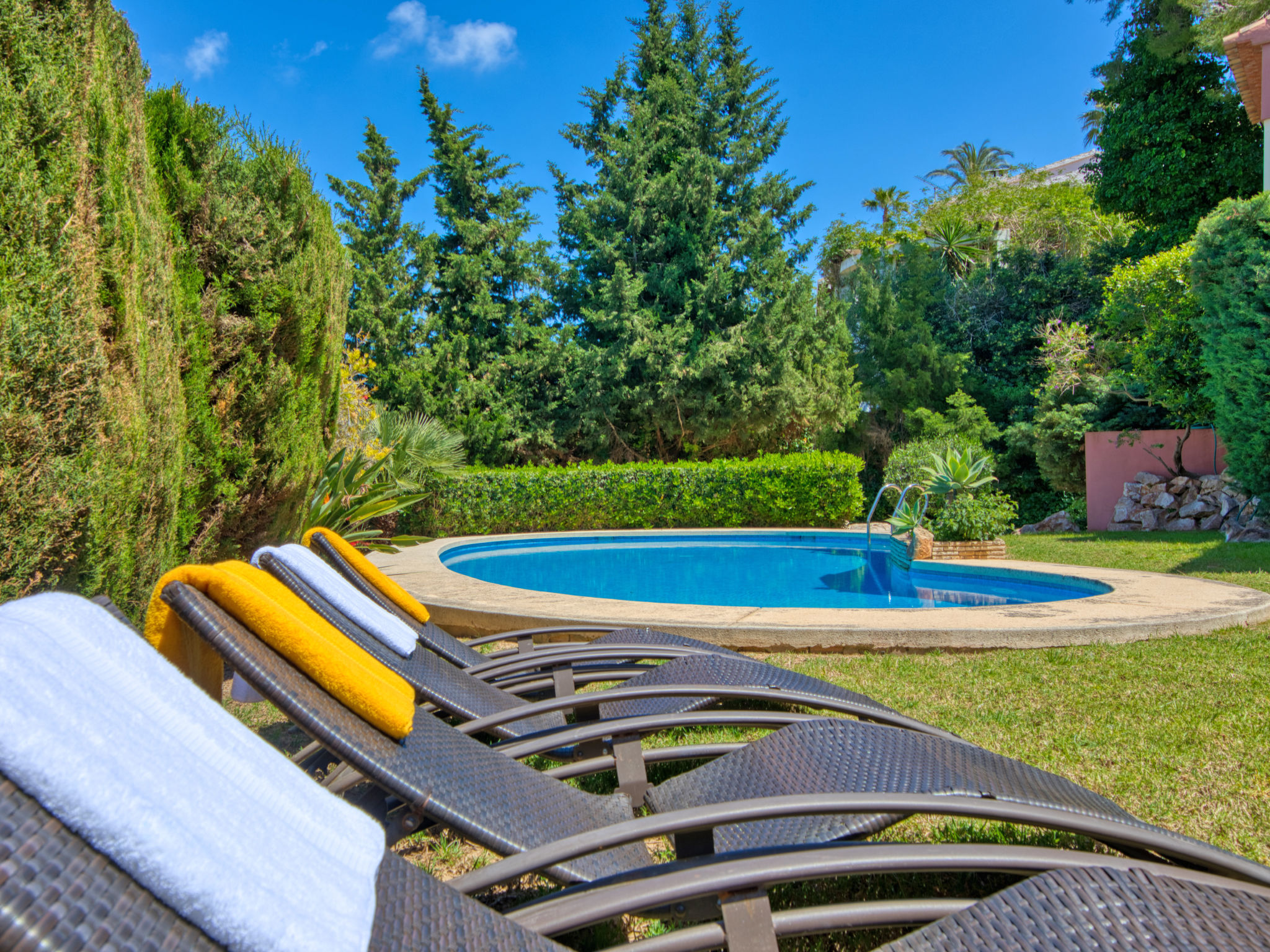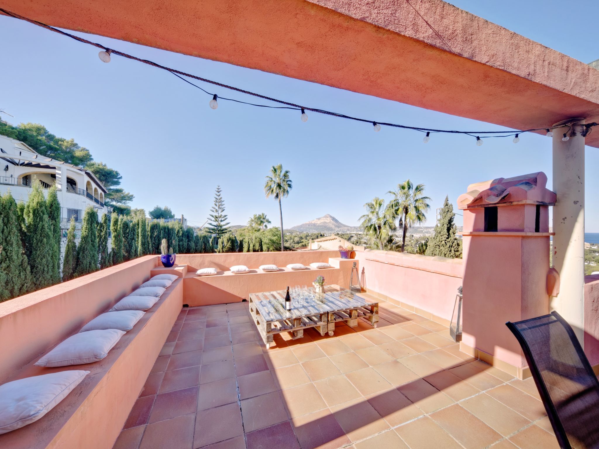 Grosses, sehr schönes Haus "Mirlos". Im Ortsteil Cap Marti, im Ort Jéavea, ruhige, sonnige Lage, 2 km vom Meer, 4.2 km vom Strand. Zur Alleinbenutzung: Garten 1'000 m2 (eingezäunt) mit Rasen und Bäumen, Schwimmbad (11 x 5 m, 120 - 180 cm tief, 01.01.-31.12.). Aussendusche, Gartenmöbel. Im Hause: Waschmaschine. Parkplatz (für 2 Autos) auf dem Grundstück. Supermarkt 1800 km, Restaurant 1.5 km, Bäckerei 1.5 km, Café 1.4 km, Sandstrand "El Arenal" 2 km. Sporthafen 3.5 km, Jacht-Hafen 2 km, Golfplatz 5 km, Segelschule 2 km, Tennis 2.1 km. Bitte beachten: Fahrzeug empfohlen. Jugendgruppen nur auf Anfrage.