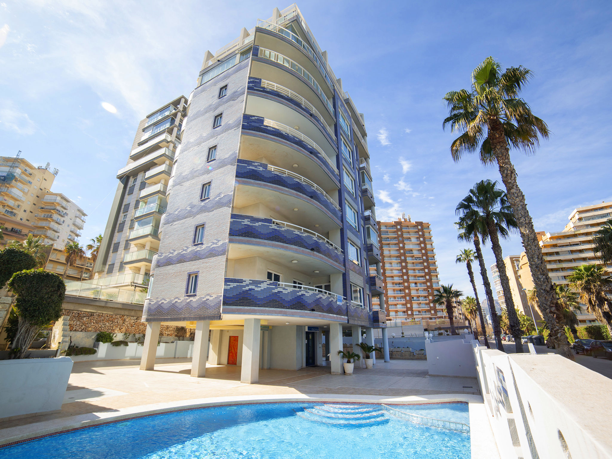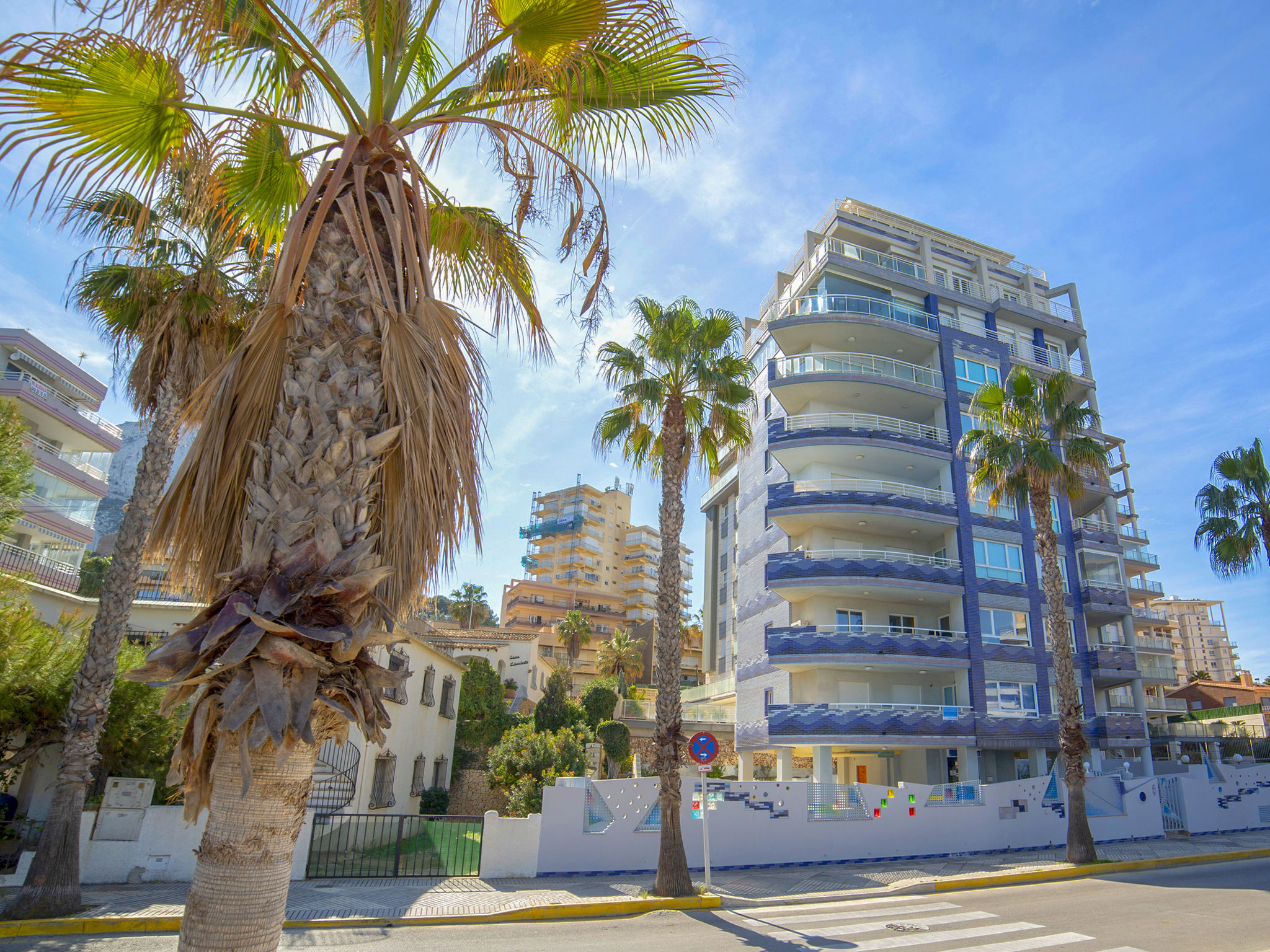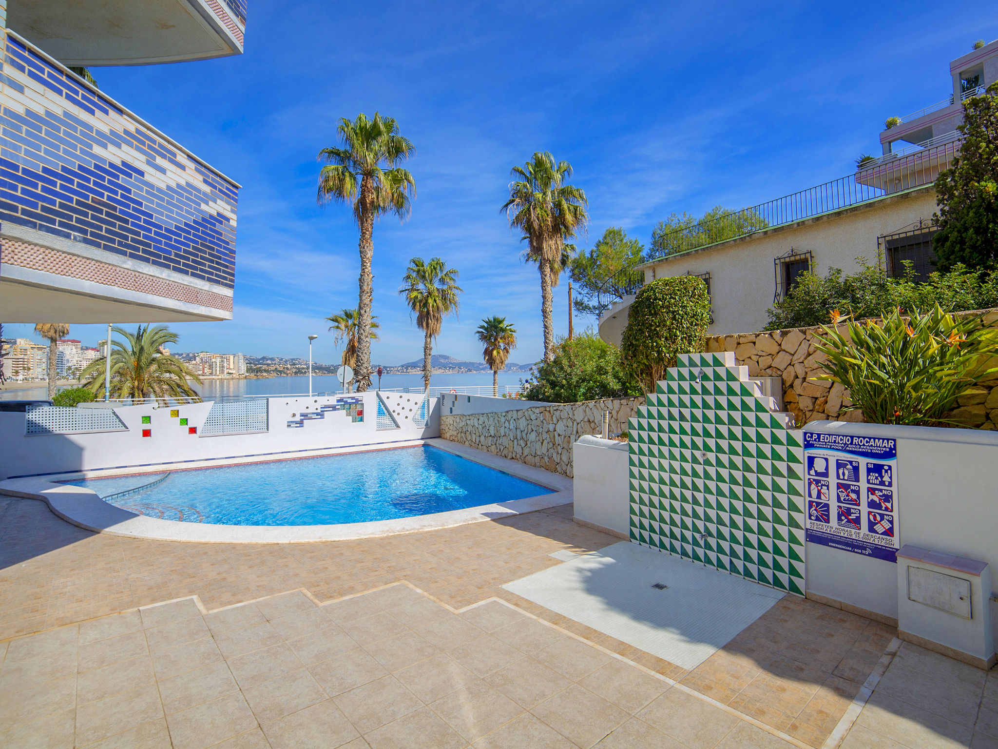Playa de La Fossa: Schönes Appartementhaus "Rocamar", auf 8 Stockwerken. Im Ort, 2.6 km vom Zentrum von Calpe, sonnige Lage, direkt am Meer, direkt am Strand. Zur Mitbenutzung: Grundstück (eingezäunt), Garten, Schwimmbad (8 x 6 m, saisonale Verfügbarkeit: 01.Jan.-31.Dez.) mit Innentreppe. Kinderbecken, Aussendusche. Im Hause: Fahrstuhl. Supermarkt 200 m, Restaurant, Bar, Café 10 m, Sandstrand "Playa de la Fossa" 10 m. Jacht-Hafen 400 m, Golfplatz 10.7 km, Segelschule 400 m. Nahe gelegene Sehenswürdigkeiten: Aqualandia, Mundomar, Terra Mítica, Terra Natura, Benidorm Palace (Benidorm), Les Fonts de l'Algar, Castillo de Guadalest.