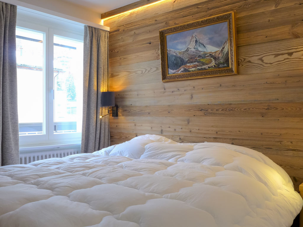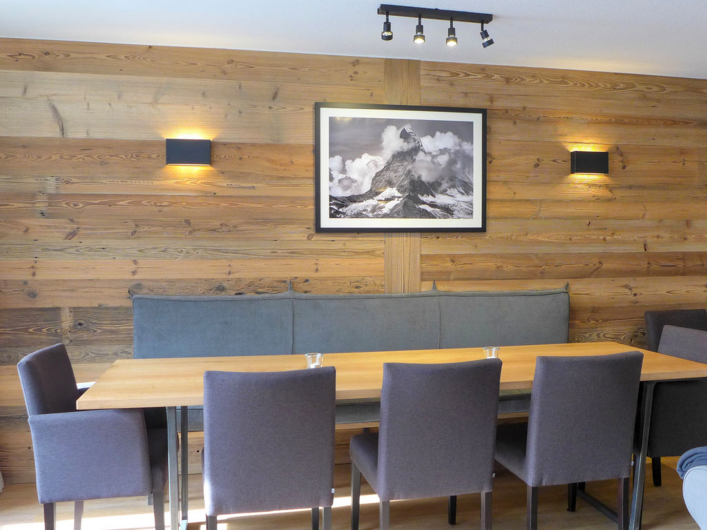 4-Zimmer-Wohnung 140 m2 im 2. Stock, Südlage. Hell, vollständig renoviert im Jahre 2020, sehr schön und gemütlich eingerichtet: Wohnzimmer mit TV. Ausgang zum Balkon. 1 Doppelzimmer mit 1 Doppelbett (1 x 180 cm, Länge 200 cm). 1 Zimmer mit 2 x 2 Etagenbetten (90 cm, Länge 200 cm). 1 Doppelzimmer mit 1 Doppelbett (1 x 180 cm, Länge 200 cm). Offene Küche (Backofen, Geschirrspüler, 4 Glaskeramikherd Platten, Wasserkocher, Tiefkühler, elektrische Kaffeemaschine). Bad/WC, 2 Duschen/WC. Heizung. Grosser Balkon, Südlage. Balkonmöbel. Schöne Sicht auf das Matterhorn. Zur Verfügung: Internet (Wireless LAN). Bitte beachten: Nichtraucher-Unterkunft.