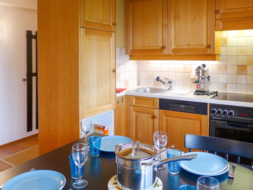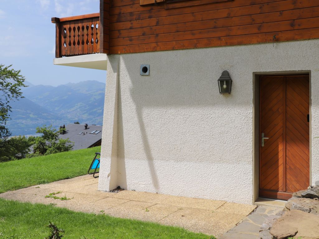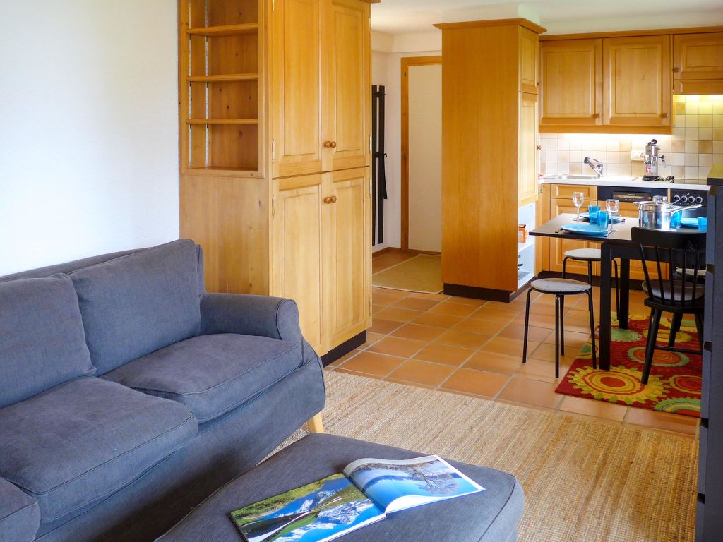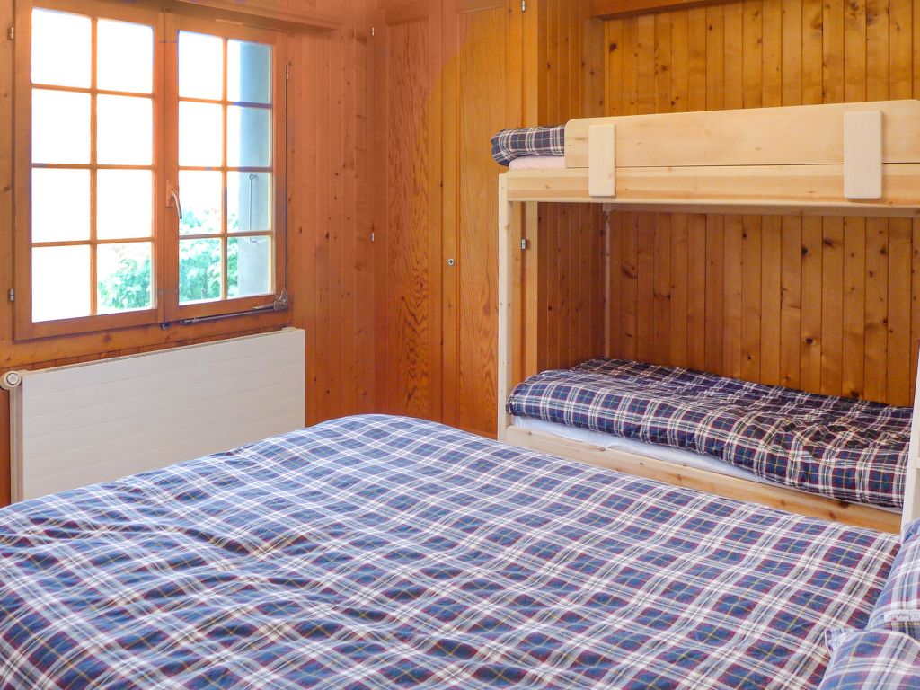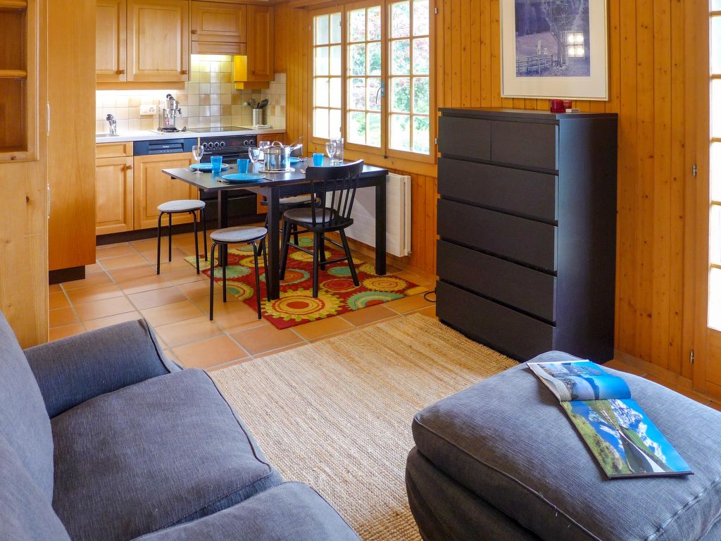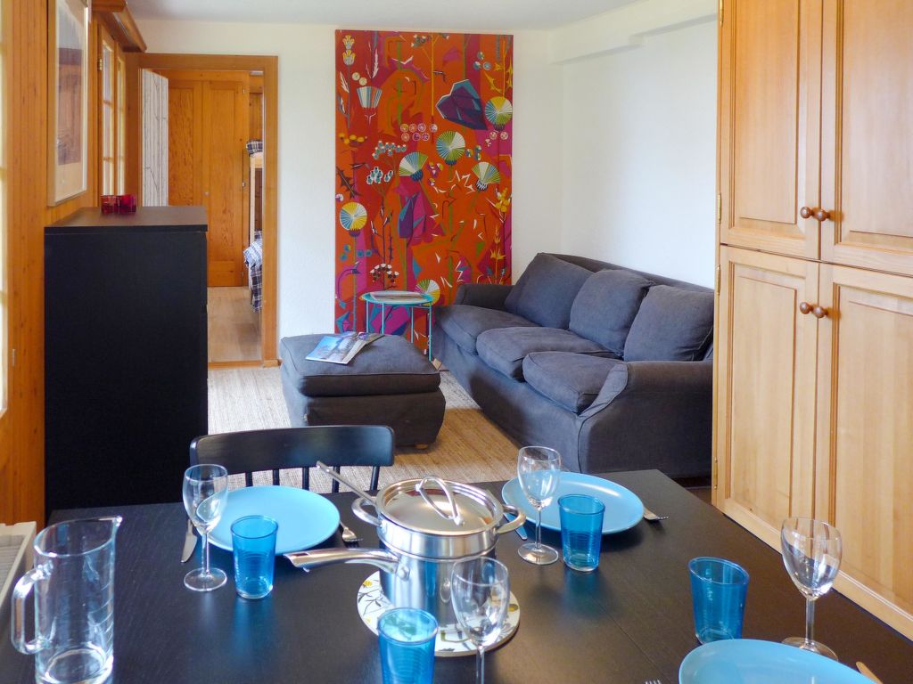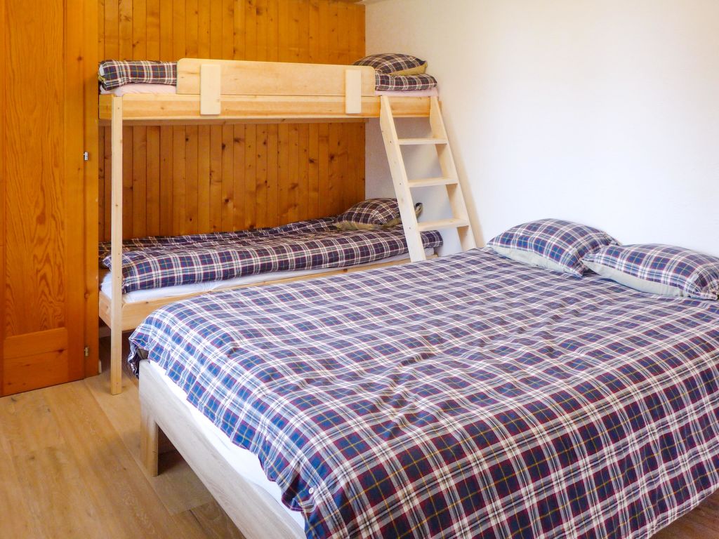 "Chalet Les Pommiers", 2-Zimmer-Wohnung 37 m2, im Erdgeschoss, Südlage. Zweckmässig und schön eingerichtet: Wohn-/Esszimmer mit Esstisch. Ausgang zum Garten, Richtung Süden. 1 grosses Zimmer mit 1 x 2 Etagenbetten (80 cm, Länge 200 cm), 1 franz. Bett (140 cm, Länge 200 cm), Dusche/WC. Offene Küche (Backofen, Geschirrspüler, 4 Glaskeramikherd Platten). Parkettböden. Grosser Garten 30 m2, Südlage. Terrassenmöbel. Schöne Sicht auf die Berge und das Tal. Zur Verfügung: Waschmaschine, Wäschetrockner. Internet (Wireless LAN, gratis). Parkplatz (1 Auto). Bitte beachten: Nichtraucher-Unterkunft.