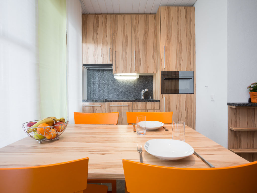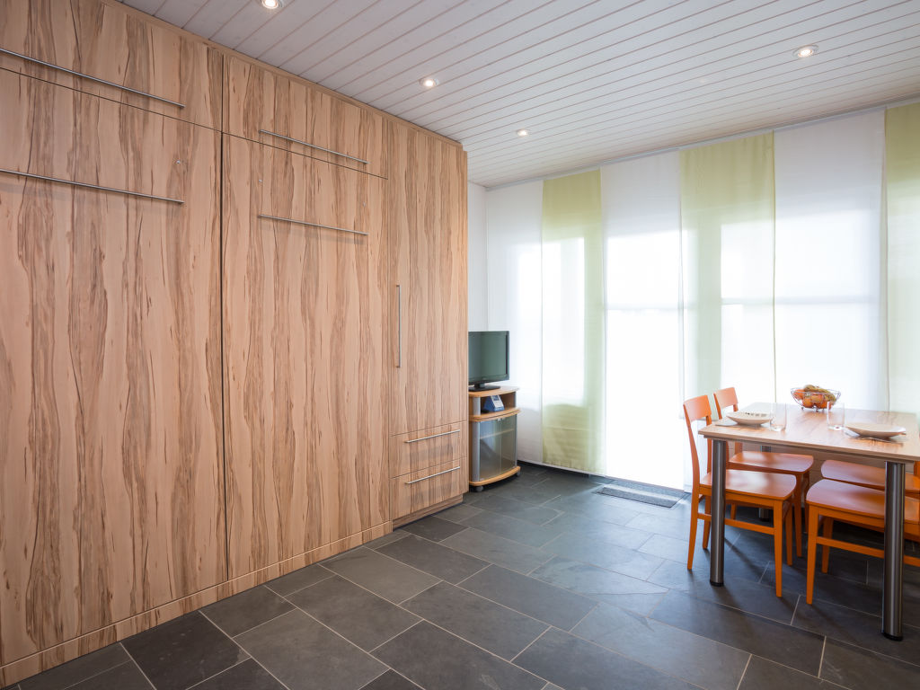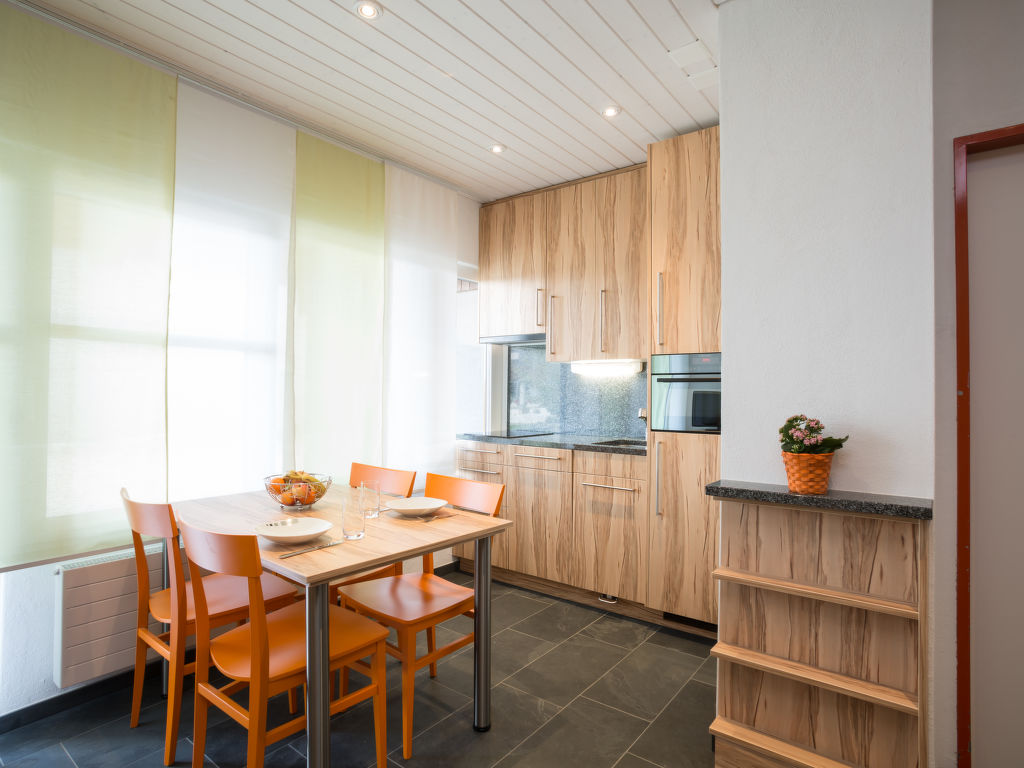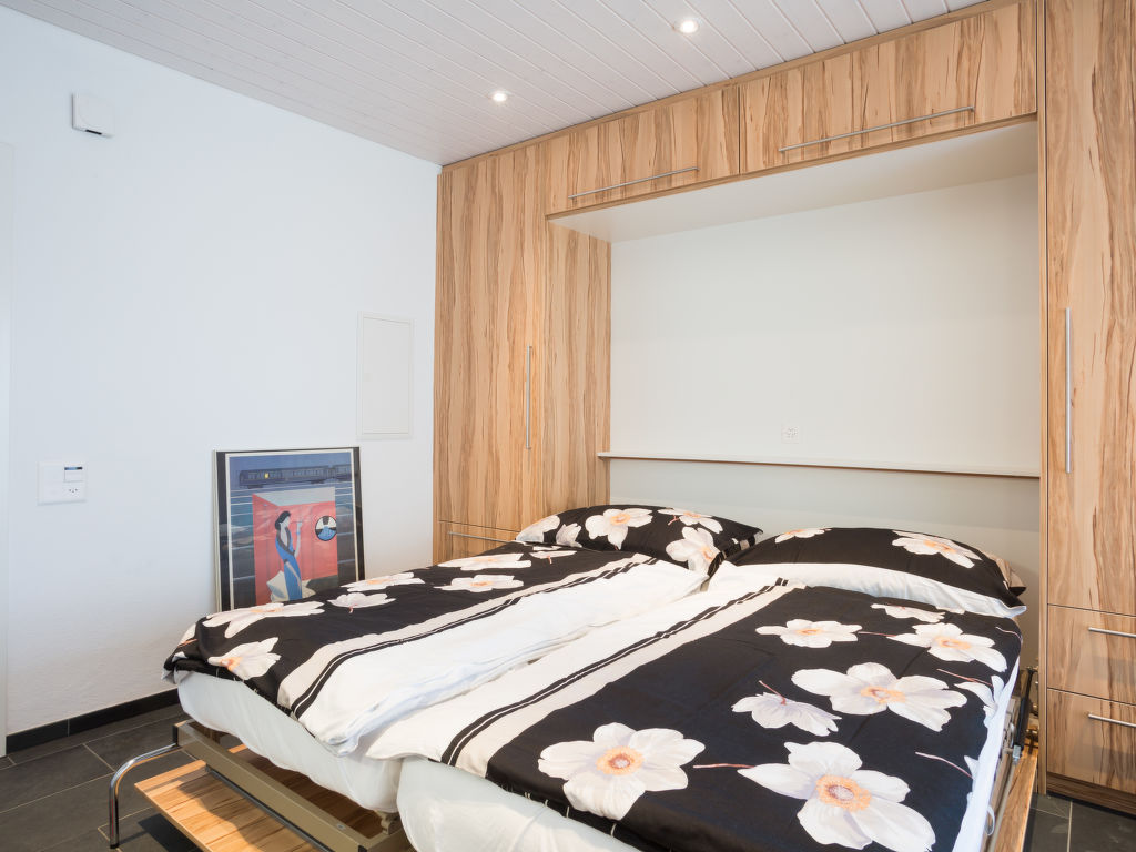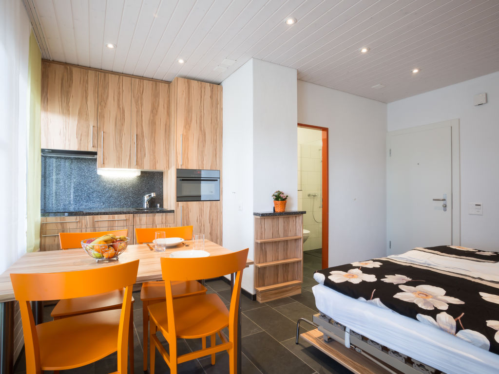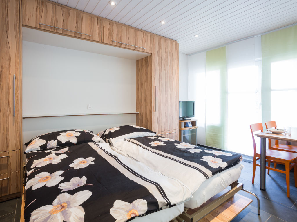 "Dixence 8", 1-Zimmer-Studio 25 m2, im Erdgeschoss. Geschmackvoll und gemütlich eingerichtet: Wohn-/Schlafzimmer mit 2 Wandklappbetten (90 cm, Länge 200 cm), TV. Offene Küche (2 Kochplatten, Backofen, Geschirrspüler) mit TV. Ausgang zur Terrasse. Dusche/WC. Terrasse. Terrassenmöbel. Bitte beachten: Nichtraucher-Unterkunft.