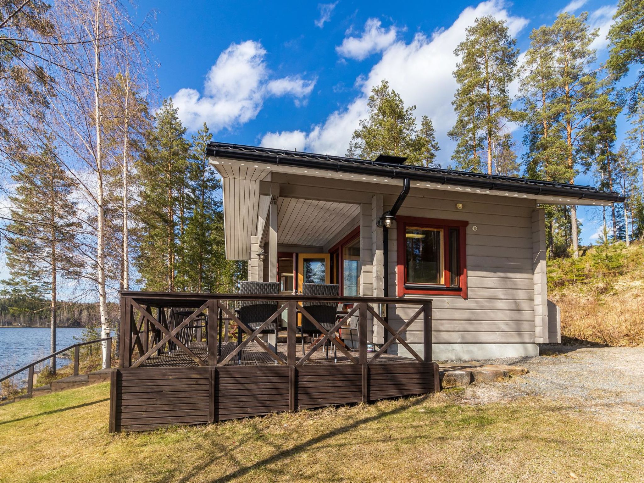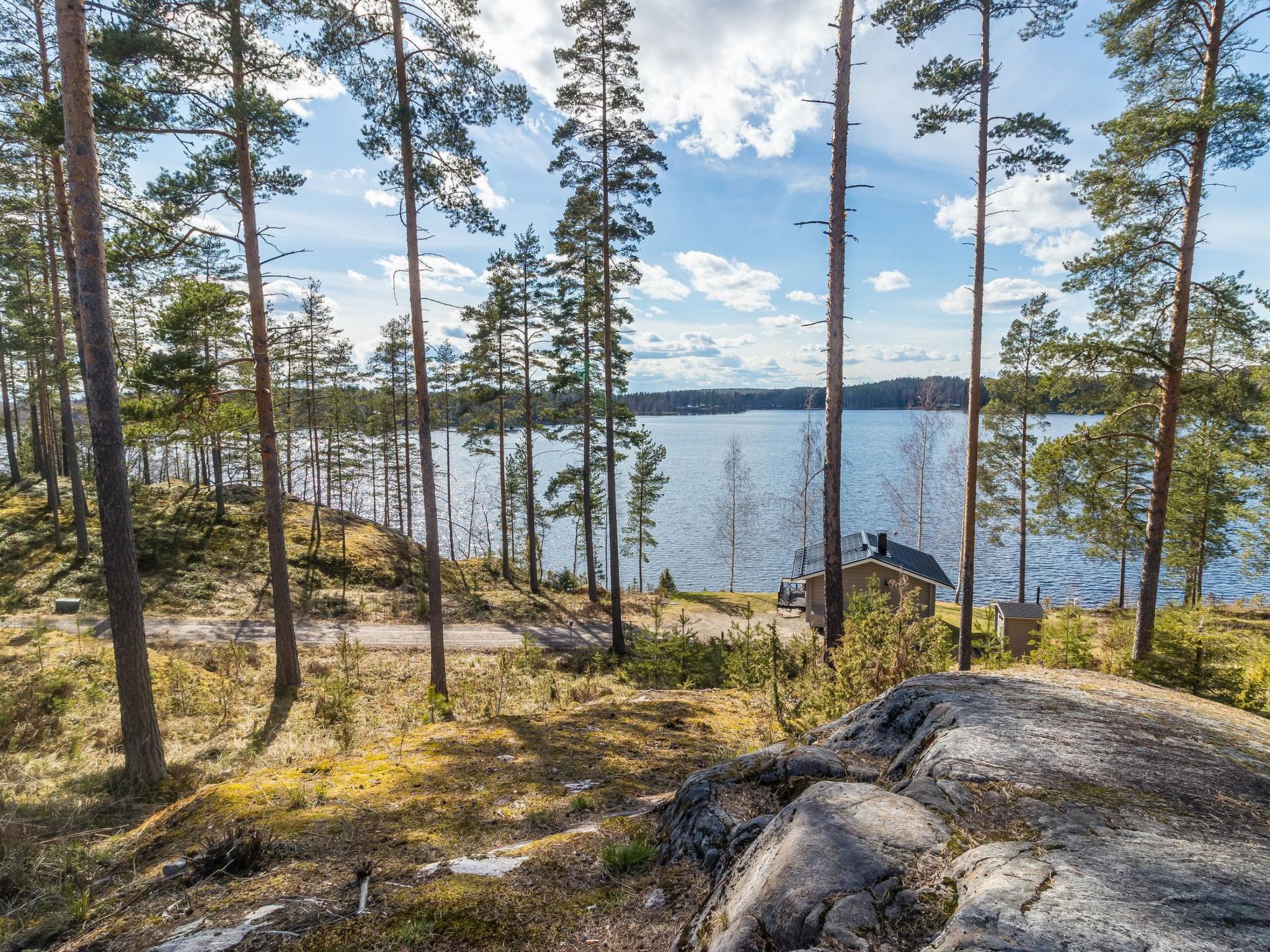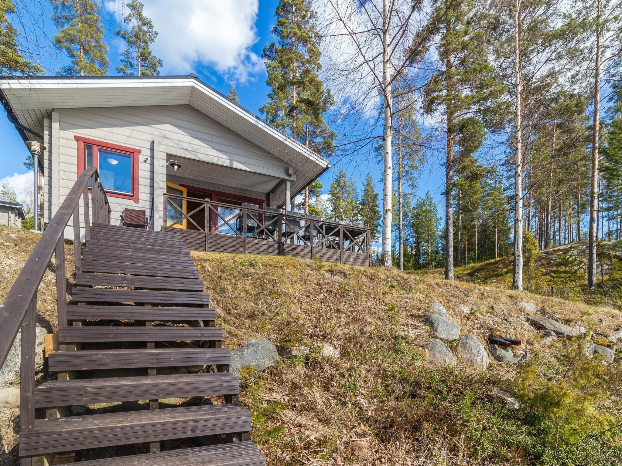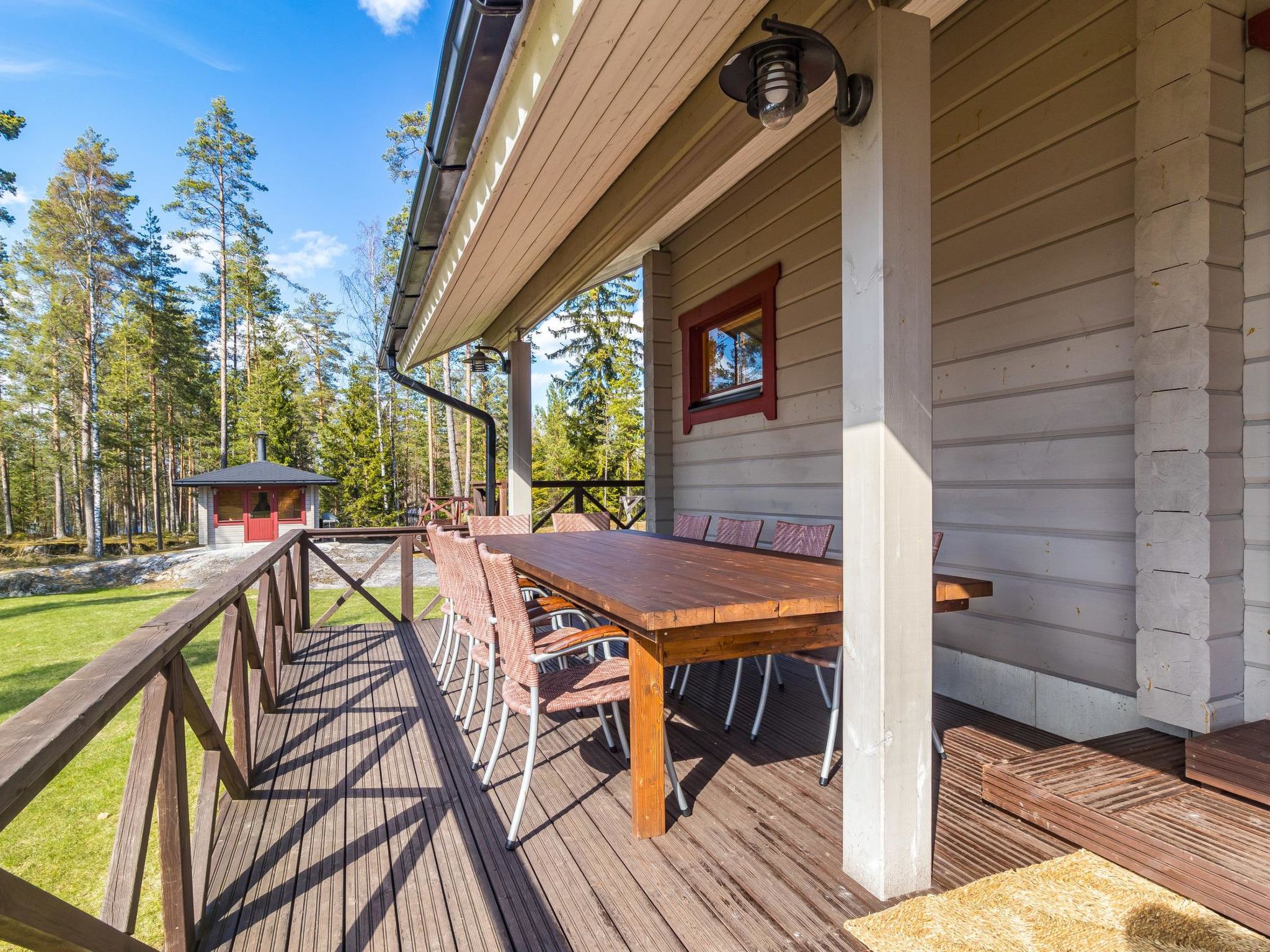 36 km östlich von Mikkeli, See Saimaa 50 m, harter und tiefer Sandboden, eigenes Boot. Holzhaus, Baujahr 2007, Küche, Wohnzimmer, 1. Schlafzimmer mit 2 Betten, 2. Schlafzimmer mit 3 Betten, 3. Schlafzimmer mit 3 Betten + Kinderbett, Schlafboden (20 m²) mit 4 Betten, Hauswirtschaftsraum, Waschraum, Sauna (E-Herd) mit 2 Duschen, überdachte Terrasse. Steile Treppe zum Dachboden. Das Haus hat mechanische Belüftung. Separates Saunagebäude (26.5 m²) mit Holzofen, in der Dusche kaltes und warmes Wasser, Ankleideraum, Waschraum, Kaminzimmer und Toilette. Garage. Trockentrommel und Satellitenfernsehen. Hochwertiges, geräumiges Haus, auf ebenem Grundstück, auf abfallendem Felsgrund, mit Mischwald. Anttola 10 km, Annila Golf 34 km, Ollinmäki Weinberg 14 km. Grill-Tipi.