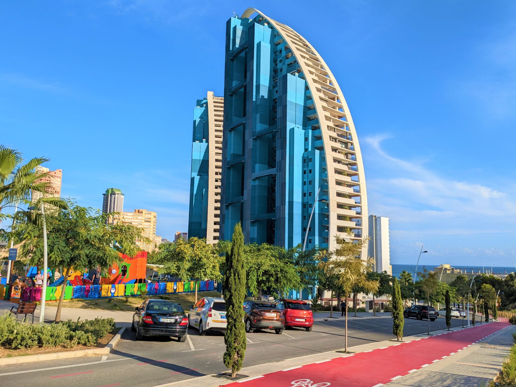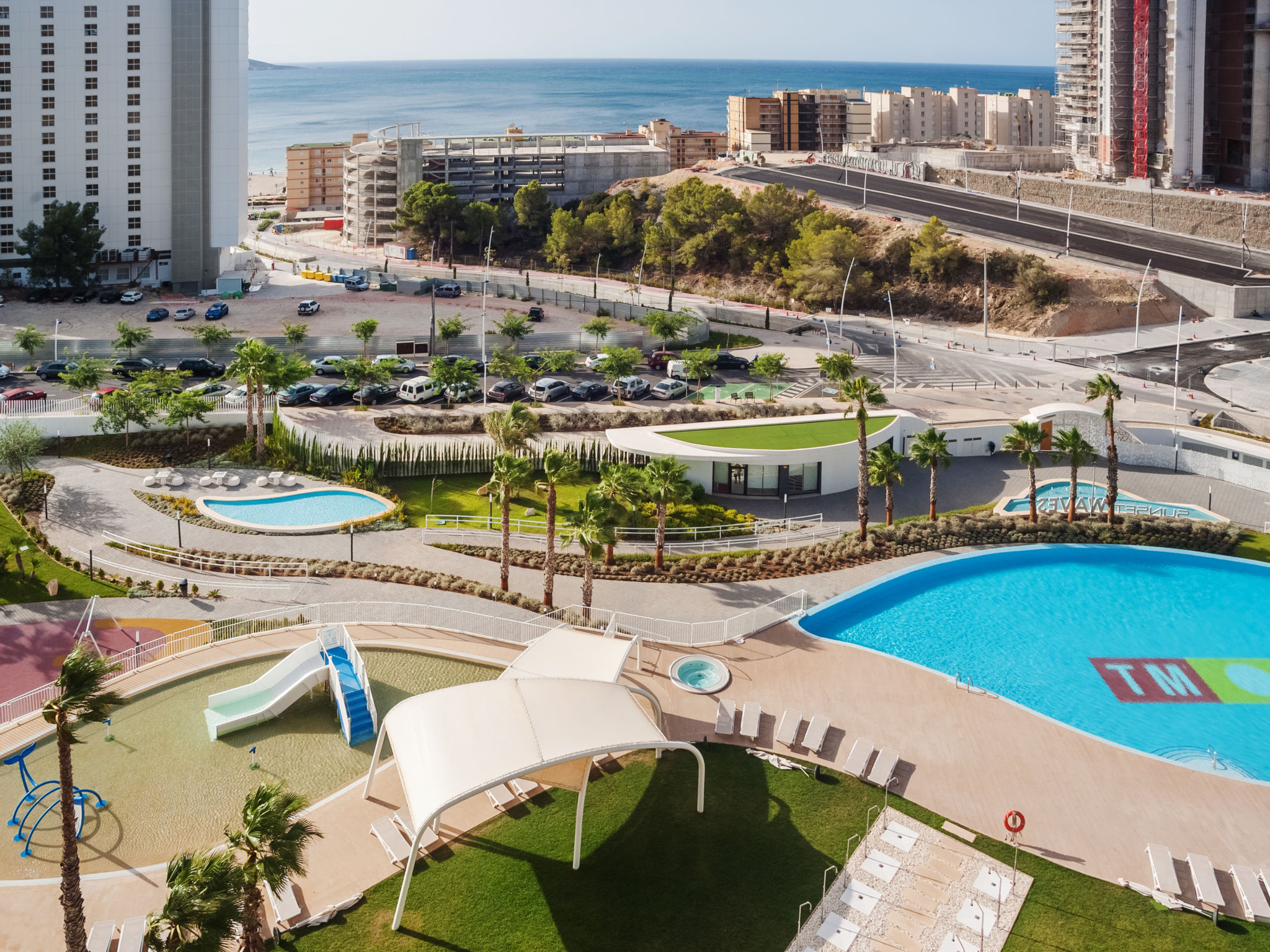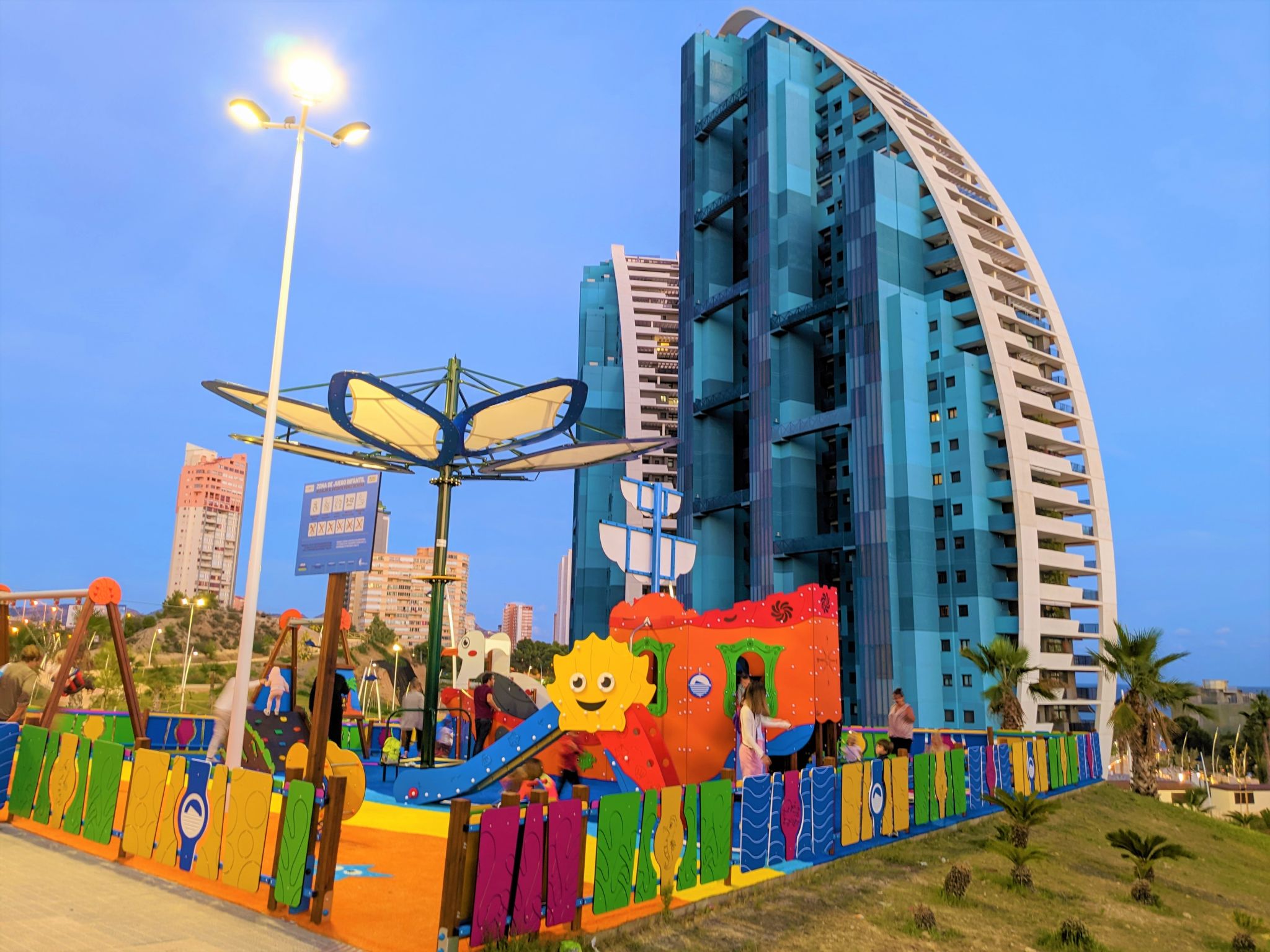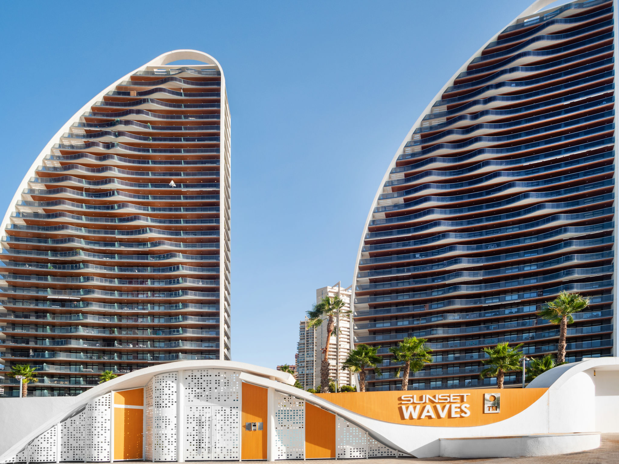 Playa Poniente: Sehr modernes Appartementhaus "Sunset weves", Baujahr 2021. Im Ort, 400 m vom Zentrum von Benisorm, sonnige Lage, 200 m vom Meer, 200 m vom Strand. Zur Mitbenutzung: grosser Terrassengarten mit Rasen und Bäumen, Schwimmbad (15 x 25 m, 50 - 200 cm tief, saisonale Verfügbarkeit: 01.Jan.-31.Dez.). Ungleichmässige Schwimmbadform Dusche/WC im Poolbereich, Kinderspielplatz. Im Hause: Fahrstuhl. Parkplatz auf dem Grundstück. Supermarkt, Bar, Bushaltestelle 300 m. Nahe gelegene Sehenswürdigkeiten: Aqualandia 6 km, Mundomar 6 km, Terra Mitica 4 km, Terra Natura 4 km, Alicante 45 km, Aeropuerto Alicante 58 km. Jugendgruppen nur auf Anfrage. Die Nachbarschaft ist sehr lärmempfindlich. Ruhe und gutes Benehmen wird erwartet.