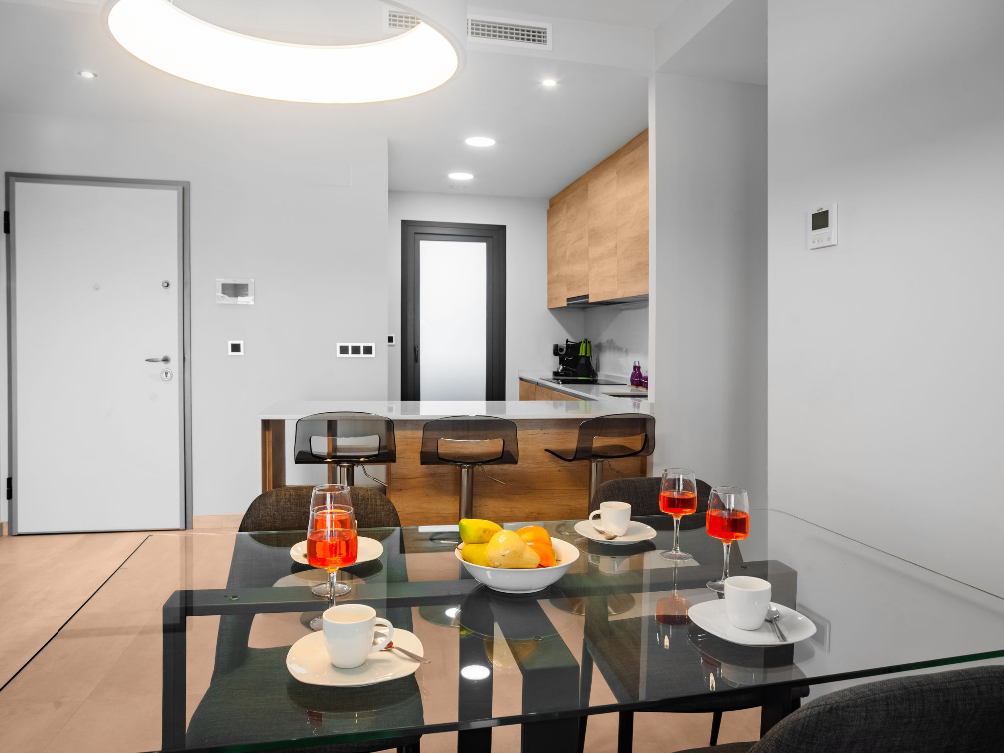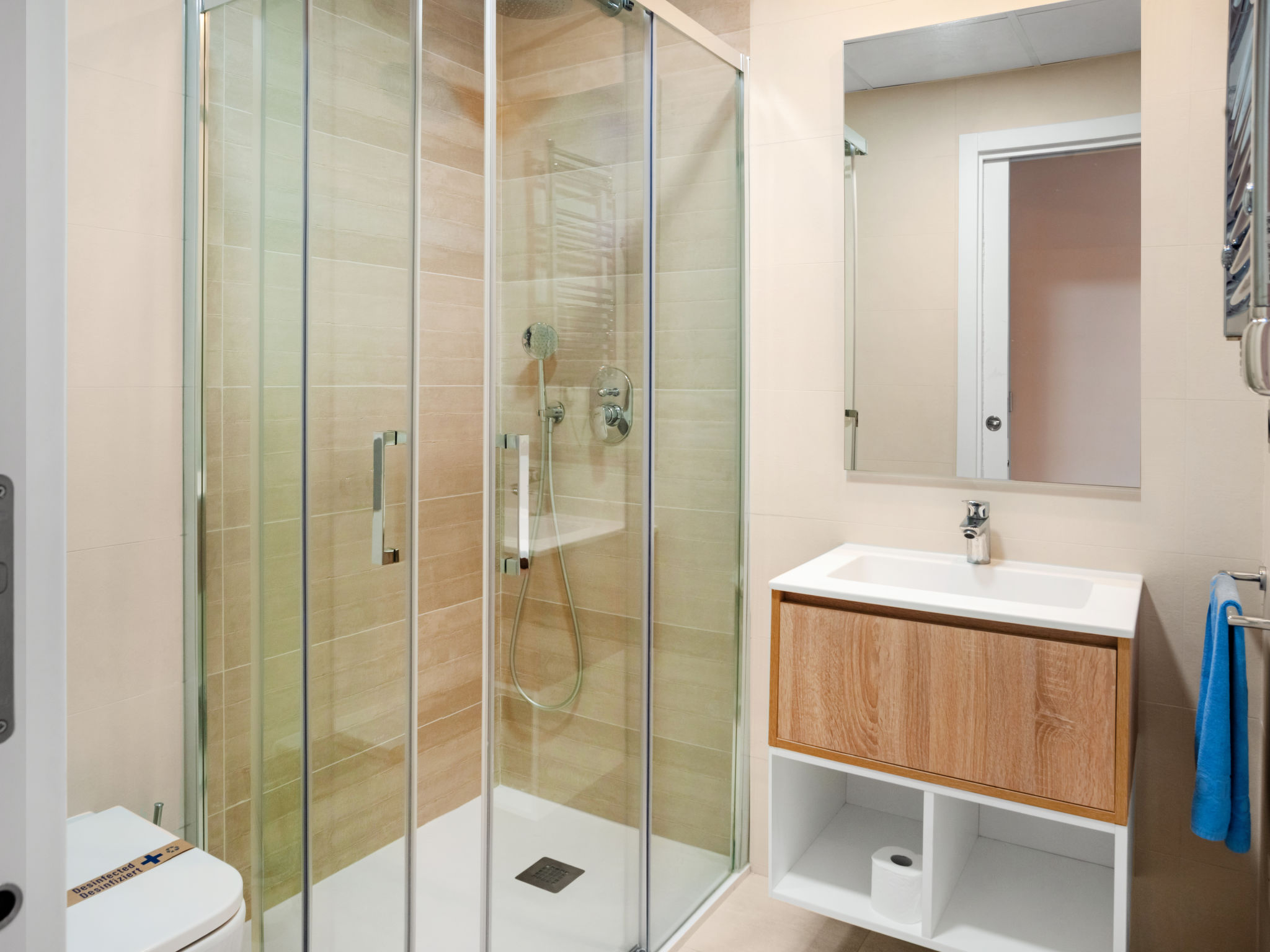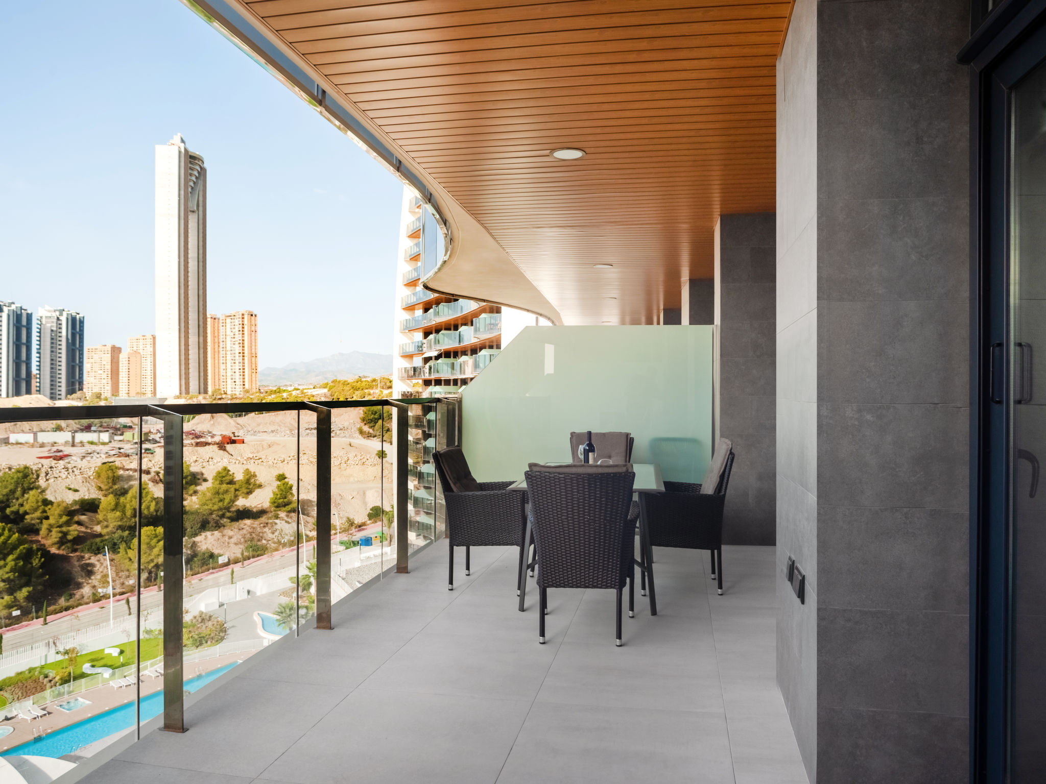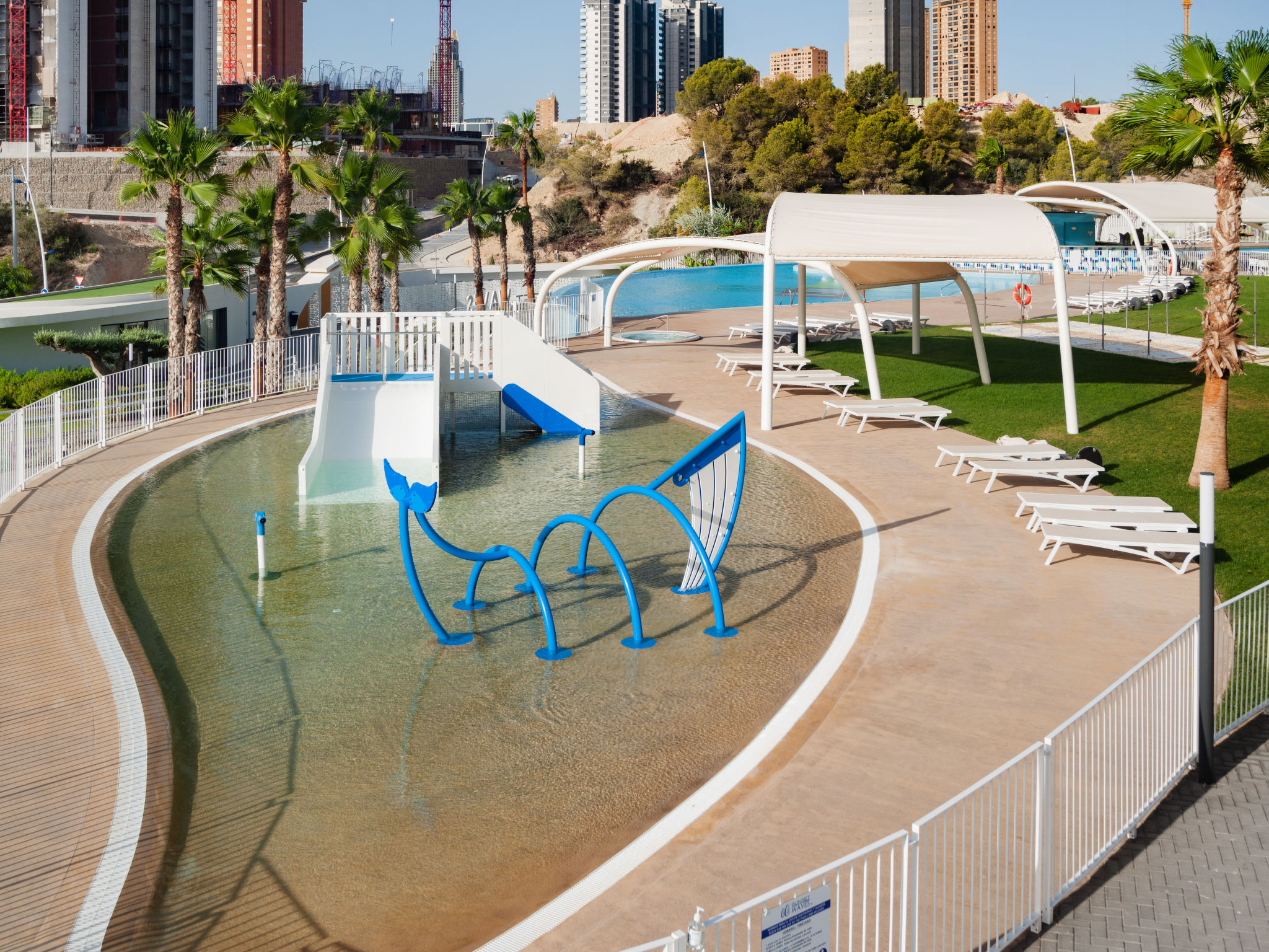 Playa Poniente: Sehr modernes Appartementhaus "Sunset weves", Baujahr 2021. Im Ort, 400 m vom Zentrum von Benisorm, sonnige Lage, 200 m vom Meer, 200 m vom Strand. Zur Mitbenutzung: grosser Terrassengarten mit Rasen und Bäumen, Schwimmbad (15 x 25 m, 50 - 200 cm tief, saisonale Verfügbarkeit: 01.Jan.-31.Dez.). Ungleichmässige Schwimmbadform Dusche/WC im Poolbereich, Kinderspielplatz. Im Hause: Fahrstuhl. Parkplatz auf dem Grundstück. Supermarkt, Bar, Bushaltestelle 300 m. Nahe gelegene Sehenswürdigkeiten: Aqualandia 6 km, Mundomar 6 km, Terra Mitica 4 km, Terra Natura 4 km, Alicante 45 km, Aeropuerto Alicante 58 km. Jugendgruppen nur auf Anfrage. Die Nachbarschaft ist sehr lärmempfindlich. Ruhe und gutes Benehmen wird erwartet.