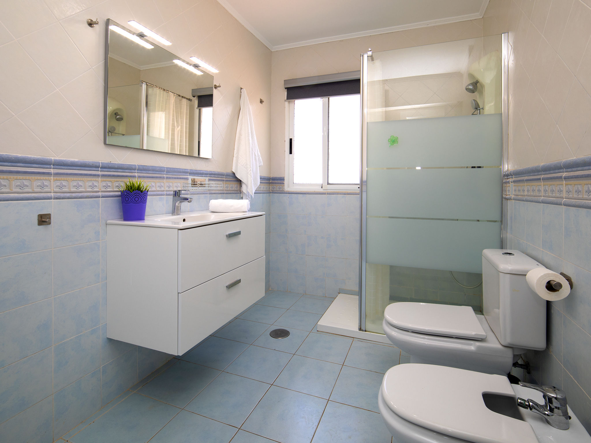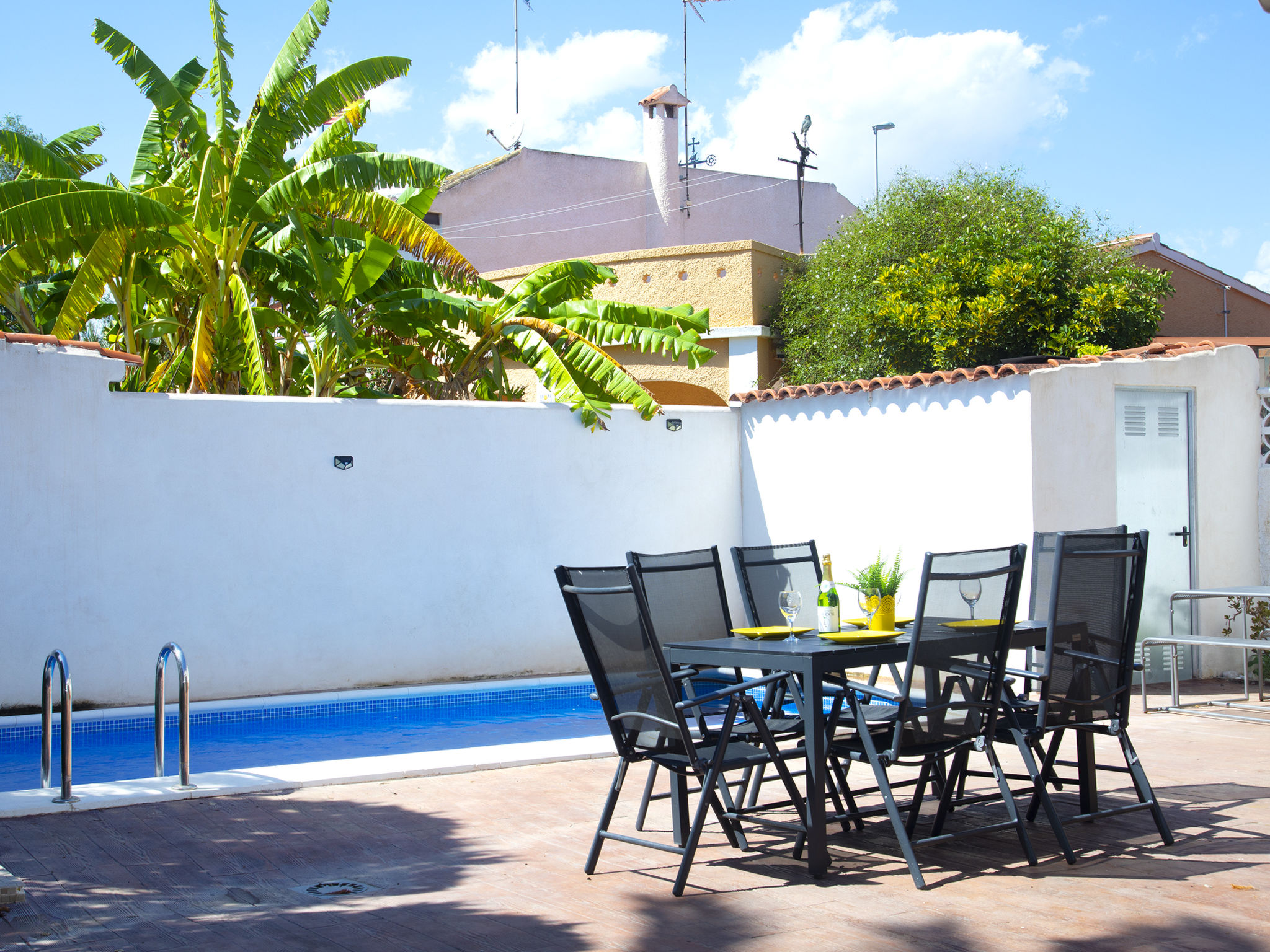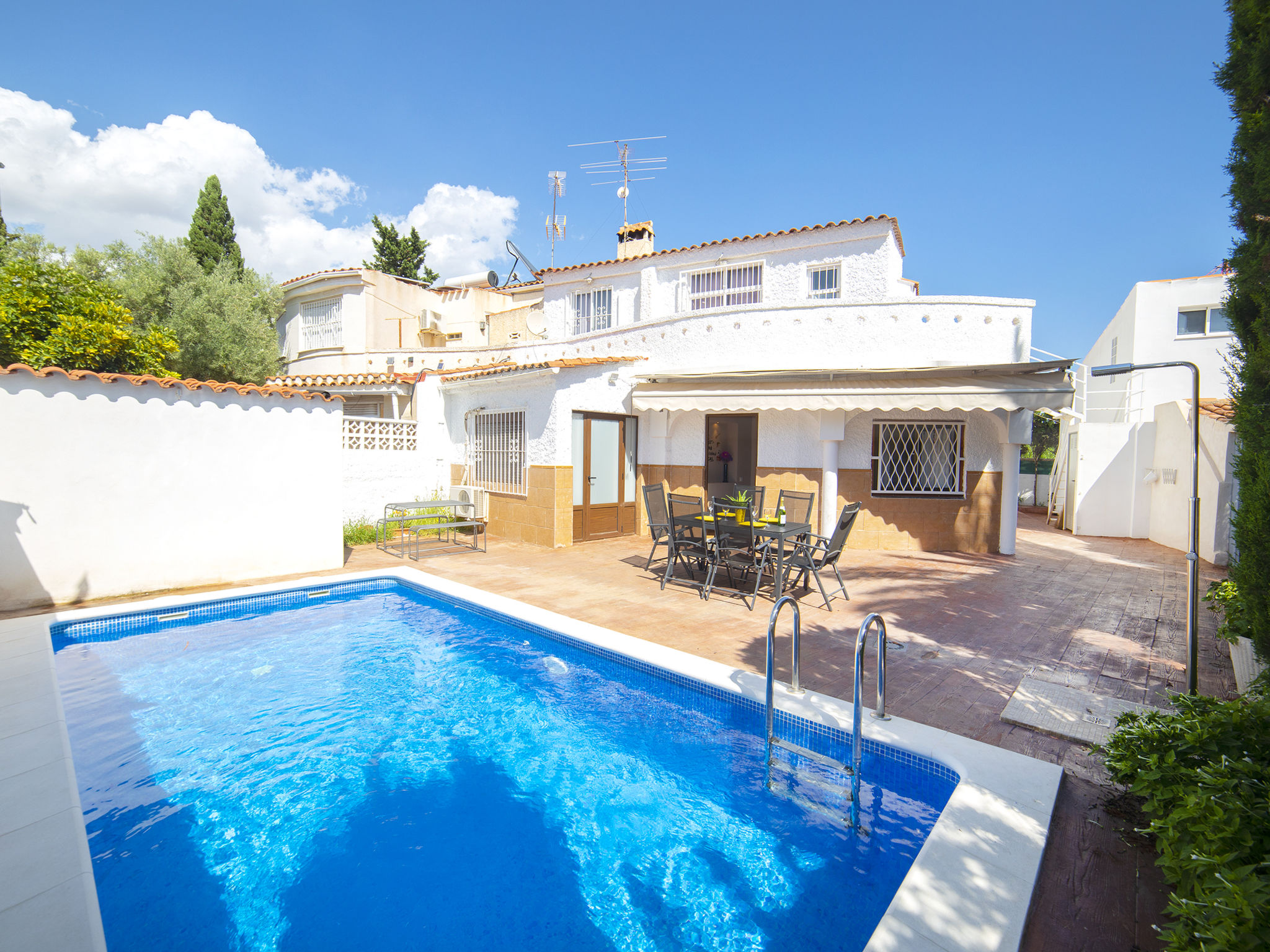 "Las Islas", 6-Zimmer-Reihenhaus 370 m2 auf 2 Stockwerken. Objekt geeignet für 10 Erwachsene. Geräumig und hell, teilweise abgeschrägt, vollständig renoviert im Jahre 2021, komfortabel und geschmackvoll eingerichtet: Wohn-/Esszimmer 32 m2 mit Digital-TV und Klimaanlage. Ausgang zur Terrasse, zum Schwimmbad. 1 Zimmer 16 m2 mit 1 franz. Bett (150 cm, Länge 190 cm), Klimaanlage. 2 Zimmer 8 m2, jedes Zimmer mit 2 Betten (90 cm, Länge 190 cm). Grosse Küche (Backofen, Geschirrspüler, 3 Induktionskochplatten, Toaster, Wasserkocher, Mikrowelle, Tiefkühler, elektrische Kaffeemaschine). Ausgang zur Terrasse, zum Schwimmbad. Dusche/WC. Obergeschoss: 12 m2, Studio mit 1 franz. Bett (135 cm, Länge 190 cm), Dusche/WC und Klimaanlage. Abgeschrägtes 7 m2, Studio, Deckenhöhe 50 - 190 cm mit 1 franz. Bett (135 cm, Länge 190 cm), TV und Klimaanlage. Dachgeschoss: Wohn-/Schlafzimmer mit 1 franz. Bett (135 cm, Länge 190 cm), Klimaanlage. Terrasse 18 m2. Terrassenmöbel, Liegestühle (2). Sicht auf das Schwimmbad und den Garten. Zur Verfügung: Waschmaschine, Bügeleisen, Kinderhochstuhl, Babybett bis 2 Jahre, Haartrockner. Internet (Wireless LAN, gratis). Parkplatz (1 Auto). Bitte beachten: ein Doppelzimmer liegt außerhalb der Wohnung. VT-4644002-A