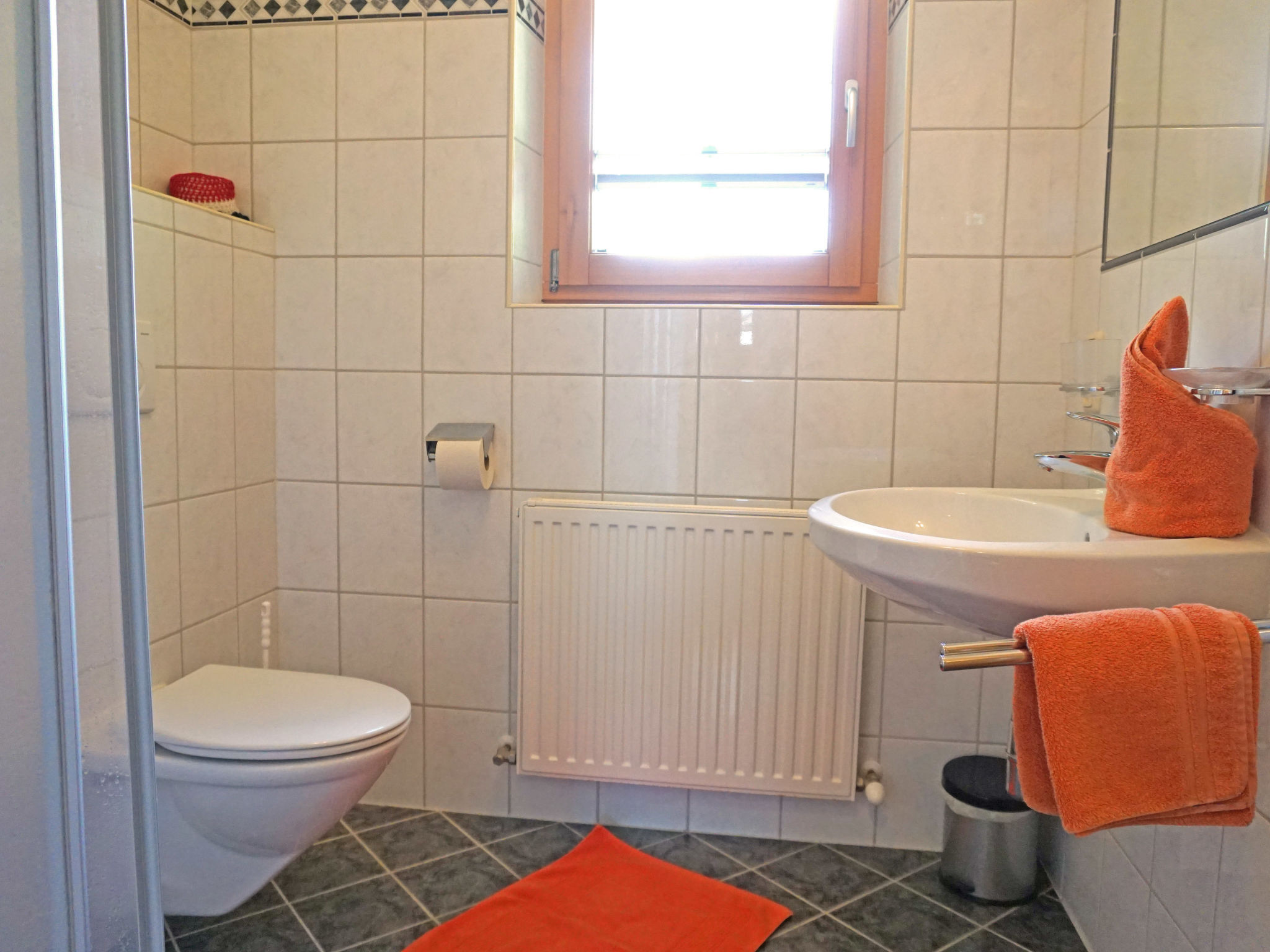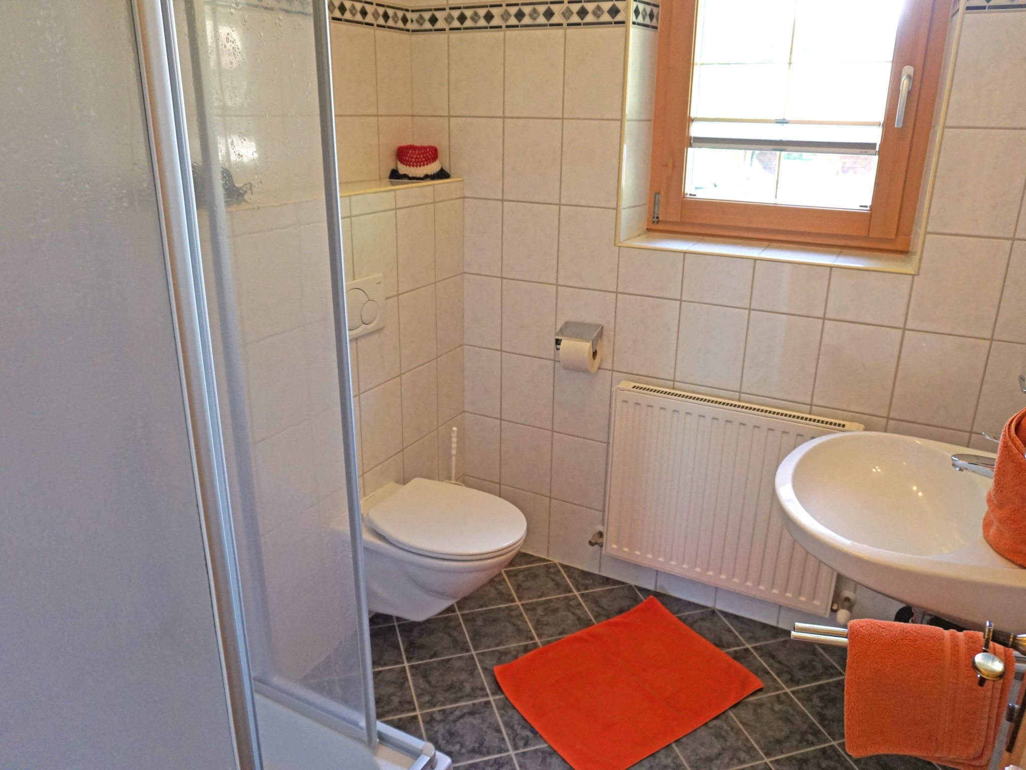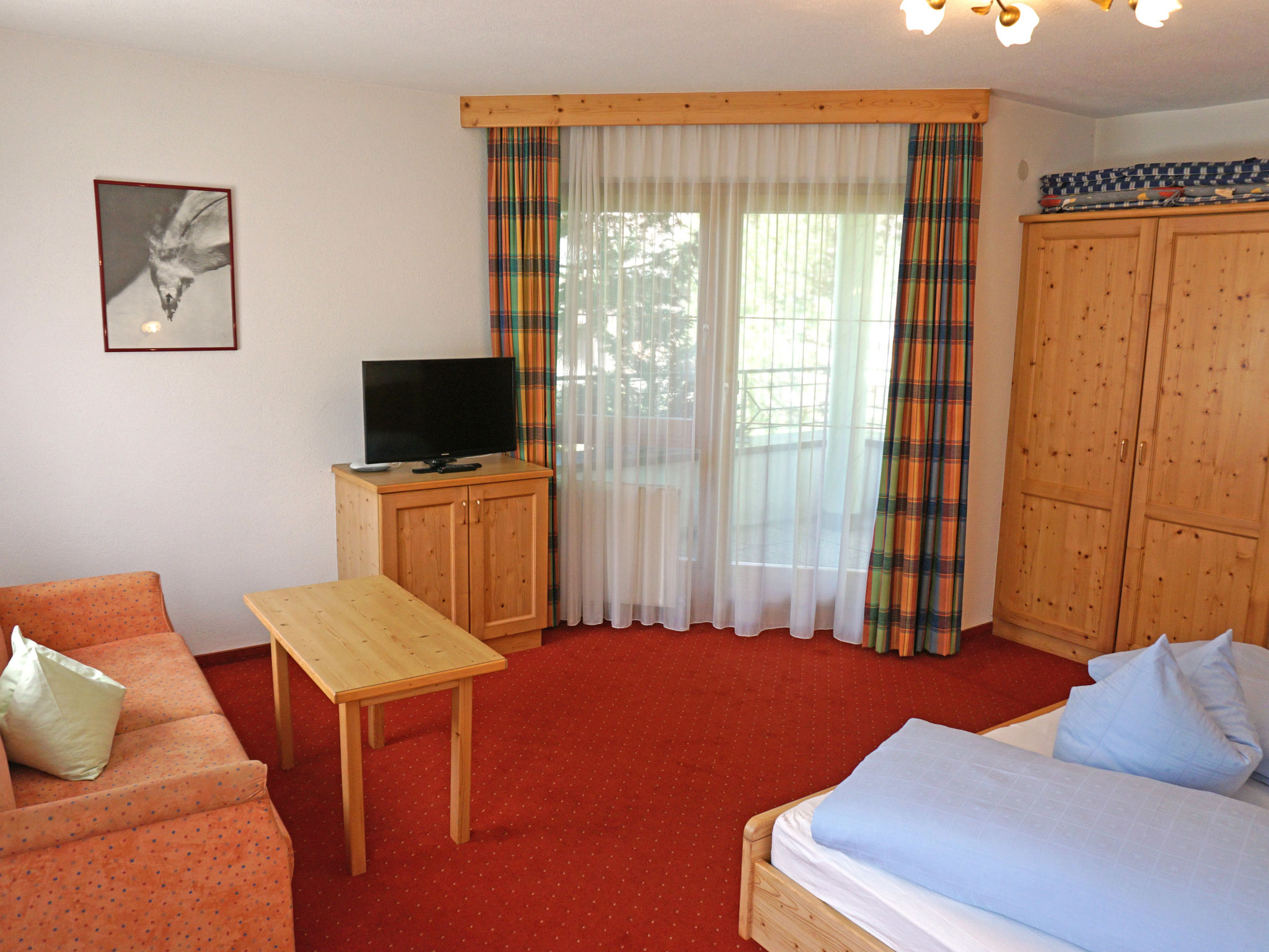 2-Zimmer-Wohnung 40 m2 im 1. Stock. Komfortabel und geschmackvoll eingerichtet: 1 grosses Zimmer mit 1 Doppeldiwanbett, 1 Doppelbett und Sat-TV. Wohnküche (Geschirrspüler, 2 Glaskeramikherd Platten, Mikrowelle, elektrische Kaffeemaschine) mit Essecke. Ausgang zum Balkon. Dusche/WC. Balkon, Terrasse. Terrassenmöbel. Schöne Sicht auf die Berge. Zur Verfügung: Internet (Wireless LAN, gratis).
