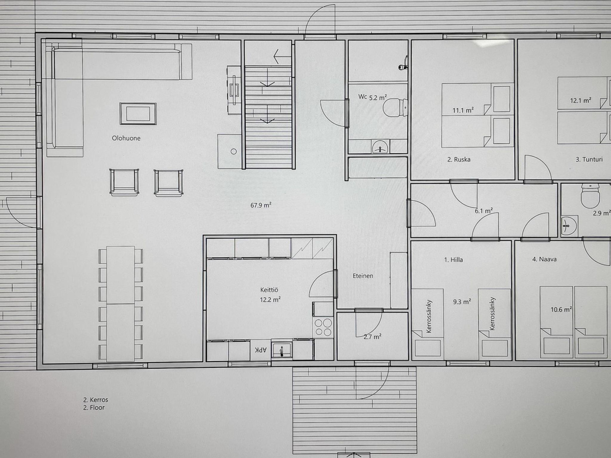Separates und geräumiges Blockferienhaus, am See Kitkajärvi. 40 km nördlich von Kuusamo, See Yli-Kitka 40 m. Blockhaus, Baujahr 1990 und 2020 renoviert, am Kap Kilkilönniemi, am See Yli-Kitka gelegen. Eigene Anlegestelle und Ruderboot. Im mittleren Stock, Küche, Wohnzimmer, Schlafzimmer 1-3: 2 Betten, Schlafzimmer 4: 2 Etagenbetten. Im Erdgeschoss Kaminraum, Waschraum, Sauna, Ankleideraum, Hauswirtschaftsraum und Hobbyraum (Tischtennisplatte). Im Obergeschoss: 8 Betten. Holzbeheizte Seesauna (für den Sommer, während 1.6.-30.9. verfügbar, gegen Aufpreis von €250), Kochhütte, Tischtennisplatte. Weitere Informationen: Internetverbindung 20 MB. Die Endreinigung ist im Preis inbegriffen. Weitere Entfernungen: Ruka 15 km, Oulanka-Nationalpark (Oulanka Besucherzentrum) 23 km, kurzer Pfad Karhunkierros 24 km. Buchungen beginnen um 16 Uhr und enden um 12 Uhr (auch bei Wochenendbuchungen).