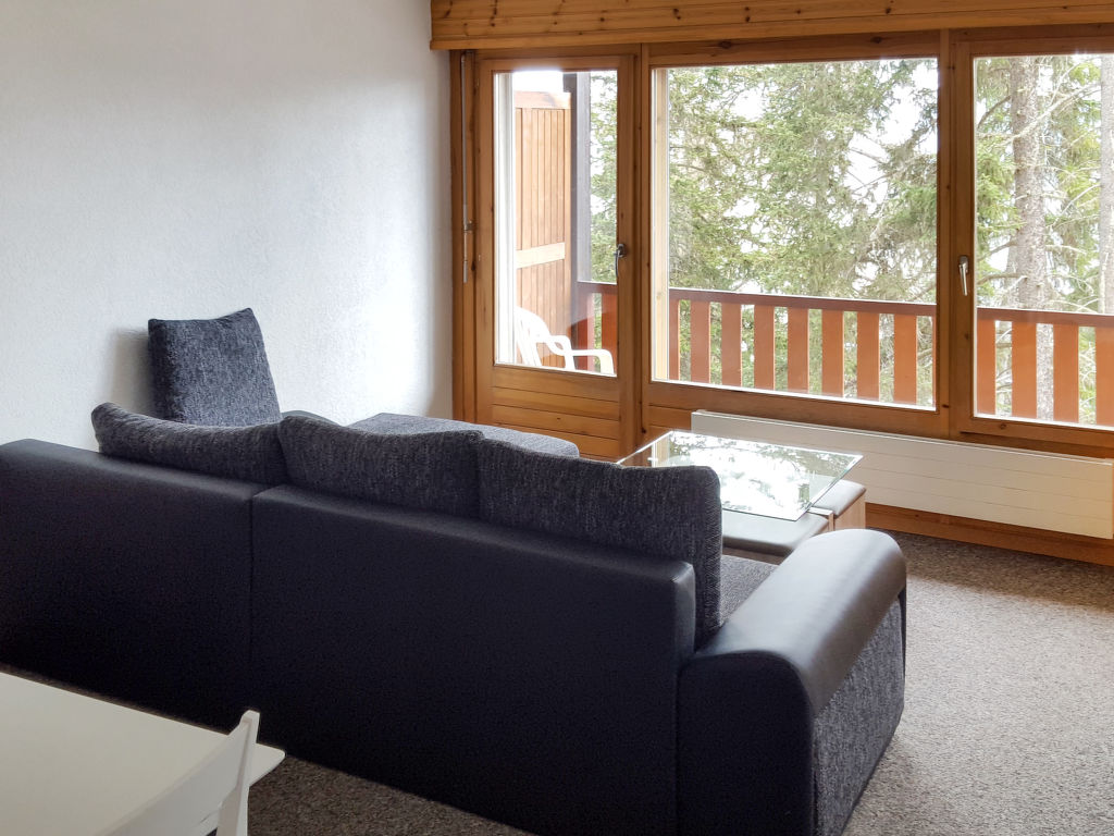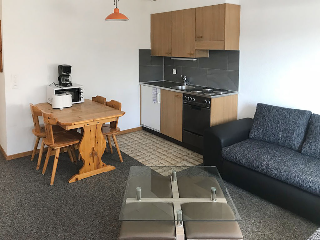 "Hameau D001", 1-Zimmer-Wohnung 42 m2. Geschmackvoll und gemütlich eingerichtet: Wohn-/Schlafzimmer mit 1 Doppeldiwanbett und Kabel-TV. Ausgang zum Balkon. Schlafnische mit 1 Doppelbett. Kleine, offene Küche (4 Kochplatten, Backofen, Mikrowelle, elektrische Kaffeemaschine). Dusche/WC. Balkon. Balkonmöbel. Herrliche Sicht auf die Berge, das Tal und die Landschaft. Zur Verfügung: Internet (Wireless LAN, extra). Bitte beachten: Nichtraucher-Unterkunft.