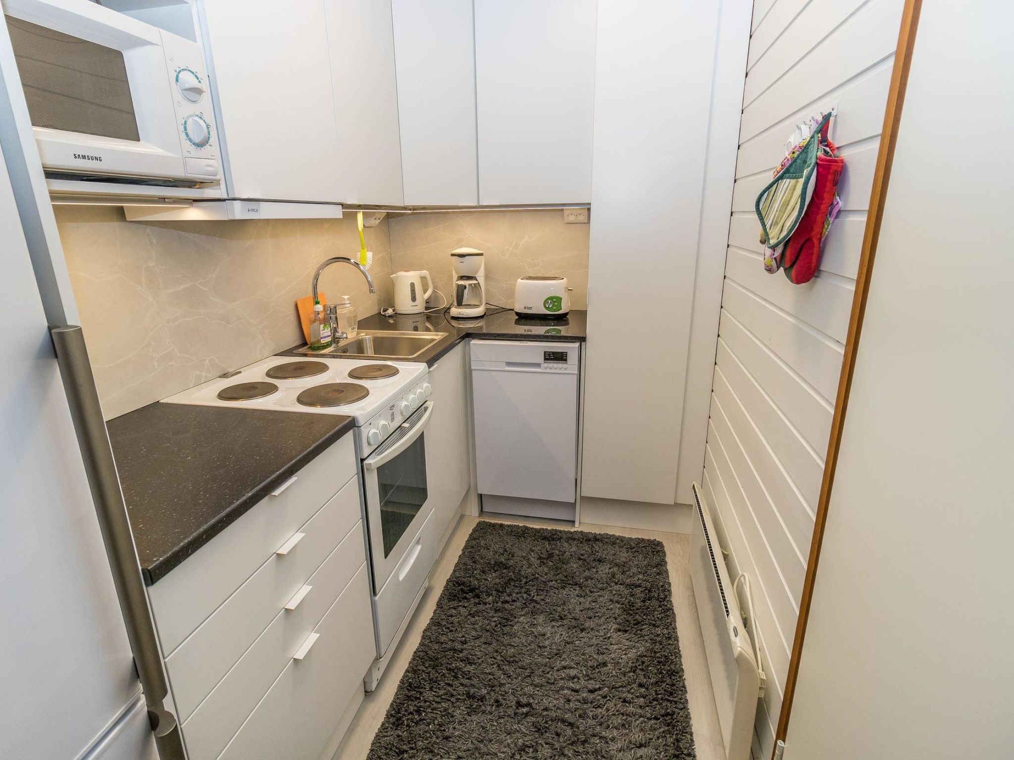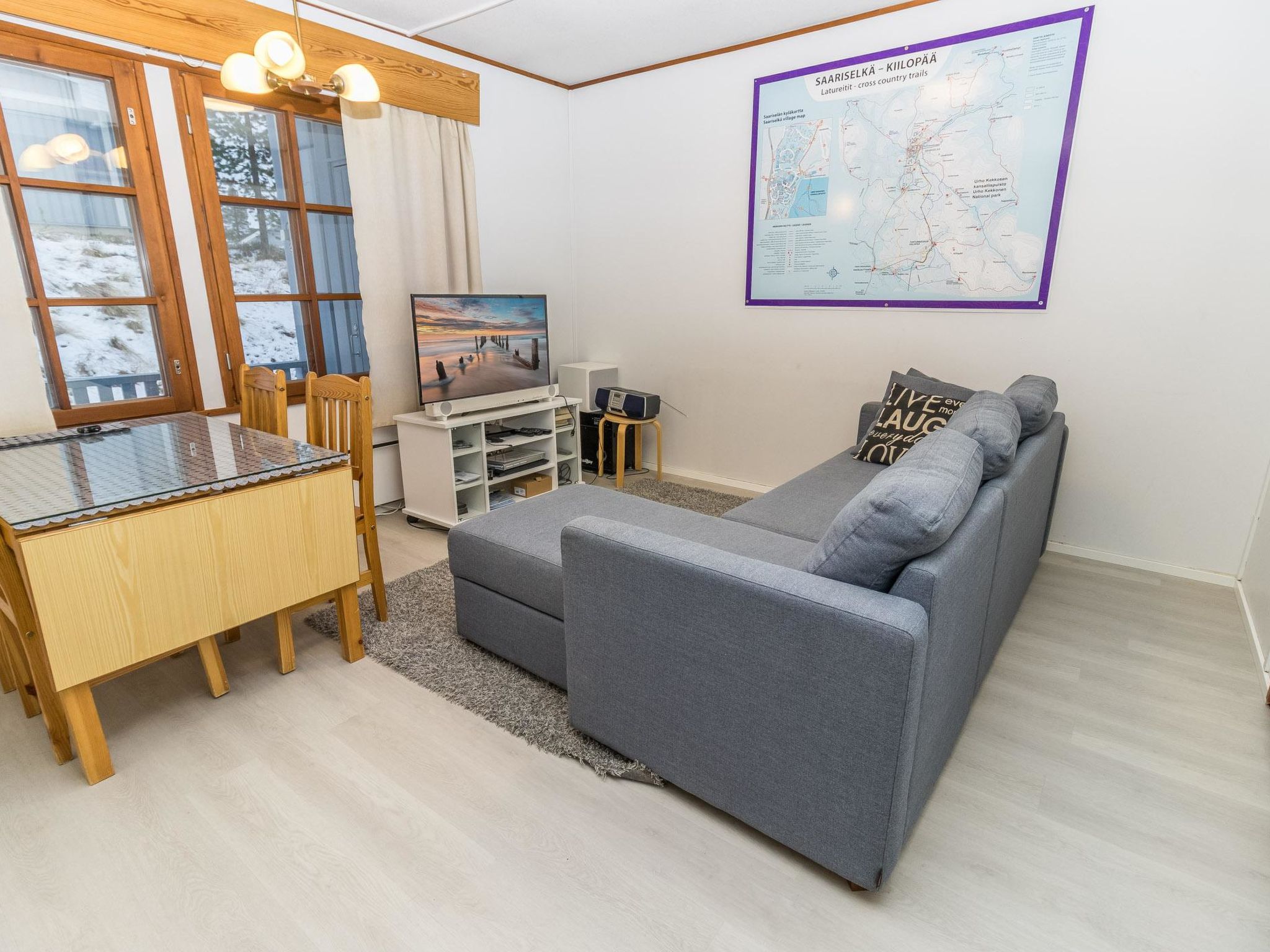 257 km nördlich von Rovaniemi, im Ferienort Saariselkä, Zentralbereich. Ferienwohnung im Holz-Reihenhaus, Baujahr 1979, renoviert 2014, Wohnzimmer mit Schlafcouch/Bett, Kochnische, Schlafzimmer mit 2 Betten, Sauna (Elektroherd), Waschraum, WC, Diele, Abstellraum. Zur Austattung der Ferienwohnung gehören auch drahtlose Intenetverbindung (WLAN), Smart-TV und Karaoke-Anlage. Die Ferienwohnung befindet sich im Zentrum von Saariselkä, nur wenige Gehminuten von den wichtigsten Dienstleistungen (Spa, Restaurants, Geschäfte usw.). Haustiere sind erlaubt, es wird aber eine Haustier-Gebühr (von € 41) erhoben und zur Buchung hinzugefügt, wenn der Kunde Haustiere mitbringt.