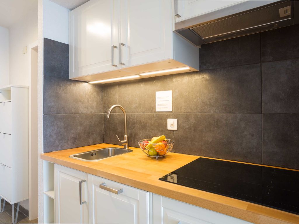 "Greppon 107", 1-Zimmer-Studio 29 m2 im 4. Stock. Komfortabel und stilvoll eingerichtet: Wohn-/Schlafzimmer mit 1 Doppeldiwanbett (140 cm, Länge 200 cm), 1 Doppelwandklappbett (2 x 80 cm, Länge 190 cm). Ausgang zum Balkon. Offene Küche (Geschirrspüler, 4 Glaskeramikherd Platten, Mikrowelle). Bad/WC. Balkon, Ostlage. Balkonmöbel. Sehr schöne Sicht auf die Berge, die Skipiste und die Landschaft. Zur Verfügung: Internet (Wireless LAN, extra). Parkplatz (extra), Garage (extra). Bitte beachten: Nichtraucher-Unterkunft.