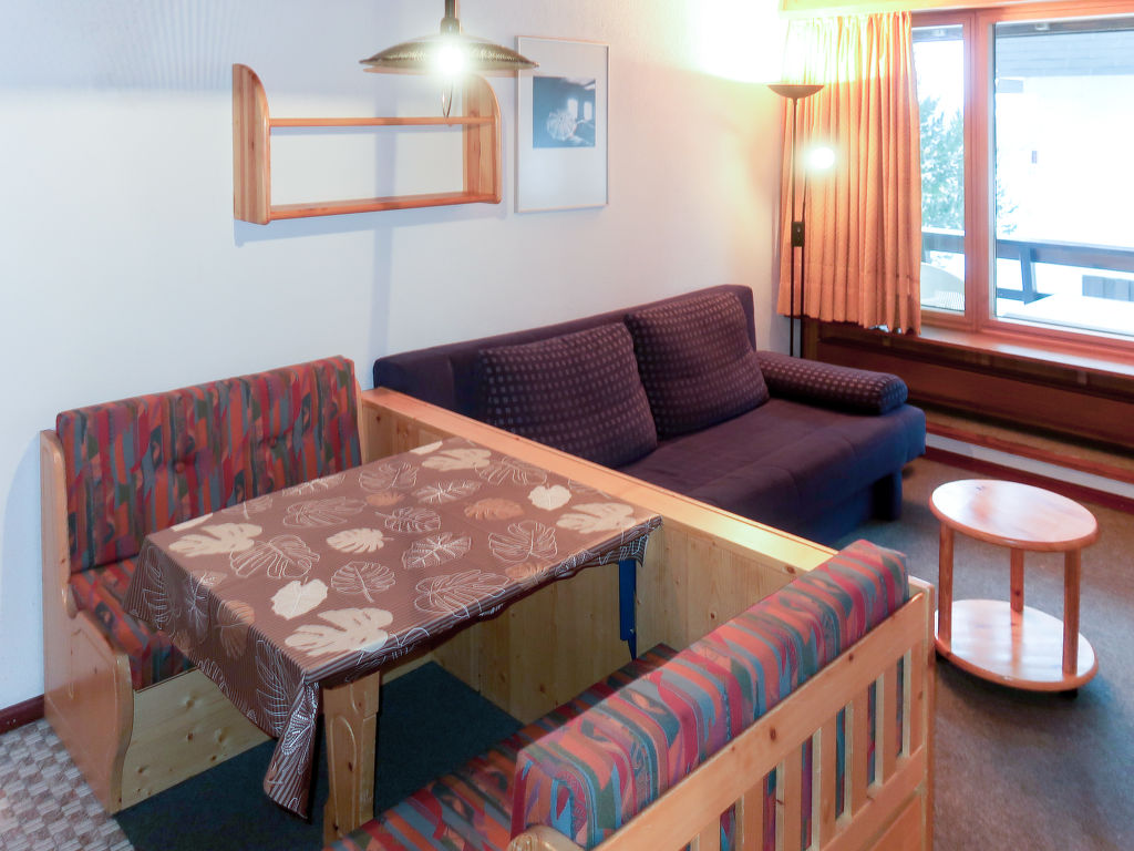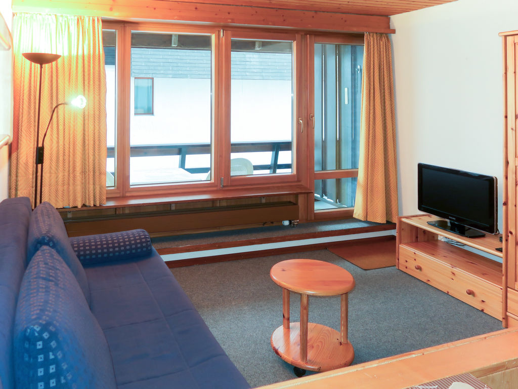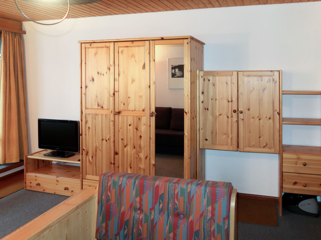 "Résidence Dixence", 1-Zimmer-Studio im 1. Stock. Zweckmässig eingerichtet: Wohn-/Schlafzimmer mit 1 Doppeldiwanbett (160 cm, Länge 200 cm), Essecke und Kabel-TV. Ausgang zum Balkon. Offene Küche (2 Kochplatten). Bad/WC. Balkon. Balkonmöbel. Zur Verfügung: Internet (Wireless LAN, extra). Bitte beachten: Nichtraucher-Unterkunft.