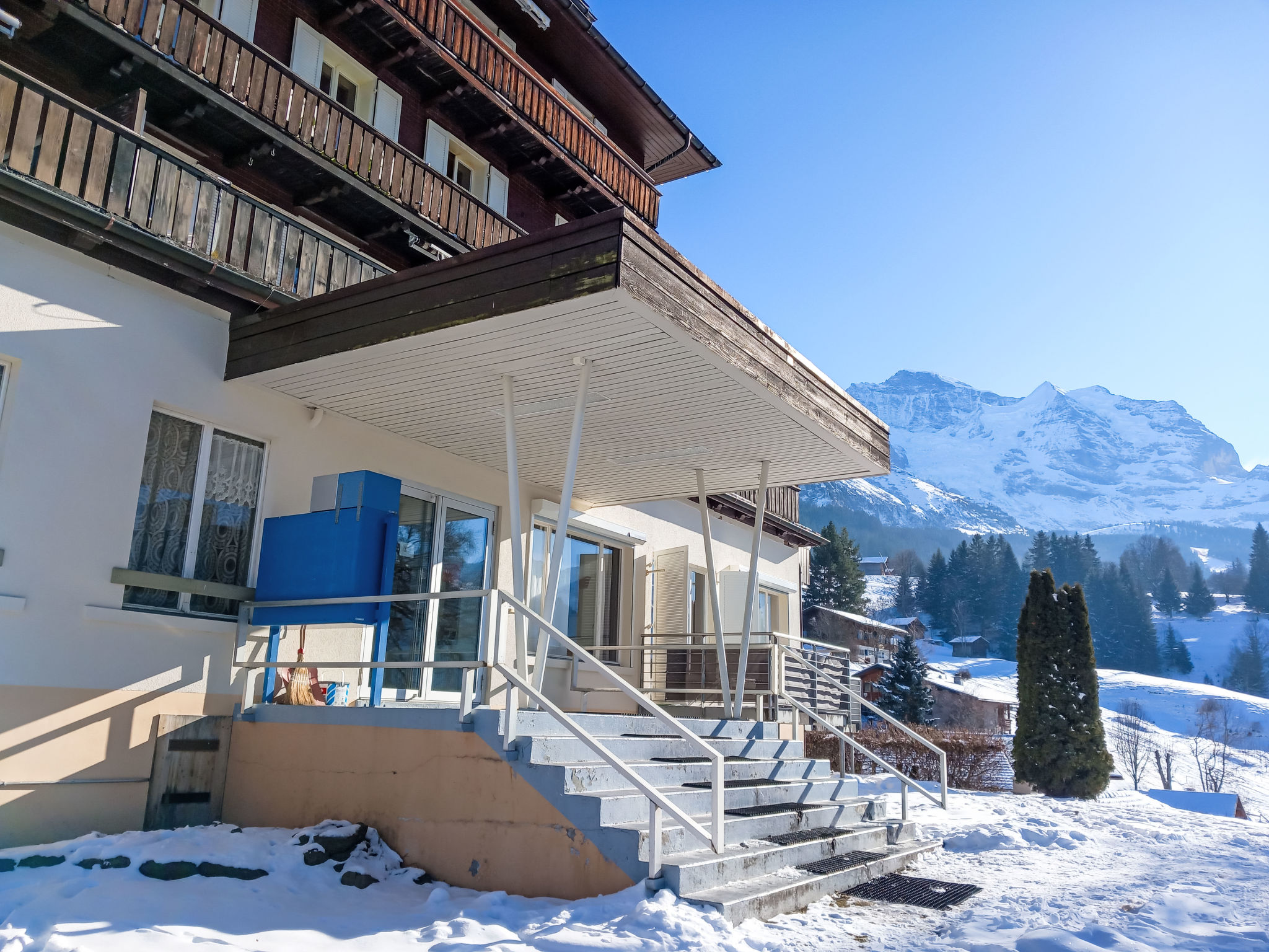 Appartementhaus "Bristol". 600 m vom Zentrum von Wengen, ruhige Lage am Hang. Im Hause: Fahrstuhl, Zentralheizung. Einkaufsservice vor Anreise möglich. 50 m Fussweg bis zum Haus. Einkaufsgeschäft, Supermarkt 600 m, Restaurant 300 m, Bar, Bäckerei 600 m, Zentrum zu Fuss in 7 Minuten erreichbar, Bahnstation "Wengen" 600 m, Freibad 700 m. Luftseilbahn, Skisportanlagen 600 m, Kinderspielplatz 300 m. Bitte beachten: autofreie Ferienanlage. Die Anreise erfolgt mit der Bergbahn. In diesem Haus sind weitere Ferienwohnungen mietbar. Anreise ist nur mit dem Zug ab Lauterbrunnen möglich – 14 Min. Fahrzeit.