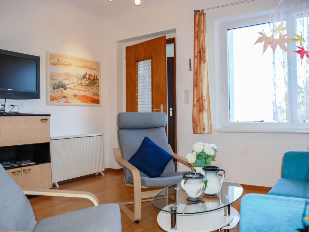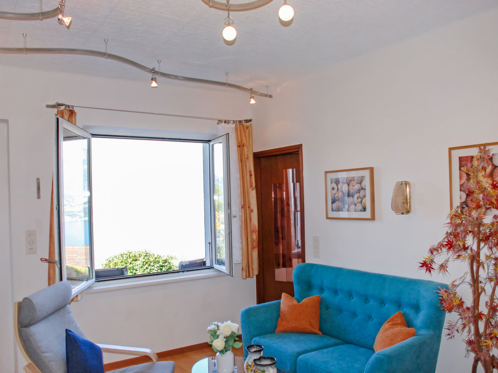 "Wohnung EG", 3-Zimmer-Wohnung 55 m2, im Erdgeschoss. Hell, komfortabel und gemütlich eingerichtet: Wohn-/Esszimmer mit Essecke und Sat-TV (Flachbildschirm), Radio, CD, Stereoanlage und E-Heizung. 1 Doppelzimmer mit 1 Doppelbett (1 x 160 cm, Länge 200 cm). 1 kleines Zimmer mit 1 x 2 Etagenbetten (90 cm, Länge 200 cm). Küche (Mini-Backofen, Geschirrspüler, 4 Glaskeramikherd Platten, Tiefkühler). Dusche/WC. Gartensitzplatz teilweise überdacht. Terrassenmöbel, Gartengrill, Liegestühle (4), Abstellkammer. Herrliche Panoramasicht auf den See, die Berge und die Landschaft. Zur Verfügung: Kinderhochstuhl, Babybett bis 2 Jahre (extra), Haartrockner. Internet (Wireless LAN, gratis). Parkplatz (überdacht) beim Haus. Bitte beachten: Nichtraucher-Unterkunft. Maximal 1 kleines Haustier/Hund erlaubt. Rauchmelder, Feuerlöscher.