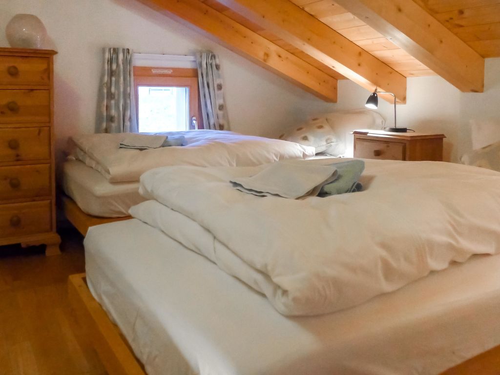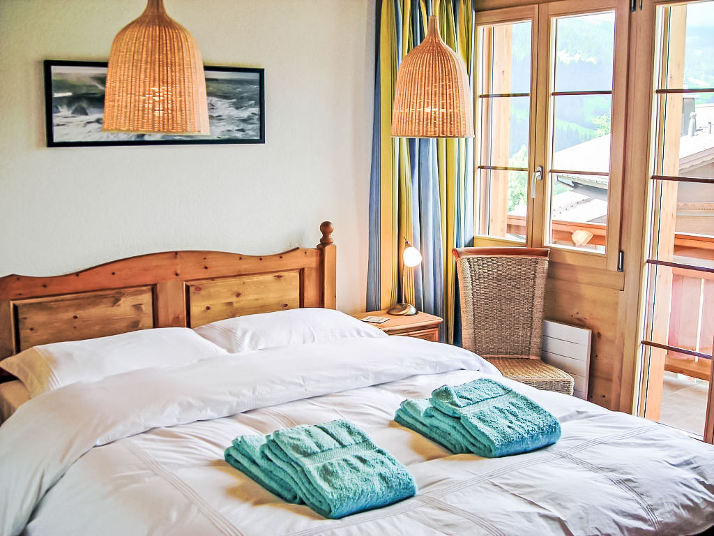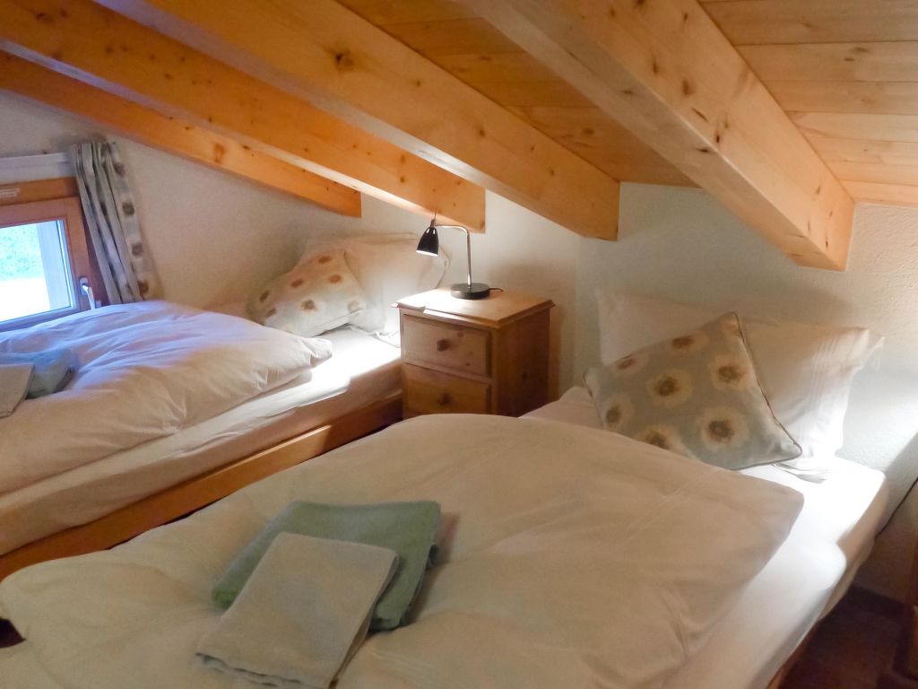 5-Zimmer-Wohnung 130 m2, im Dachgeschoss, Südlage. Teilweise abgeschrägt, geschmackvoll und gemütlich eingerichtet: abgeschrägtes Wohn-/Esszimmer mit Schwedenofen und Sat-TV (Flachbildschirm), Stereoanlage. Ausgang zum Balkon, Richtung Süden und Richtung Westen. 1 Zimmer mit 2 Betten (90 cm, Länge 200 cm). Ausgang zum Balkon. 1 Zimmer mit 1 franz. Bett (160 cm, Länge 200 cm). Ausgang zum Balkon. 1 Zimmer mit 2 Betten (90 cm, Länge 200 cm), Dusche/WC. Ausgang zum Balkon. 1 abgeschrägtes kleines Zimmer 10 m2 mit 2 Betten (90 cm, Länge 200 cm). Offene Küche (Backofen, Geschirrspüler, 4 Glaskeramikherd Platten, elektrische Kaffeemaschine, Fondue Set (Chinoise, Käse)). Bad/WC, Dusche/WC. Fussbodenheizung. Natursteinböden. Grosser Balkon, Südlage und Westlage Balkon, Ostlage. Balkonmöbel. Herrliche Sicht auf die Berge und Fiescherwand. Zur Verfügung: Haartrockner, Holz (extra). Internet (Wireless LAN, gratis). Parkplatz Nr. Besucher, Garage Nr. 6 & 7 (2 Autos) beim Haus, Höhe 200 cm. Bitte beachten: Nichtraucher-Unterkunft. Feuerlöscher, kein Fahrstuhl. Bei Belegung mit weniger Personen als der maximalen Personenzahl stehen nicht alle Schlafzimmer zur Verfügung.