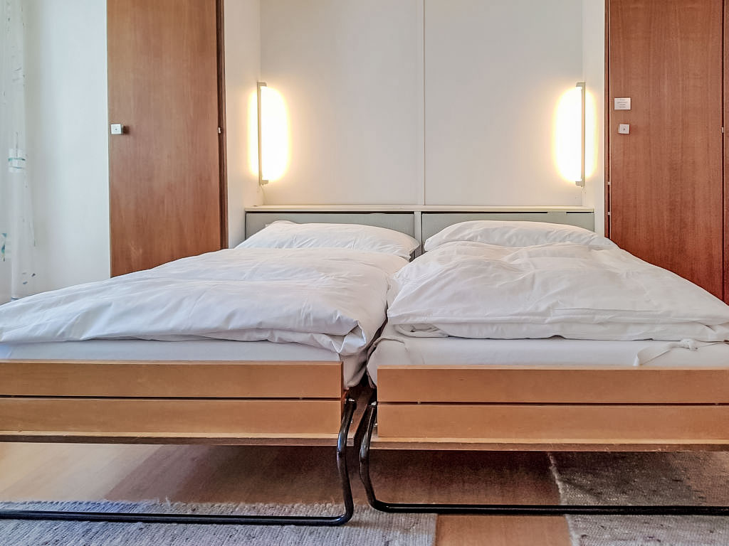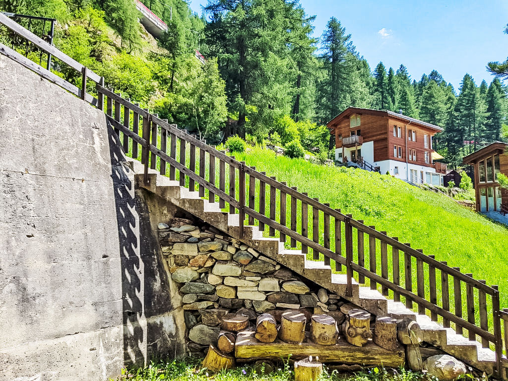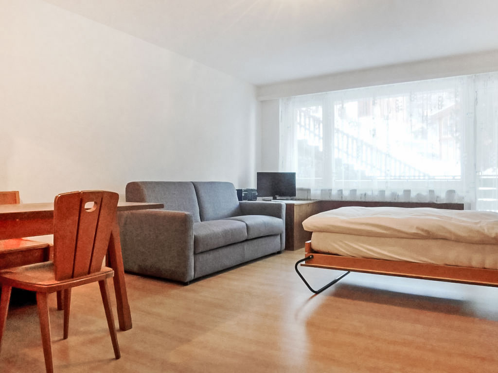 1-Zimmer-Wohnung 40 m2, im erhöhten Erdgeschoss. Einfach und komfortabel eingerichtet: Wohn-/Schlafzimmer mit 2 Wandklappbetten (90 cm, Länge 200 cm), Esstisch und TV. Ausgang zum Balkon. Küche (3 Kochplatten, Backofen, Toaster, Wasserkocher, Tiefkühler, elektrische Kaffeemaschine). Bad/WC. Balkon 8 m2, Südlage. Balkonmöbel. Sicht auf die Berge. Zur Verfügung: Haartrockner. Internet (Wireless LAN, gratis). Bitte beachten: Nichtraucher-Unterkunft. Maximal 1 Haustier/Hund erlaubt. Die Sicht auf das Matterhorn, wird durch 2 Bäume behindert.