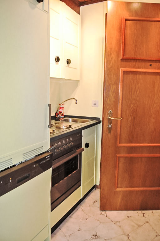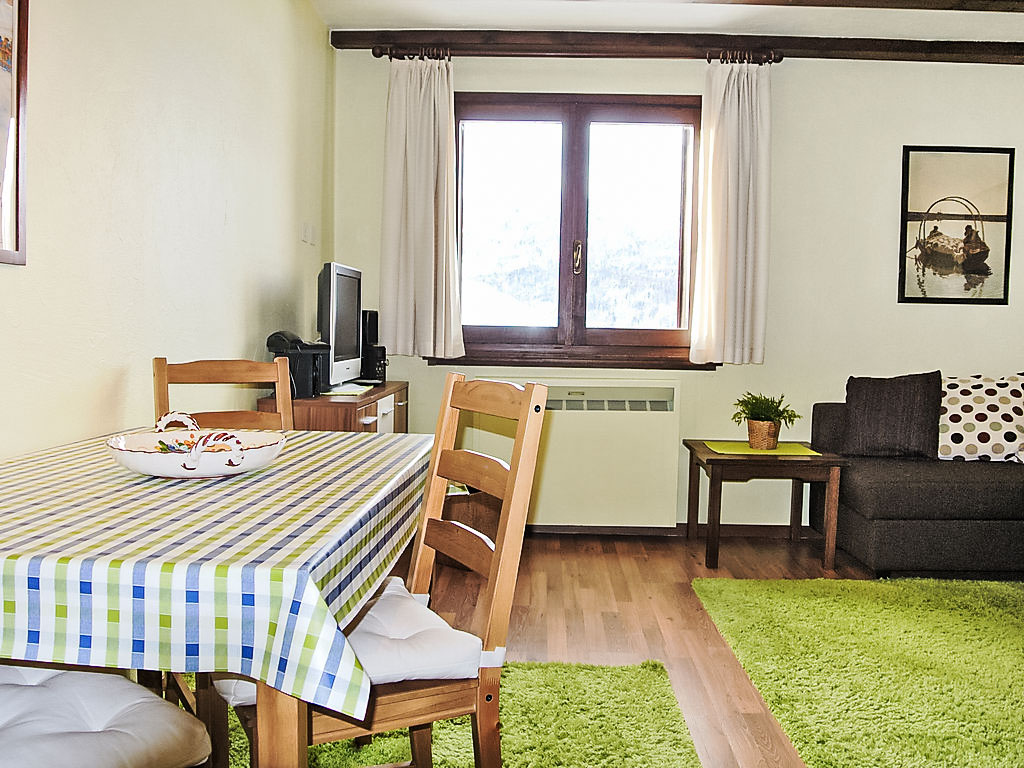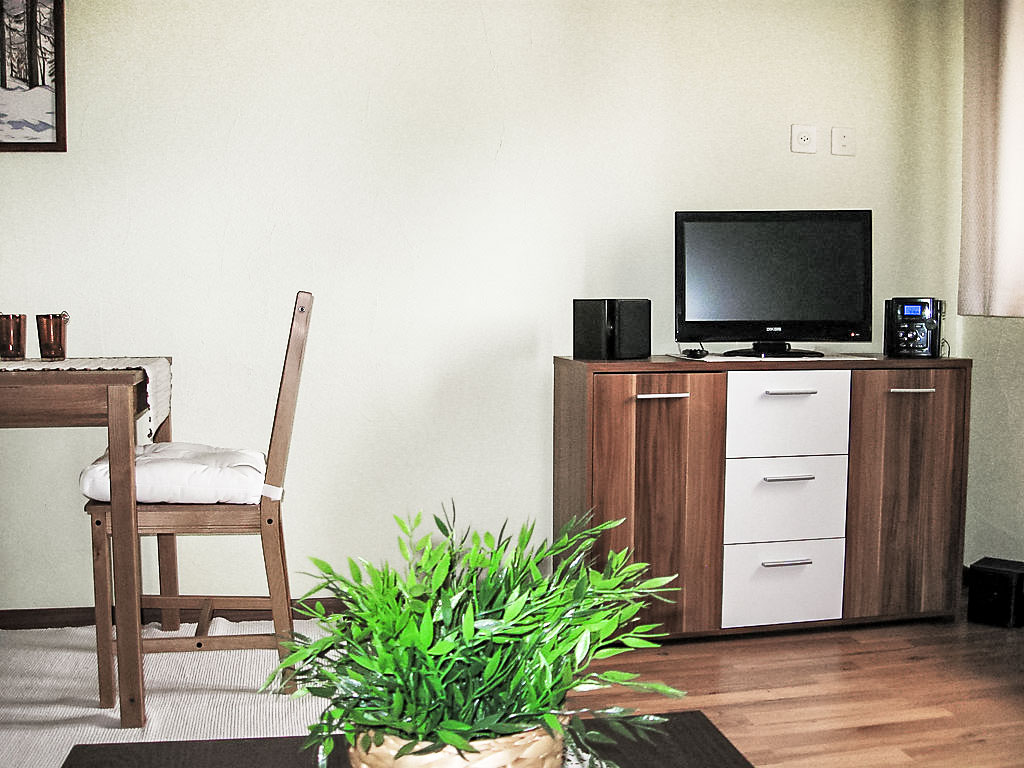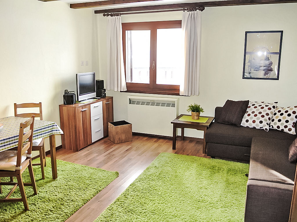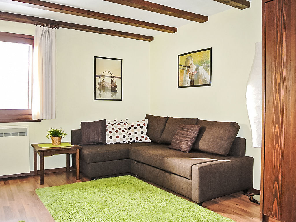 "77-5", 1-Zimmer-Wohnung 27 m2, im Erdgeschoss, Südlage. Geschmackvoll eingerichtet: Wohn-/Esszimmer mit 1 Doppeldiwanbett, TV und Radio. Kochnische im Eingang (Backofen, Geschirrspüler). Dusche/WC. Schöne Sicht auf die Berge. Zur Verfügung: Internet (Wireless LAN, extra). Garage (extra).