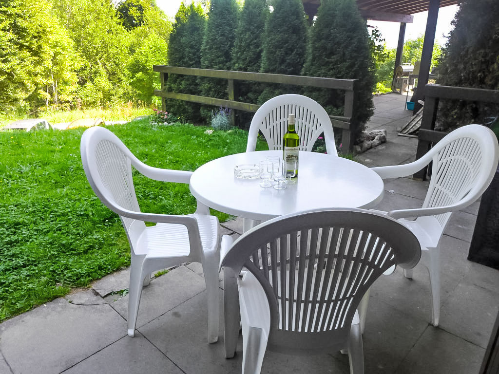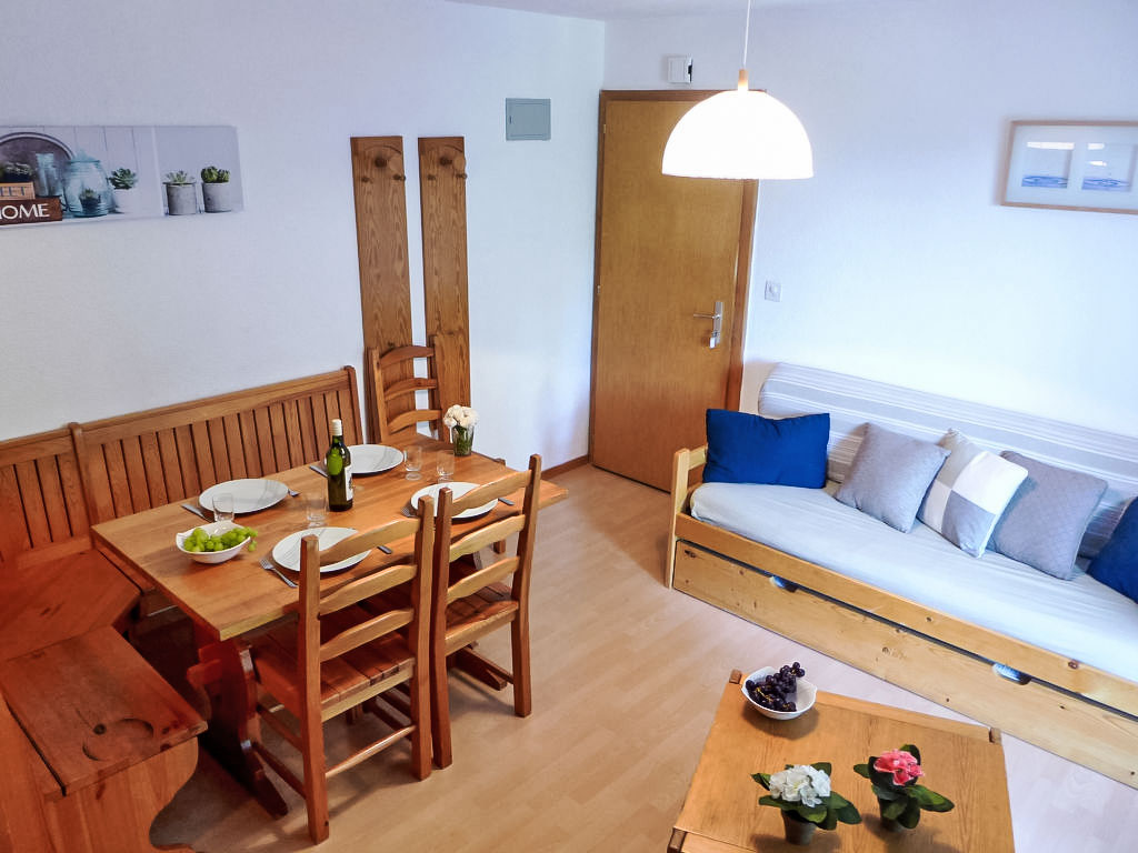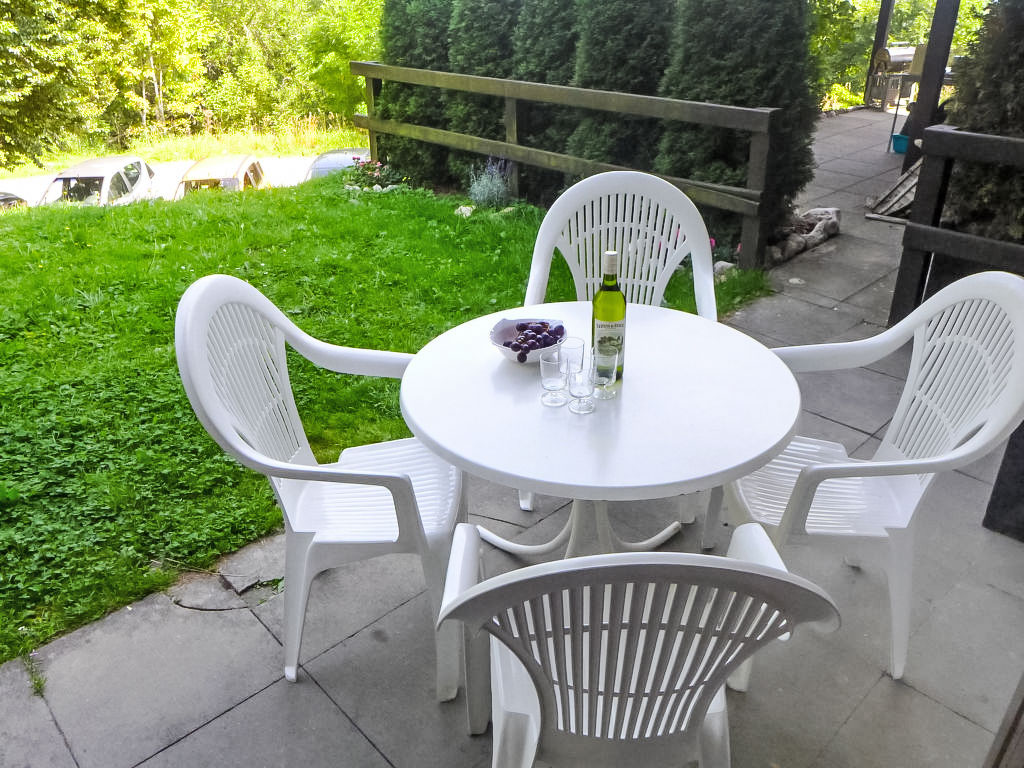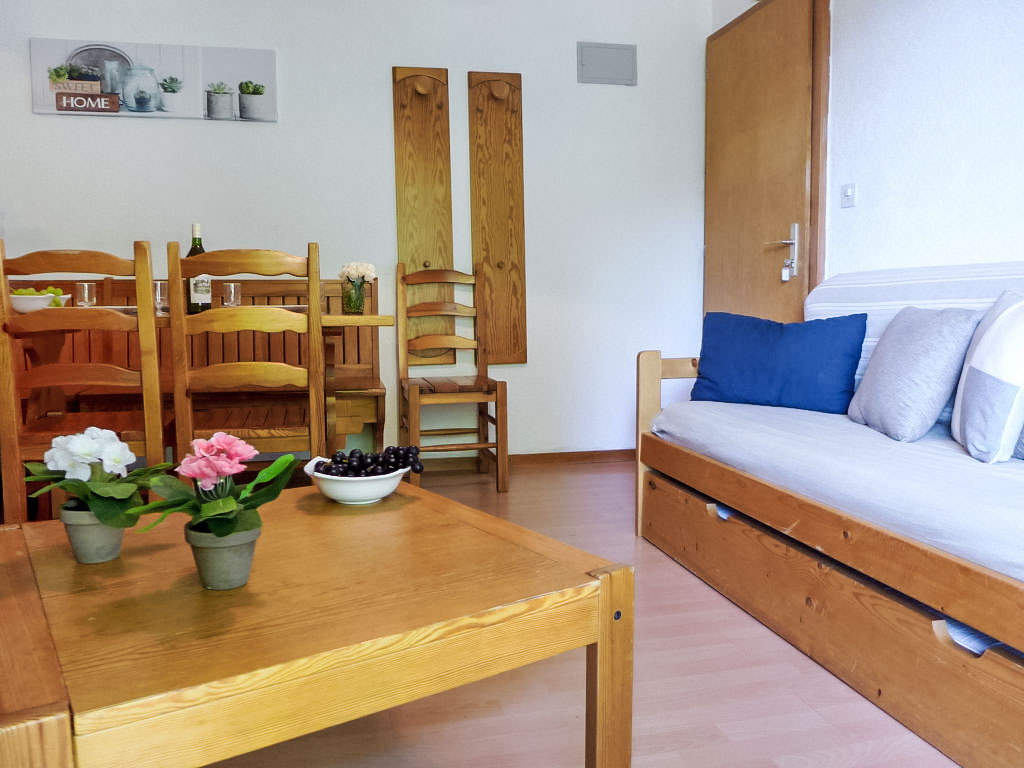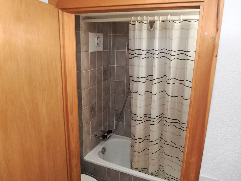 3-Zimmer-Wohnung 72 m2 auf 3 Stockwerken, im Erdgeschoss, Nordostlage. Einfach und zweckmässig eingerichtet: Wohn-/Esszimmer mit 1 Diwanbett, Schwedenofen, Esstisch, Kabel-TV und Heizofen. Ausgang zur Terrasse. Kochnische (4 Kochplatten, Backofen, Fondue Set (Käse)). Heizung. Obergeschoss: 1 Zimmer mit 1 franz. Bett (140 cm, Länge 190 cm). Ausgang zum Balkon. Bad/WC. 2. Obergeschoss: 1 abgeschrägtes Zimmer mit 2 Betten. Dusche/WC. Balkon, Terrasse. Terrassenmöbel. Eingeschränkte Sicht auf die Berge und das Tal. Parkplatz (eingezäunt). Maximal 1 Haustier/Hund erlaubt.