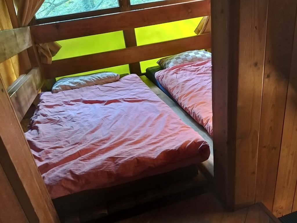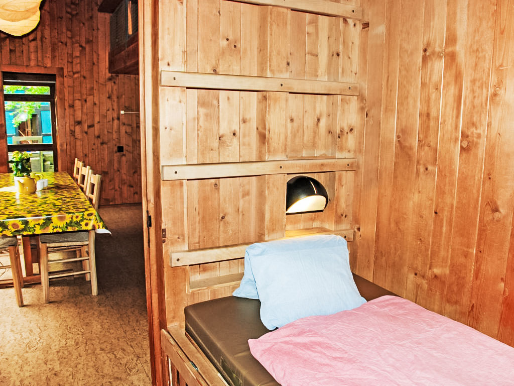 "Typ 10 MEDIUM", 6-Zimmer-Bungalow auf 2 Stockwerken. Teilweise abgeschrägt, sehr einfach und zweckmässig eingerichtet: offenes Wohn-/Esszimmer mit Esstisch. Ausgang zum Balkon. 4 abgeschrägte, offene Zimmer, jedes Zimmer mit 1 Bett (90 cm, Länge 200 cm). Kleine, offene Küche (3 Kochplatten, Backofen). Dusche/WC, sep. WC. Boiler. Obergeschoss: Galerie mit 2 Betten (90 cm, Länge 200 cm). 2 abgeschrägte, offene Zimmer, jedes Zimmer mit 2 Betten (90 cm, Länge 200 cm). Balkon. Abstellkammer. Bitte beachten: geeignet für Familien. Nichtraucher-Haus. 1 Haustier/Hund erlaubt.