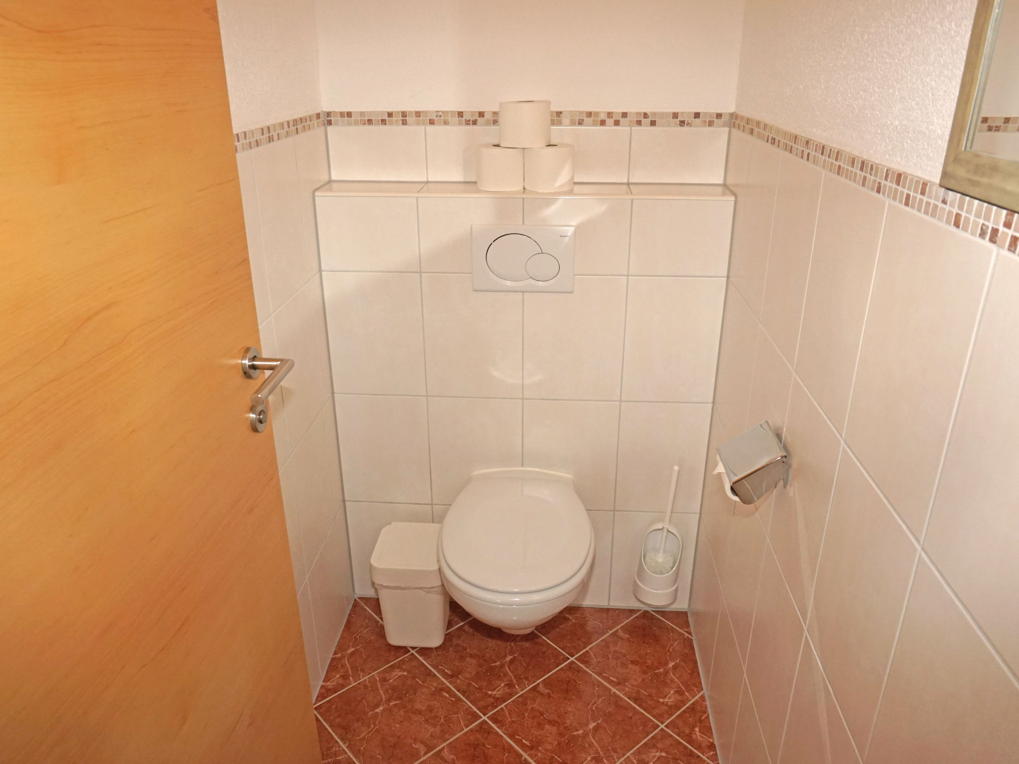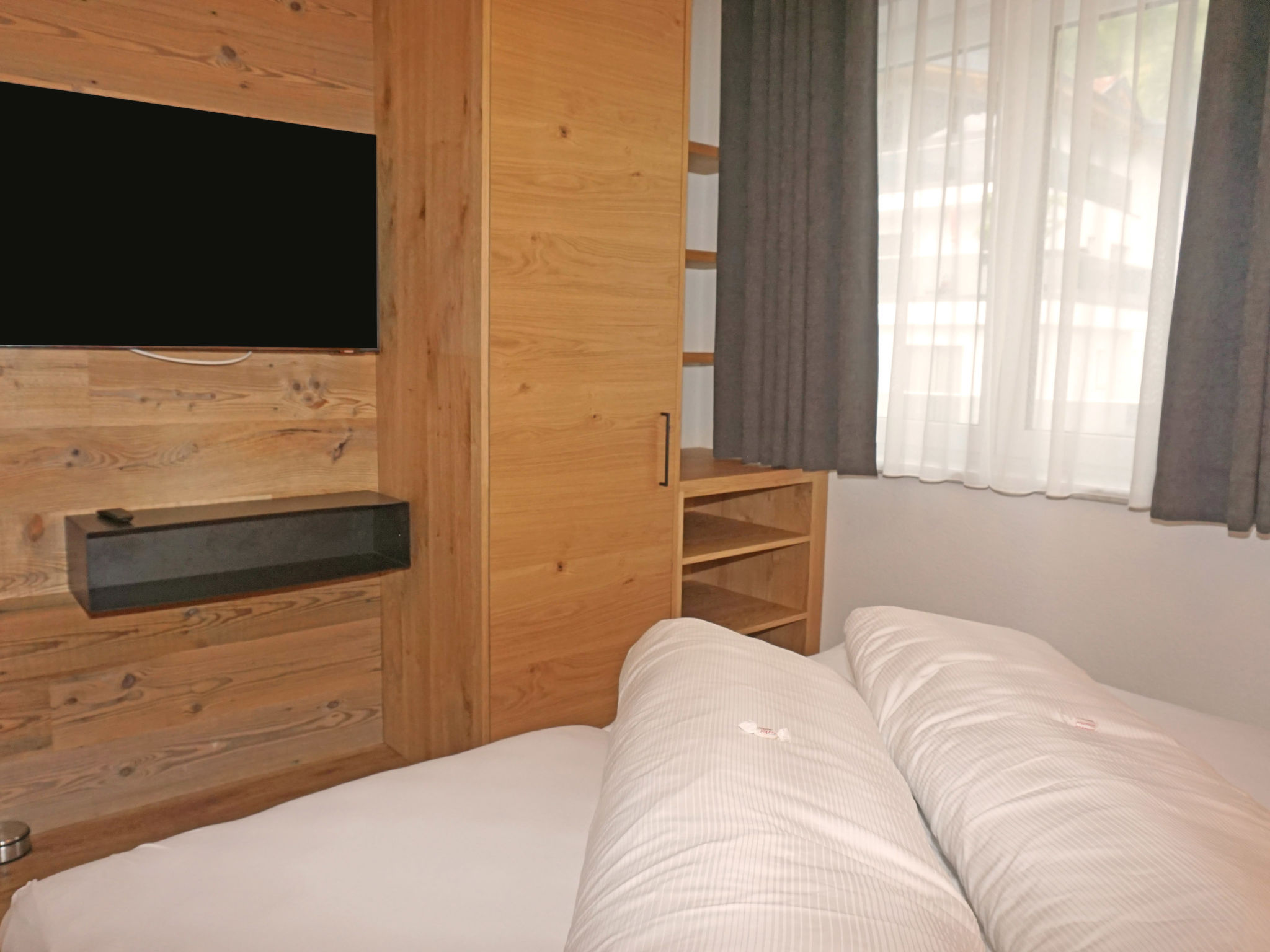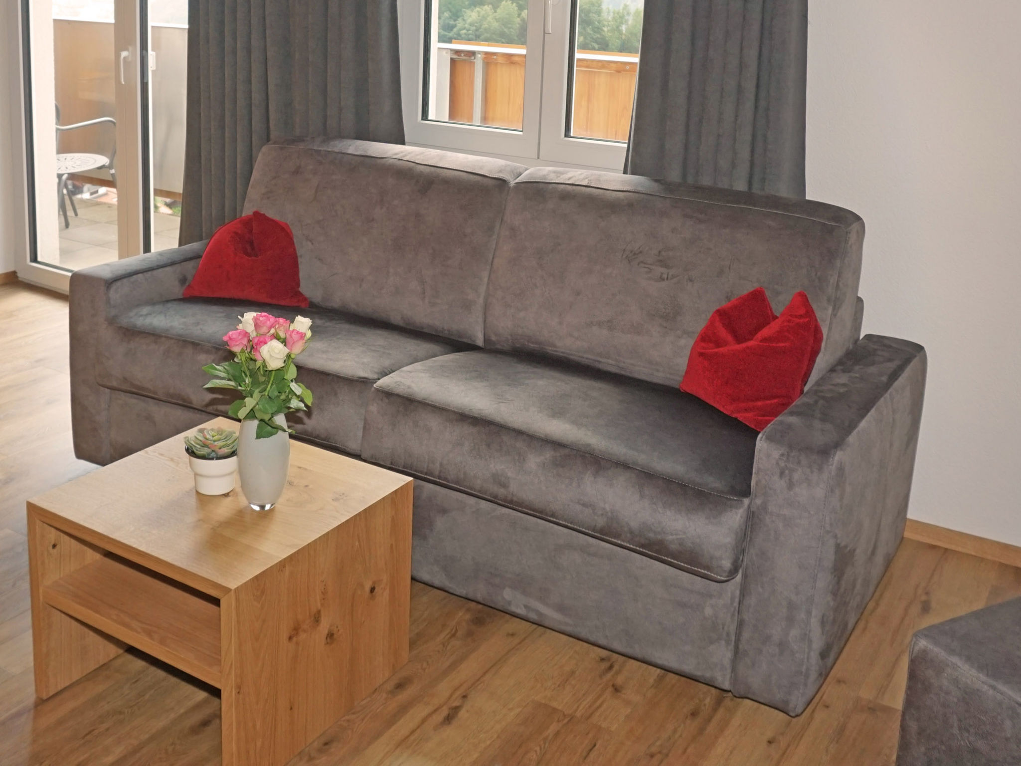 4-Zimmer-Wohnung 85 m2 im 2. Stock. Komfortabel und geschmackvoll eingerichtet: Eingang. 2 Doppelzimmer. 1 abgeschrägtes Zimmer mit 3 Betten. Wohnzimmer mit Kabel-TV. Ausgang zur Terrasse. Offene Küche (Geschirrspüler, 4 Glaskeramikherd Platten, Mikrowelle) mit Essecke. 2 Duschen/WC, sep. WC. Terrasse 10 m2. Terrassenmöbel. Herrliche Panoramasicht auf die Landschaft. Zur Verfügung: Safe, Haartrockner. Internet (Wireless LAN, gratis). Bitte beachten: Nichtraucher-Unterkunft.