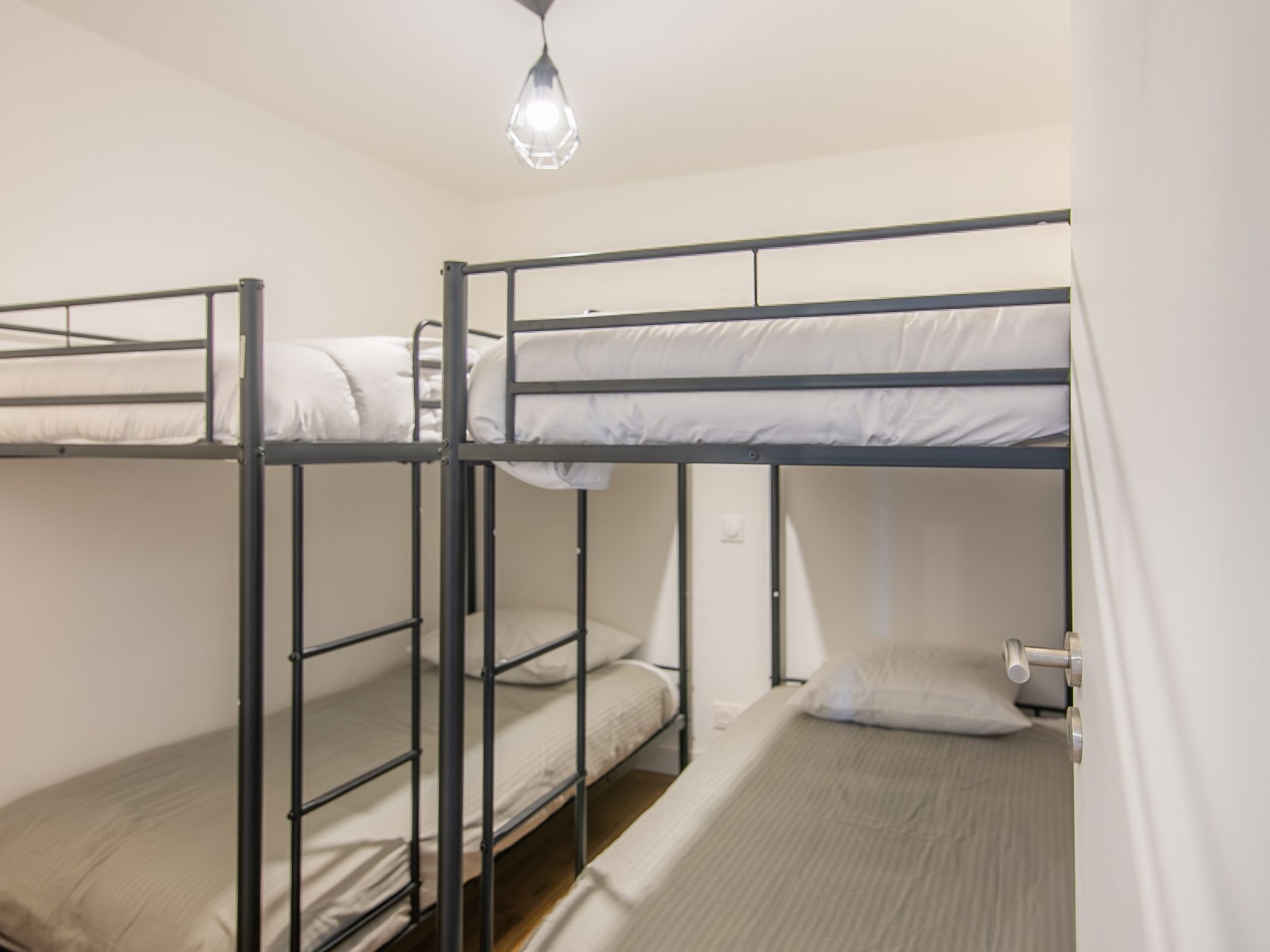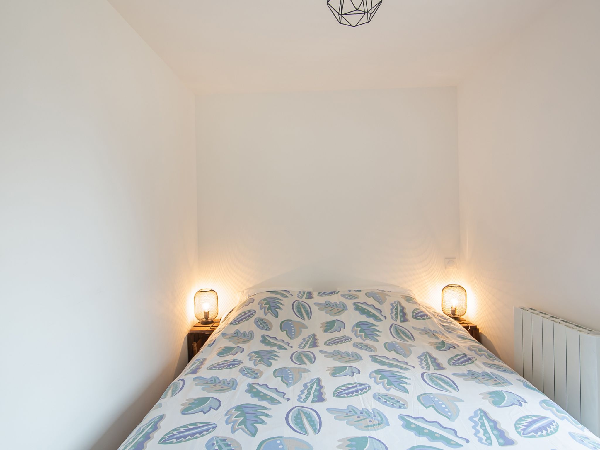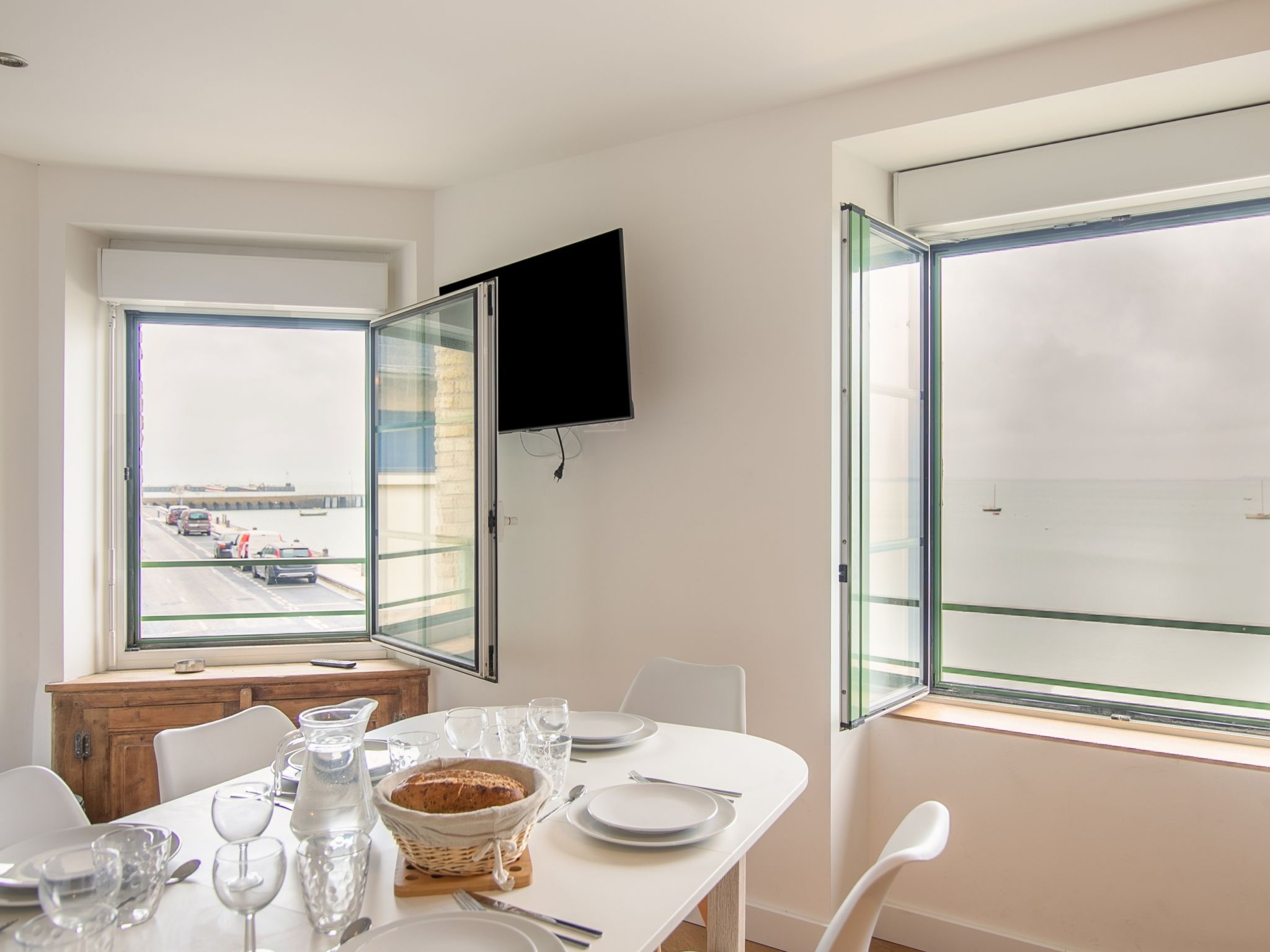 "Le point du jour 1", 3-Zimmer-Wohnung 50 m2 im 1. Stock. Geräumig und hell, vollständig renoviert im Jahre 2021, modern und geschmackvoll eingerichtet: Wohnzimmer mit TV (Flachbildschirm). 1 Zimmer mit 1 franz. Bett (1 x 180 cm, Länge 200 cm). 1 kleines Zimmer, ohne Fenster mit 2 x 2 Etagenbetten (90 cm, Länge 190 cm). Offene Küche (Backofen, Geschirrspüler, 3 Induktionskochplatten, Toaster, Wasserkocher, Mikrowelle, Tiefkühler, elektrische Kaffeemaschine) mit Esstisch. Dusche, sep. WC. E-Heizung. Parkettboden. Herrliche Sicht auf das Meer. Zur Verfügung: Internet (Wireless LAN, gratis). Bitte beachten: Nichtraucher-Haus. Rauchmelder.