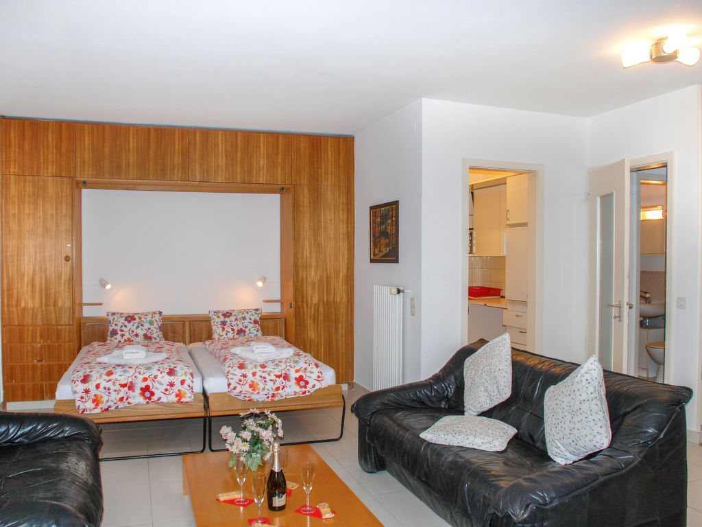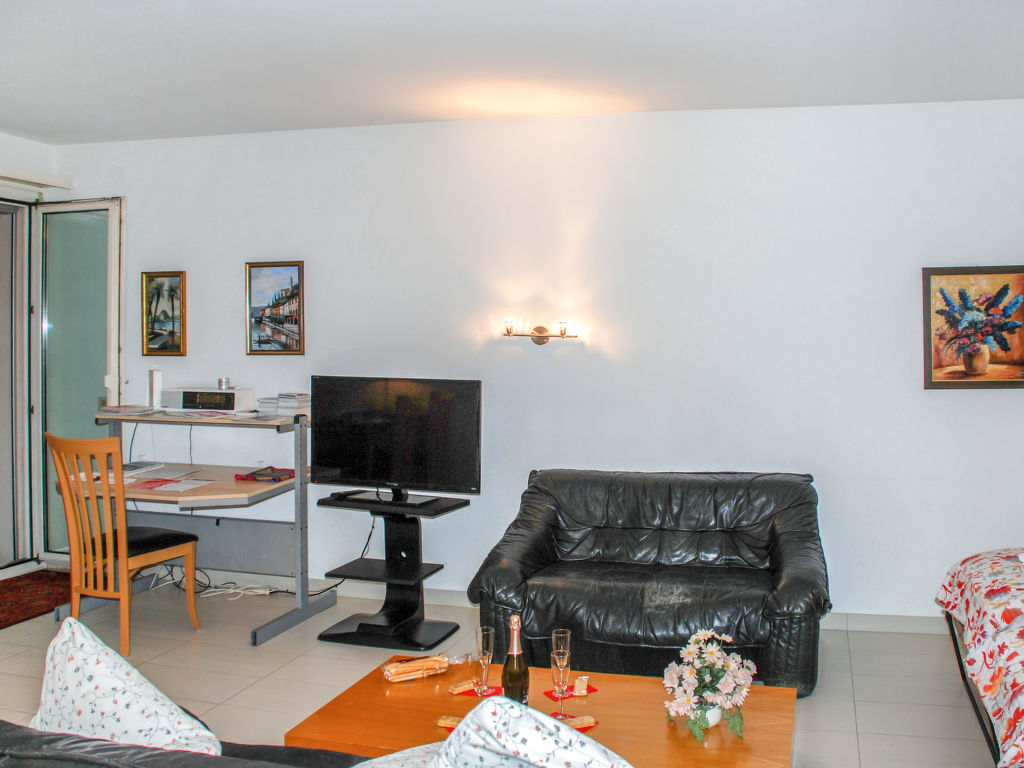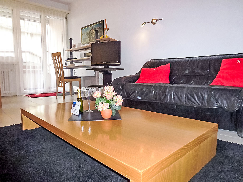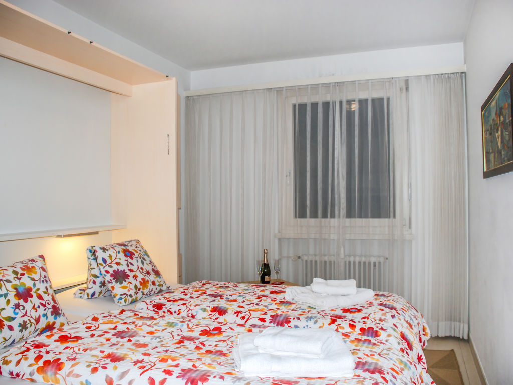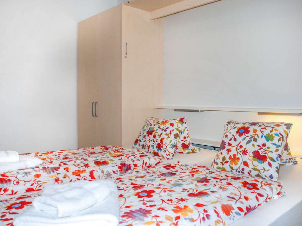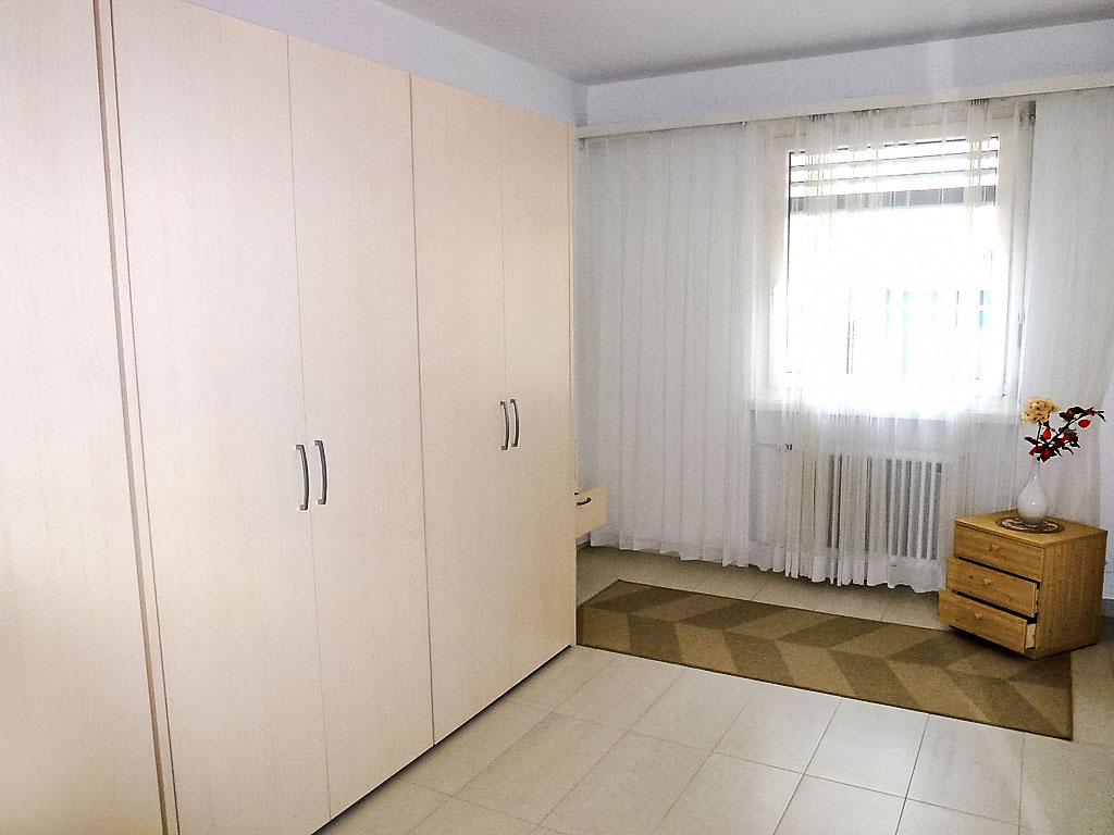 2-Zimmer-Wohnung 50 m2 im 2. Stock, Westlage. Geräumig, zweckmässig und gemütlich eingerichtet: offenes Wohn-/Esszimmer mit 1 Doppelwandschrankbett (2 x 90 cm, Länge 200 cm), Essecke, Kabel-TV, Flachbildschirm und Radio. Ausgang zum Balkon. 1 kleines Zimmer mit 1 Doppelwandschrankbett (2 x 90 cm, Länge 200 cm). Kleine Küche (3 Kochplatten, Backofen, Mikrowelle). Bad/WC. Heizung. Balkon. Balkonmöbel. Keine Sicht auf den See. Zur Verfügung: Kinderhochstuhl, Babybett bis 2 Jahre (extra), Haartrockner. Internet (Wireless LAN, gratis). Bitte beachten: geeignet für Familien. Nichtraucher-Unterkunft. GeheimTipp: ruhige Lage, immer Sommer kühle Wohnung, Ideal für Familien!