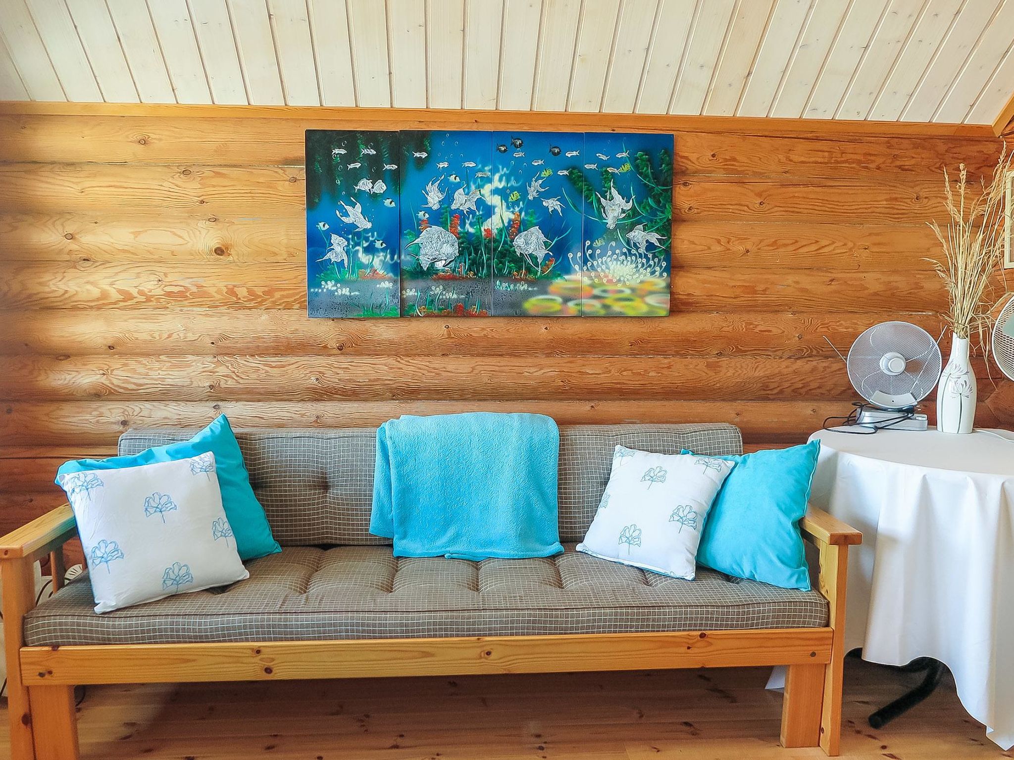 80 km westlich von Kajaani, auf der Insel Manamansalo im See Oulujärvi. Das Haus befindet sich im Feriendorf, am schönen Sandstrand. Sehr flacher und langer Sandstrand, ideal für Kinder, sonnige Lage, Entfernung zum Strand beträgt 25 m. Boote, Kanus und Tretboot zu mieten. Die nächsten Nachbarn des Hauses Etelätuuli sind Restaurantgebäude (ca. 30 m) und Campingplätze für Wohnwagen auf der anderen Seite. Rundes Blockhaus, Baujahr 2011. Wohnküche mit ausziehbarem Sofa, Schlafzimmer mit Doppelbett (Breite 140 cm), niedriger Dachboden mit 3 Matratzen, steile Treppe zum Dachboden, Sauna, Waschraum/WC und teilweise überdachte Terrasse. Frühstück und andere Mahlzeiten werden im Restaurant des Resorts serviert. Das Restaurant ist von Anfang Juni bis Ende August geöffnet. Im schönen Manamansalo gibt es Wanderwege mit Dienstleistungen (Unterstände und Lagerfeuerplätze). Manamansalo ist ein Teil der Rokua-Geopark-Region. Spezielle geologische Objekte, die Sie hier sehen können, sind türkisfarbene Teiche in Kessellöchern, Bergkämmen und Gneisgebirgen. Die Entfernung zum Geopark beträgt ca. 15 km. Die Entfernung zum Fischereihafen, wo Sie Fisch kaufen können, beträgt 15 km. Kunsthaus von Kassu Halonen 5 km. Fastfood-Restaurant 5 km. Alassalmi Fähre 12 km. Es gibt keinen Kraftstoffverkauf auf de Insel. Dieses Reiseziel kann von Ende Mai bis Ende September gebucht werden.