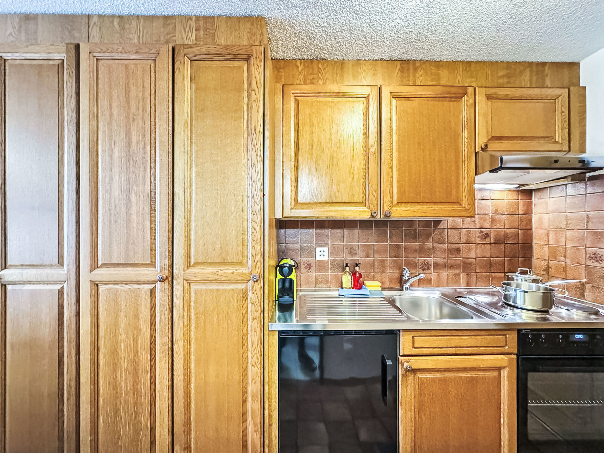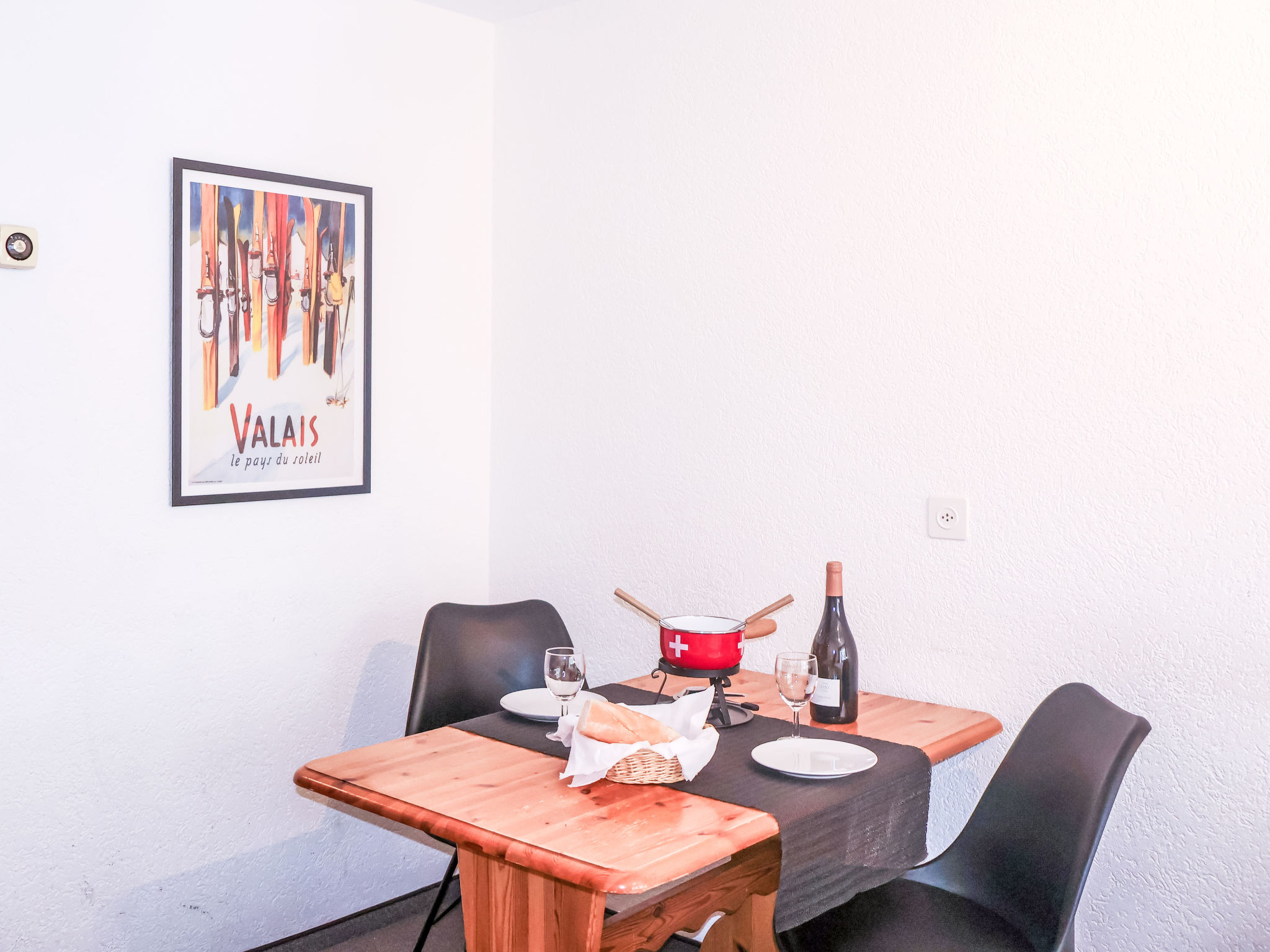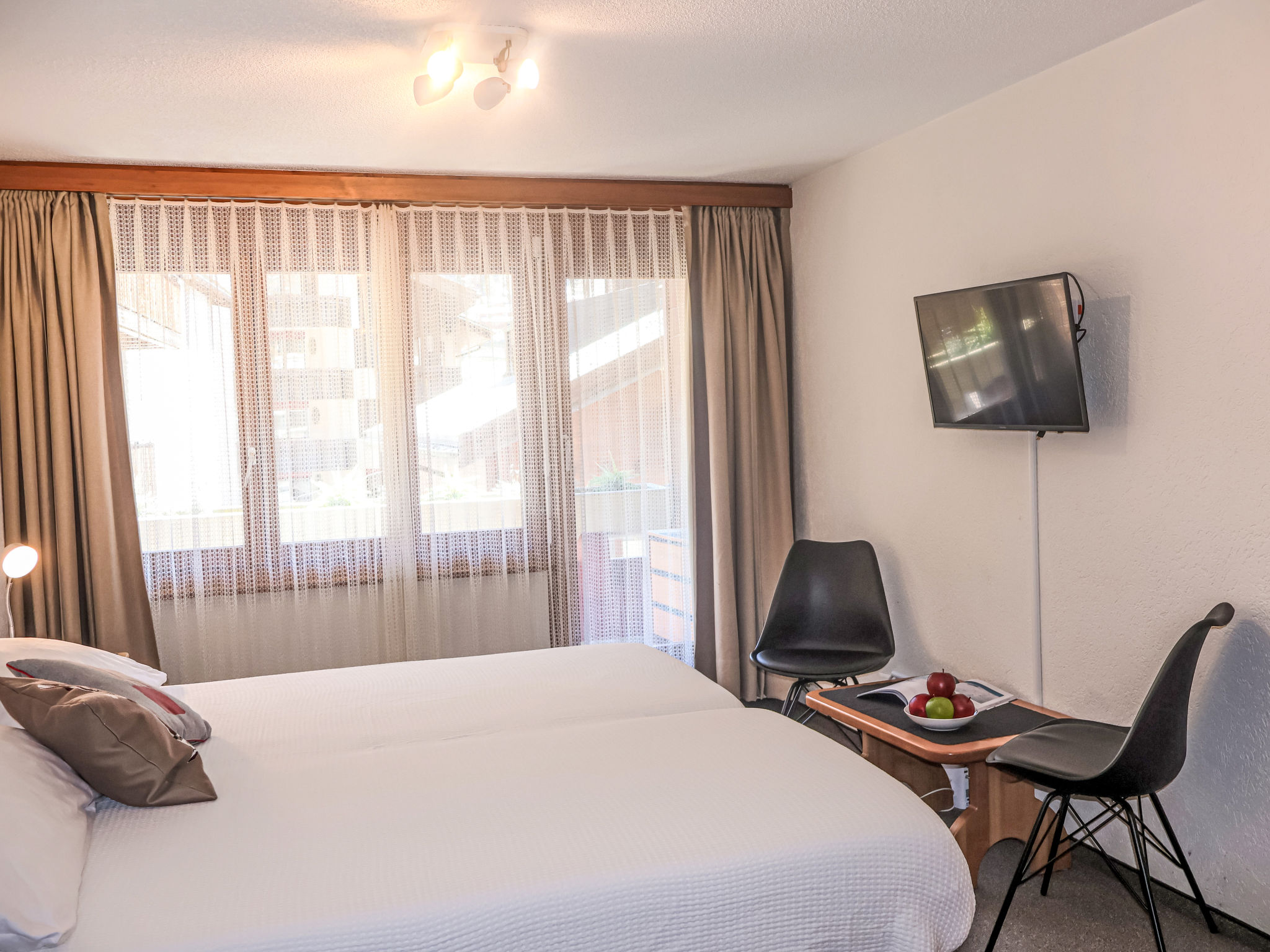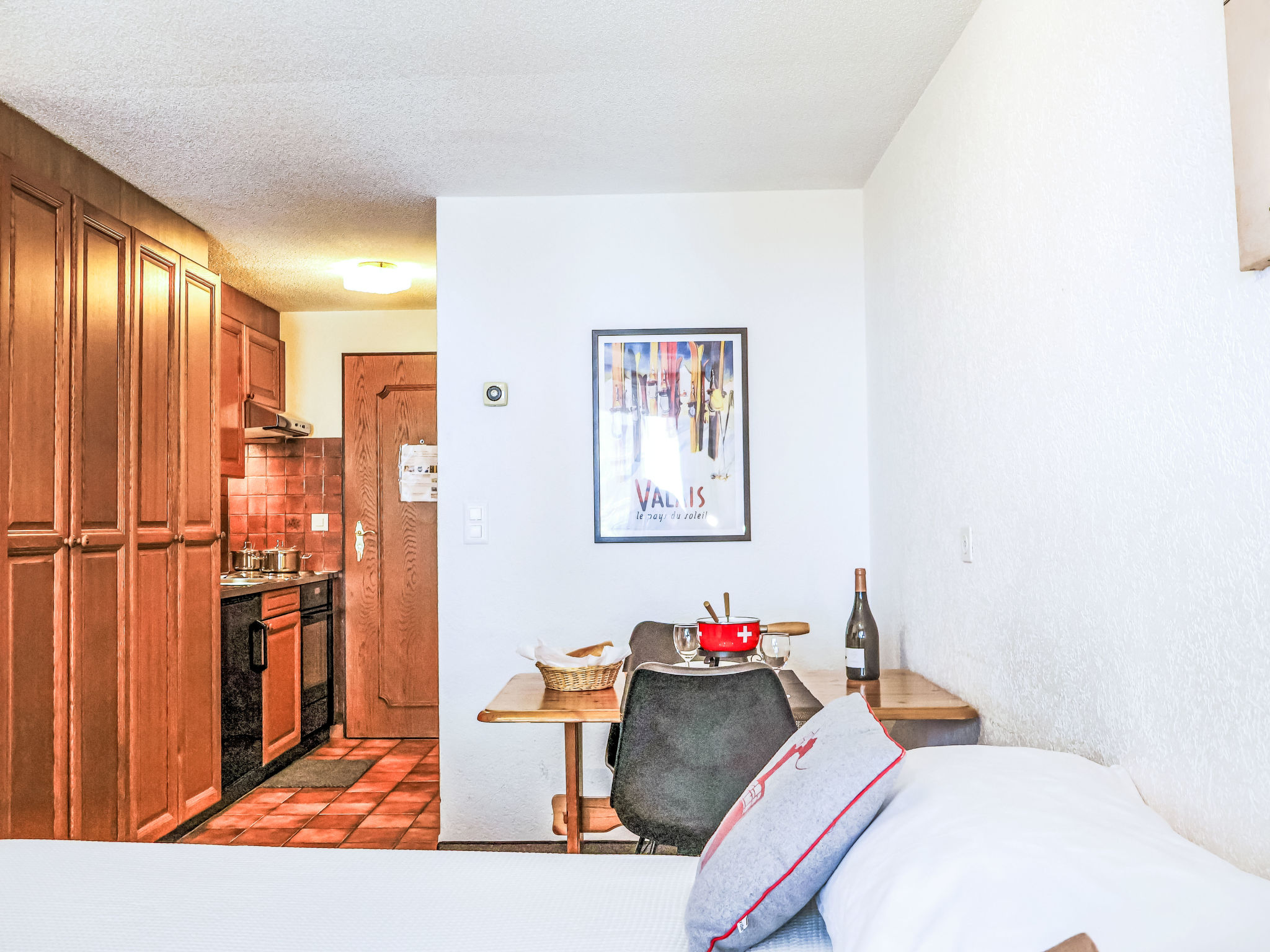 1-Zimmer-Wohnung 28 m2 im 2. Stock, Ostlage. Einfach und komfortabel eingerichtet: Wohn-/Schlafzimmer mit 2 Betten (90 cm, Länge 200 cm), Esstisch und TV. Ausgang zum Balkon, Richtung Osten. Kleine, offene Küche im Eingang (3 Kochplatten, Backofen, Toaster, Wasserkocher, Tiefkühler, elektrische Kaffeemaschine). Dusche/WC. Balkon, Ostlage. Balkonmöbel. Seitliche Sicht auf die Berge. Zur Verfügung: Haartrockner. Internet (Wireless LAN, gratis). Bitte beachten: Nichtraucher-Unterkunft.