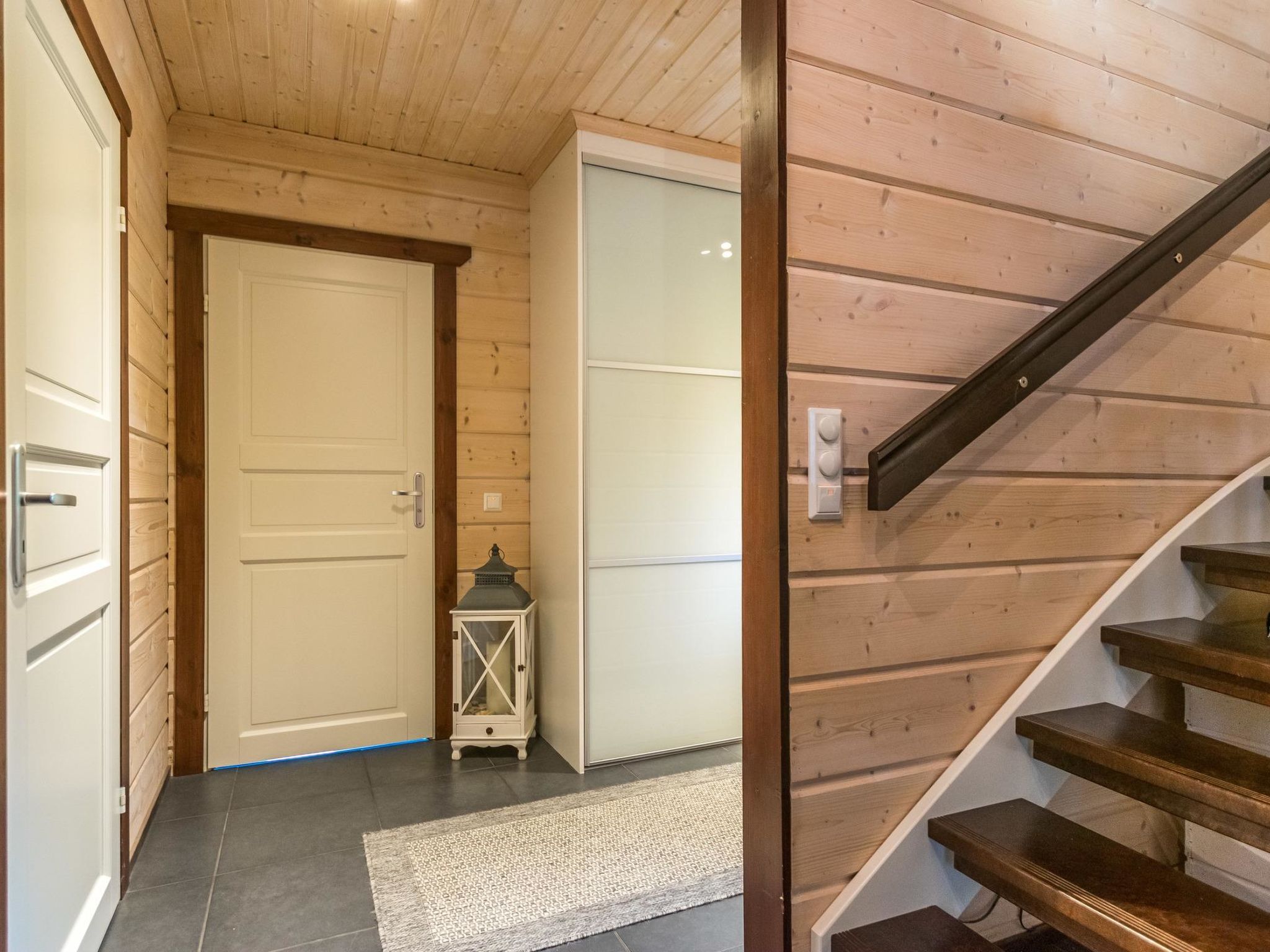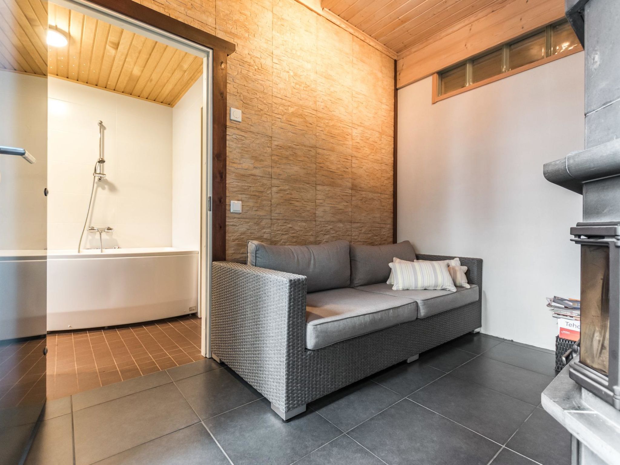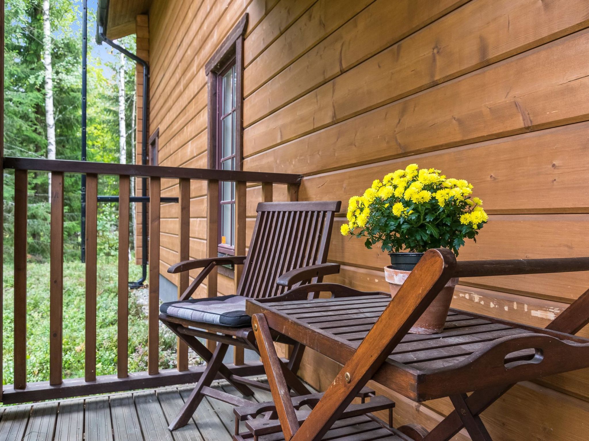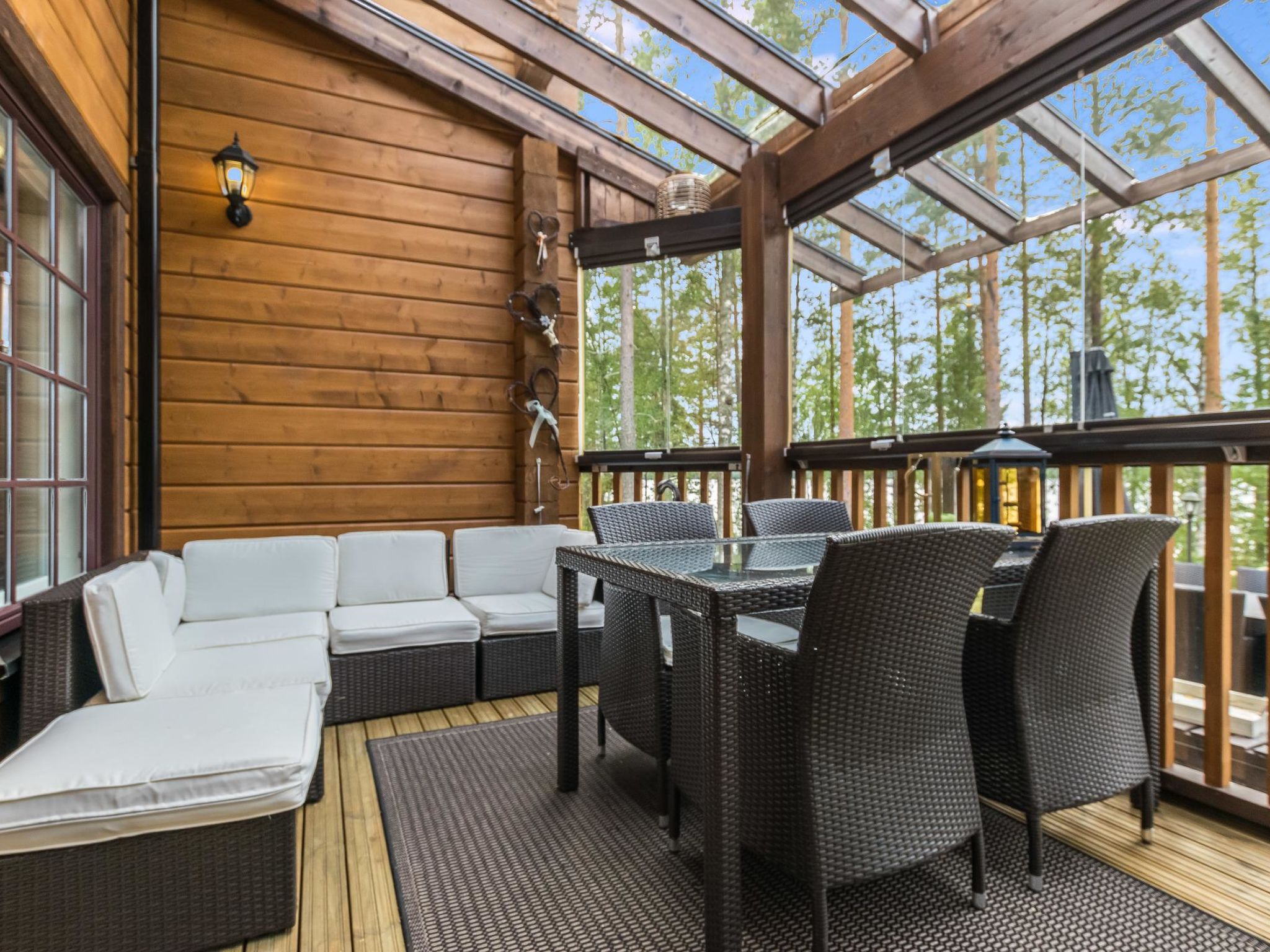 Mäntyranta ist ein geräumiges Haus, das für eine größere Gruppe oder zwei Familien geeignet ist. Das Haus bietet gute Angelmöglichkeiten am See Rutajärvi. Der Leivonmäki-Nationalpark liegt in der Nähe und ist am gegenüberliegenden Ufer des Sees zu sehen. Das Haus ist modern, gut ausgestattet und gemütlich, ideal für den Urlaub. 45 km südlich von Jyväskylä, See Rutajarvi 30 m (Länge 5 km, Breite 2,3 km), zuerst flacher Kiesstrand, dann schnell tiefer werdend, eigener Pier, Ruderboot, Außenbordmotor zu mieten. Große Blockhausvilla (2008). Im Erdgeschoss Küche, Hauswirtschaftsraum, Wohnzimmer, Schlafzimmer 1: Doppelbett 180x200 cm, WC, Sauna (sogenannter Elektrosaunaofen), Waschraum (3 Duschen) mit Hydromassage-Badewanne. Verglaste Terrasse mit grosser, nicht überdachte Terrasse davor. Im Obergeschoss, WC, drei Schlafzimmer (1. Schlafzimmer: 1 Bett 120x200 cm, 2. Schlafzimmer: 2 Betten 80x200 cm, 3. Schlafzimmer: 2 Betten 90x200 cm), Vorraum mit Schlafcouch (Länge 196 cm) und TV. Garage und Carport auf dem Hof. Der Carport steht dem Mieter zur Verfügung, aber nicht die Garage. Separate Seesauna mit Strom, Elektroheizung, Schlafsofa (140x190 cm) als Bettalternative. Waschraum mit Kessel zur Warmwasserbereitung, Saunaraum mit holzbeheiztem Saunaofen. Wasser in die Sauna muss mit einem Eimer aus dem See gebracht werden. Vor der Sauna befindet sich Lagerfeuerplatz, mit herrlichem Blick auf den See. Dieses Reiseziel bietet Platz für bis zu 8 Personen, einschließlich Kinder. Das Objekt ist am Anreisetag ab 17.00 Uhr verfügbar. Das Haus verfügt über Überwachungskamerasystem, welcher jedoch nicht verwendet wird, wenn sich Mieter im Haus befinden. Sonniges Hanggrundstück, das zum Strand hin abfällt. Toller Blick auf den See vom Haus und Hof. Gemütliche verglaste Terrasse, die Sie auch bei kühlerem Wetter genießen können. Nationalpark Leivonmäki 16 km, Jyväskylä 55 km, Leivonmäki 5 km, Bäckerei und Restaurant Karoliinan kahvimylly (in Leivonmäki) 6 km.